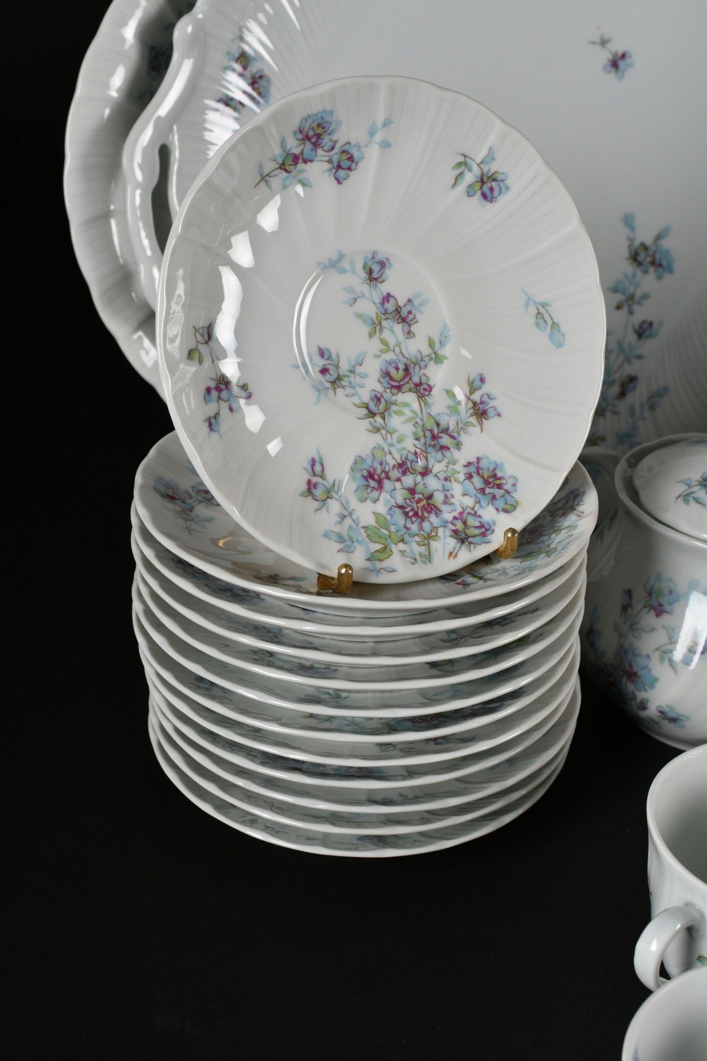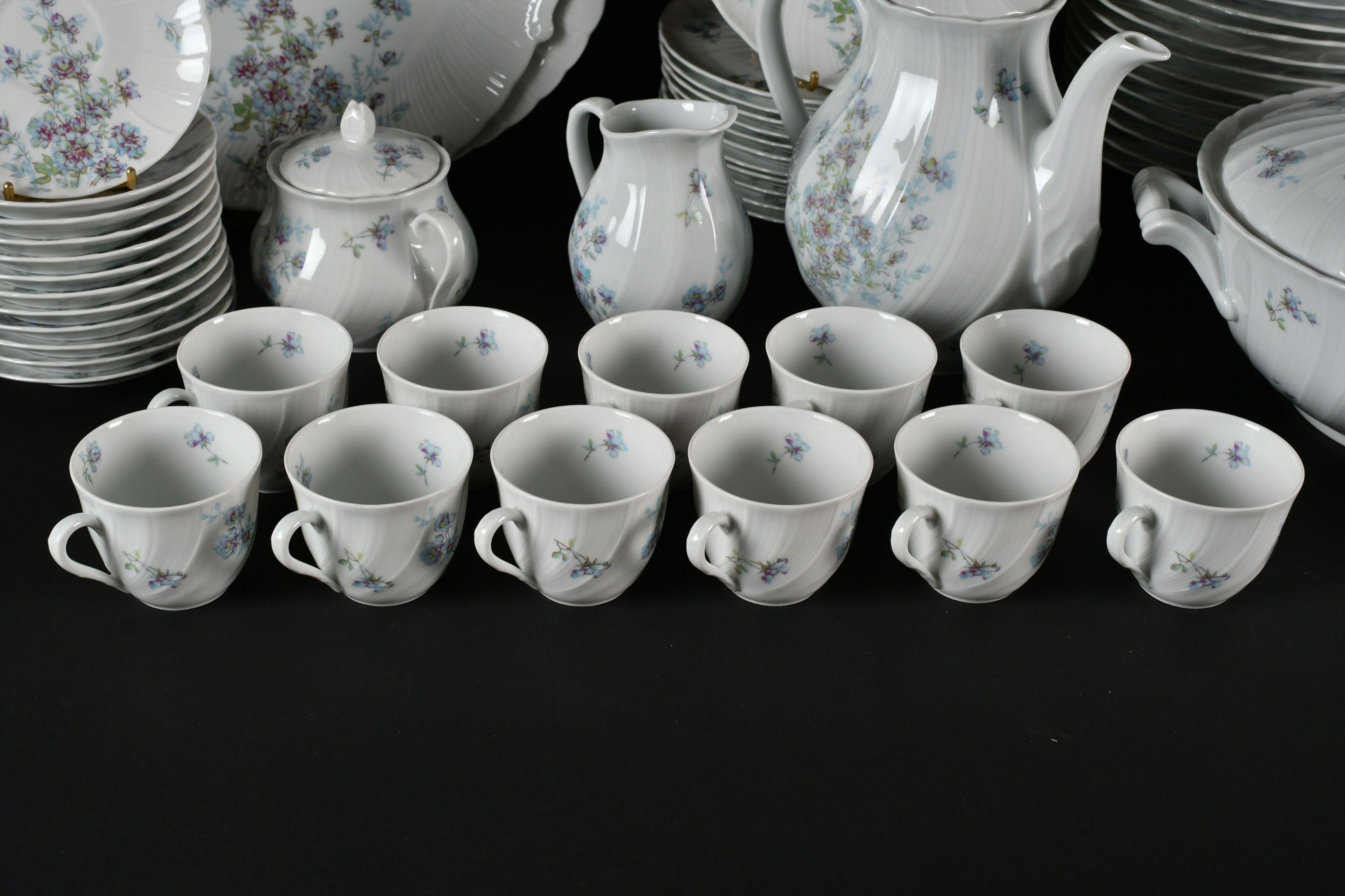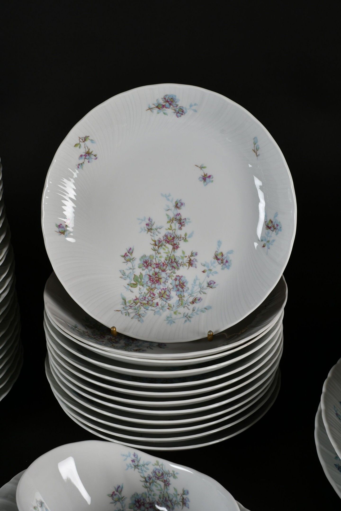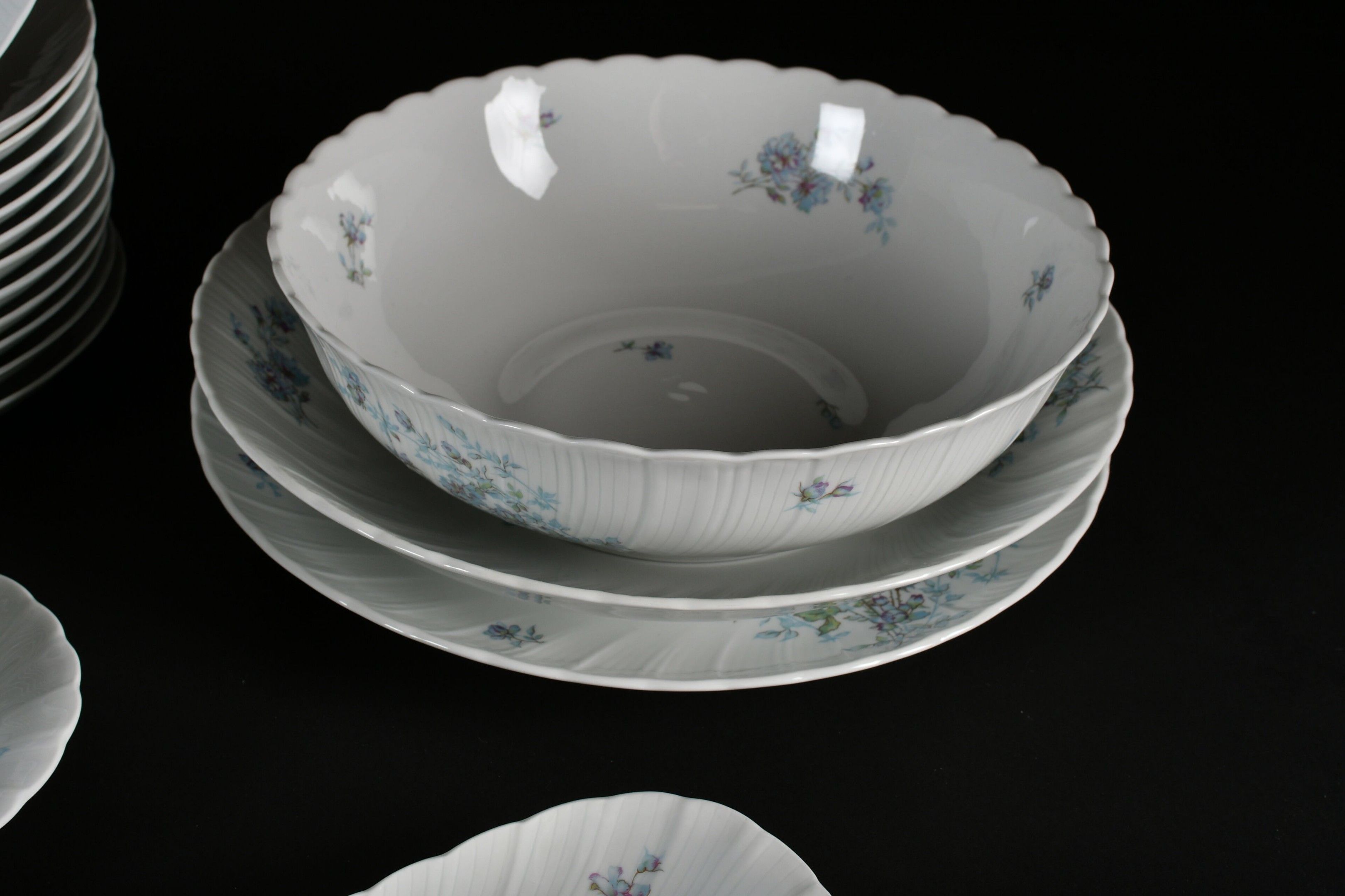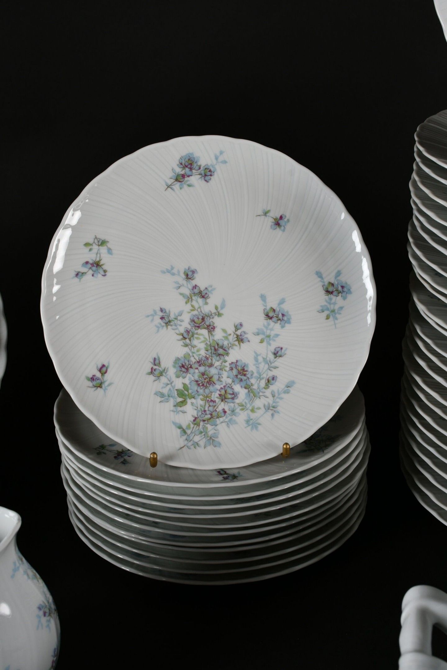 BERNARDAUD Limoges white porcelain service set, "Gabrielle" model, decorated with polychrome flowering branches. Comprising: 24 large dinner plates; 12 soup plates; 12 dessert plates; two ravioli dishes; a sauceboat; a covered vegetable dish; a salad bowl; two round and deep dishes; an oval dish; a cake dish; 11 cups and 12 saucers; a teapot; a milk jug and a covered sugar bowl. Lot sold on re-bidding