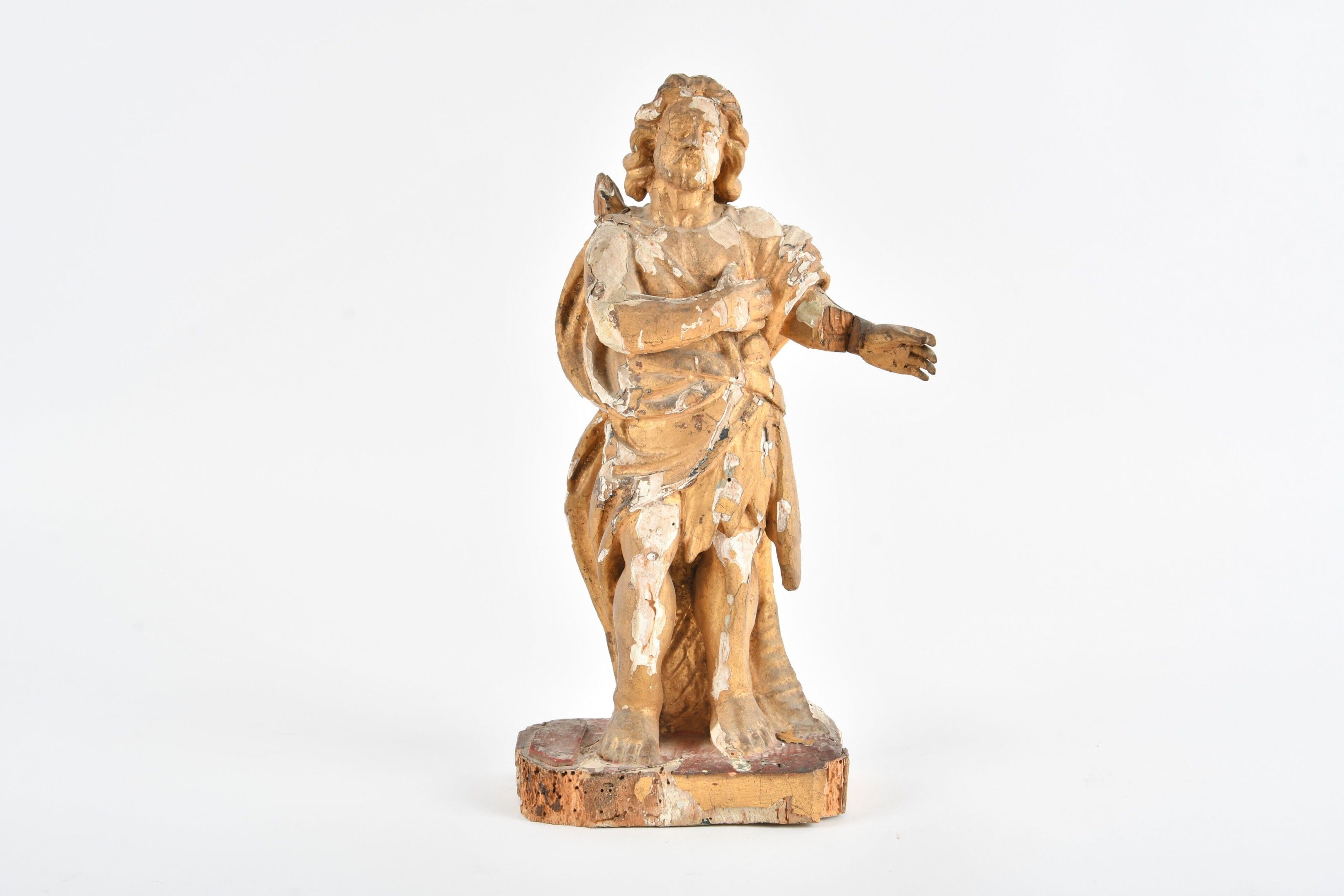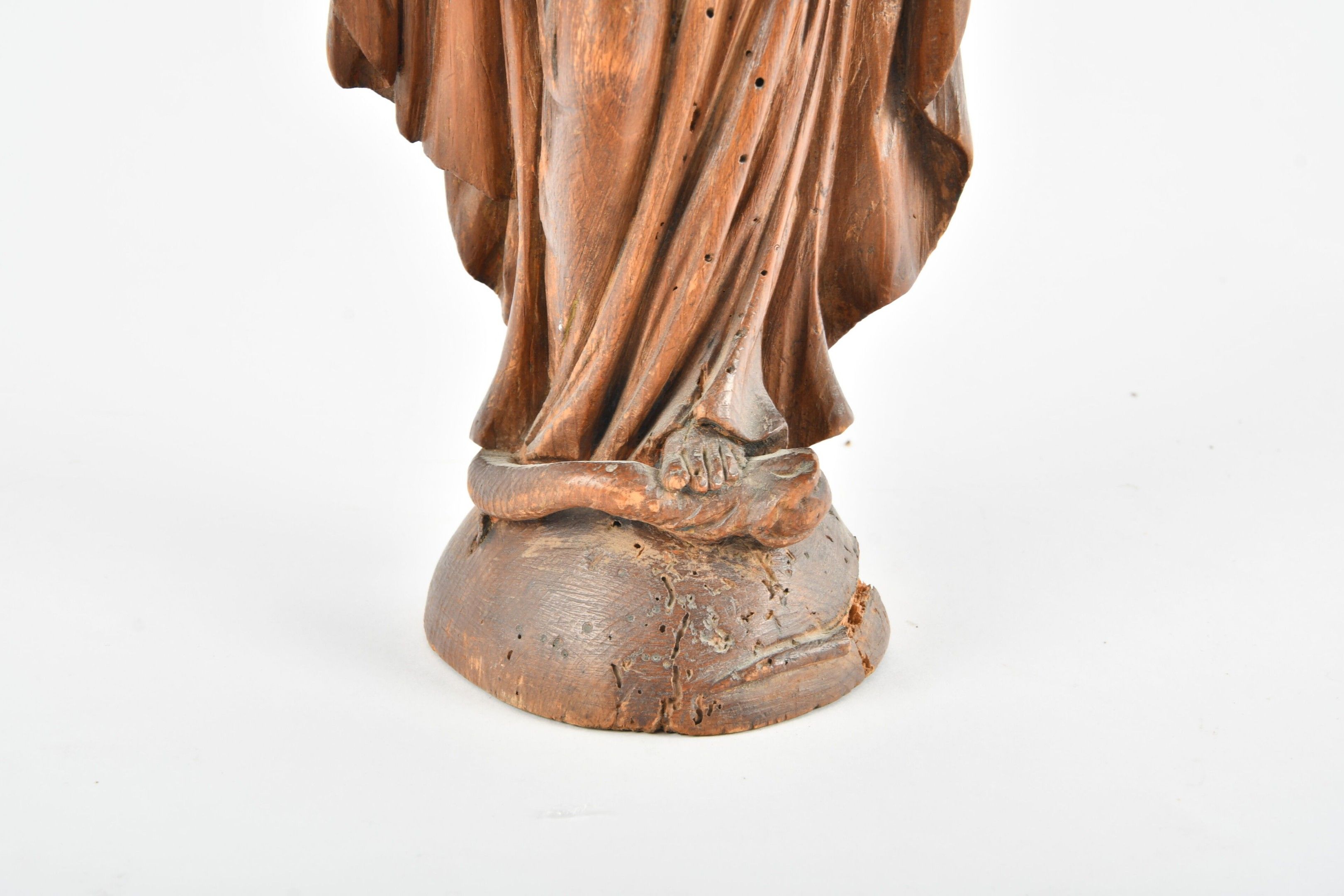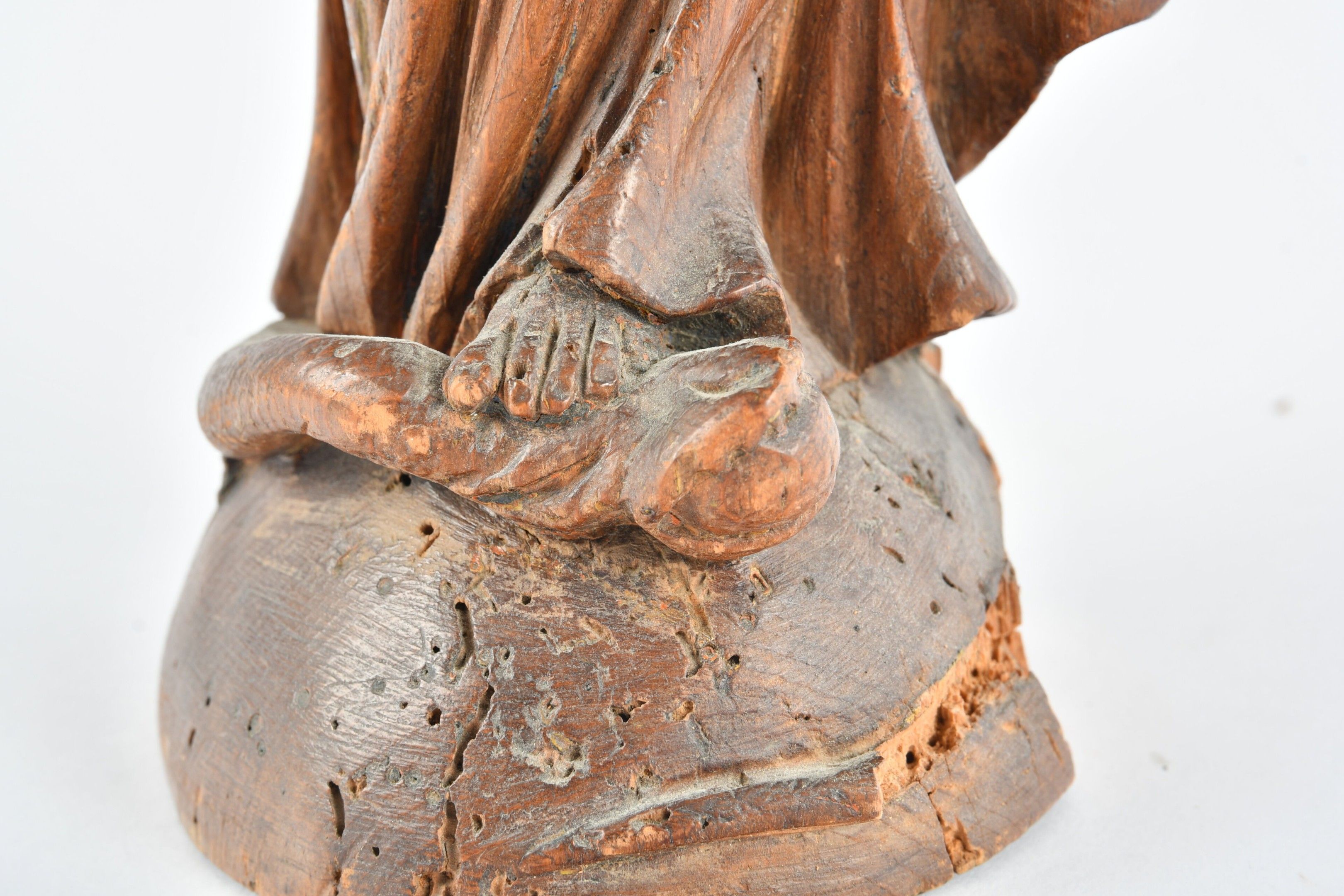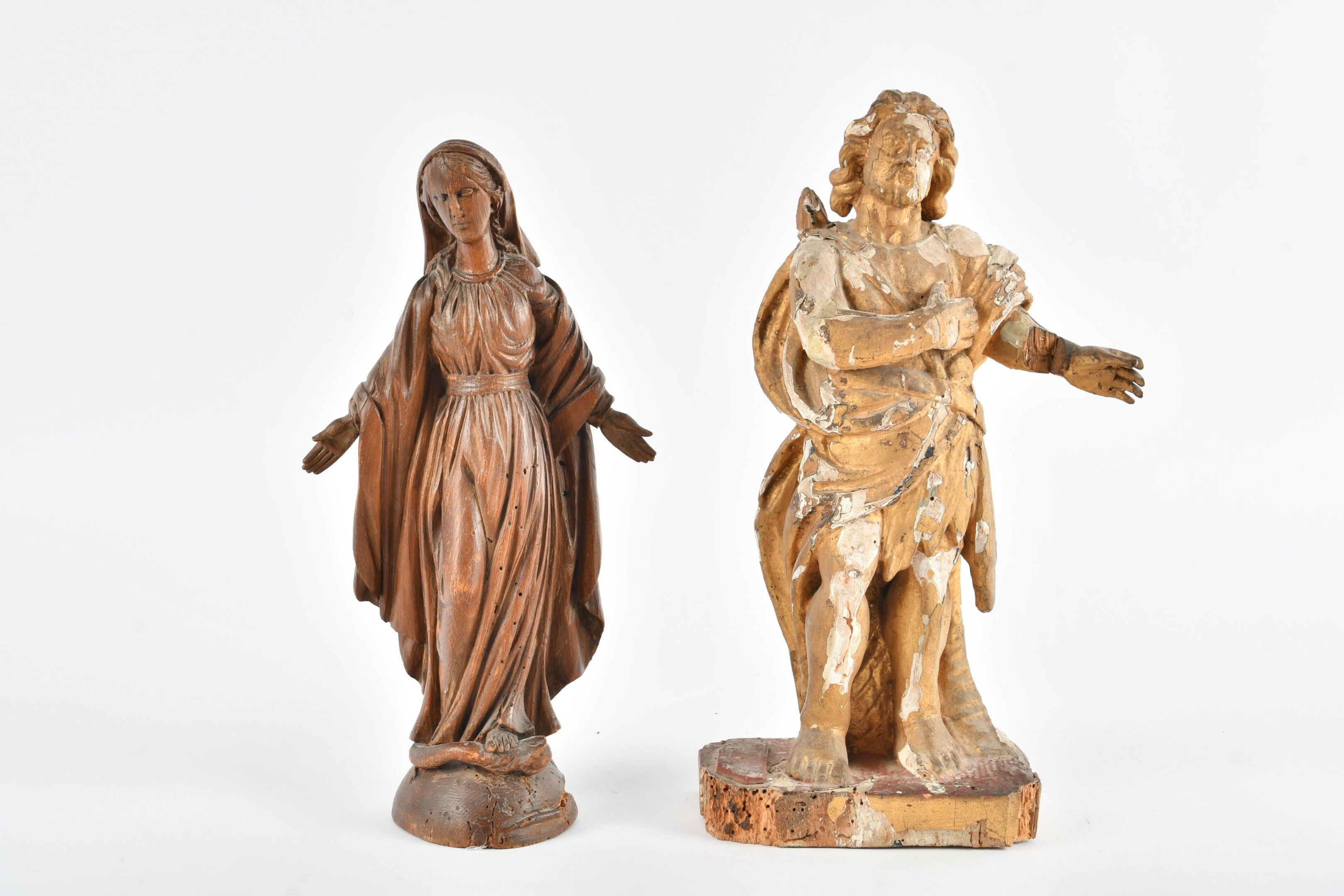 A carved and gilded wooden STATUE depicting a saint dressed as a soldier (Saint Martin?). Early 18th century. Height 34 cm. Missing gilding. ATTACHED is a carved natural wood statue of a virgin striking down a snake. Minor worm damage.
