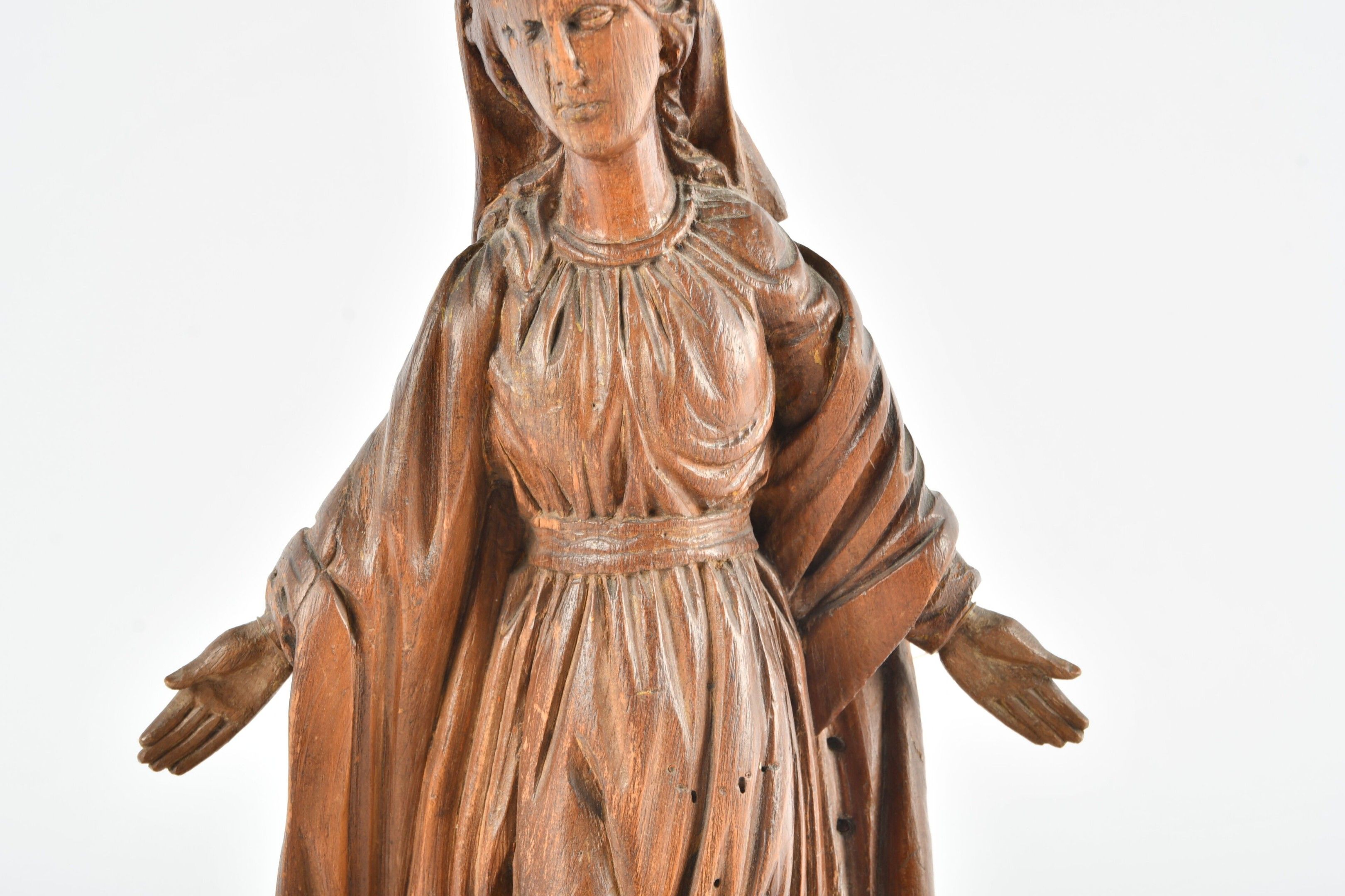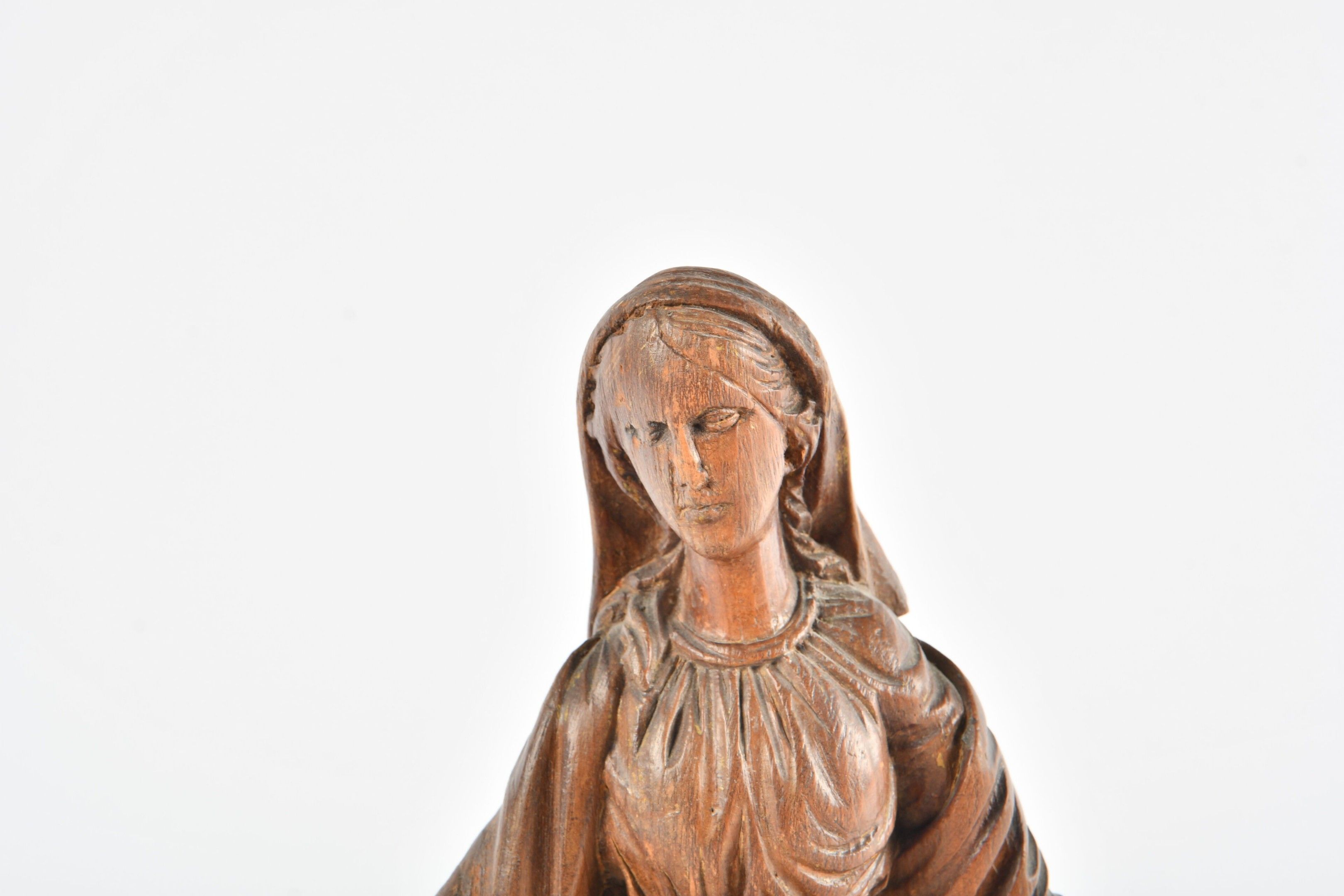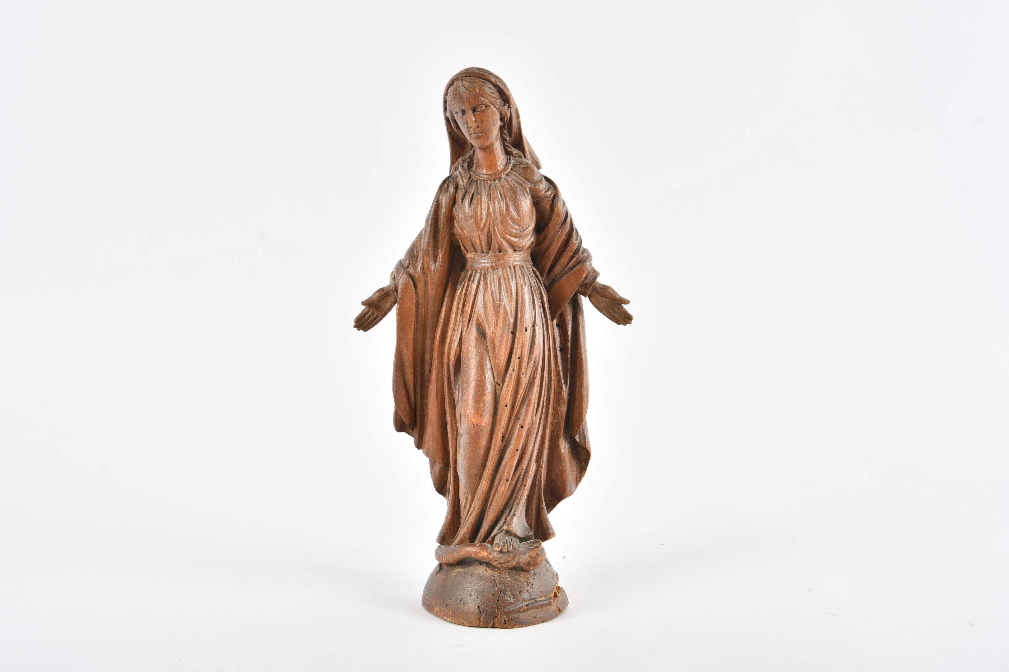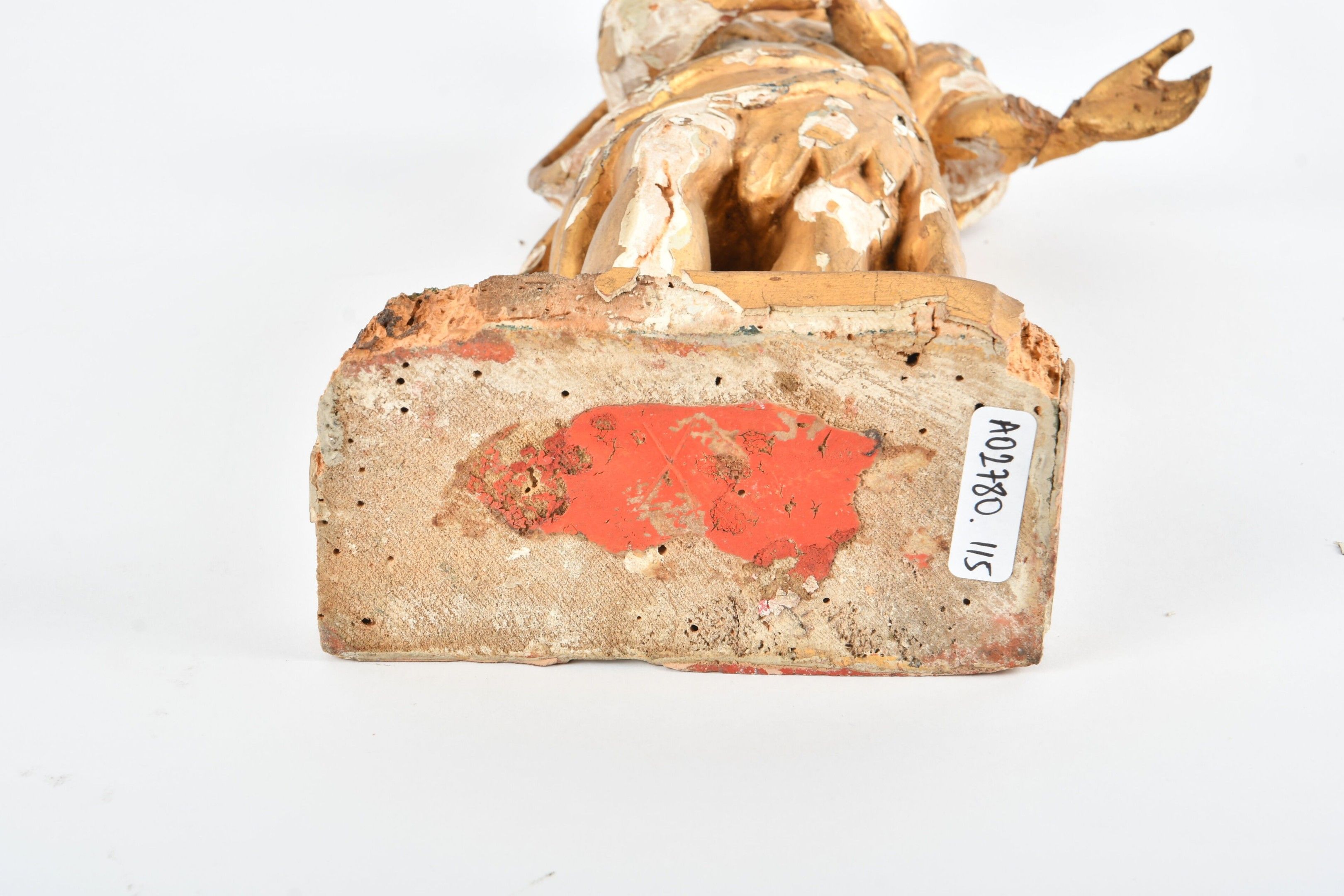 A carved and gilded wooden STATUE depicting a saint dressed as a soldier (Saint Martin?). Early 18th century. Height 34 cm. Missing gilding. ATTACHED is a carved natural wood statue of a virgin striking down a snake. Minor worm damage.