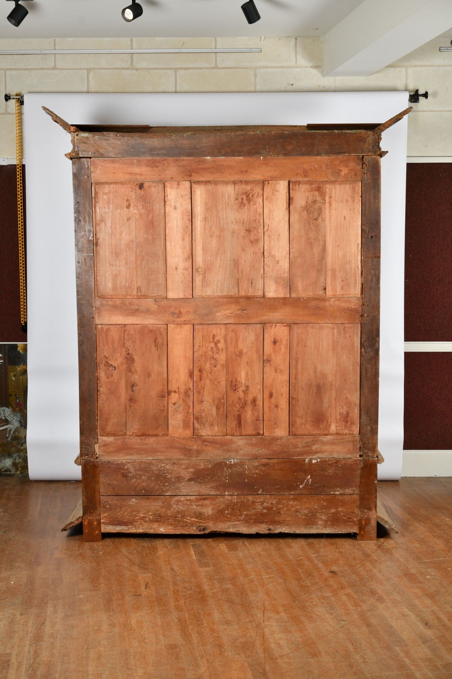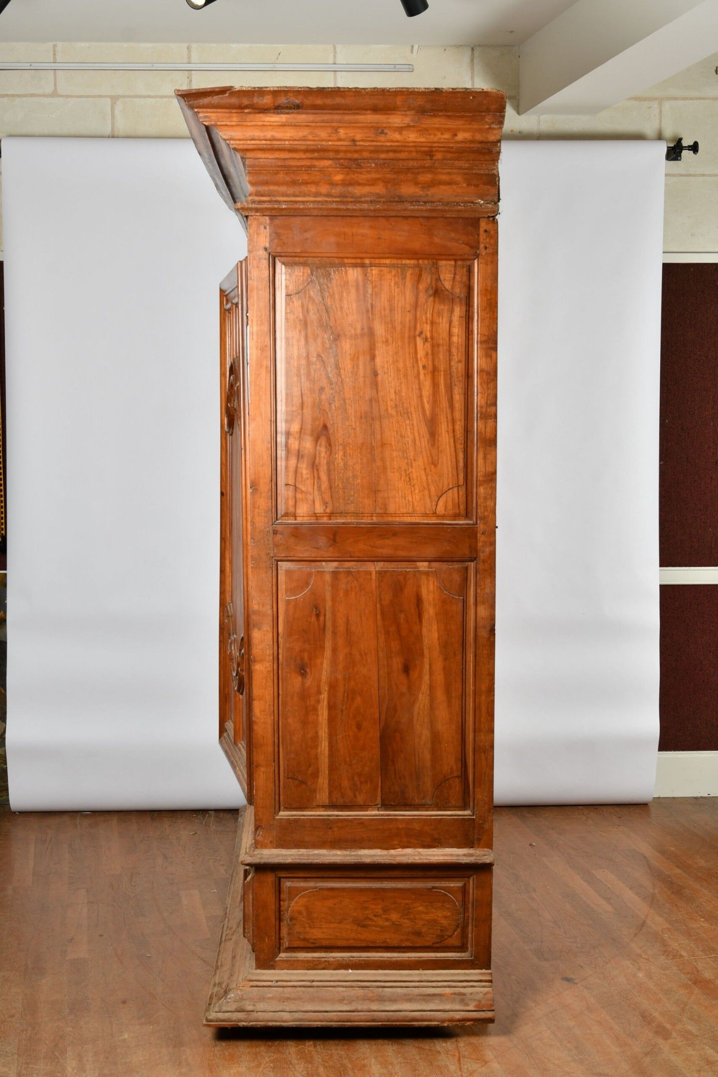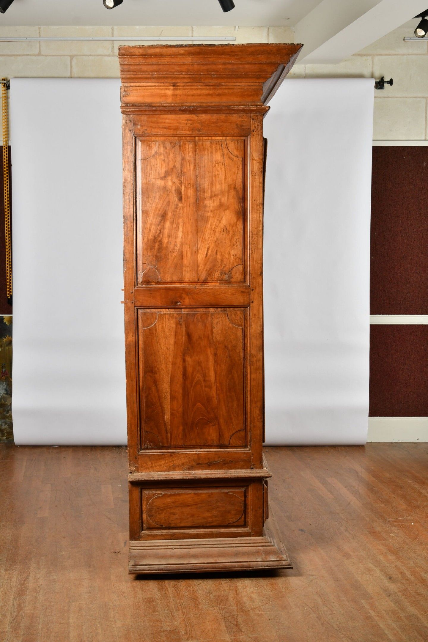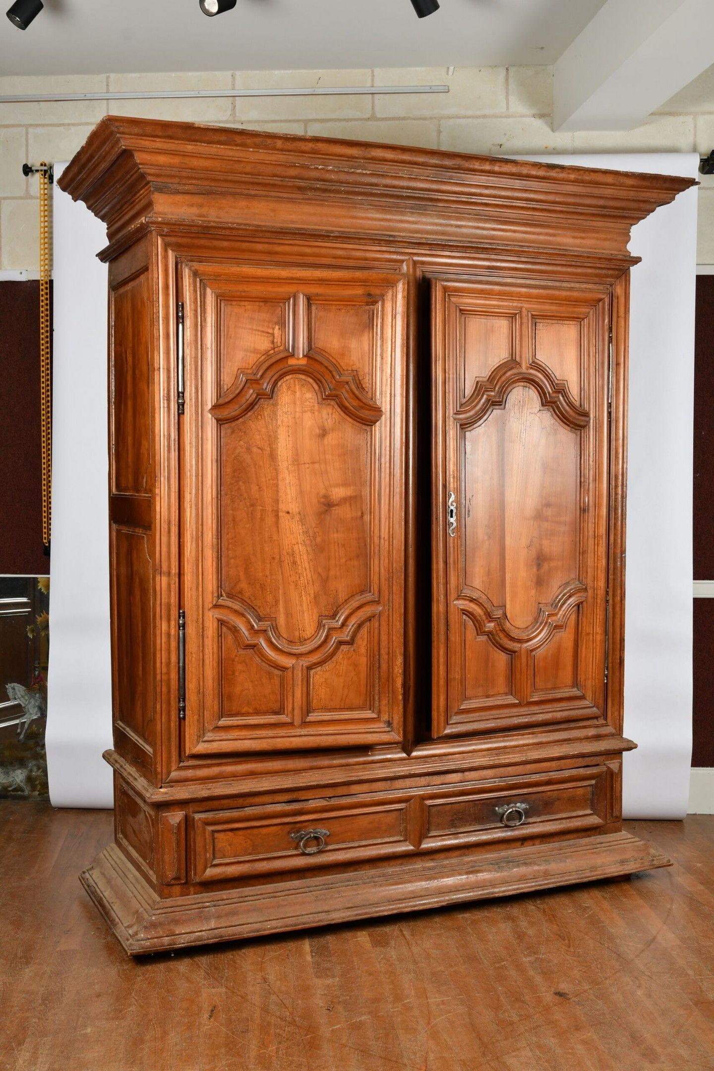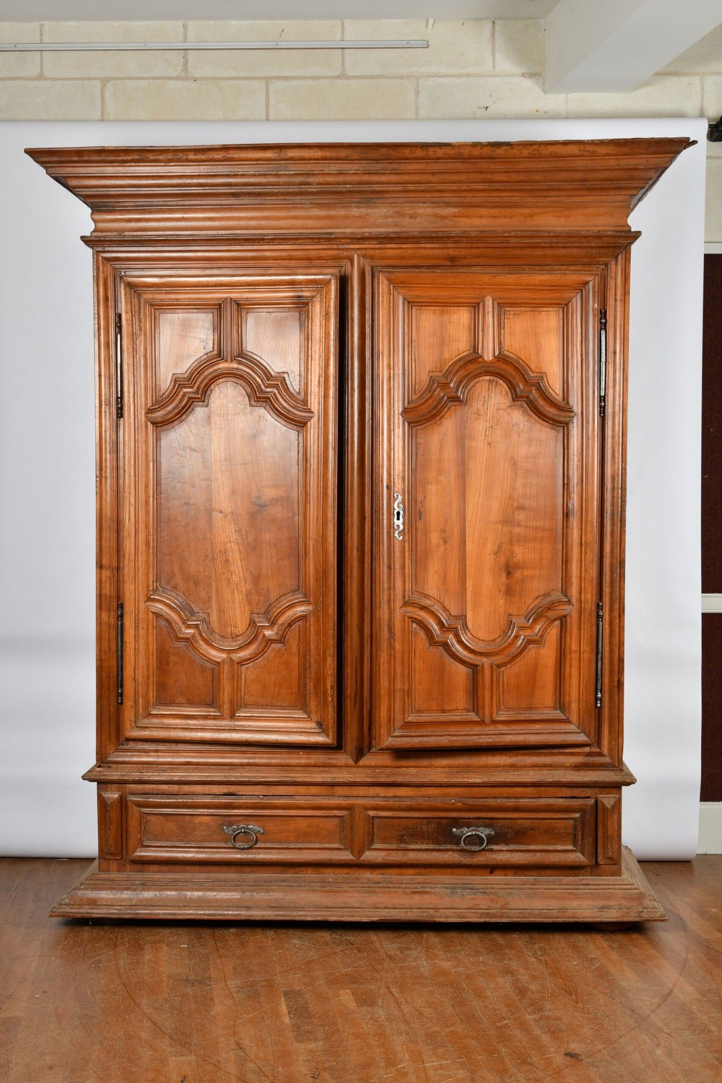 Cherrywood ARMOIRE opening to two doors and a long drawer in the waist. Decorated with large frame mouldings forming a cartouche and straight cornice, moulded side panels, all resting on a wide moulded plinth. Worked around 1700. H. 249 - W. 205 - D. 81 cm. Wear and tear; minor chips and worm damage.