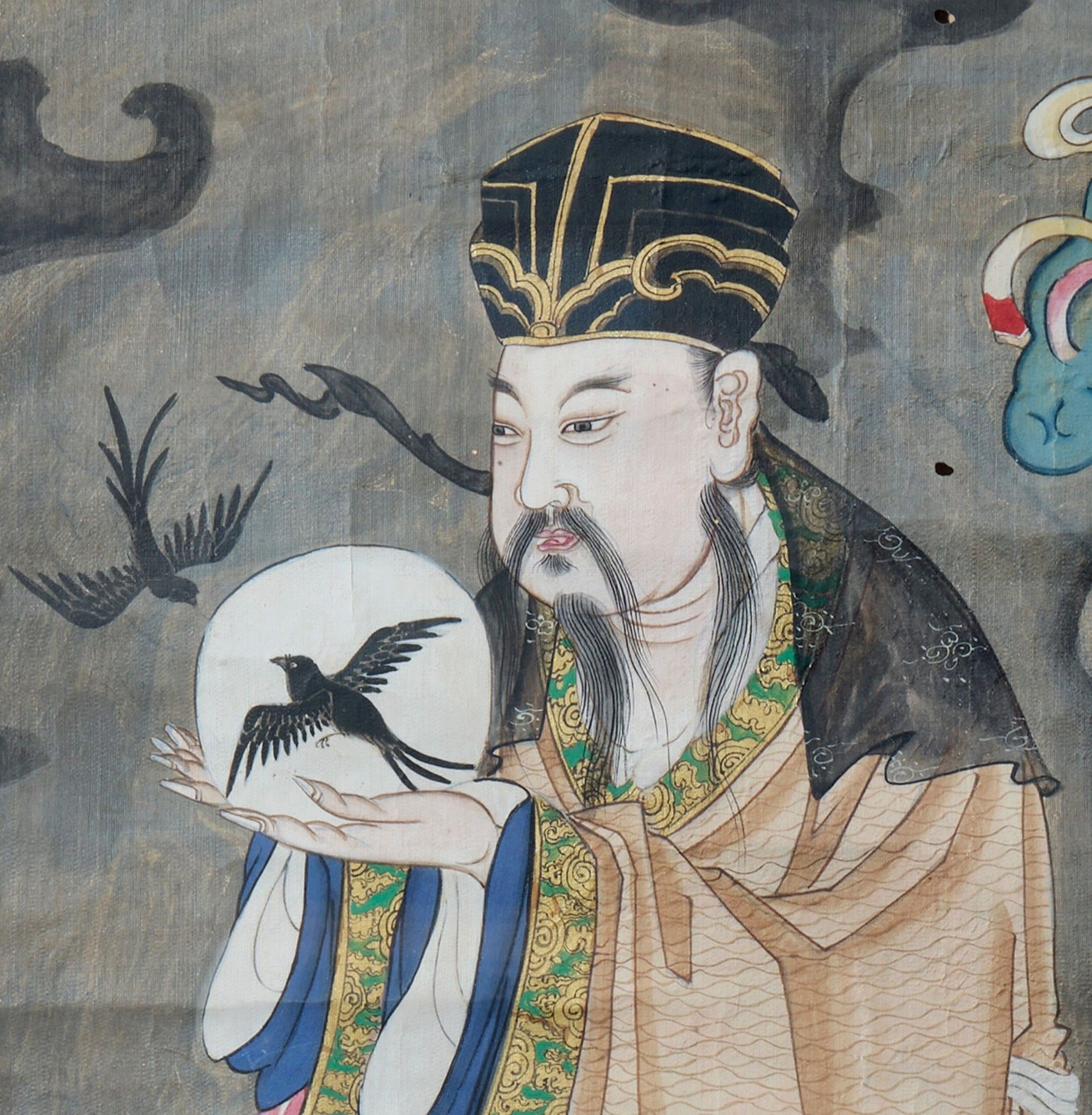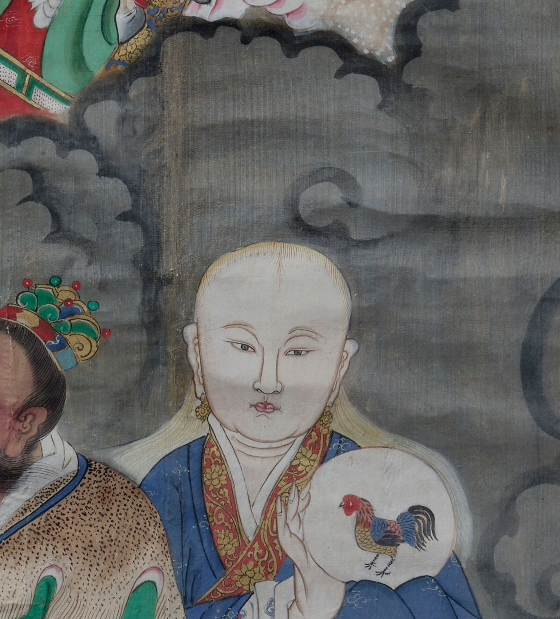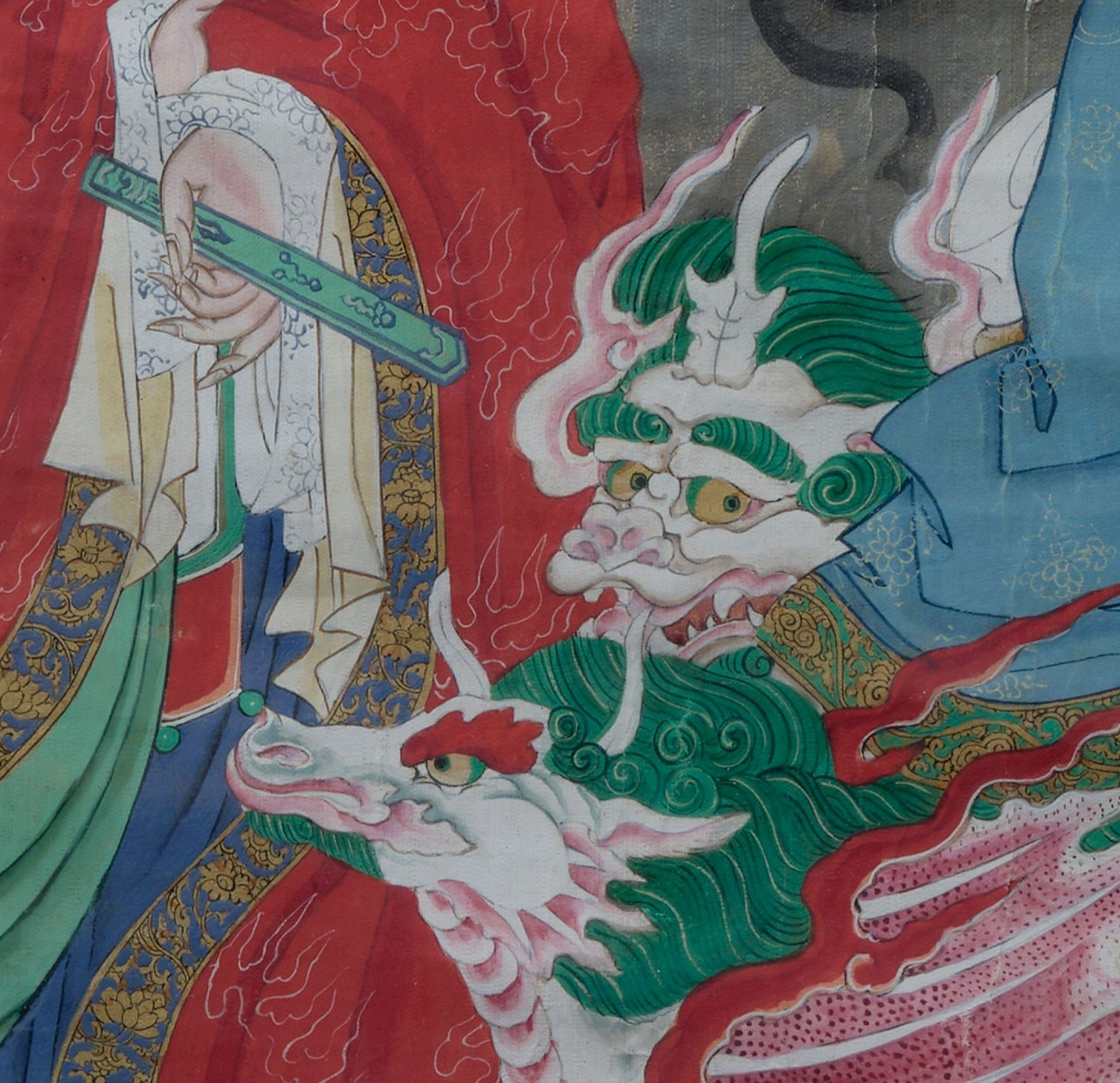 The ancient Chinese associated each stellar officer with a particular animal, which is why each deity is accompanied here by an animal: a xiezhi (mythical creature), an ox, a bat, two swallows, a pig and a chimera. It should be noted that in this painting, the figure of the rat, which should have appeared, has been replaced by a rooster. The cockerel is the symbol of the Mao constellation of the "Palace of the West", which is undoubtedly a misinterpretation on the part of the painter.