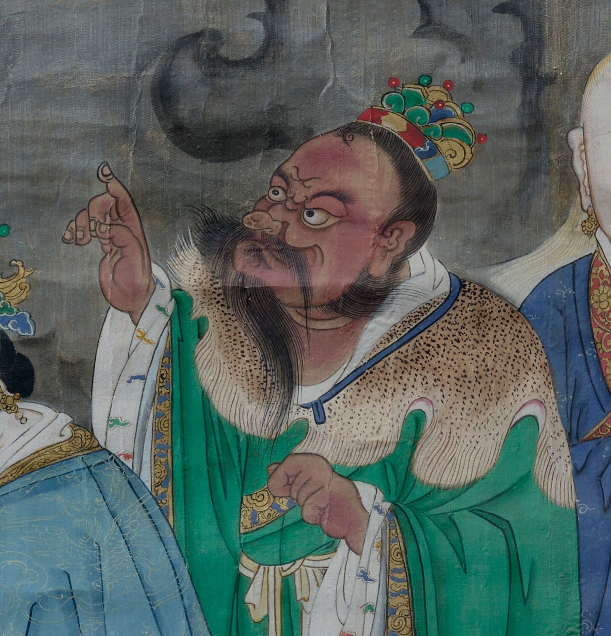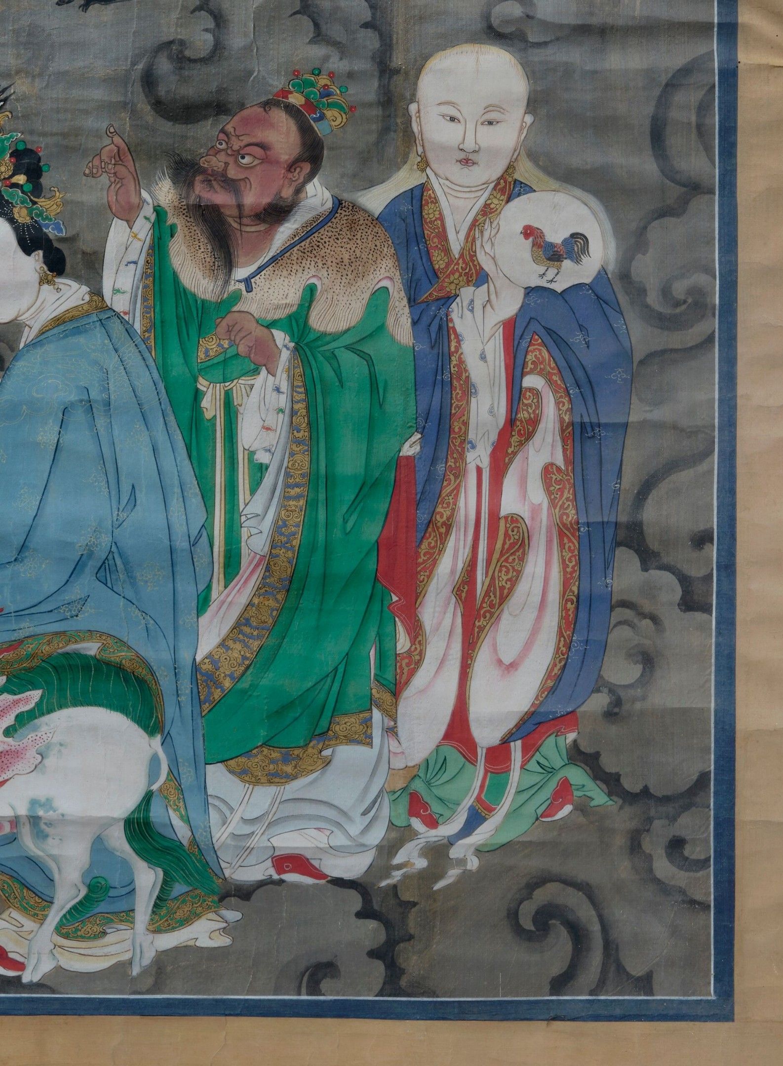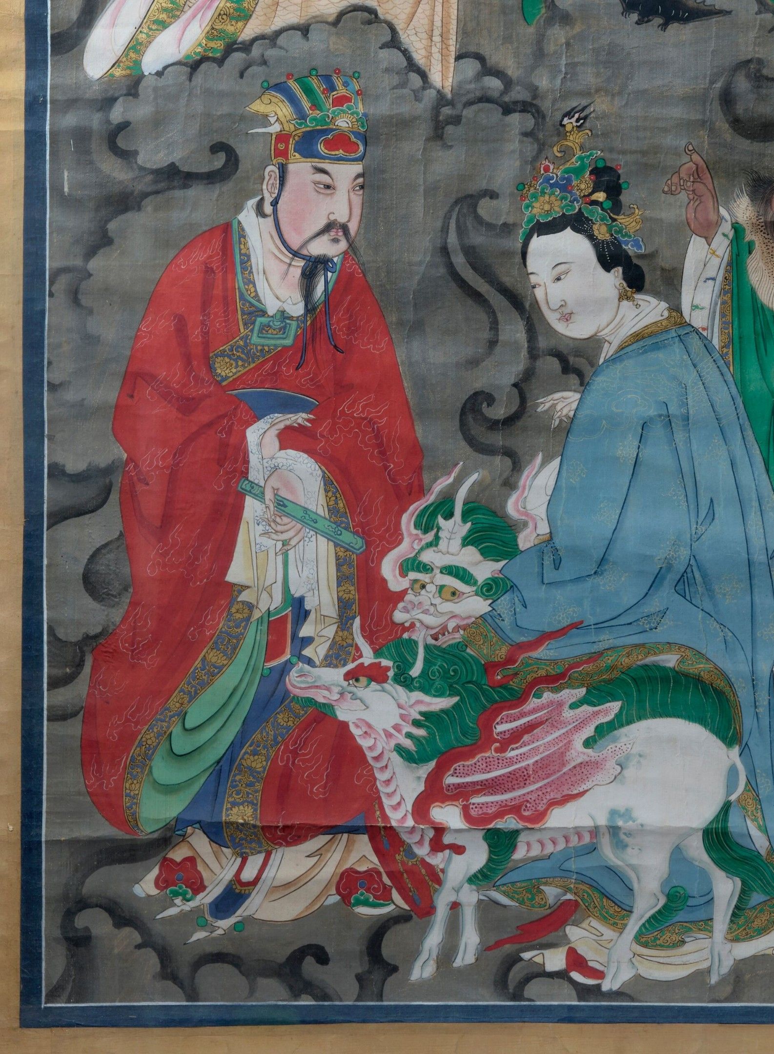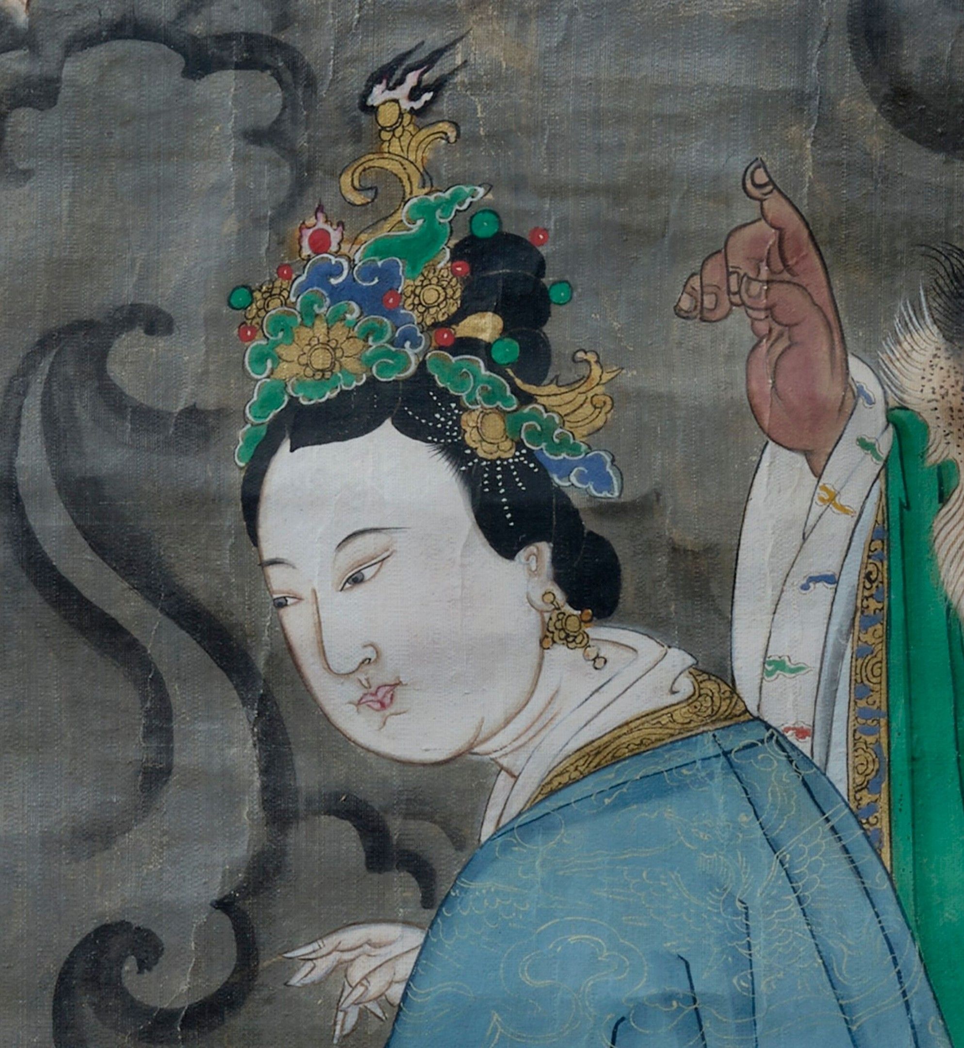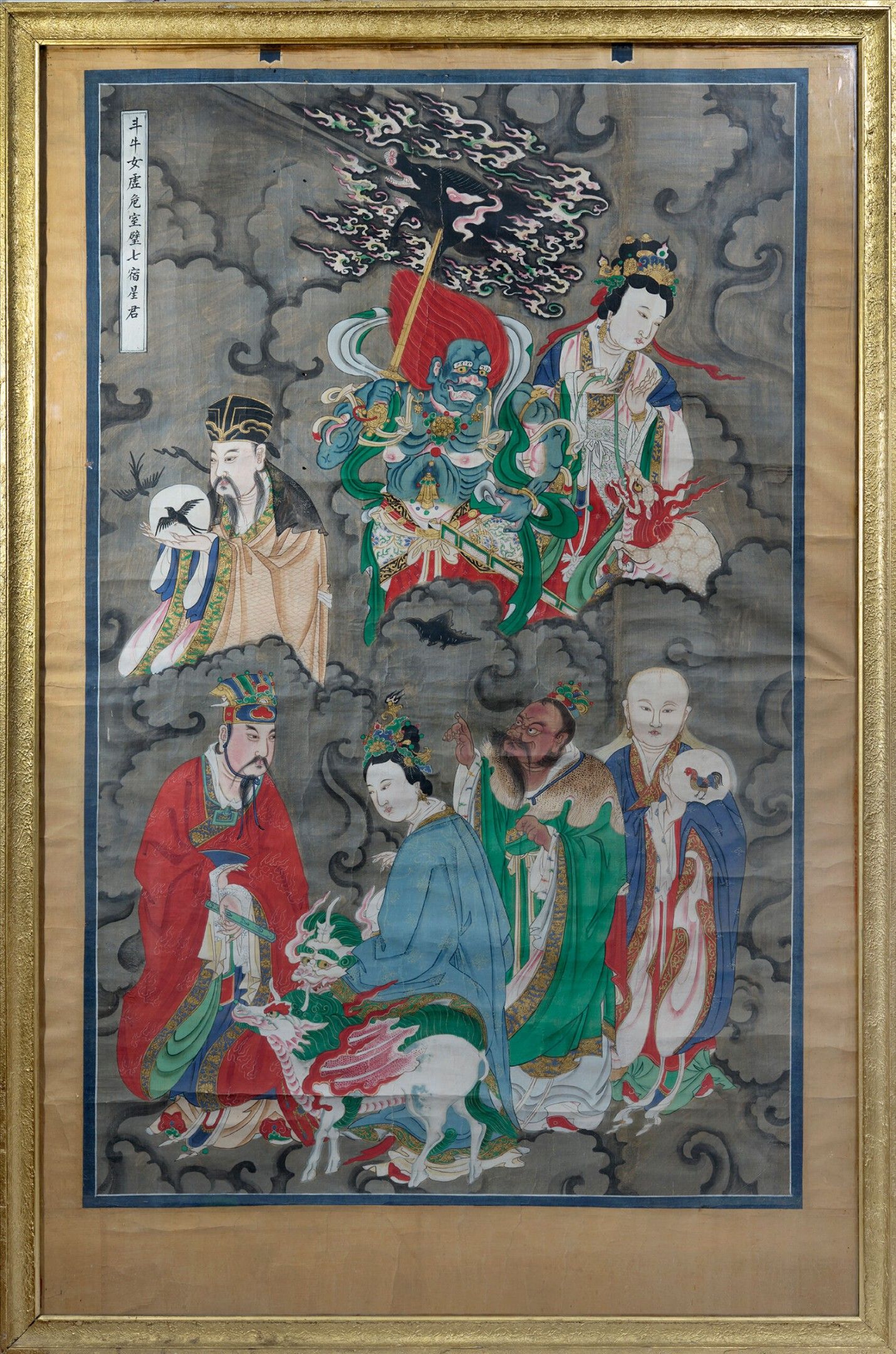 Ink and colours on silk, depicting seven immortals symbolising the northern constellations: Dou, Niu, Nü, Xu, Wei, Shi and Bi, which correspond roughly to the modern constellations of Sagittarius, Capricorn, Aquarius, Pegasus and Andromeda. They are surrounded by dark clouds, each holding his emblem or sacred object.