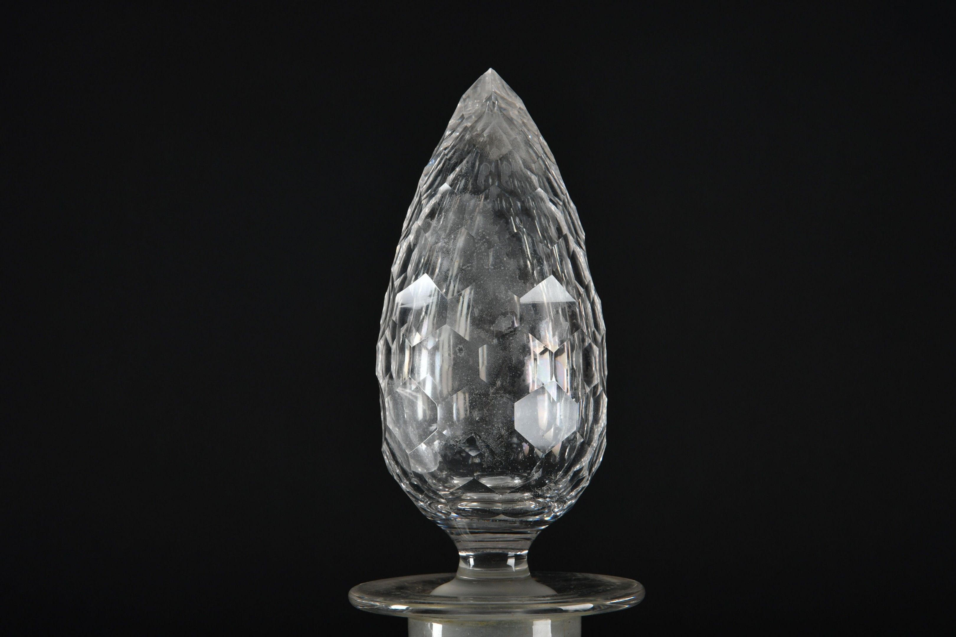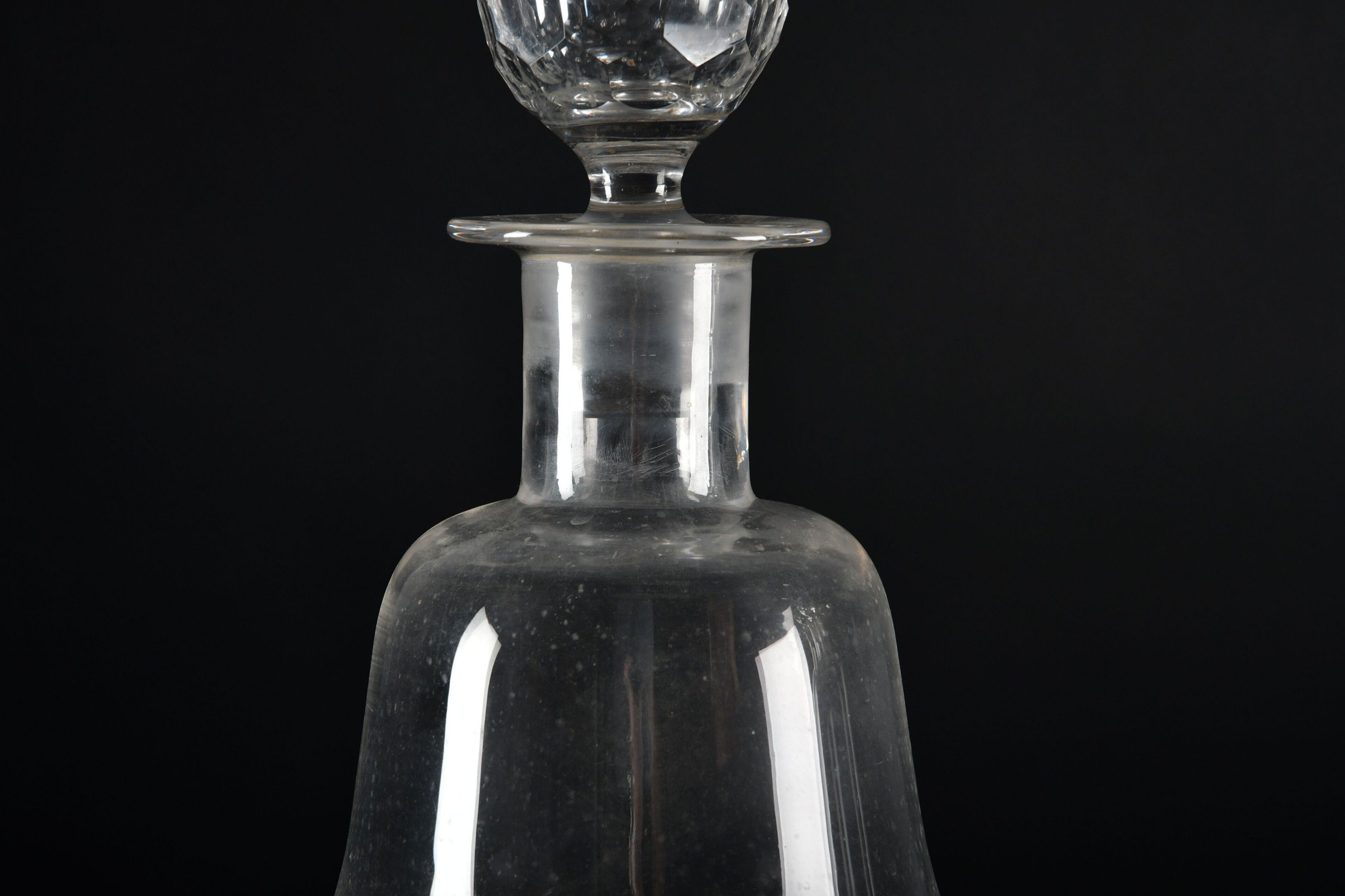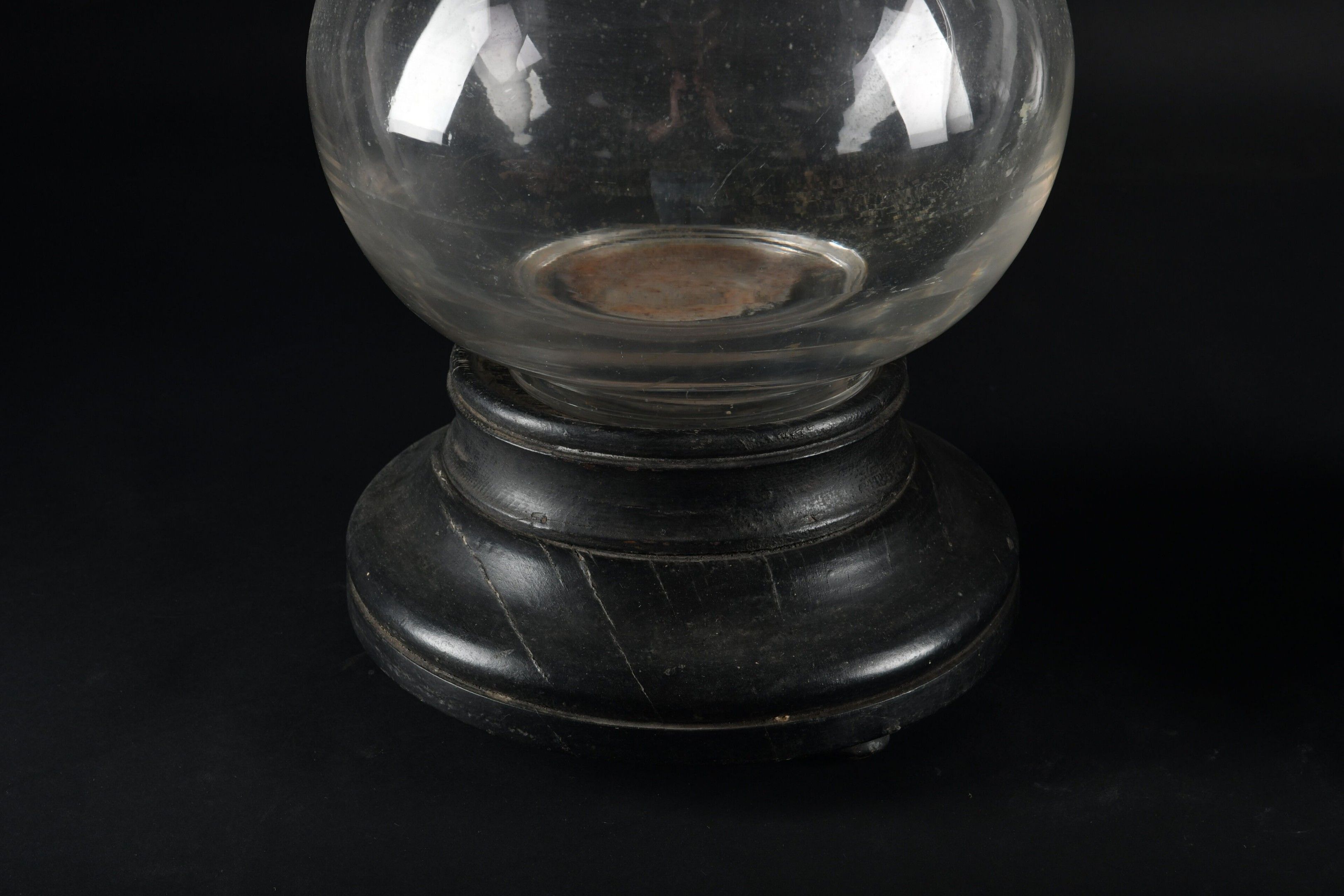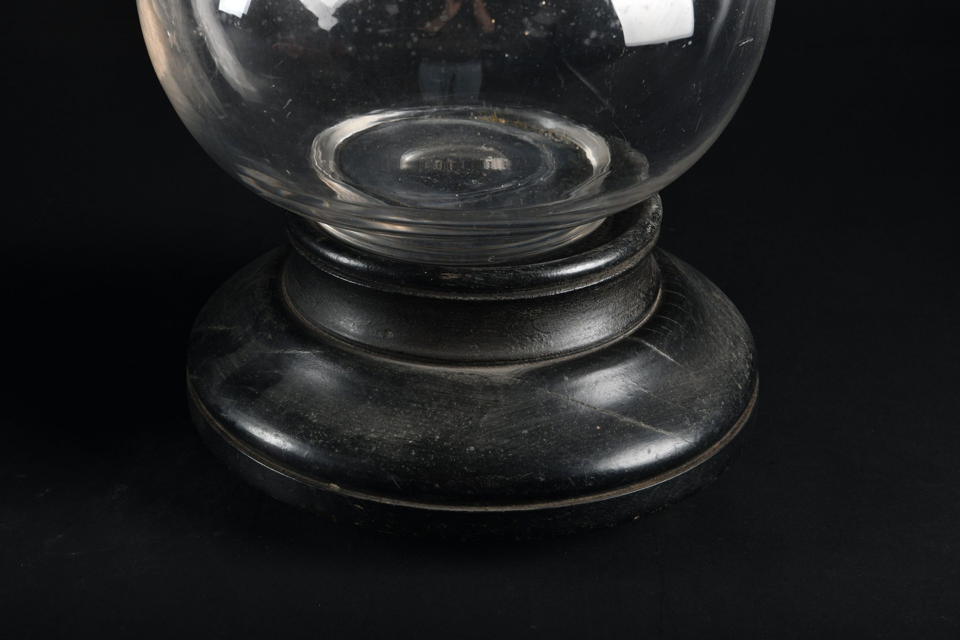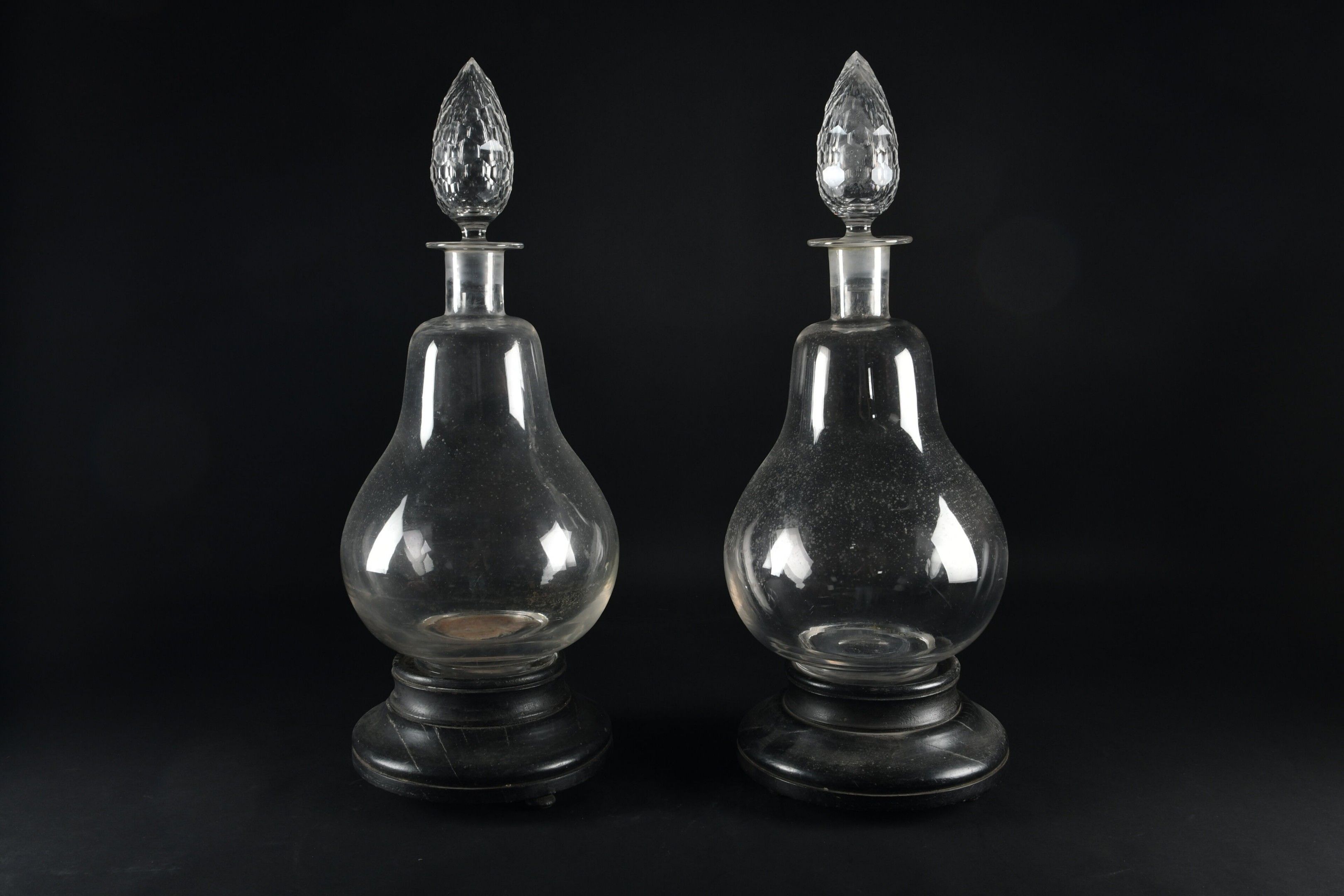 A pair of large baluster-shaped colourless glass PHARMACY JUGS with faceted stopper on a turned blackened wood base. Height 65 cm. Not including base.