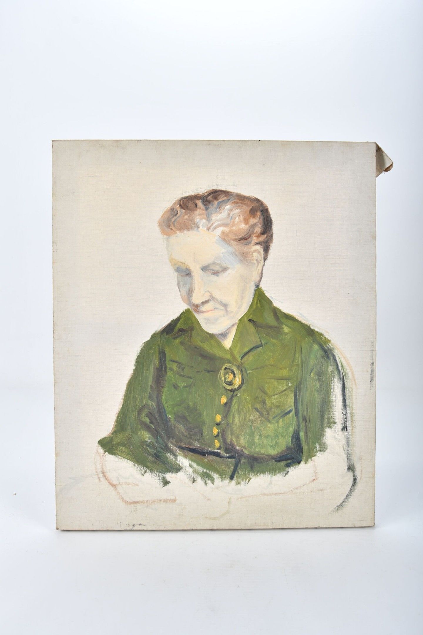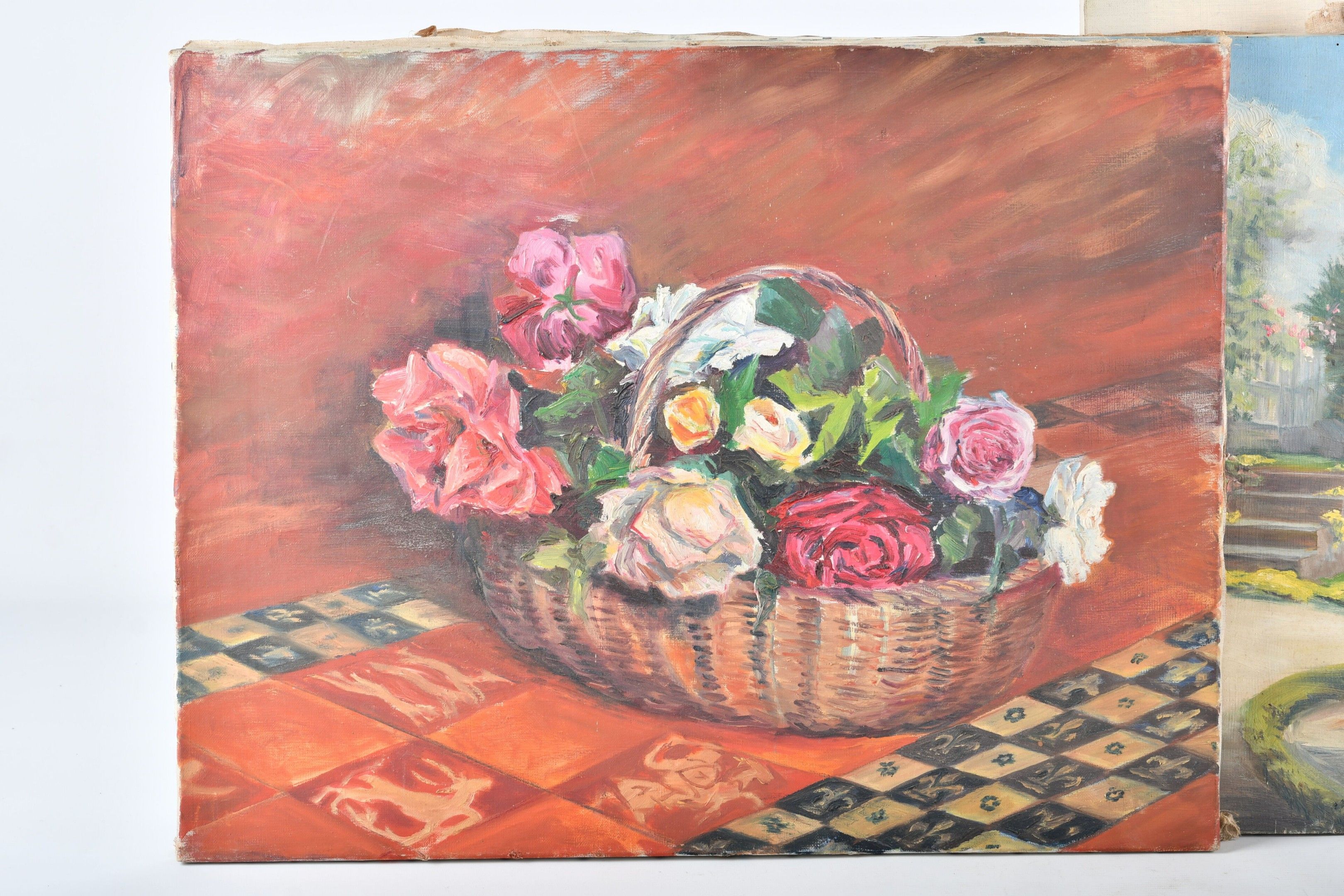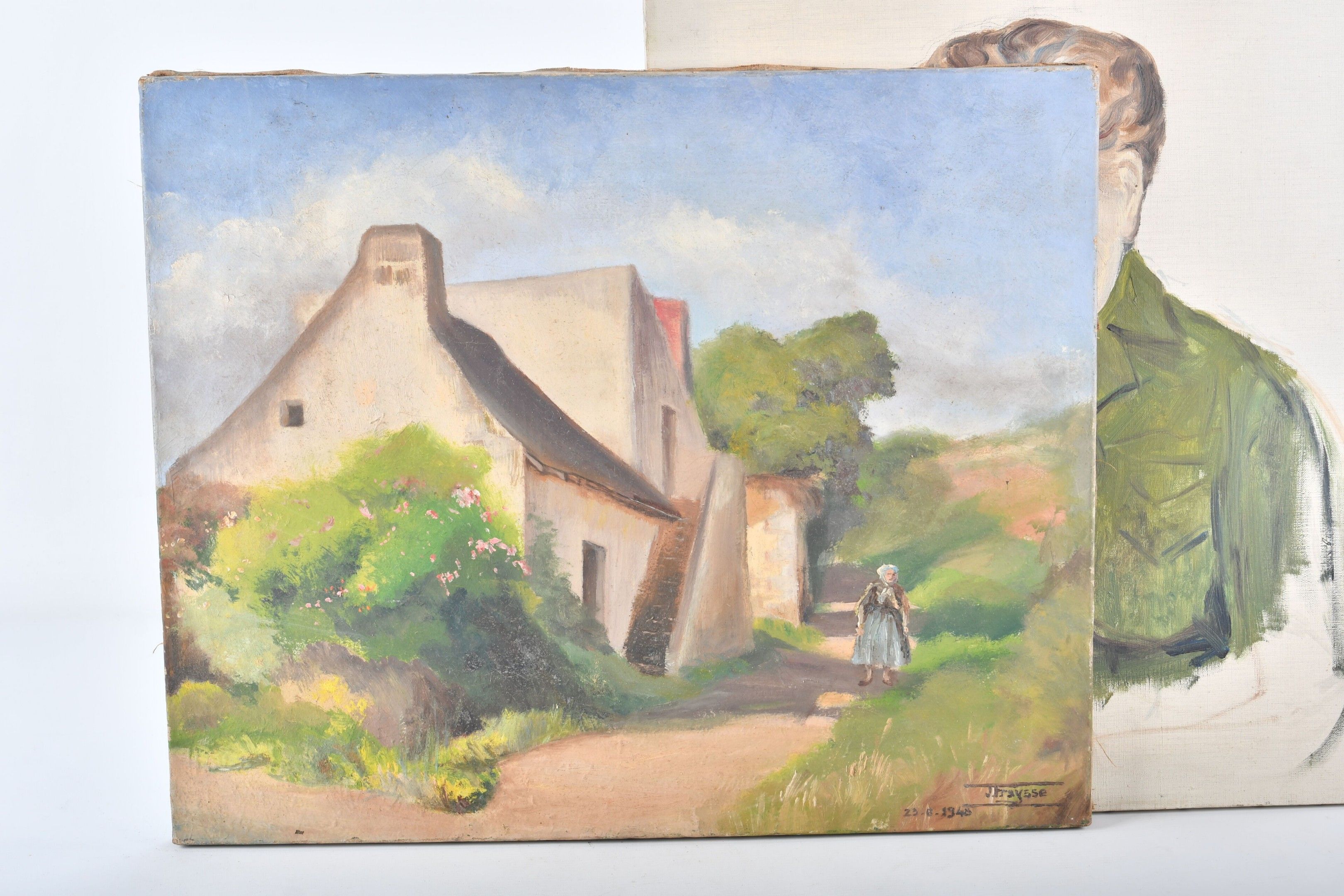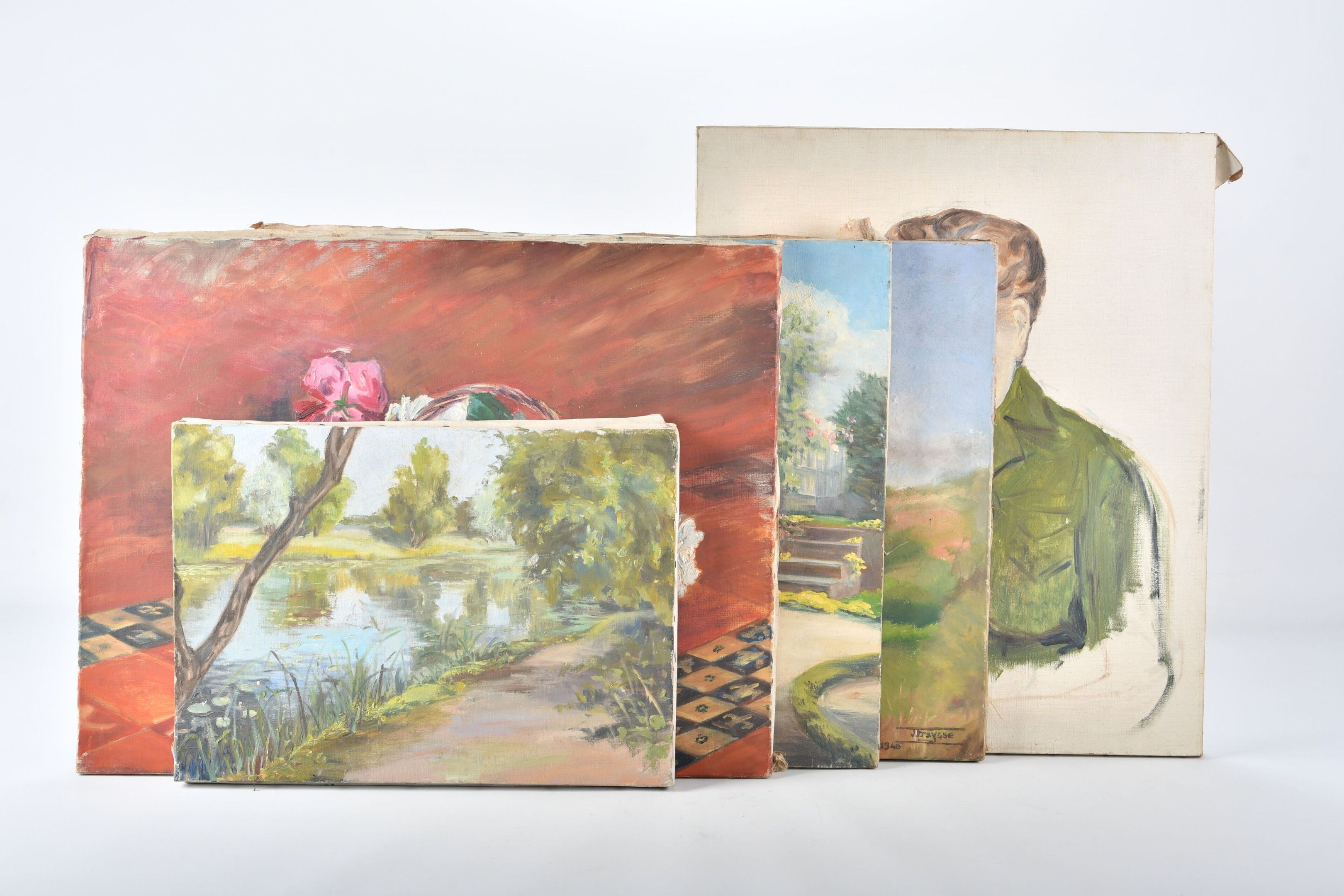 J. FRAYSSE (XXth). lot comprising five oils on canvas including portrait of a woman; still life with a basket of flowers; view of a river; courtyard of a busy house and gateway overlooking the Loire at Le Thoureil. From 33 x 46 to 50 x 61 cm