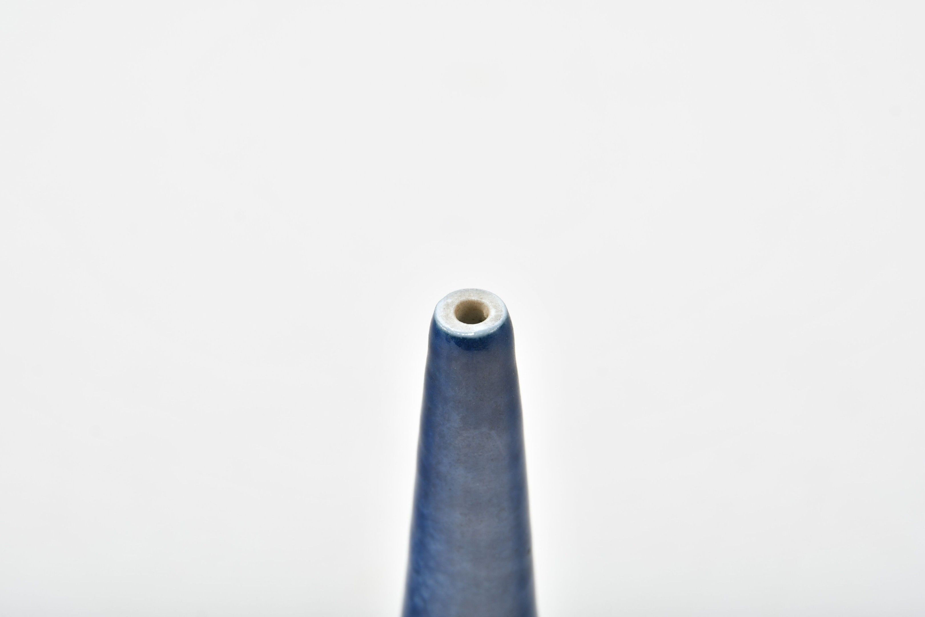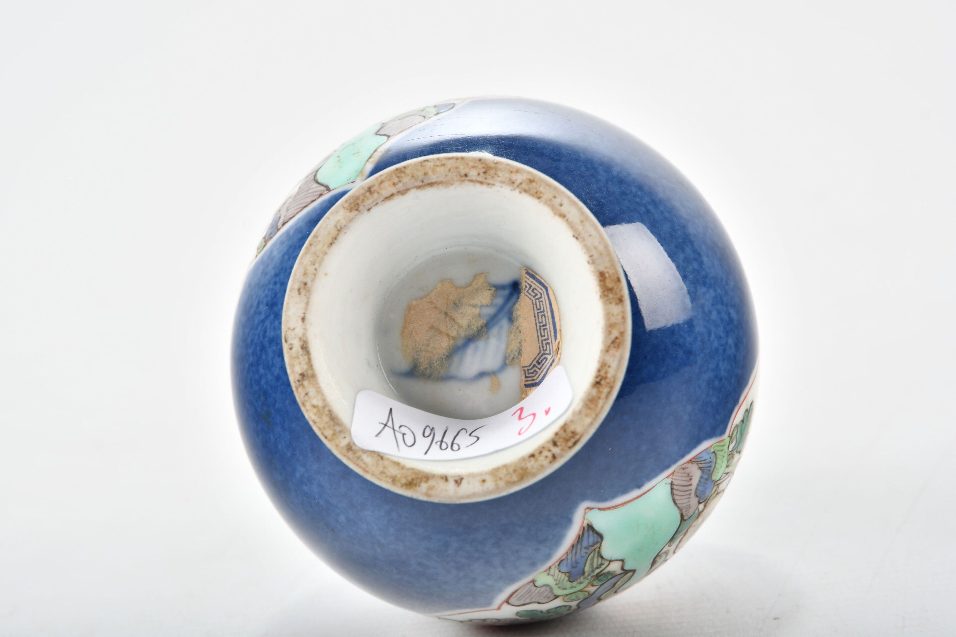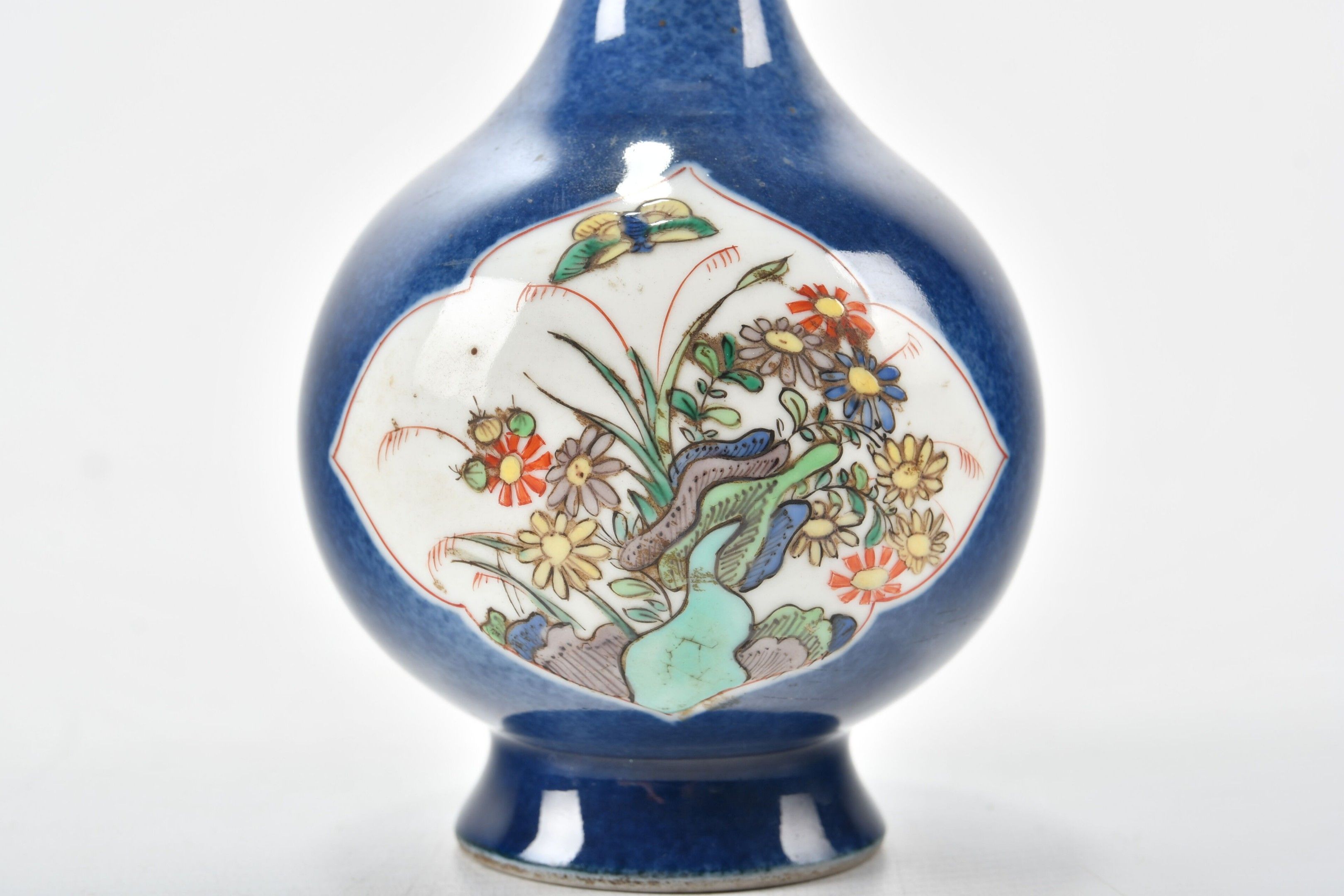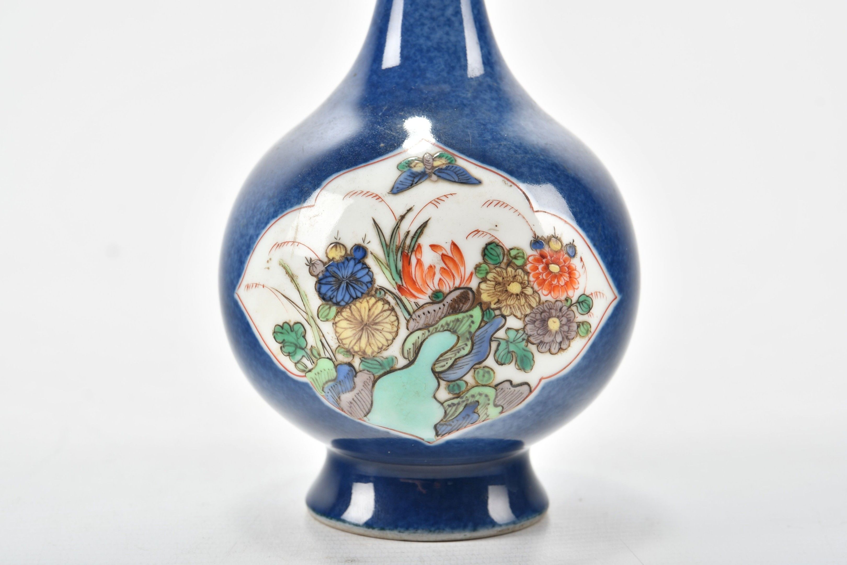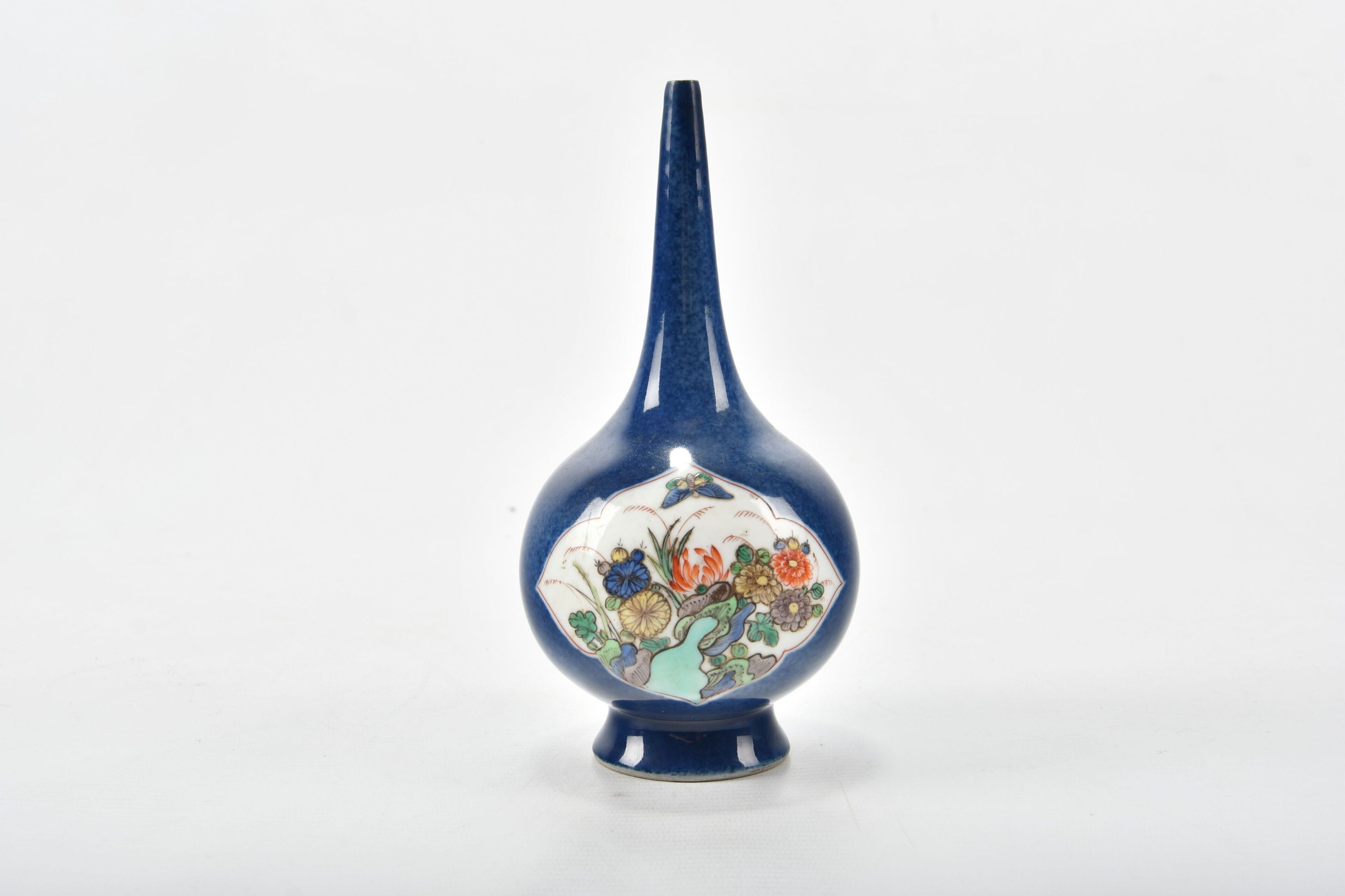 A polychrome porcelain aspersorium vase with floral decoration in reserves on a powder blue background. Leaf mark. Height 18.5 cm