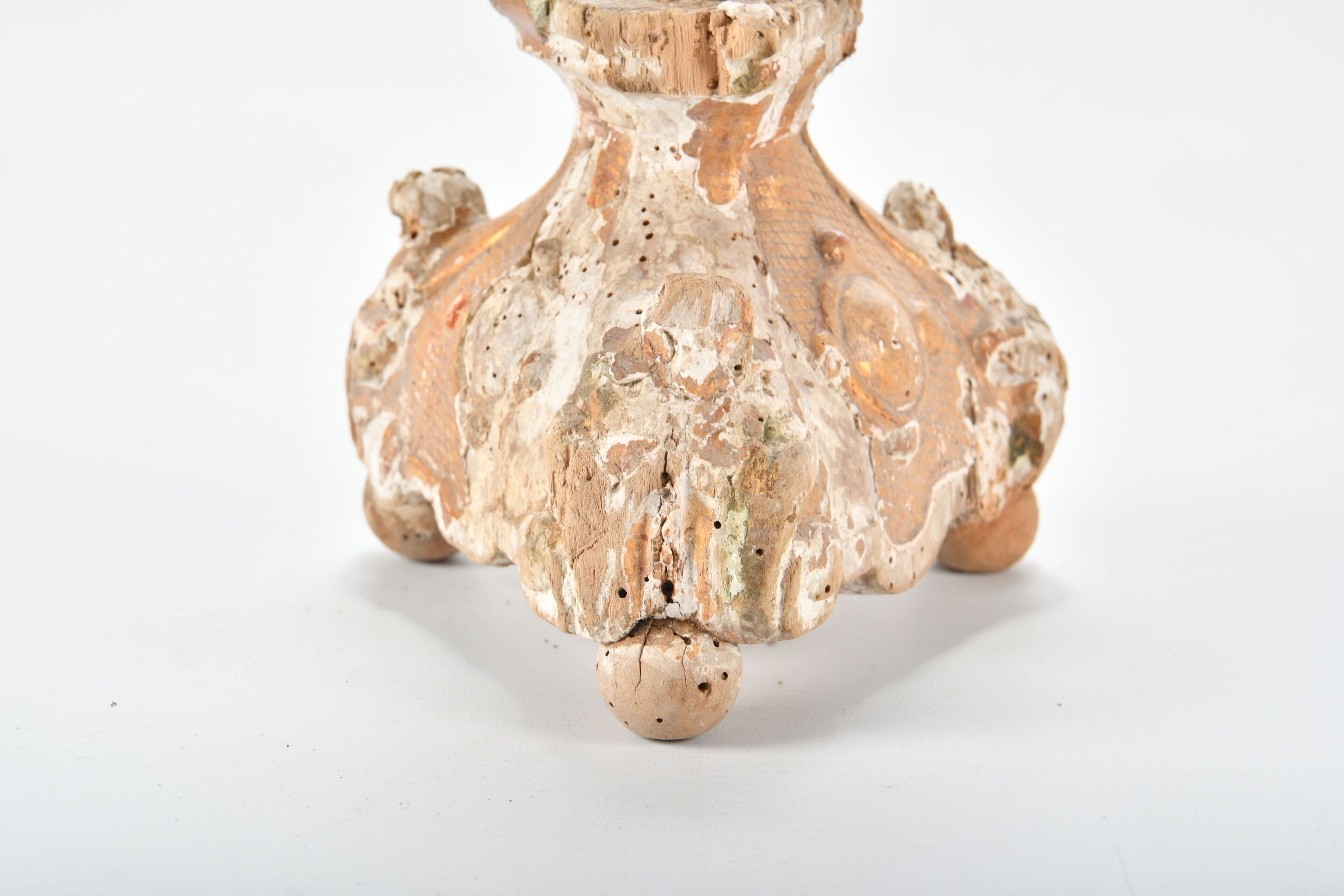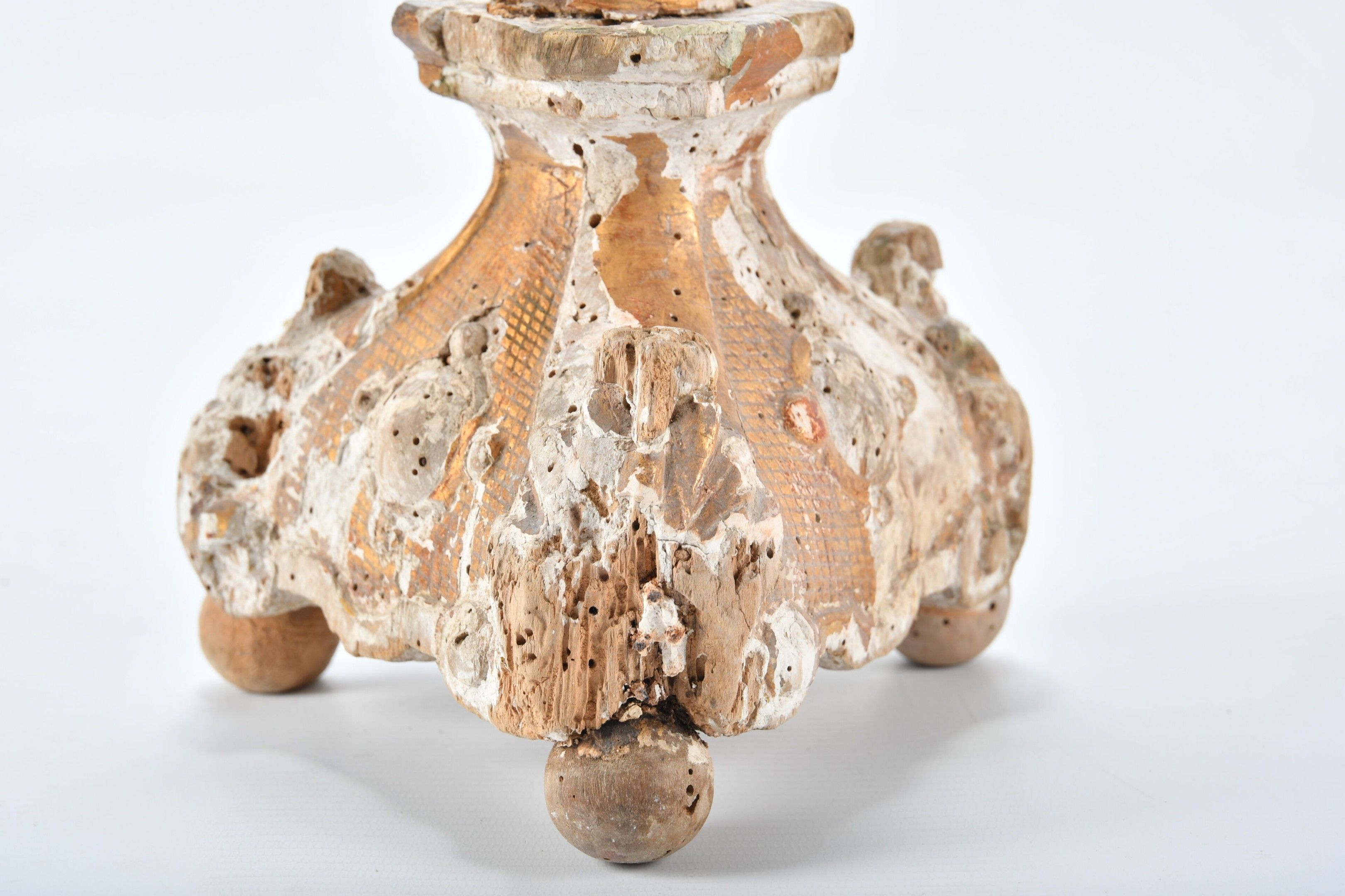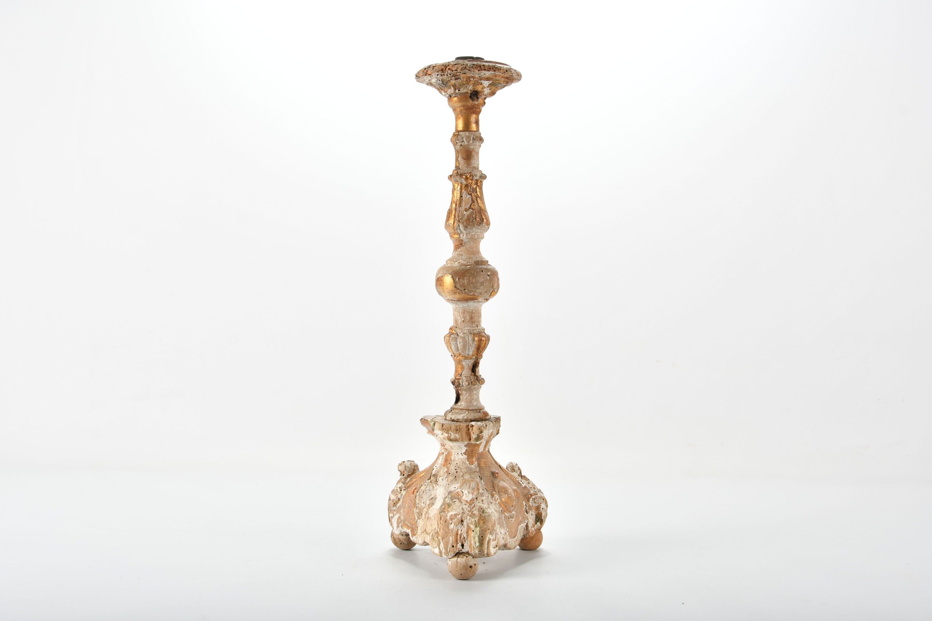 Carved and gilded wood candlestick. Baluster shape decorated with a frieze of pearls, foliage and gadroons resting on a tripod base with acanthus leaves in the corners. Work of the 18th century. H. 47. Missing, significant gilding, minor worm damage and accidents.