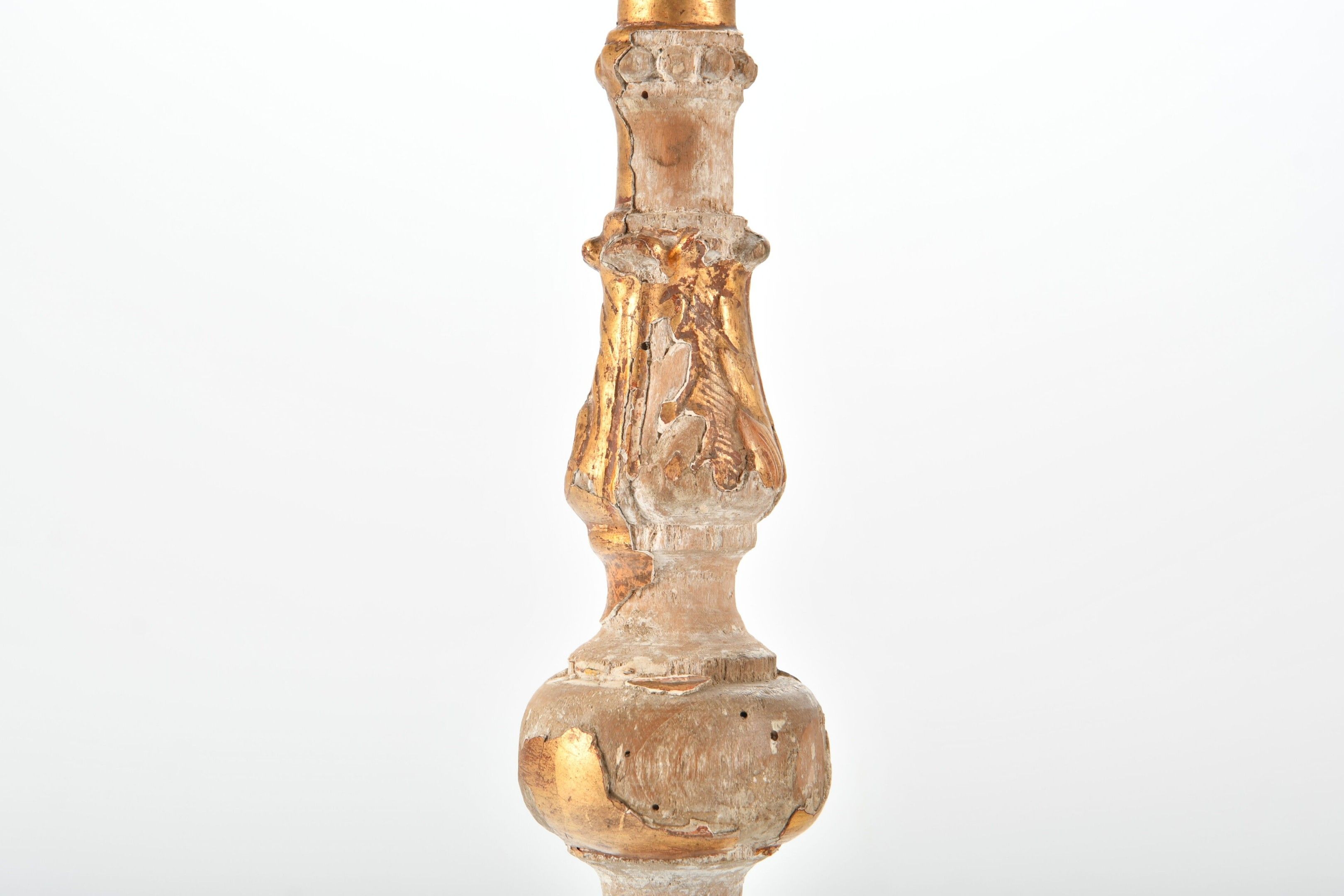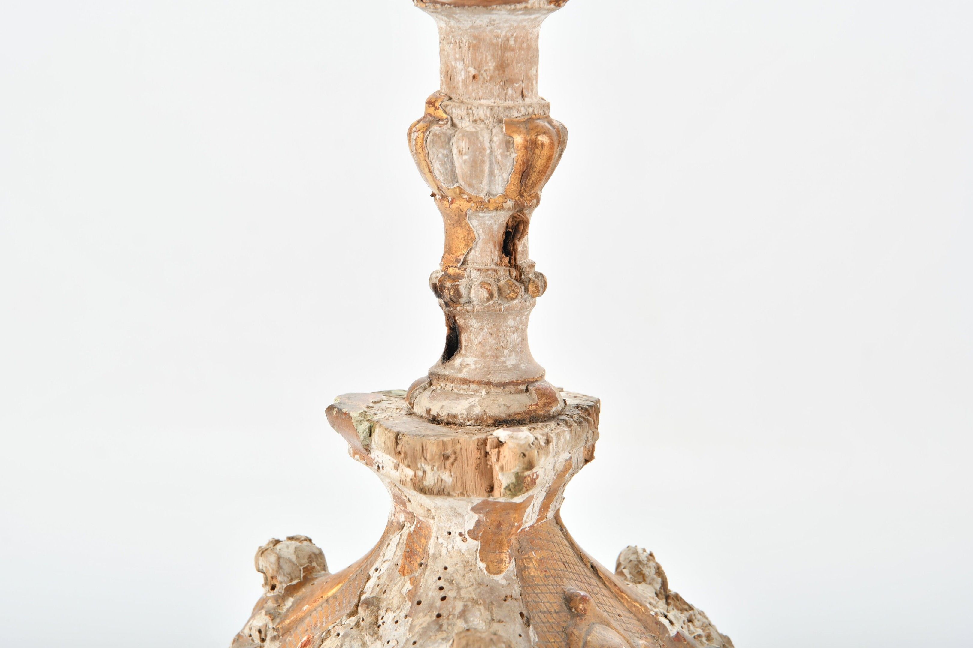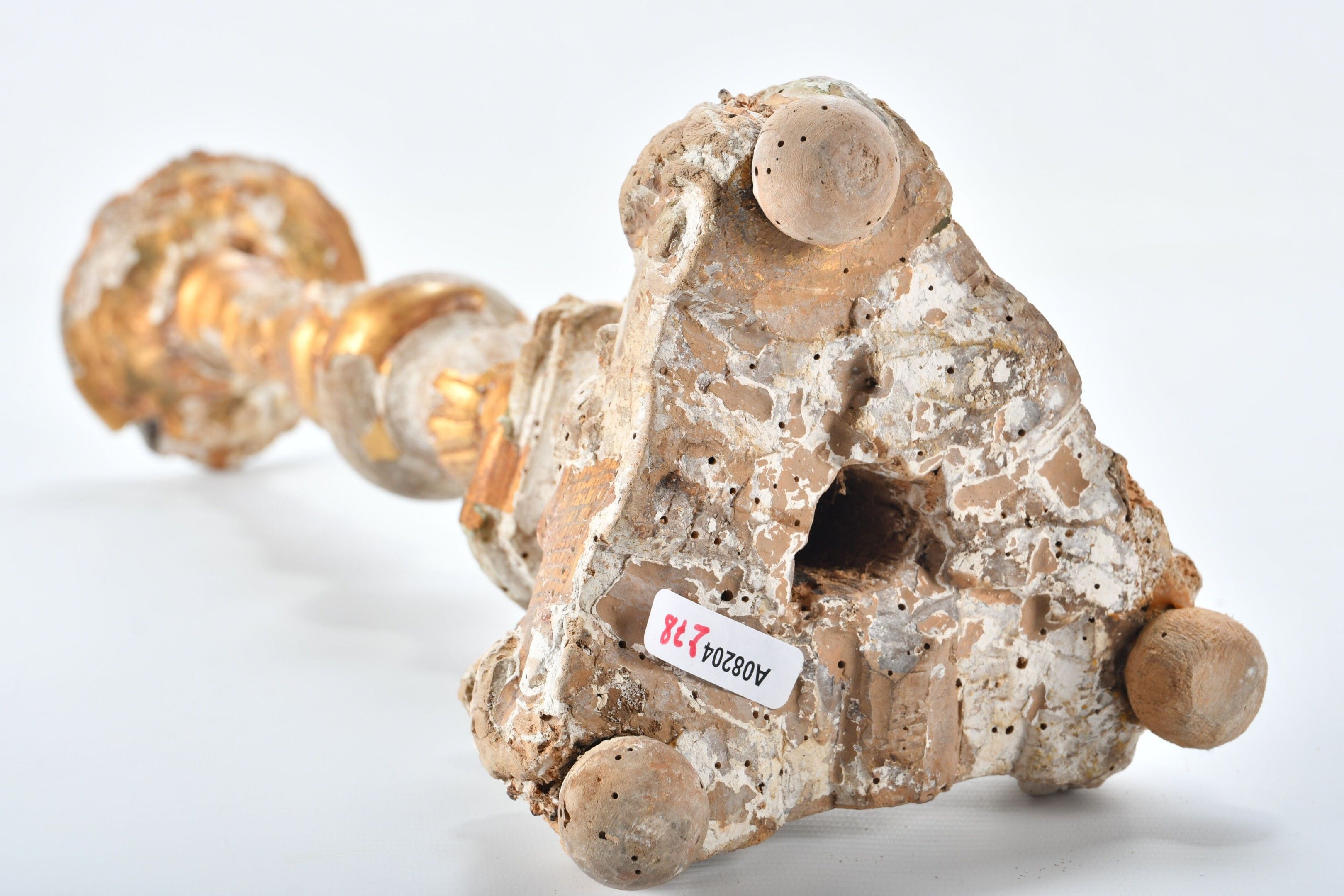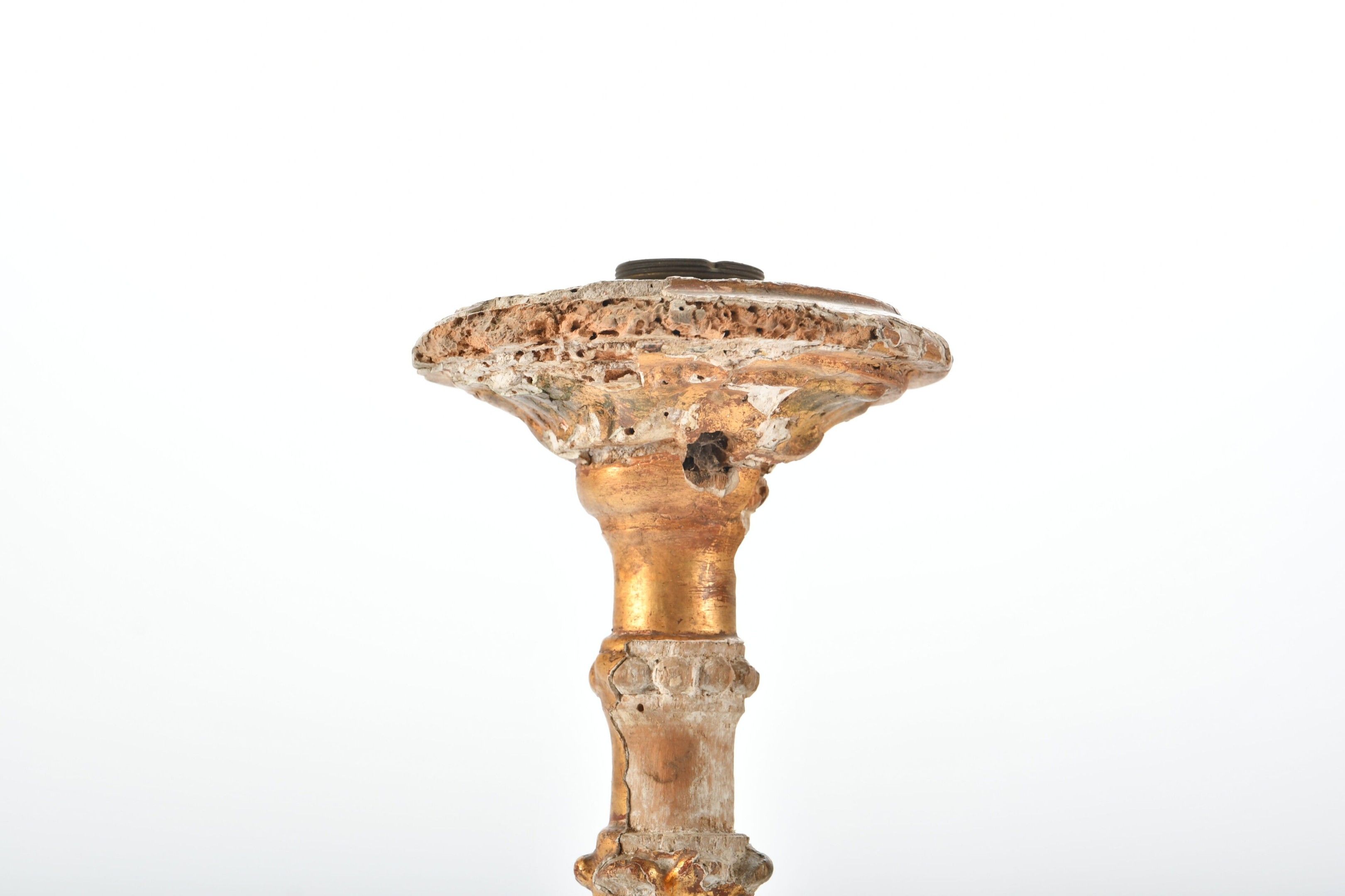 Carved and gilded wood candlestick. Baluster shape decorated with a frieze of pearls, foliage and gadroons resting on a tripod base with acanthus leaves in the corners. Work of the 18th century. H. 47. Missing, significant gilding, minor worm damage and accidents.
