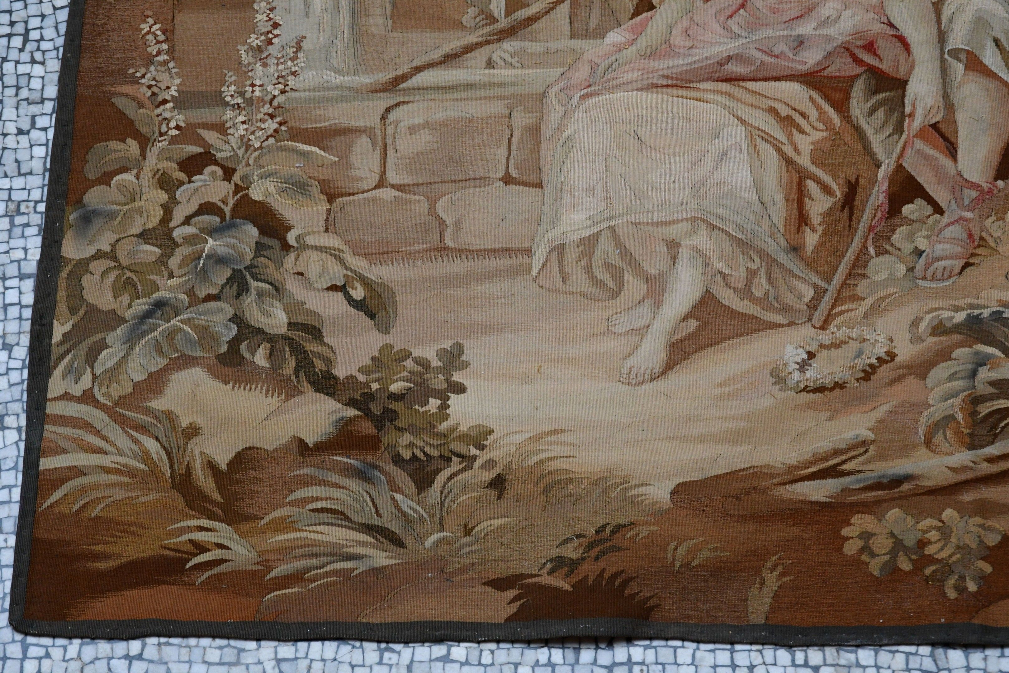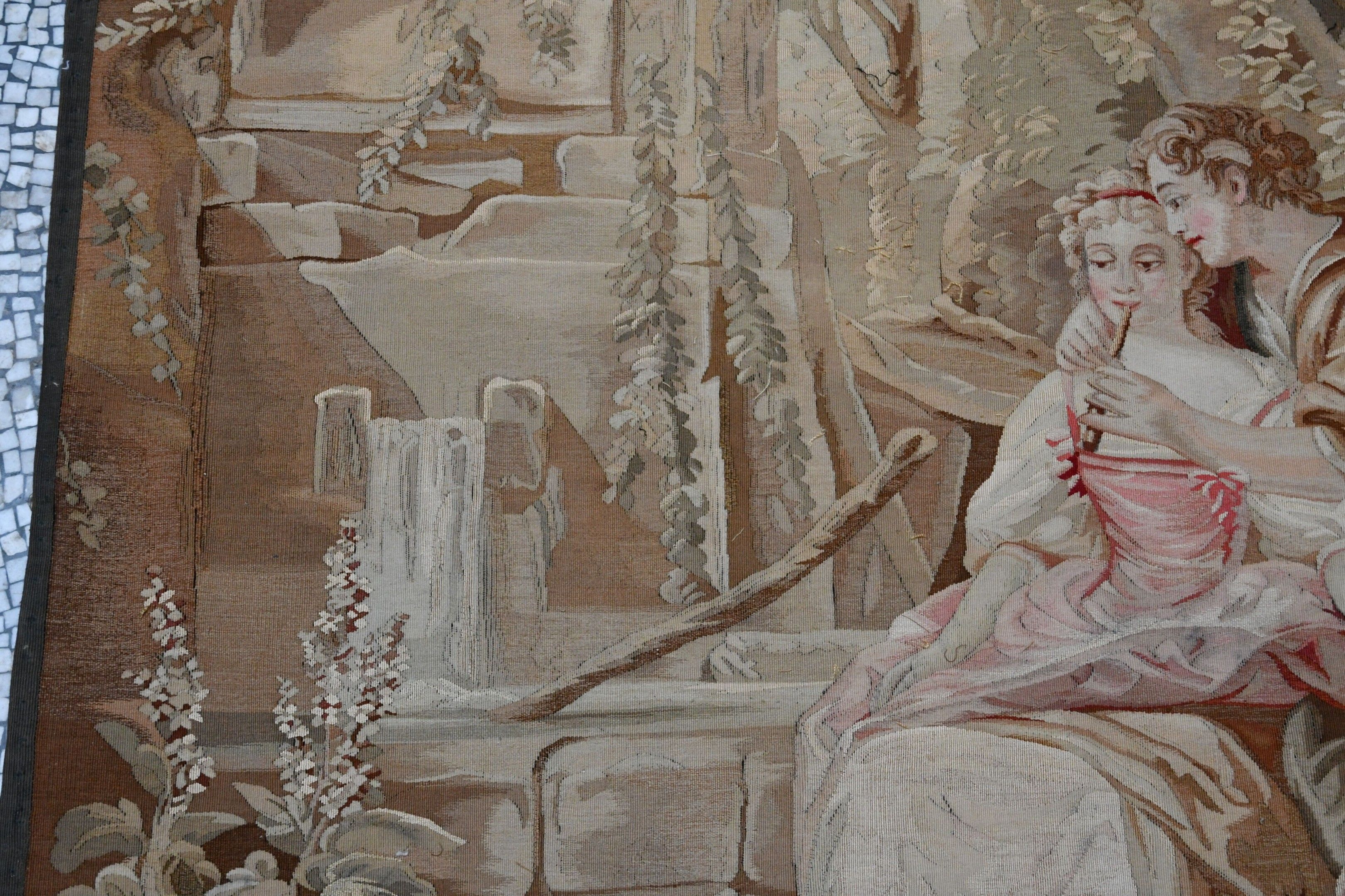 AUBUSSON, Atelier Braquenié & cie " Scène galante dans les ruines ", woollen tapestry in the XVIIIth century taste and produced in the XXth century. Signed lower right. 200 x 159 cm