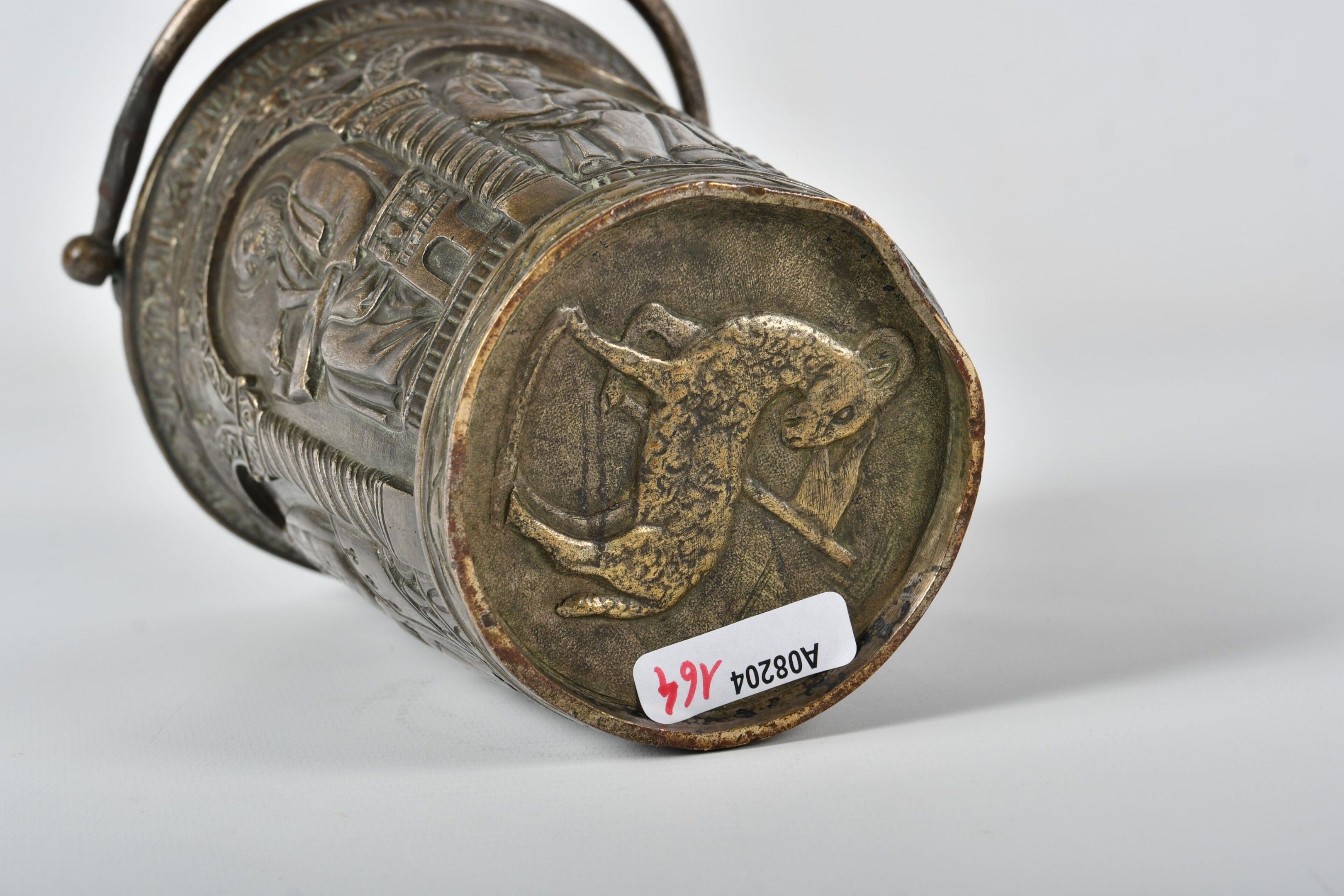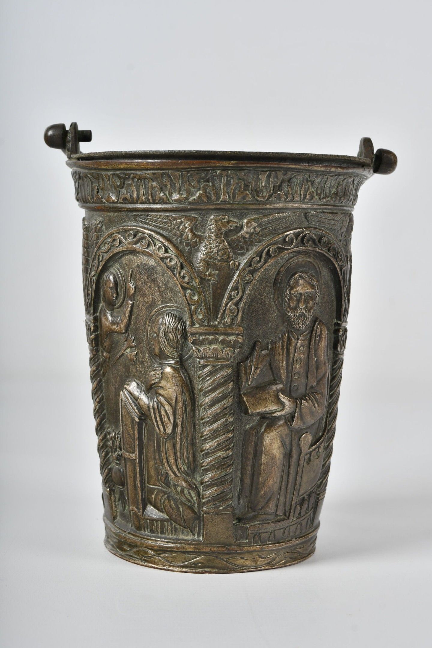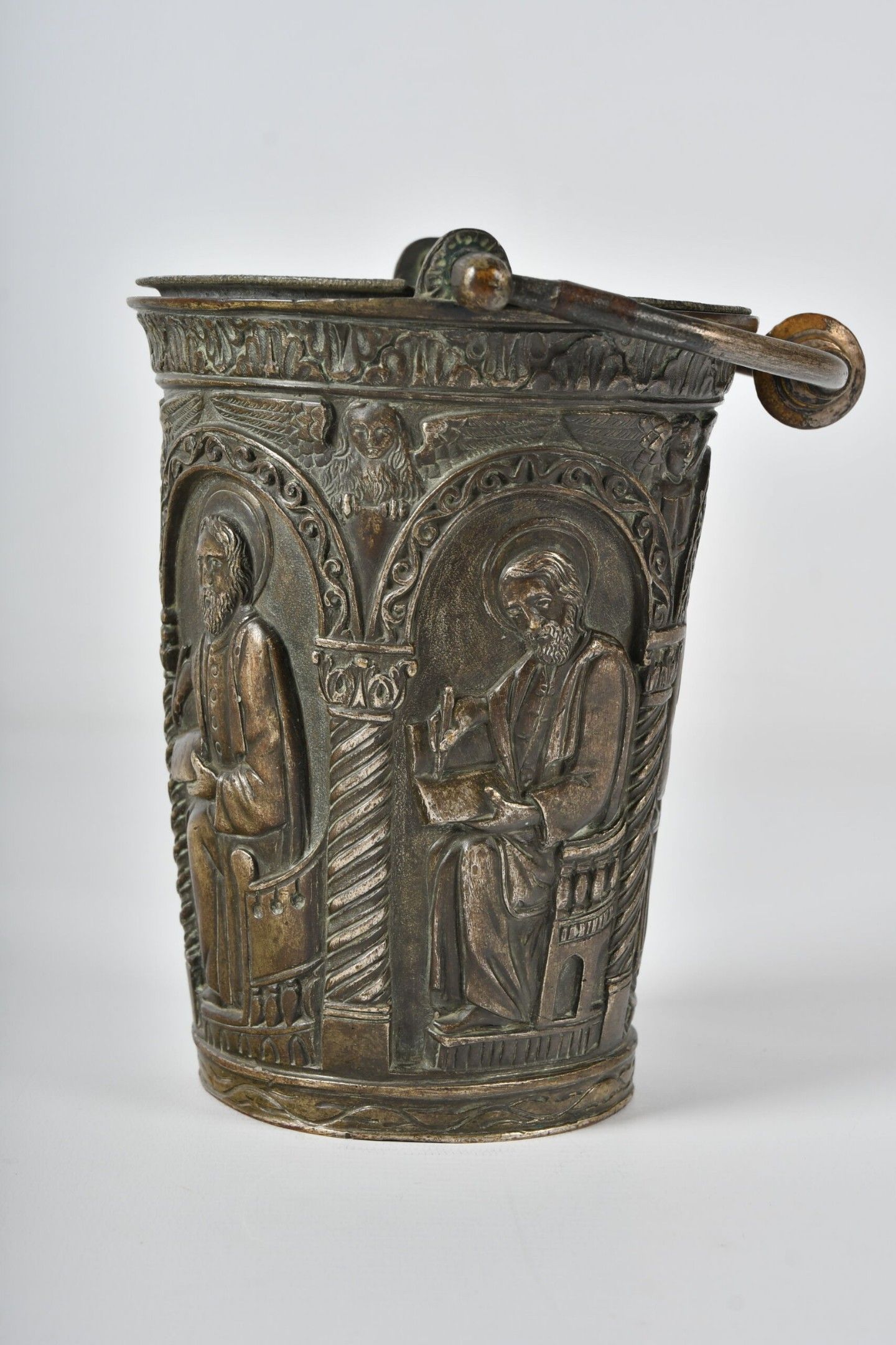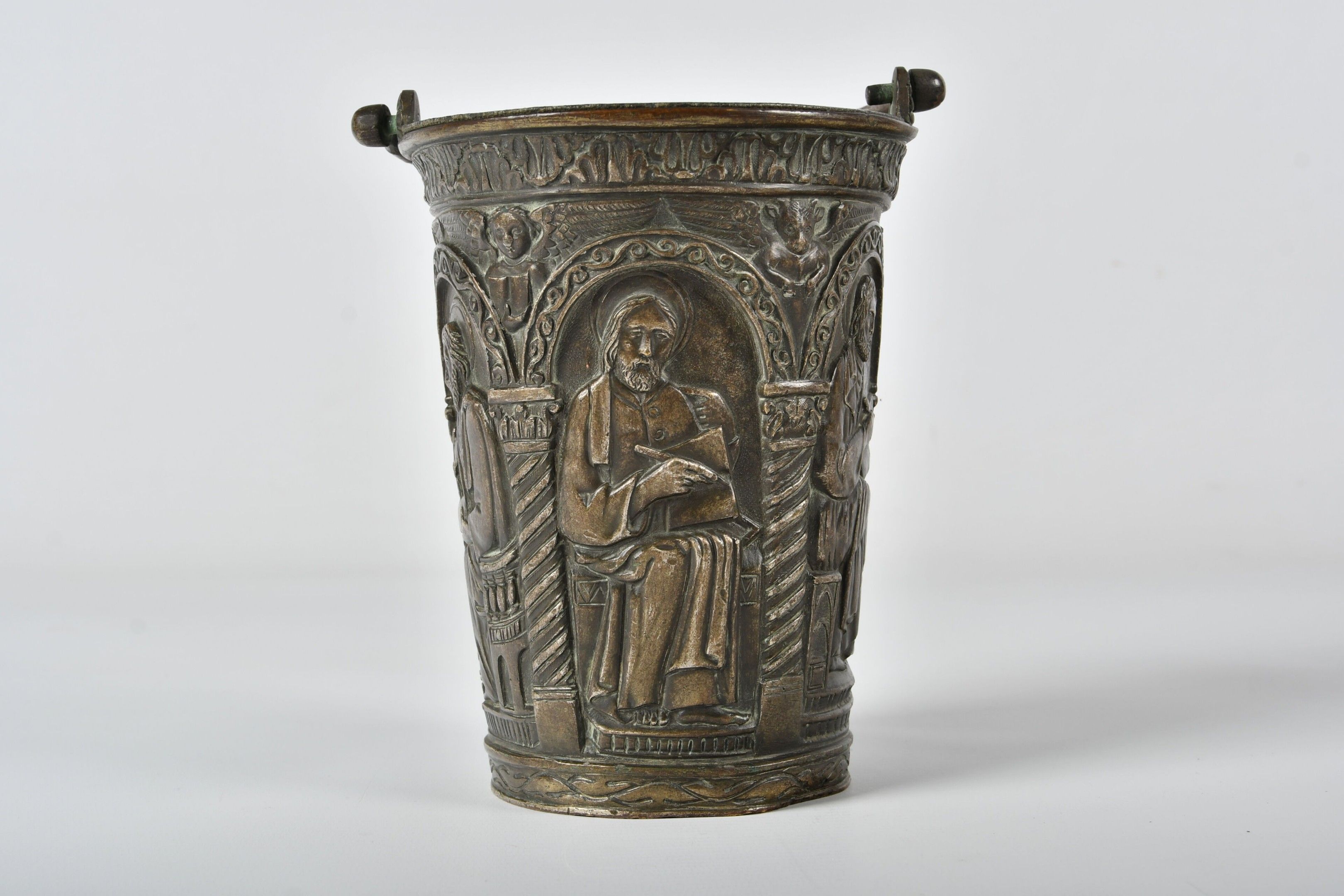 Bronze bucket with bas-relief decoration of evangelists and frieze in the medieval style. 20th century. Height 17.5 cm