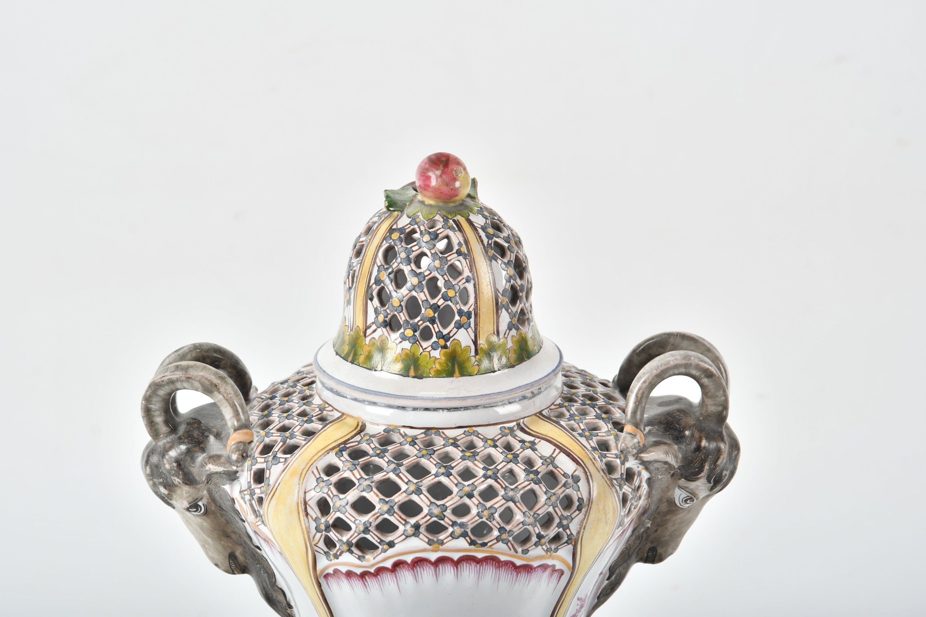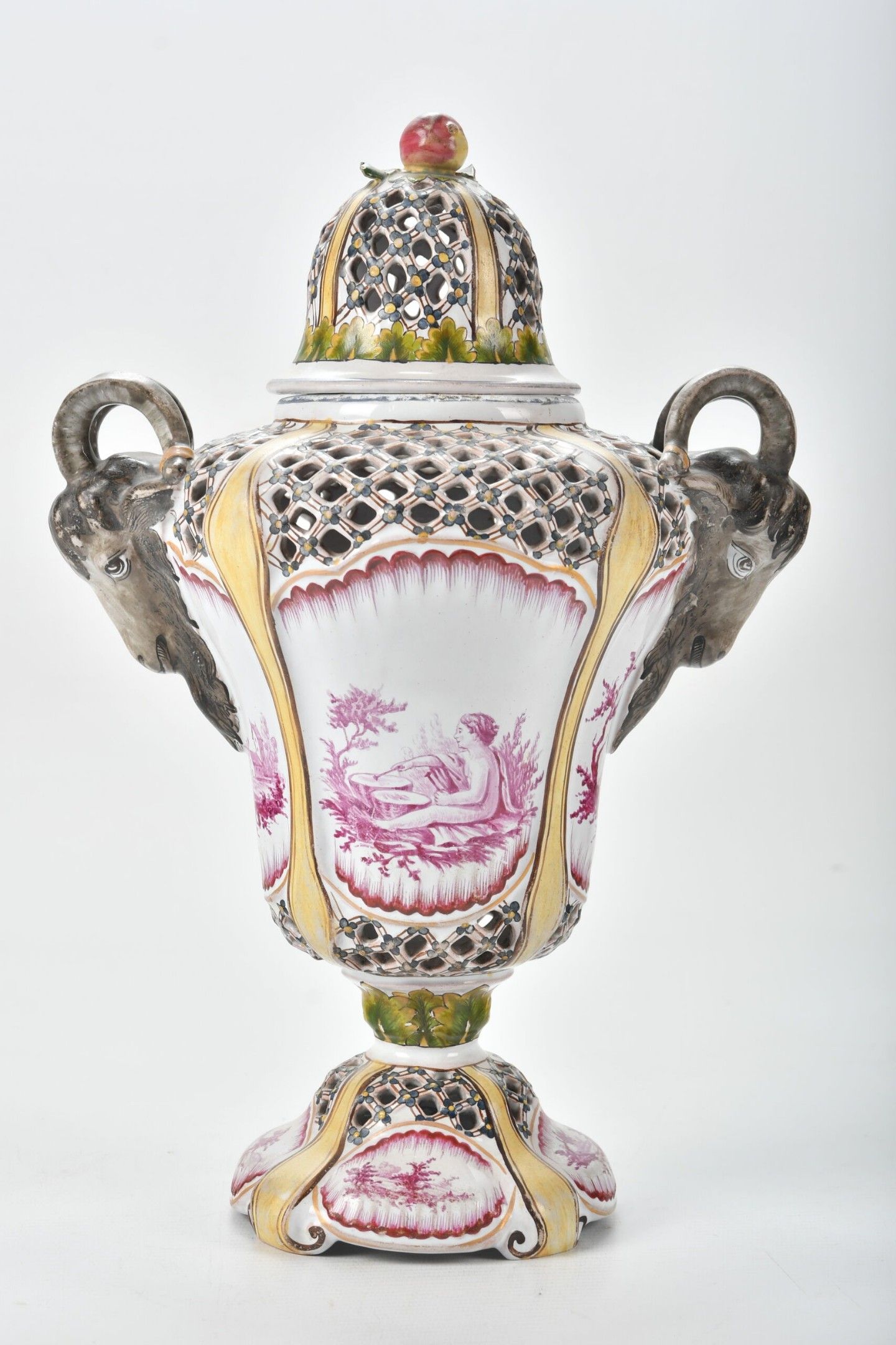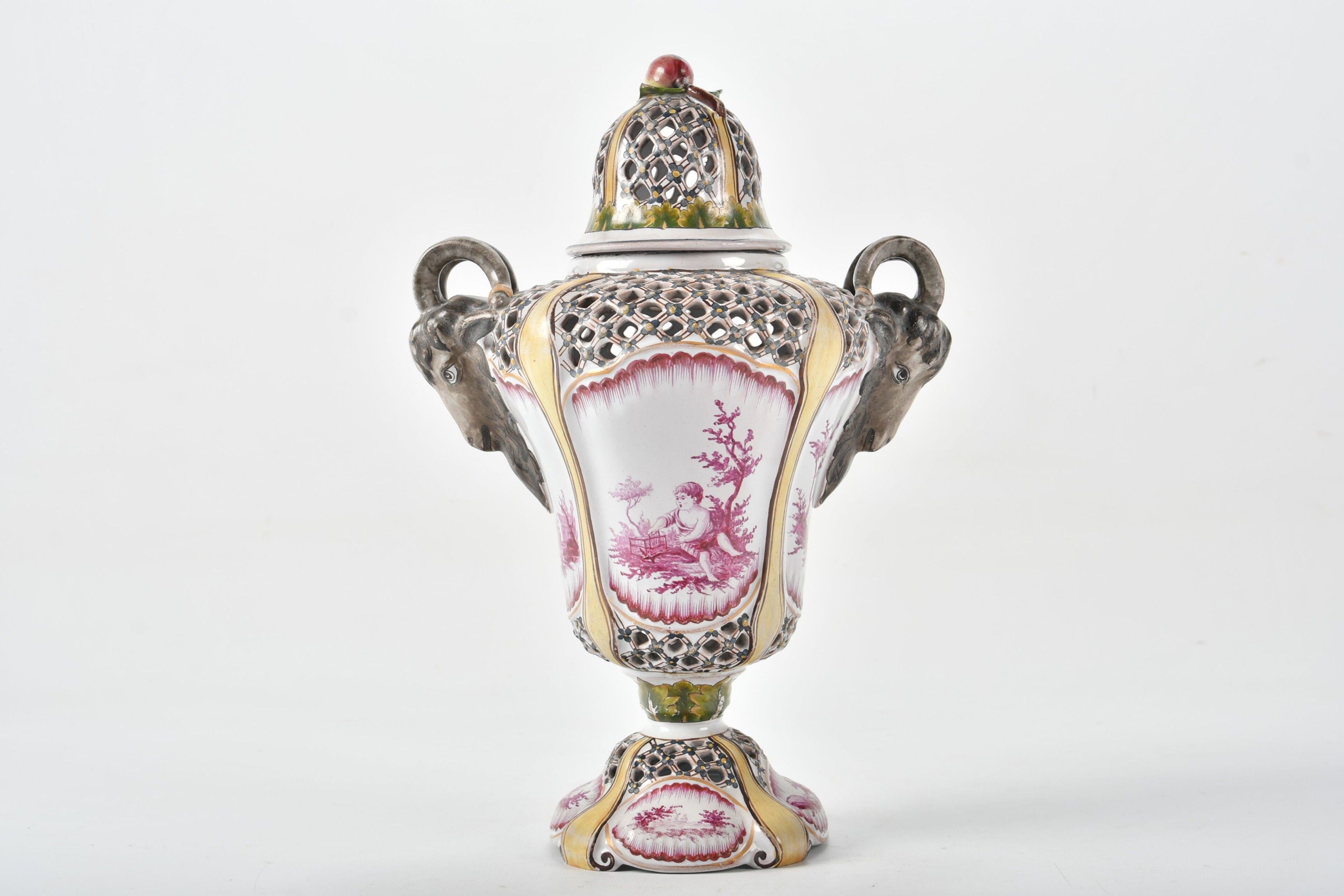 A baluster-shaped glazed earthenware POT-POURRI with two goat-head handles and an openwork latticework lid. Polychrome painted decoration of children's scenes in pink and yellow foliage and fillets. The fruit-shaped handle. Height 32 cm. The fruit foliage is slightly missing.