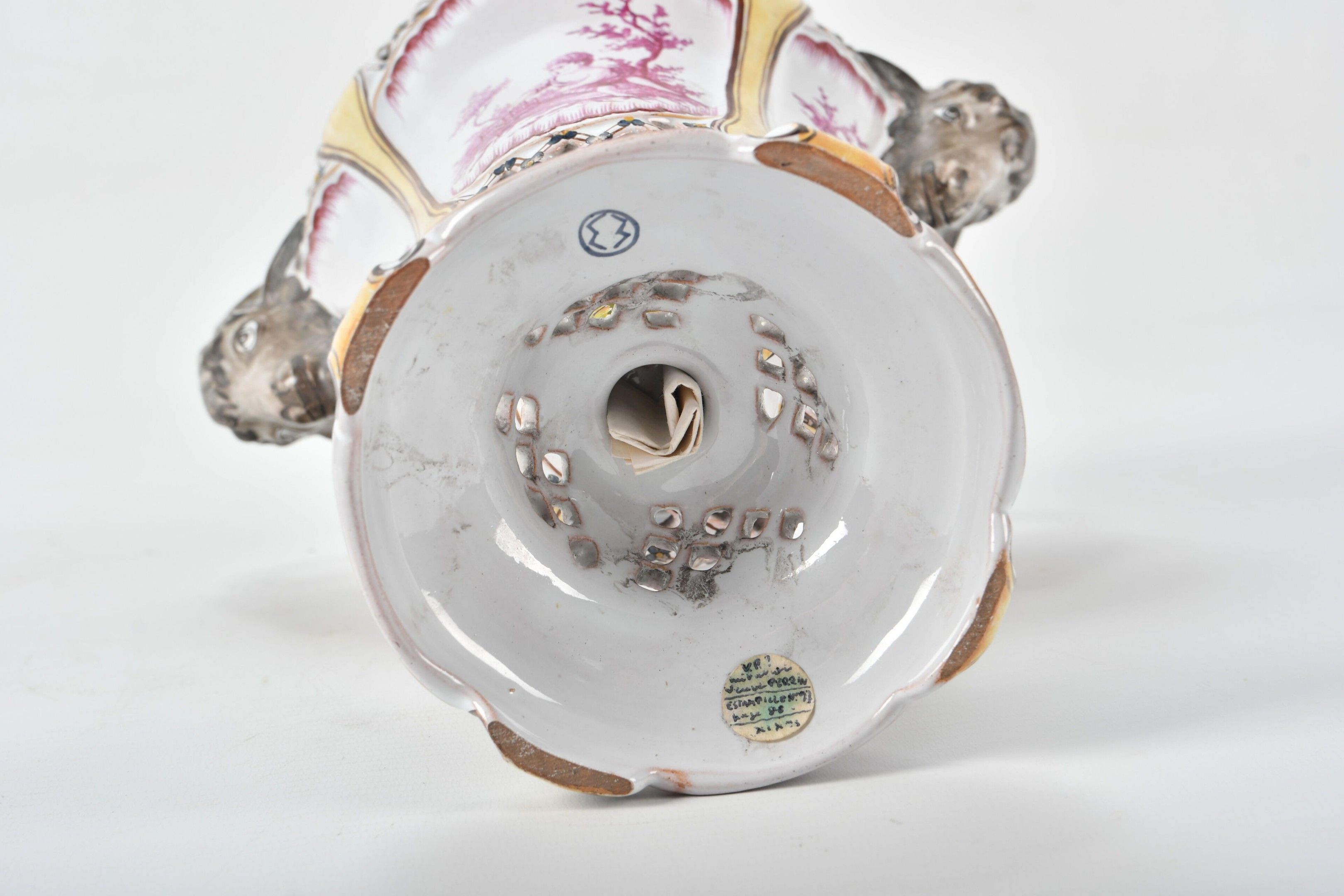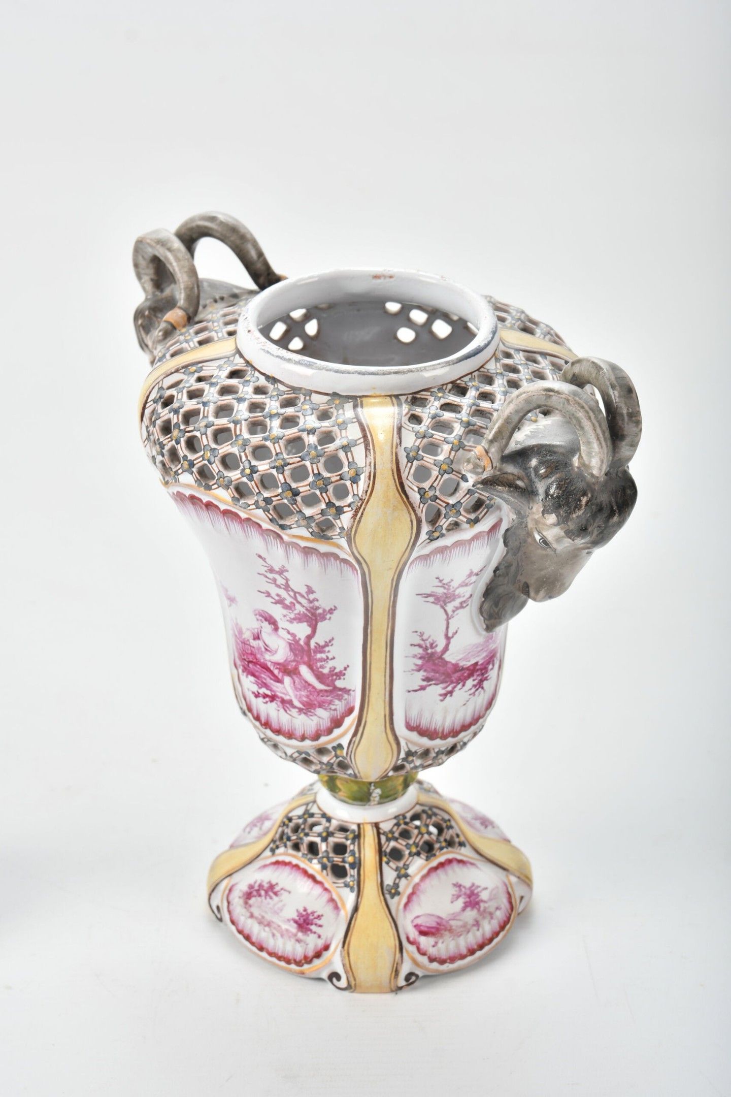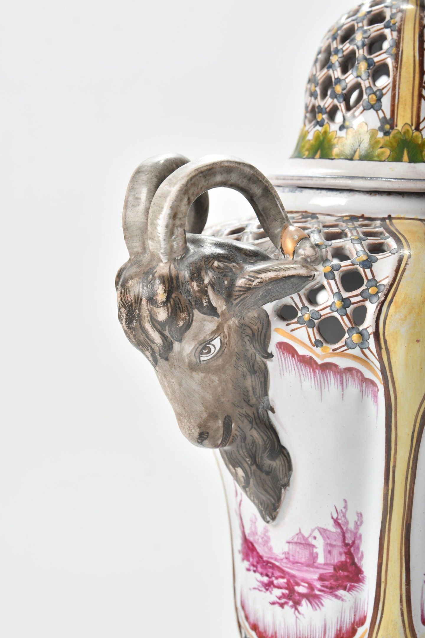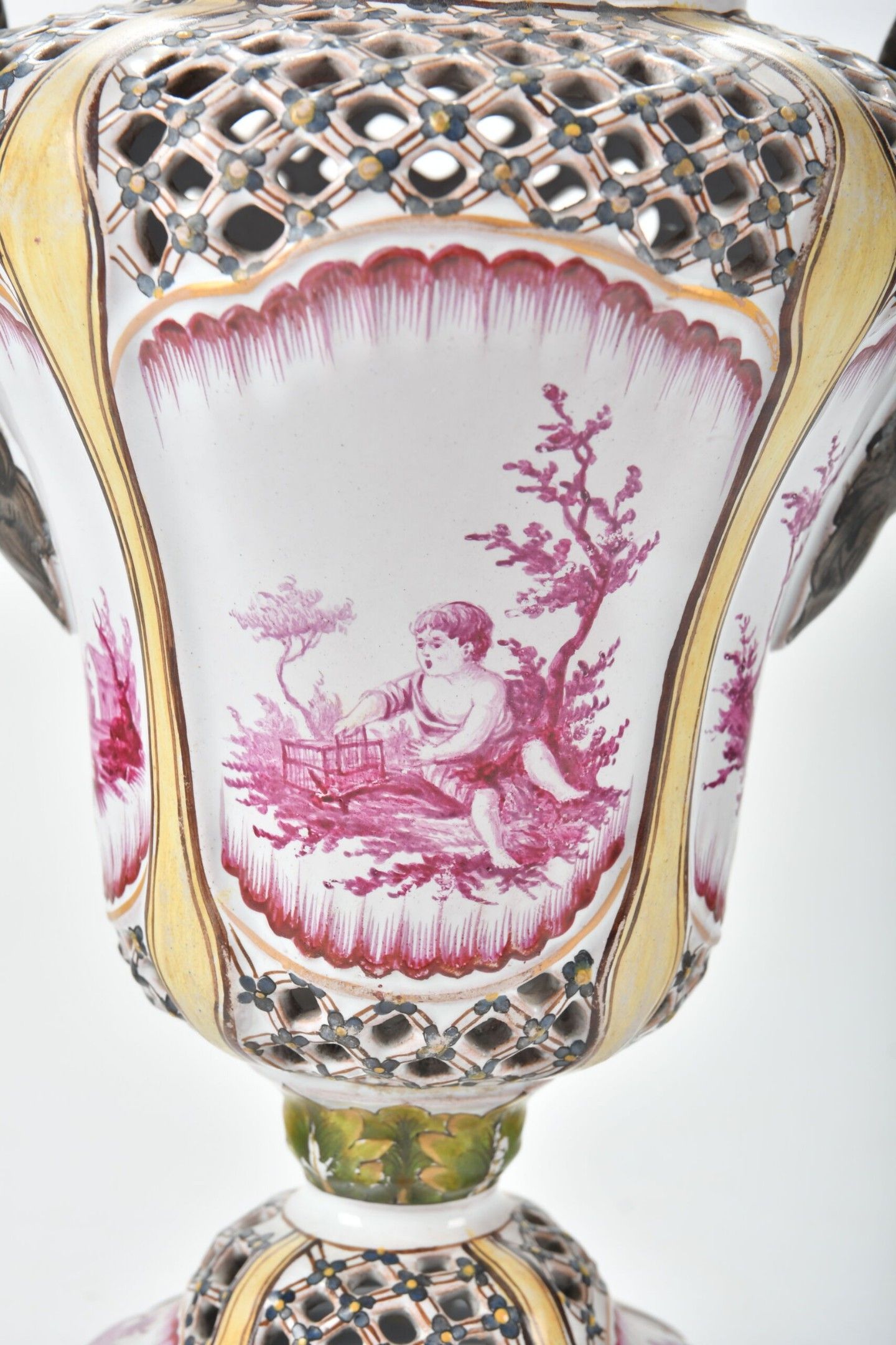 A baluster-shaped glazed earthenware POT-POURRI with two goat-head handles and an openwork latticework lid. Polychrome painted decoration of children's scenes in pink and yellow foliage and fillets. The fruit-shaped handle. Height 32 cm. The fruit foliage is slightly missing.