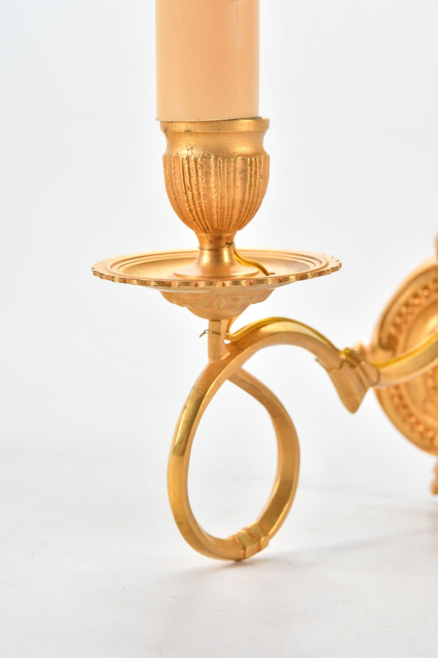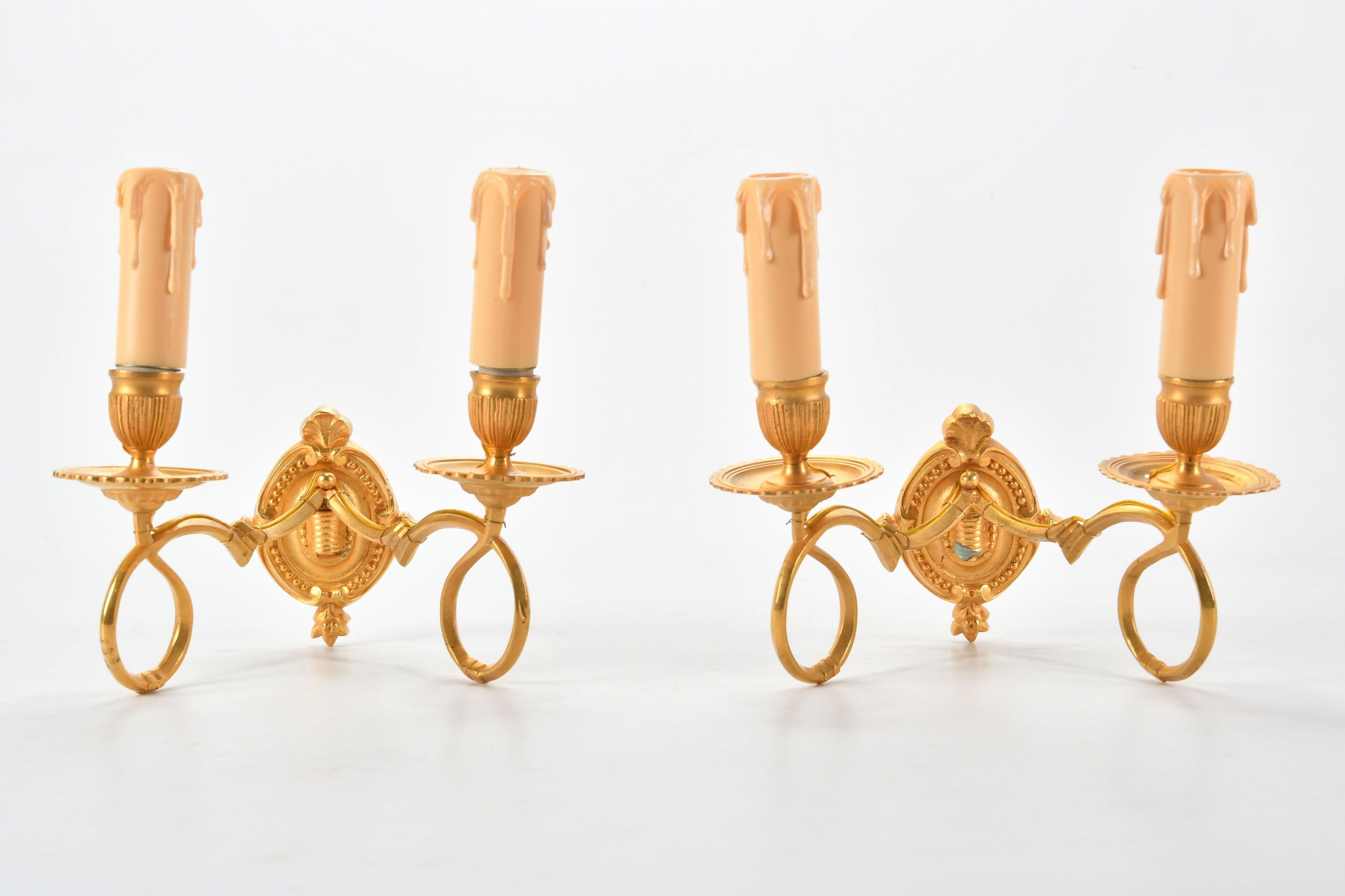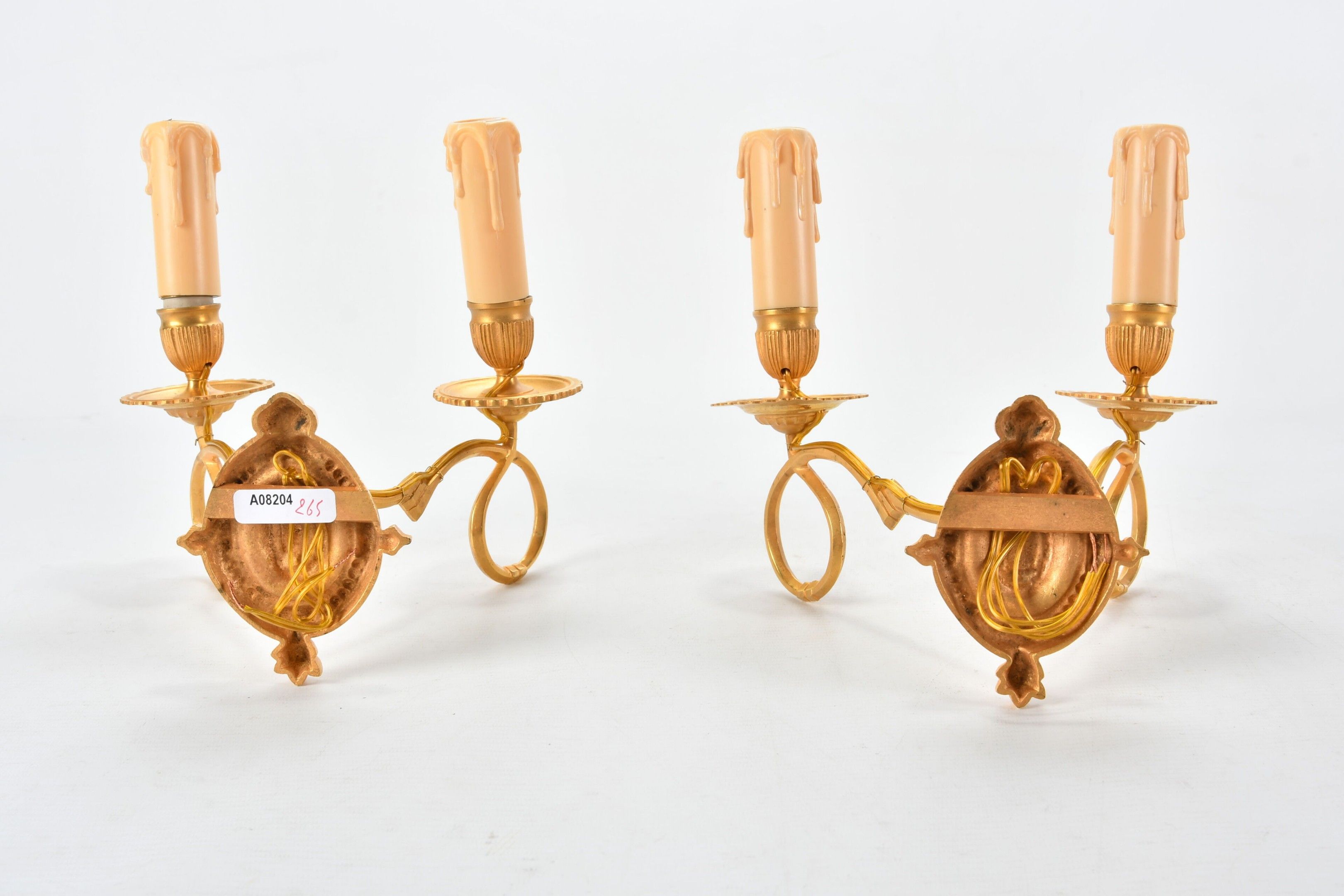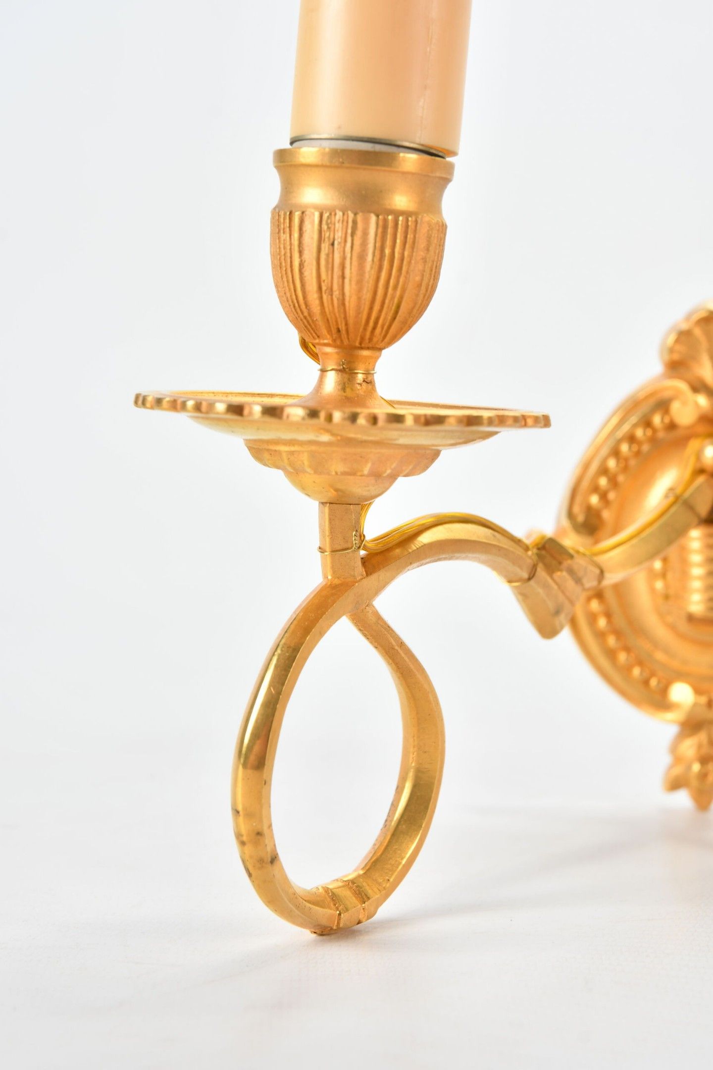 A pair of ormolu and chased bronze wall lights. Decorated with a frieze of pearls, flowers and volutes. Louis XVI style. H. 25 - W. 21 - D. 17 cm. Oxidation to the gilding on one.