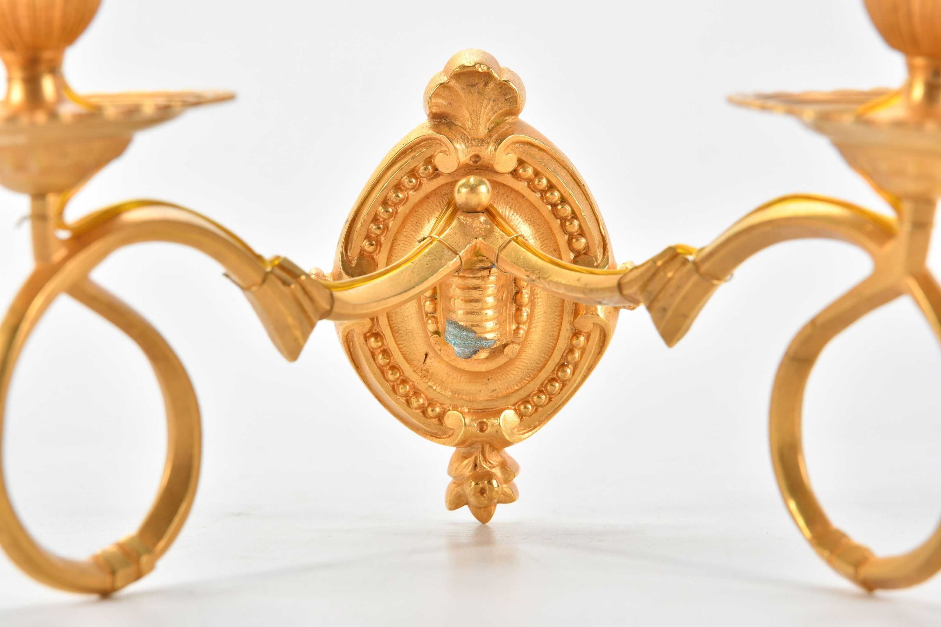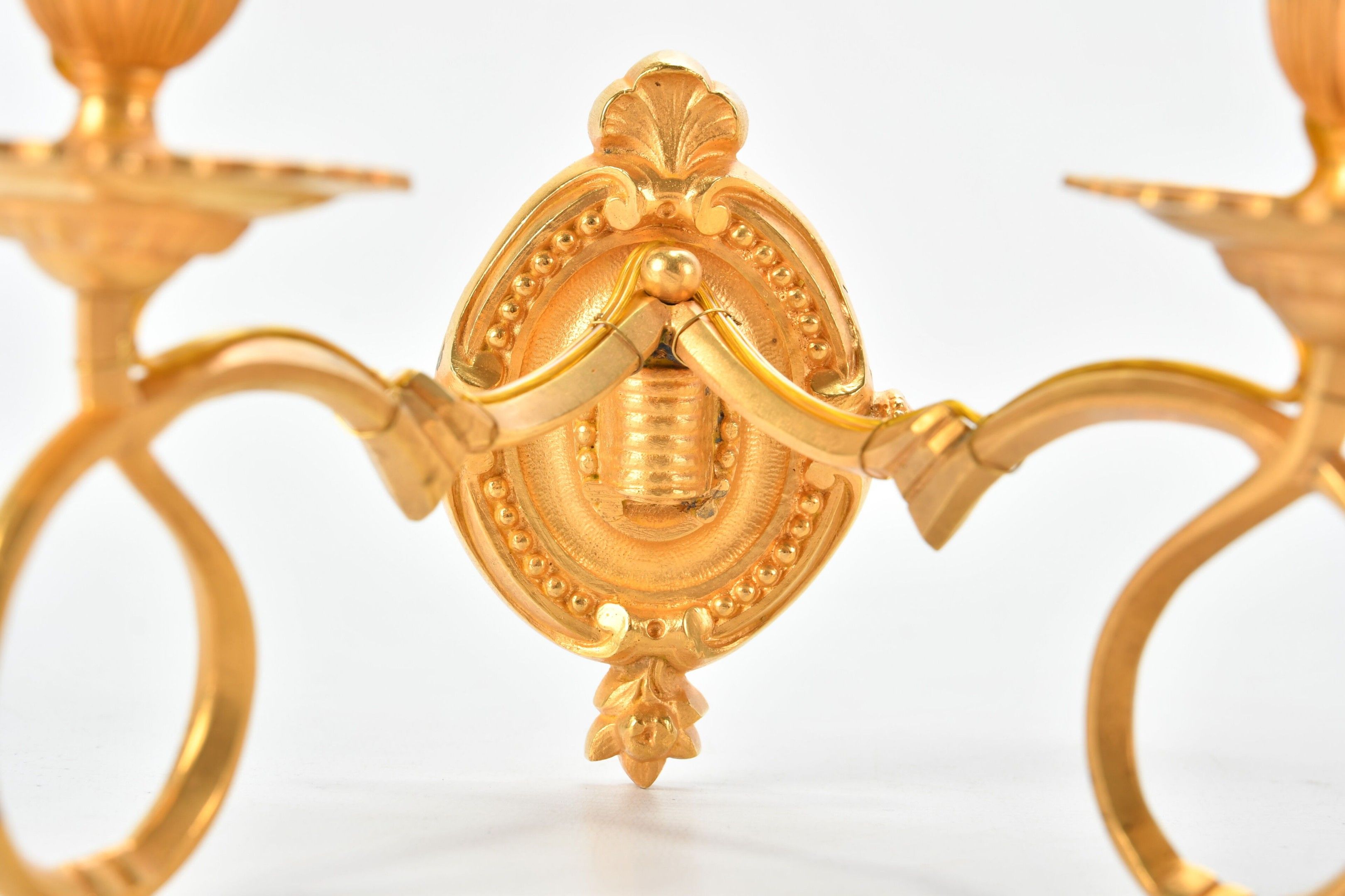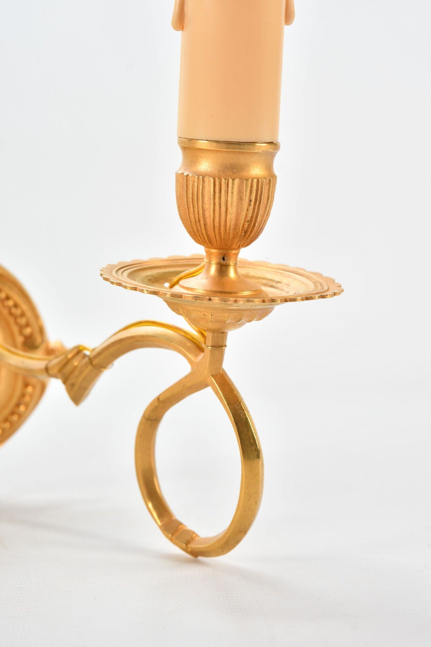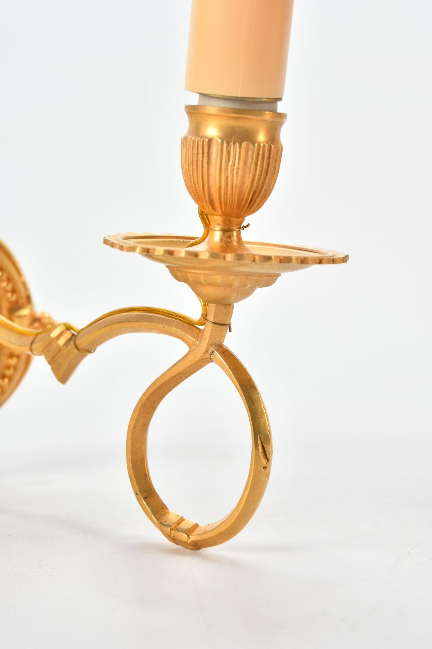 A pair of ormolu and chased bronze wall lights. Decorated with a frieze of pearls, flowers and volutes. Louis XVI style. H. 25 - W. 21 - D. 17 cm. Oxidation to the gilding on one.