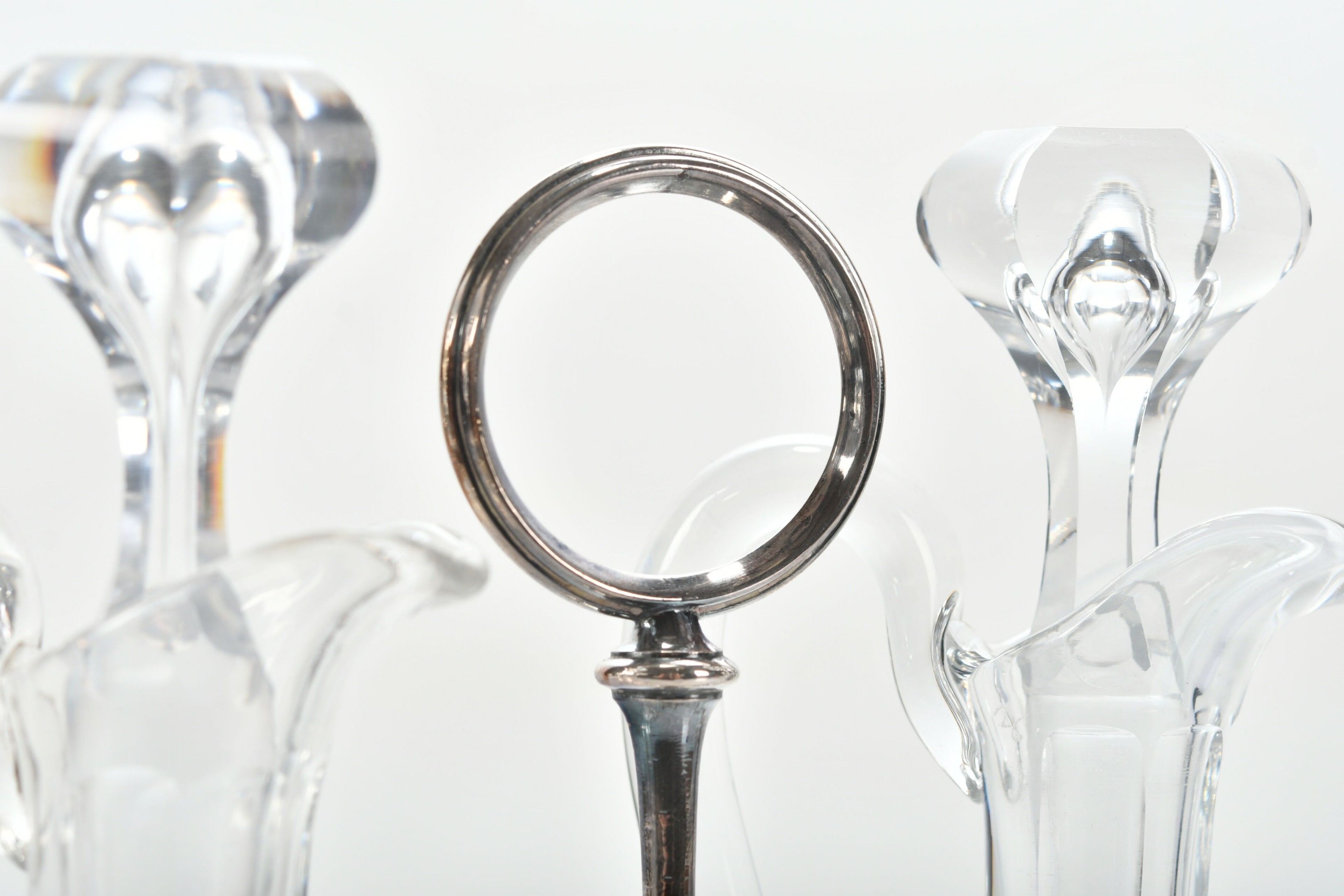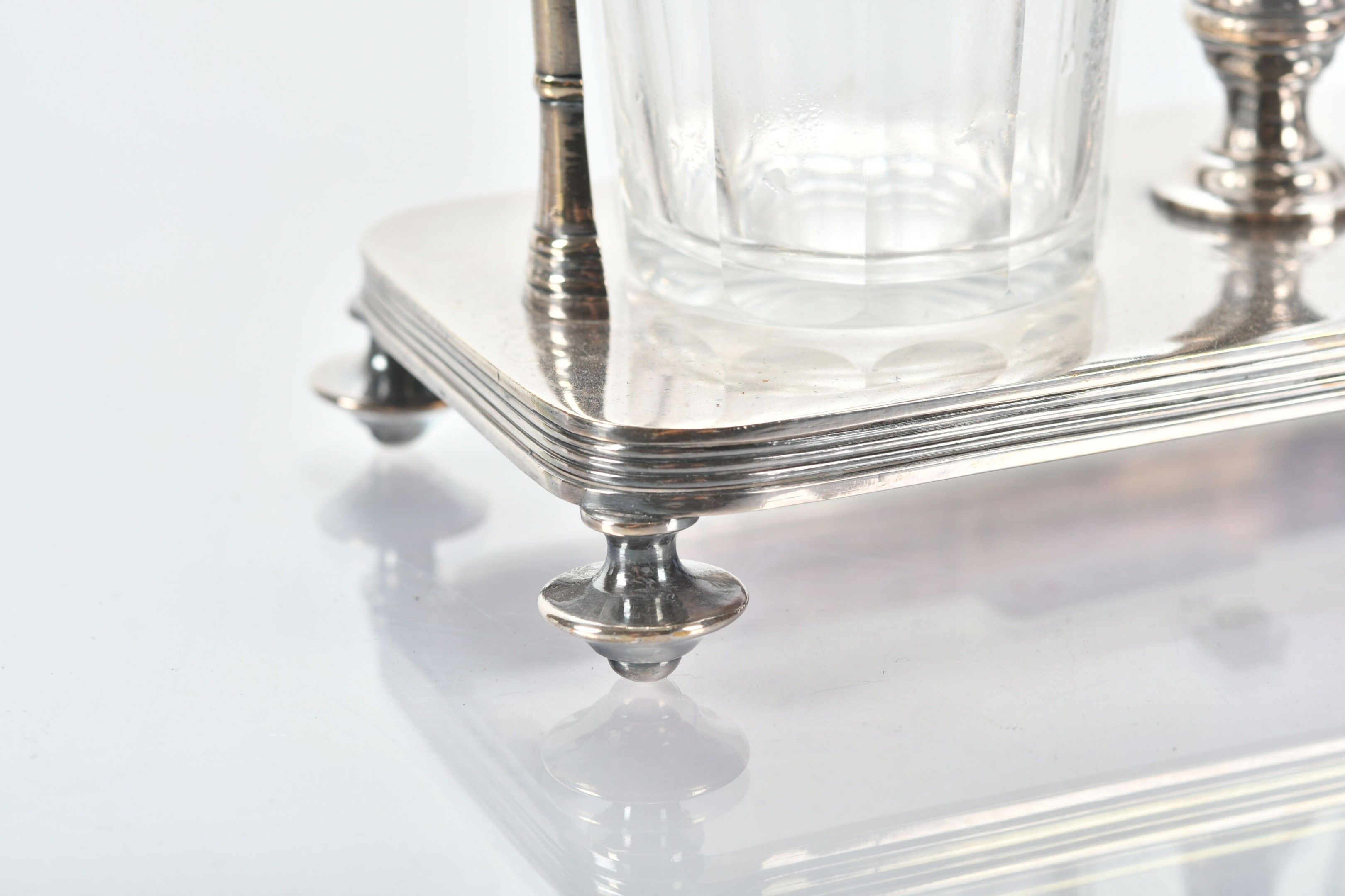 OIL VINEGAR HOLDER, in silver-plated metal, with crystal bottles. Decorated with fillets. Height 25.5 cm