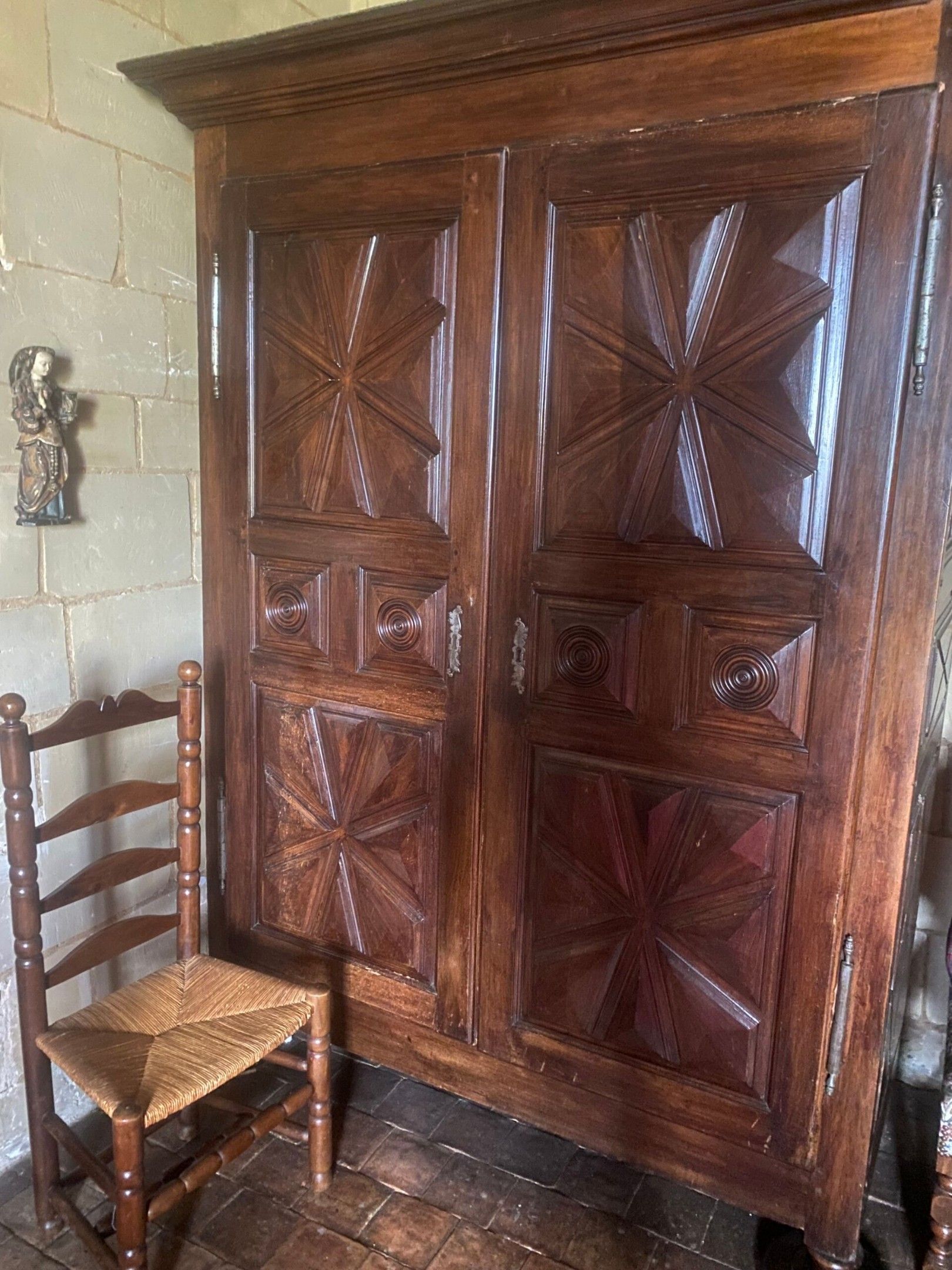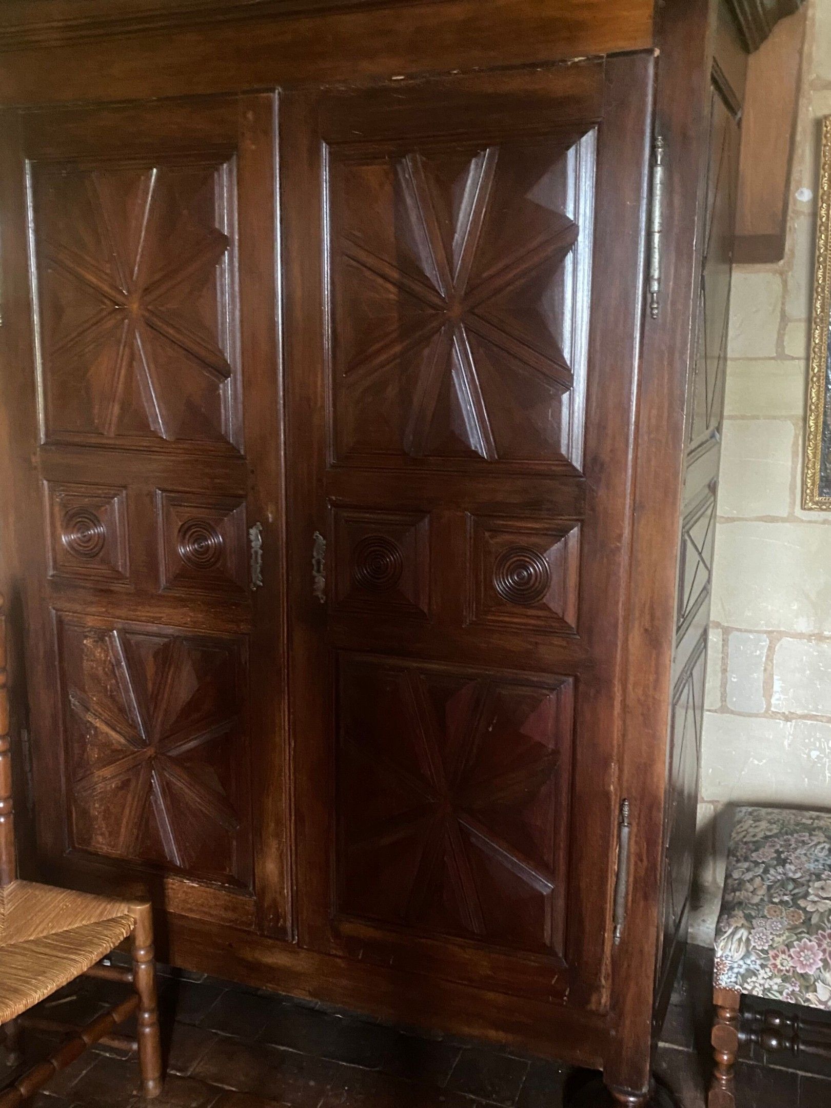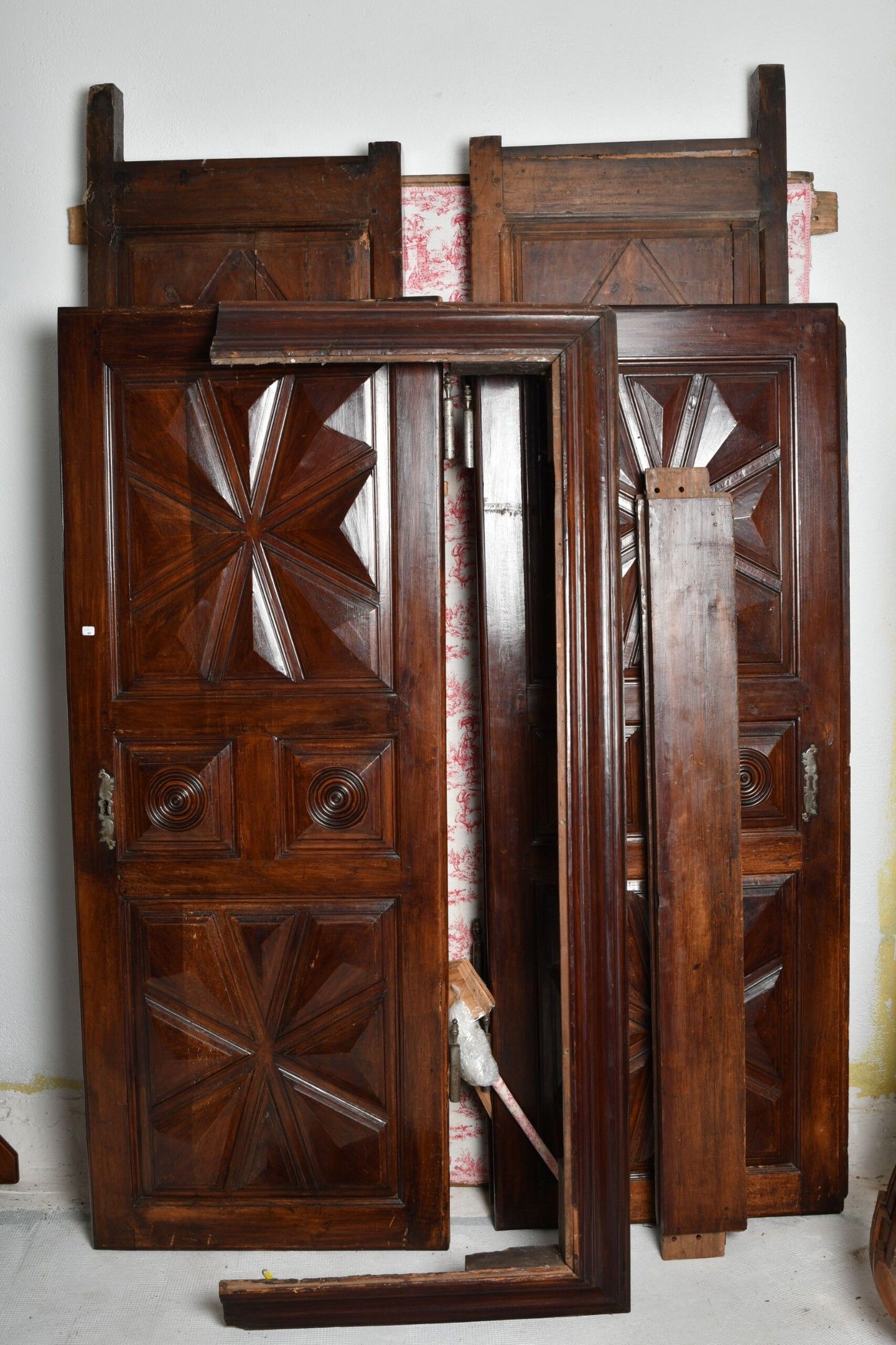 WALNUT CABINET opening to two doors with panels decorated with diamond points and disc motifs. Straight jambs and cornice. 17th century (dismantled, needs to be reassembled). Wear and tear; small worm holes.