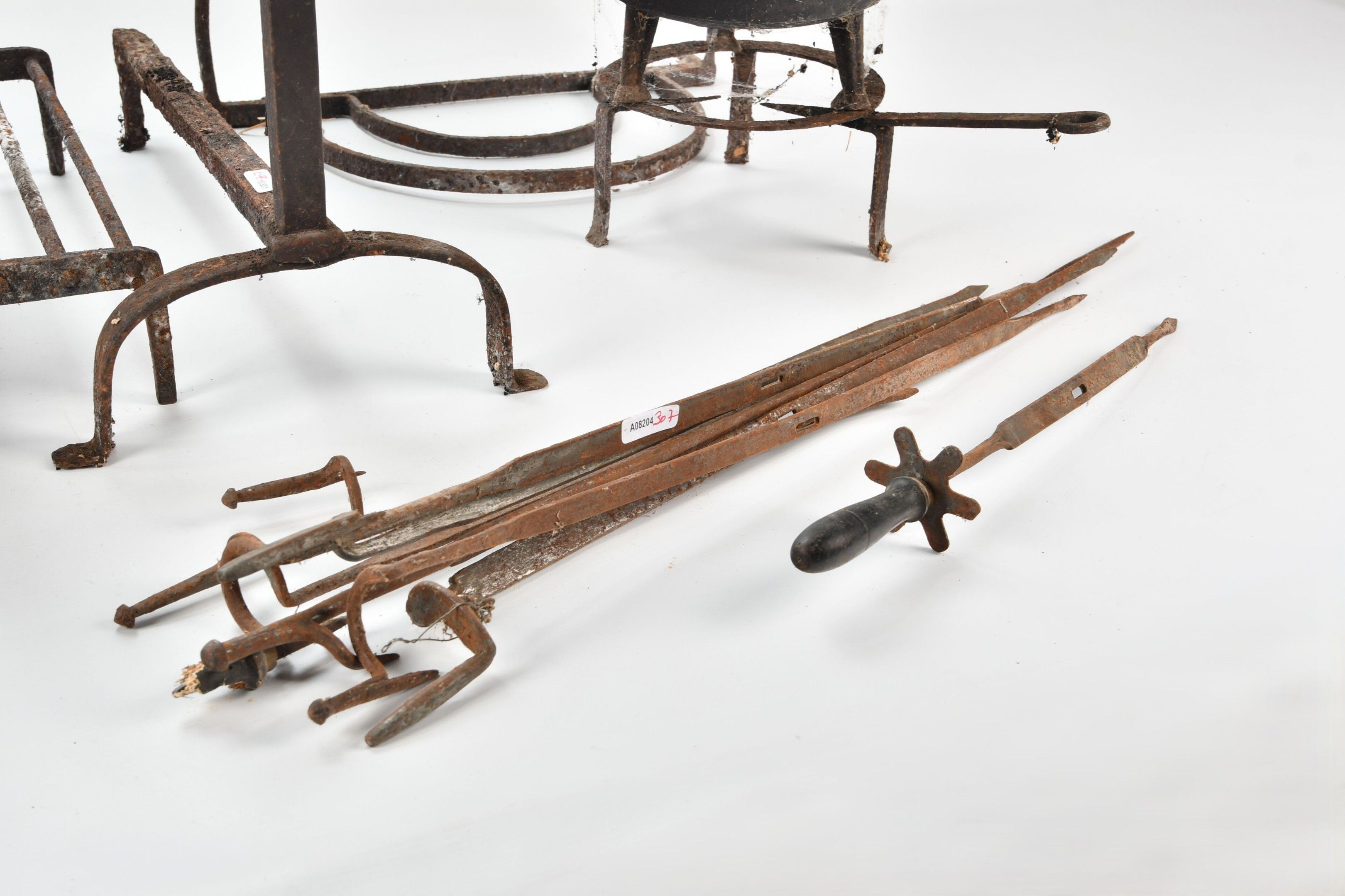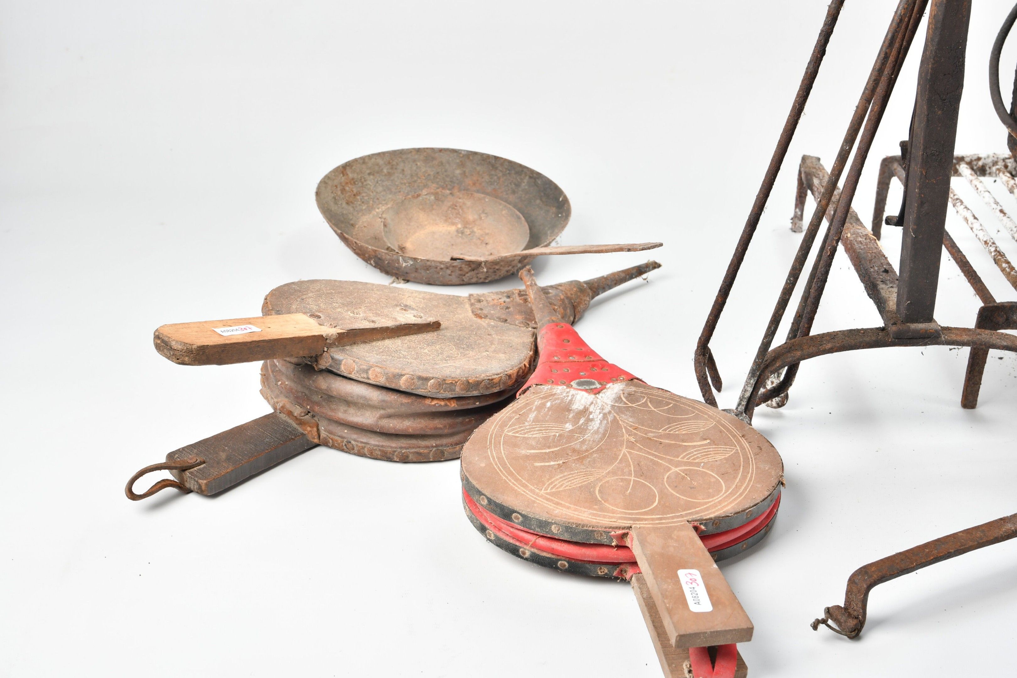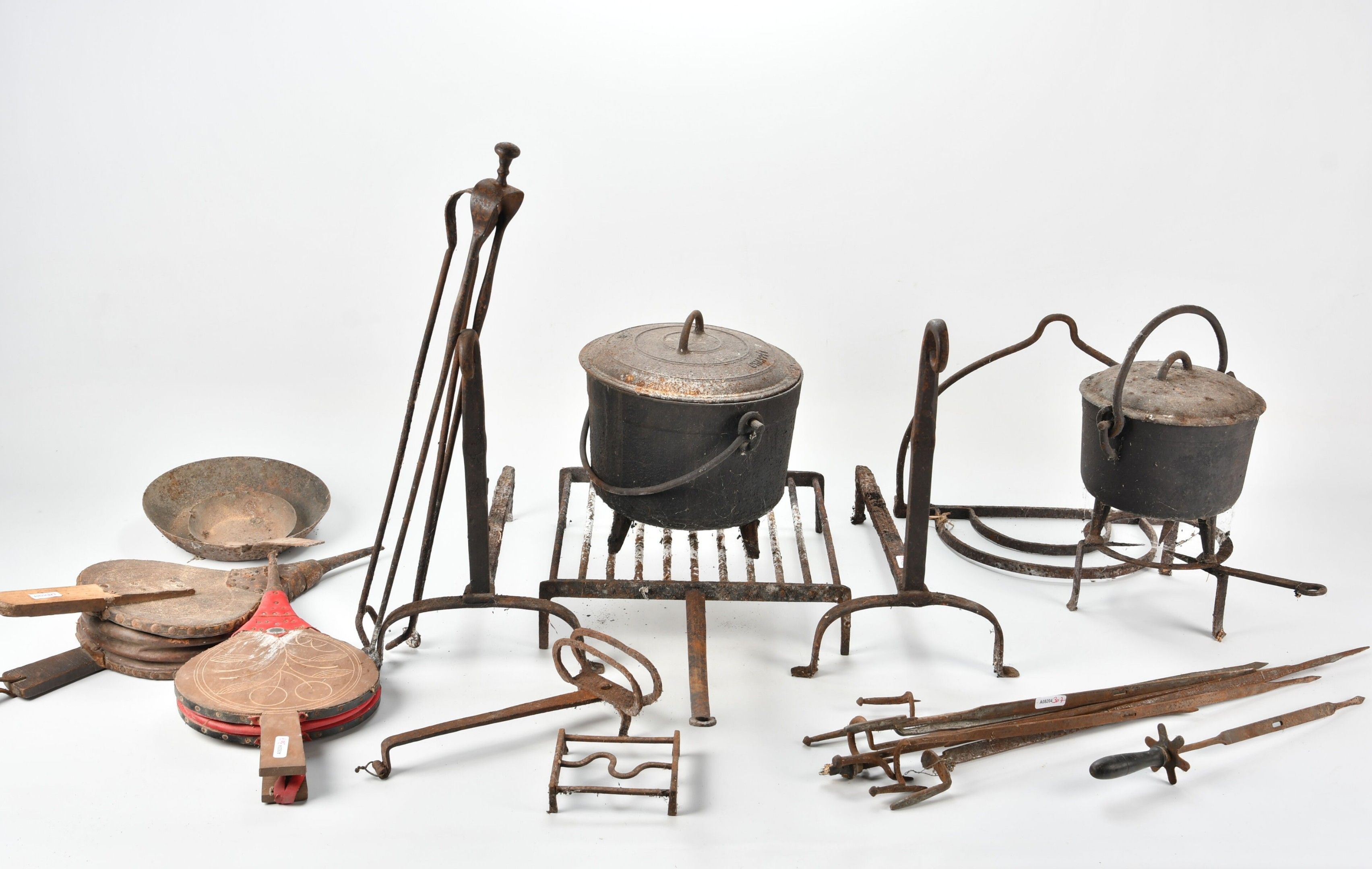 Pair of wrought iron CHENETS with scroll decoration. H. 43 cm. INCLUDING a large set of fireplace utensils from the 19th and 20th centuries, including roasting spit picks, grates, pans, bellows and cooking pots. And an 18th century wrought iron toaster and a pot holder to place on a rack.