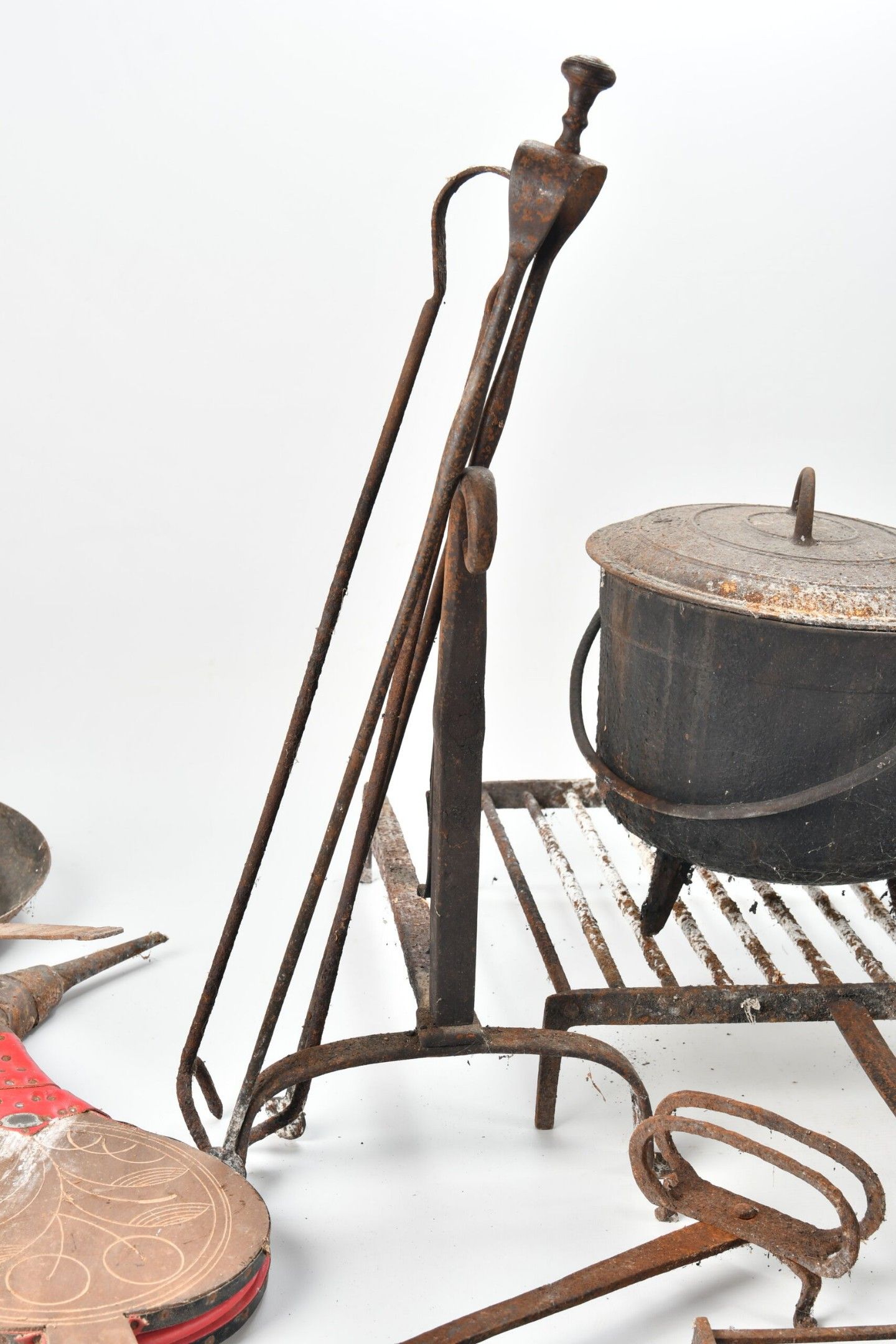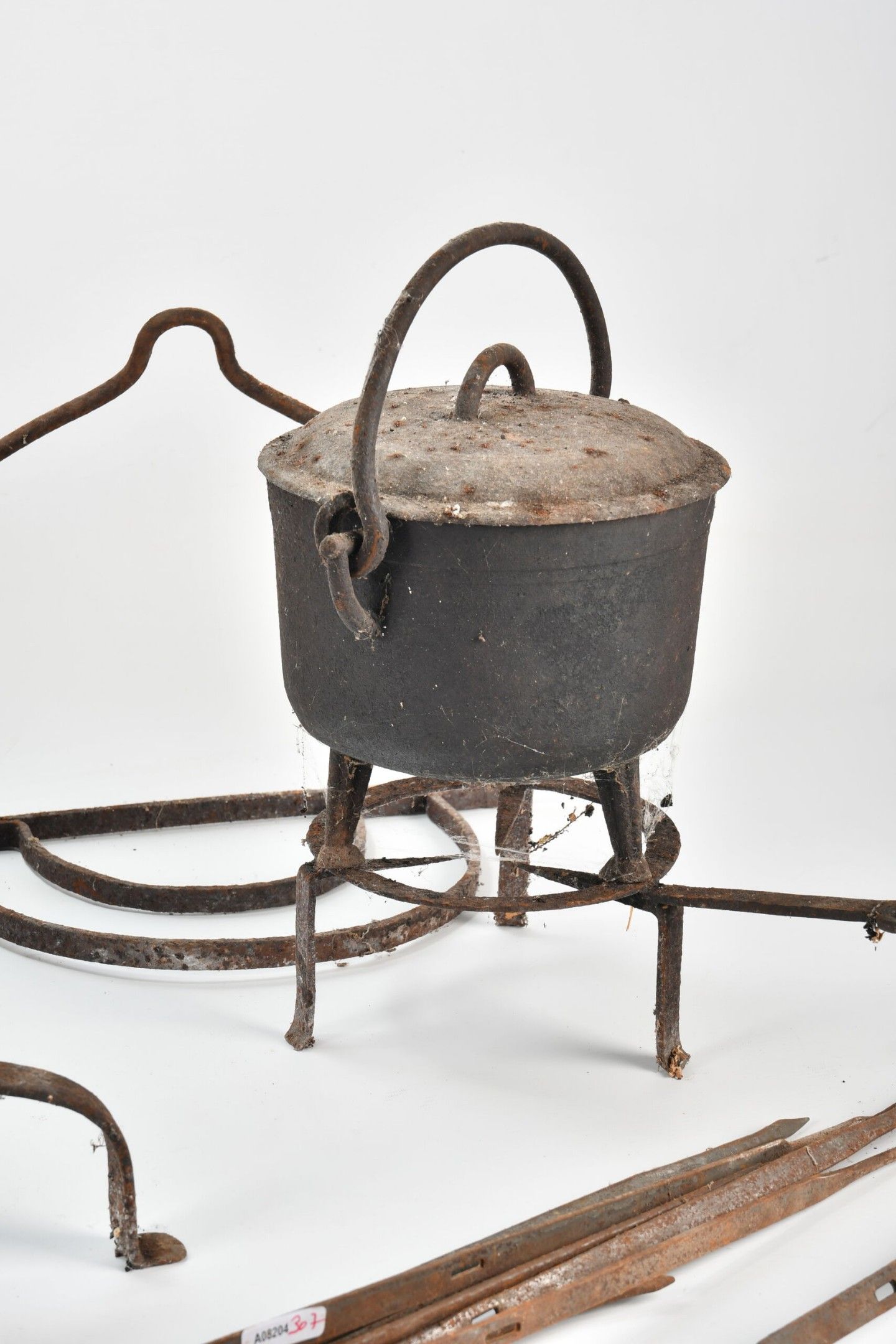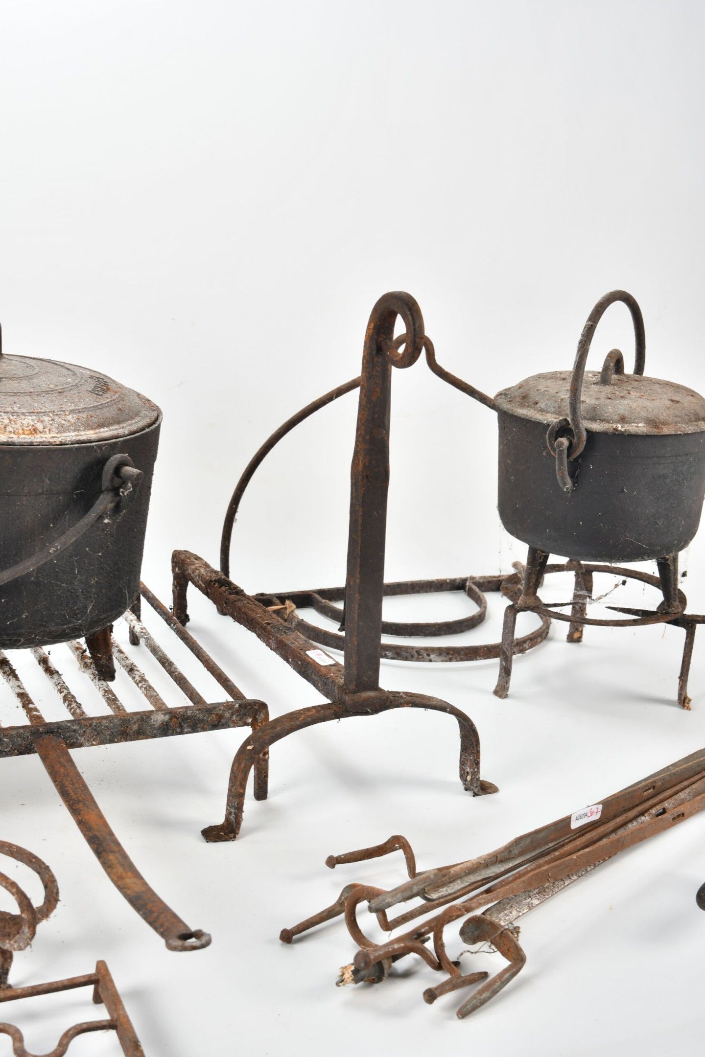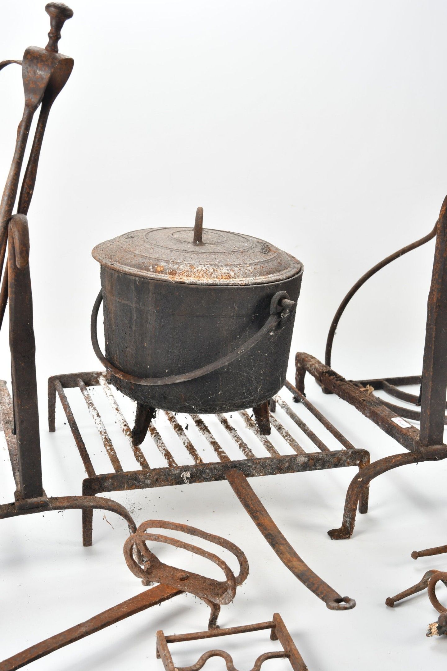 Pair of wrought iron CHENETS with scroll decoration. H. 43 cm. INCLUDING a large set of fireplace utensils from the 19th and 20th centuries, including roasting spit picks, grates, pans, bellows and cooking pots. And an 18th century wrought iron toaster and a pot holder to place on a rack.