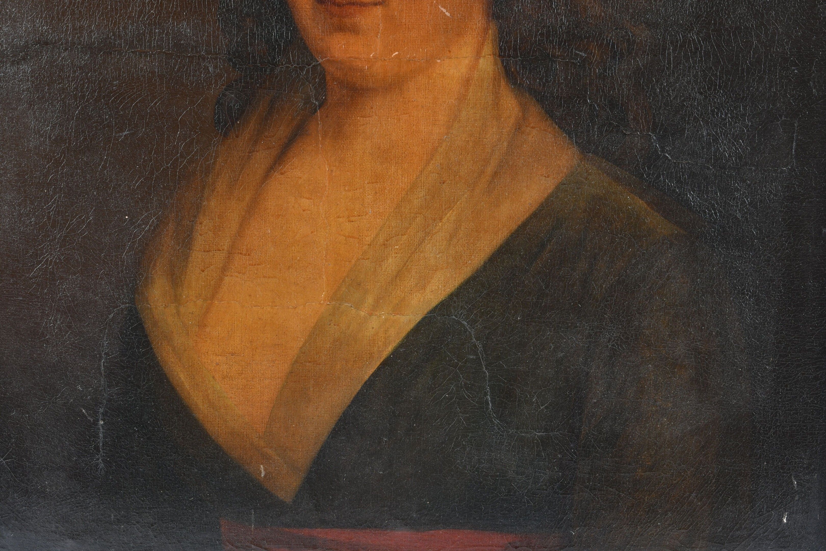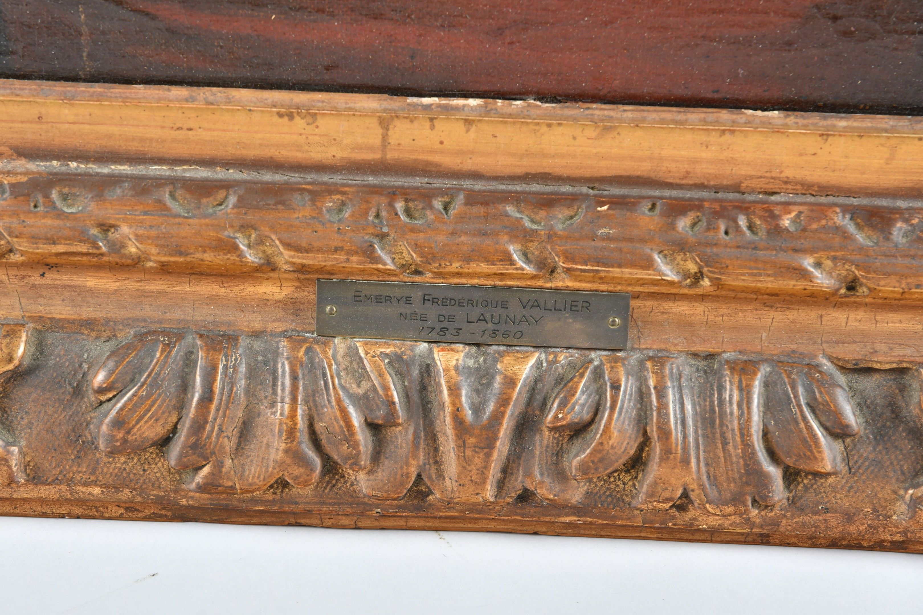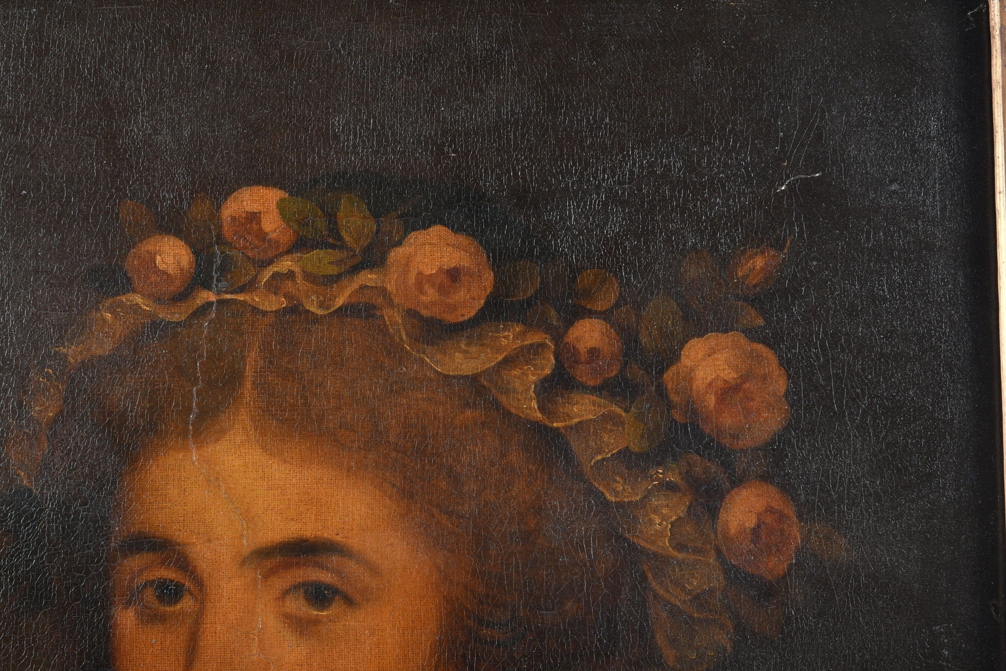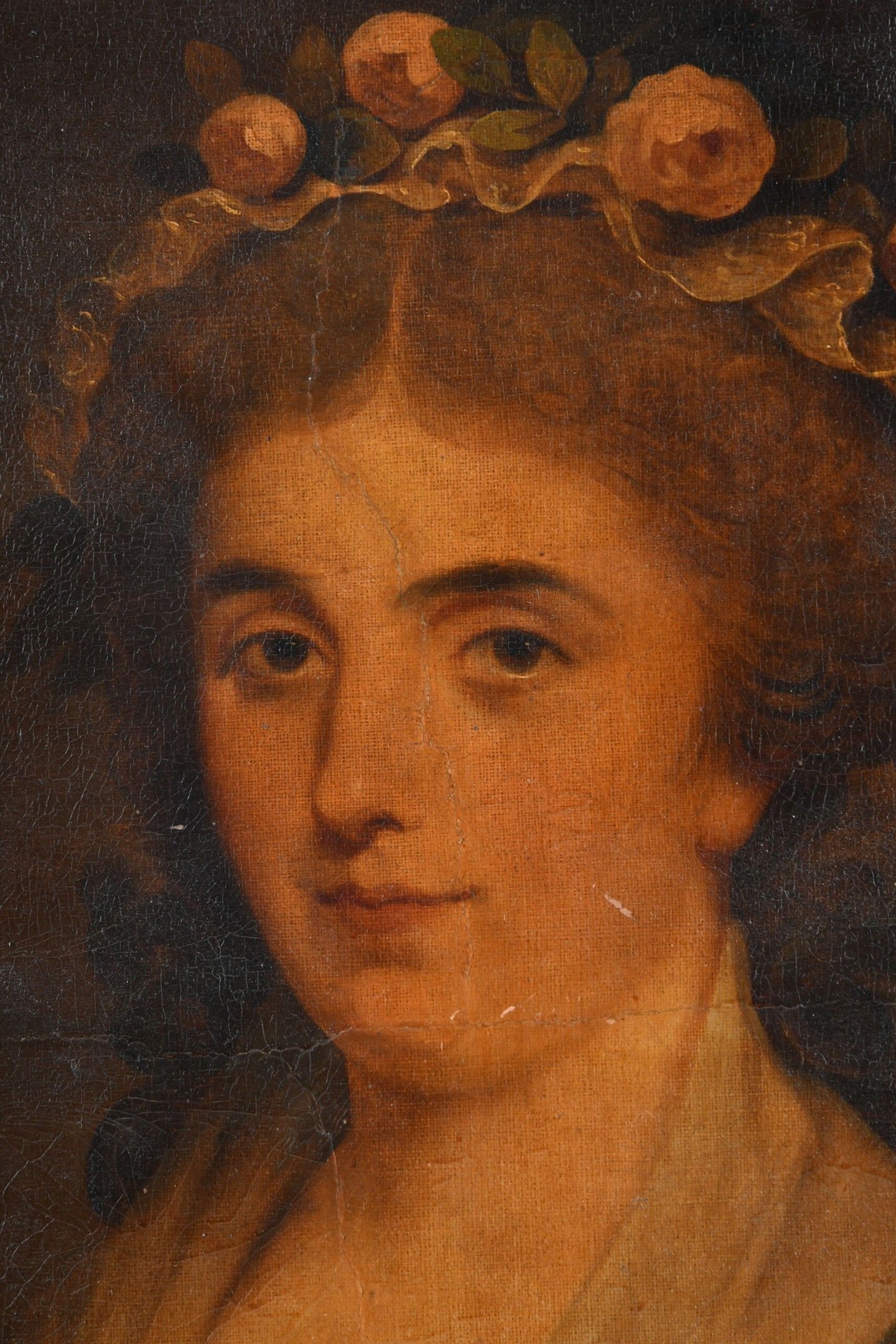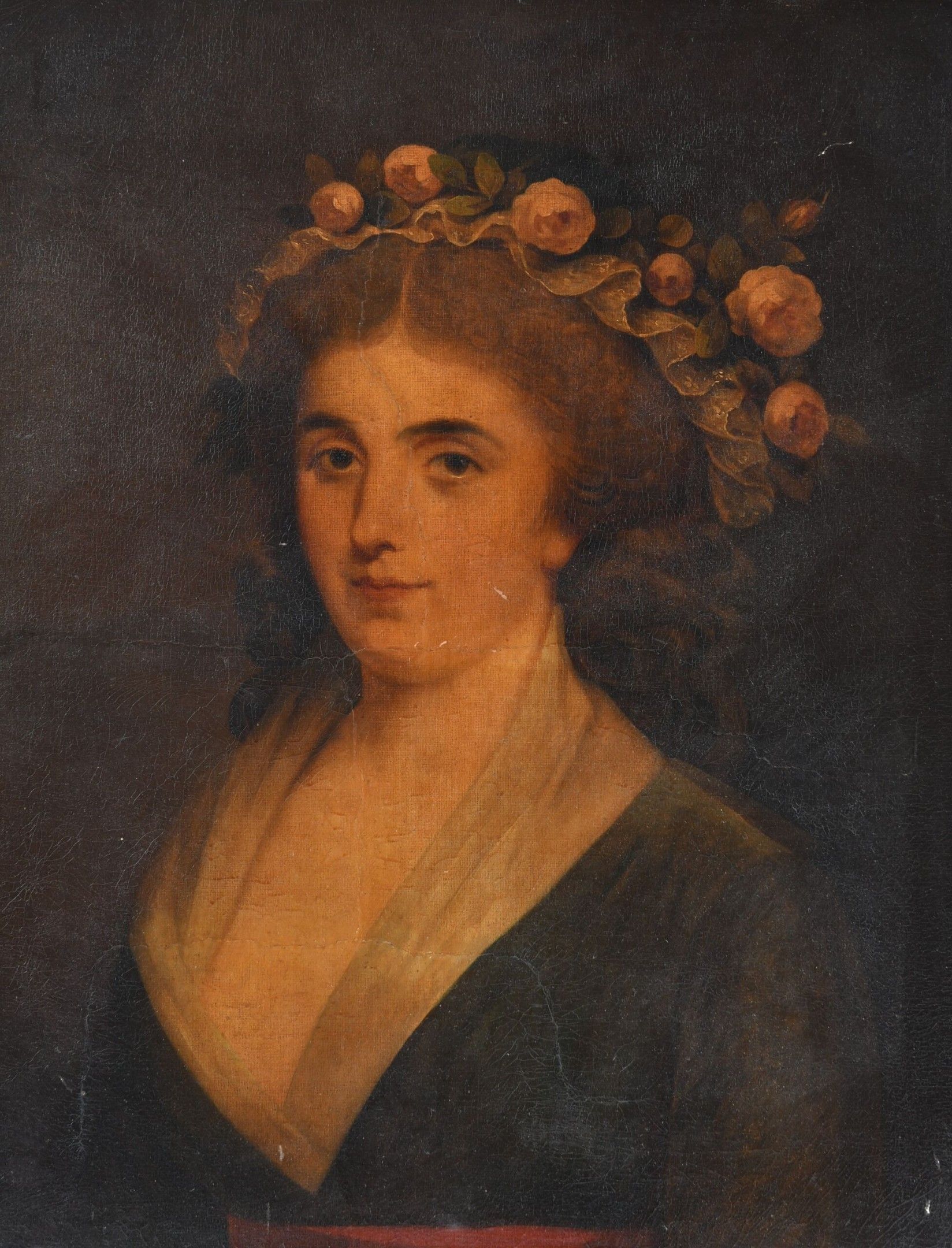 FRENCH SCHOOL from the end of the XVIIIth century. Portrait of a woman with a flowery headdress. Oil on canvas. 65 x 54 cm. In a carved and gilt wood frame. Restorations and fading.