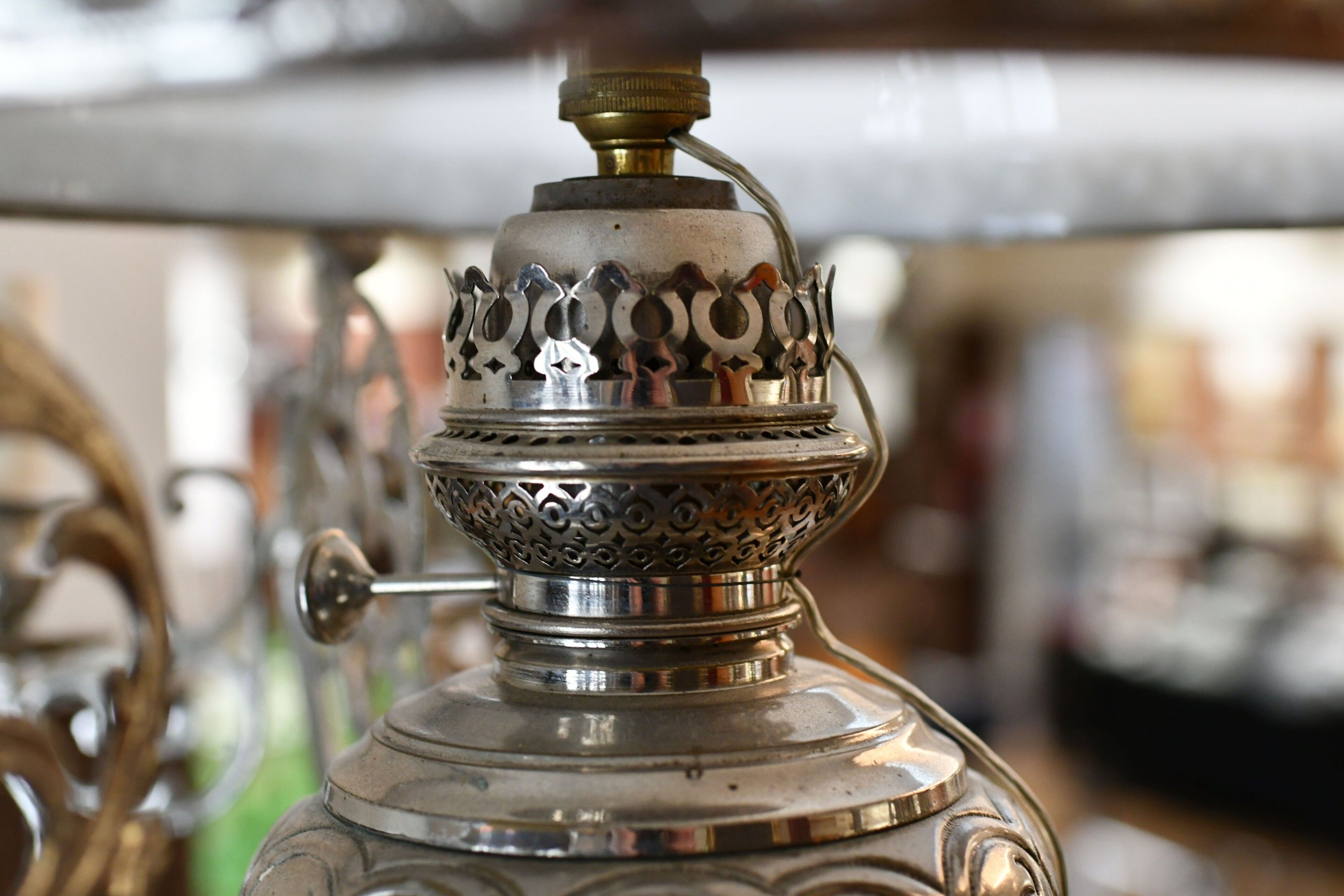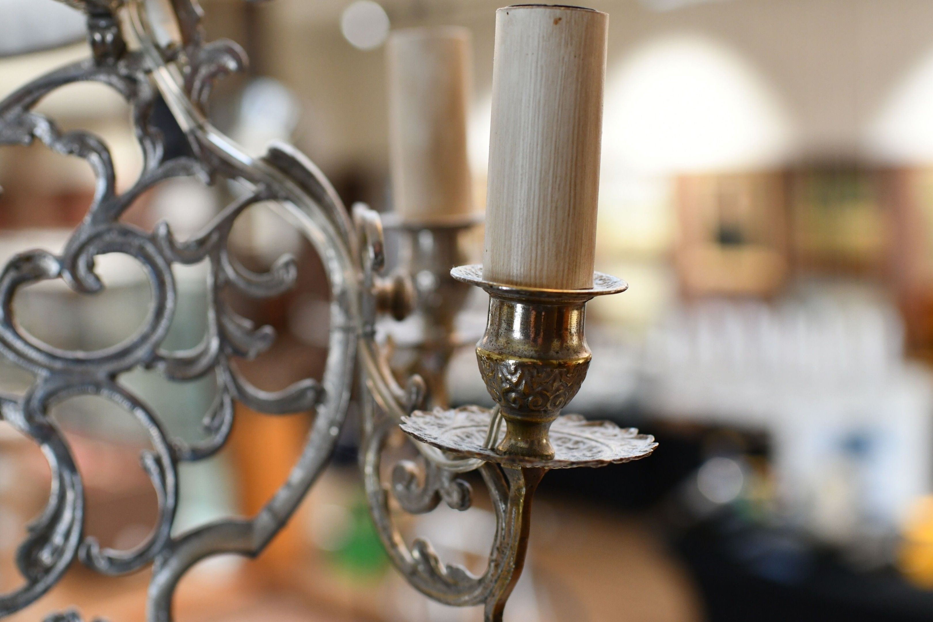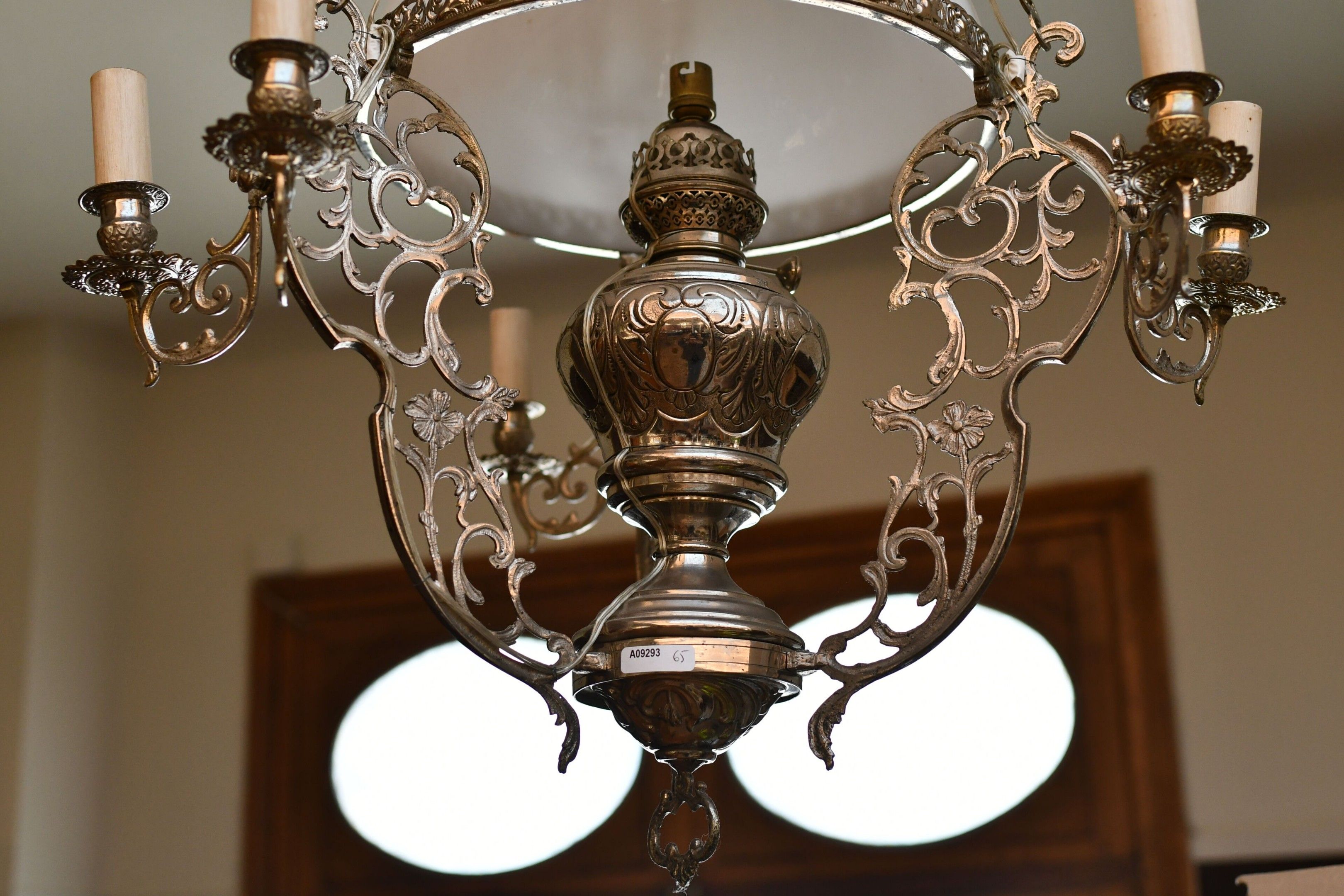 Electrified silver-plated brass SUSPENSION with opaline shade. Baluster-shaped central shaft illuminated by a fire and supported by six lights on three arms. Chased and openwork decoration of scrolls, foliage and flowers. Napoleon III period. Height 130 cm.