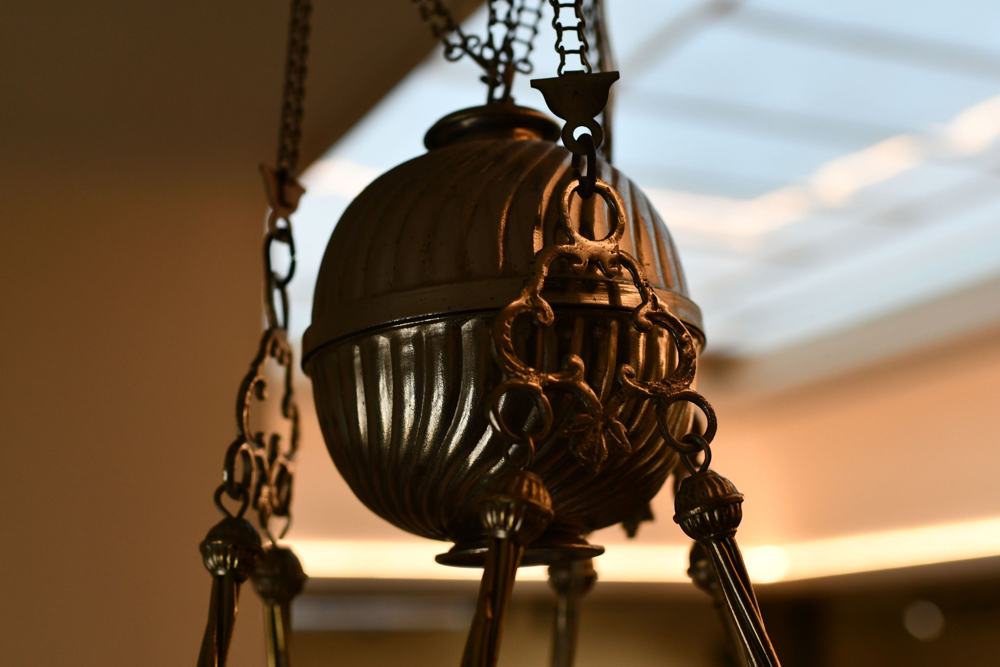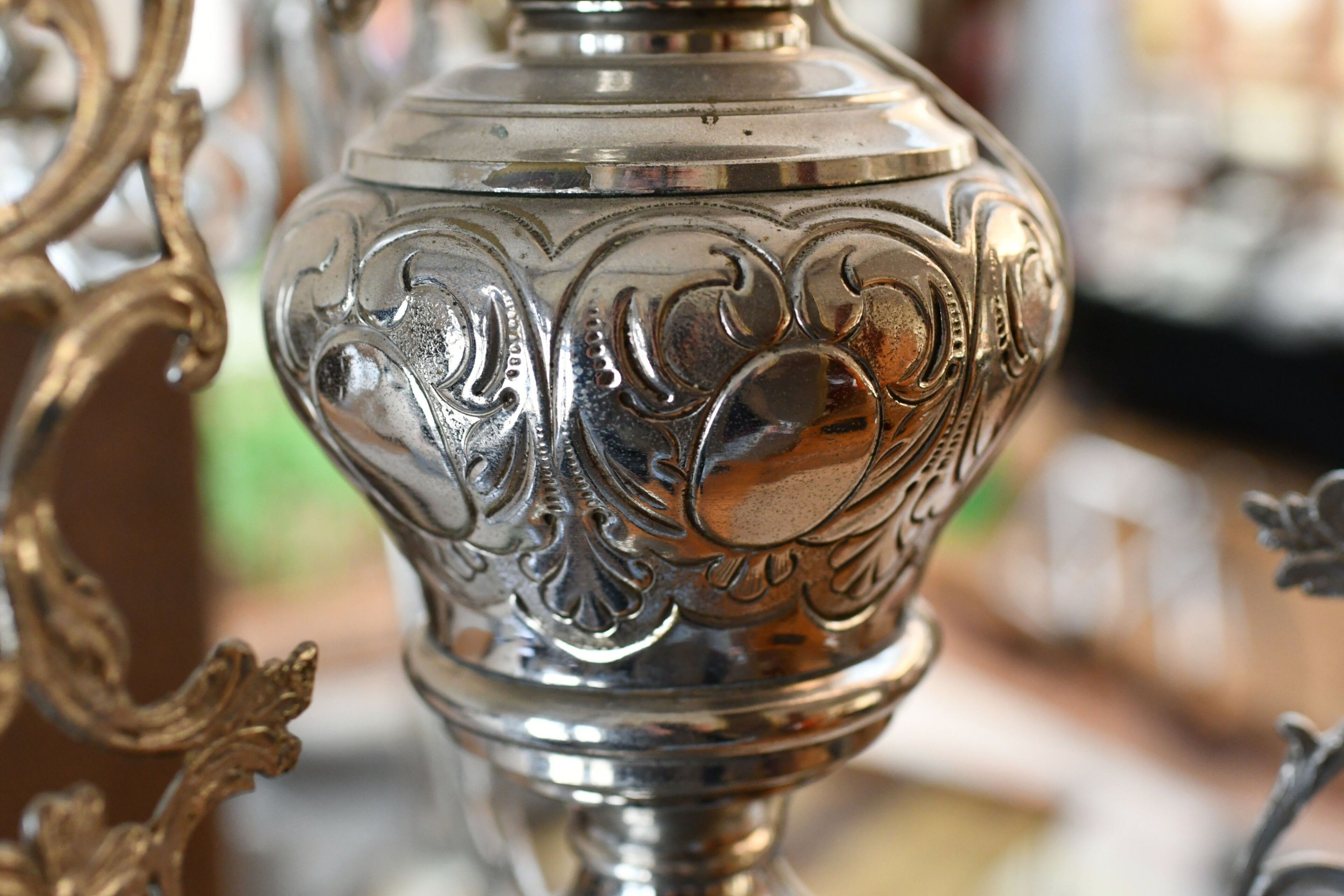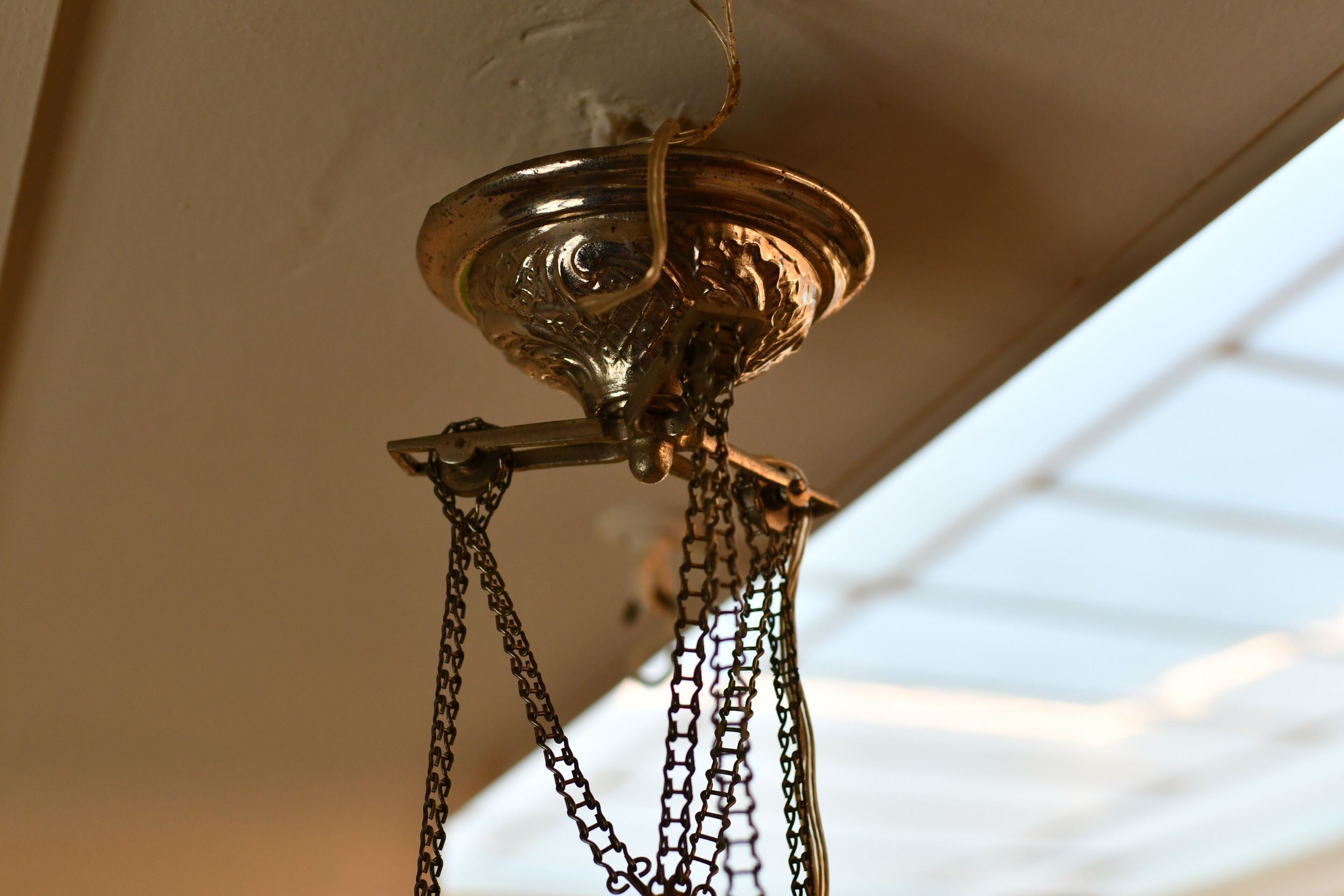 Electrified silver-plated brass SUSPENSION with opaline shade. Baluster-shaped central shaft illuminated by a fire and supported by six lights on three arms. Chased and openwork decoration of scrolls, foliage and flowers. Napoleon III period. Height 130 cm.