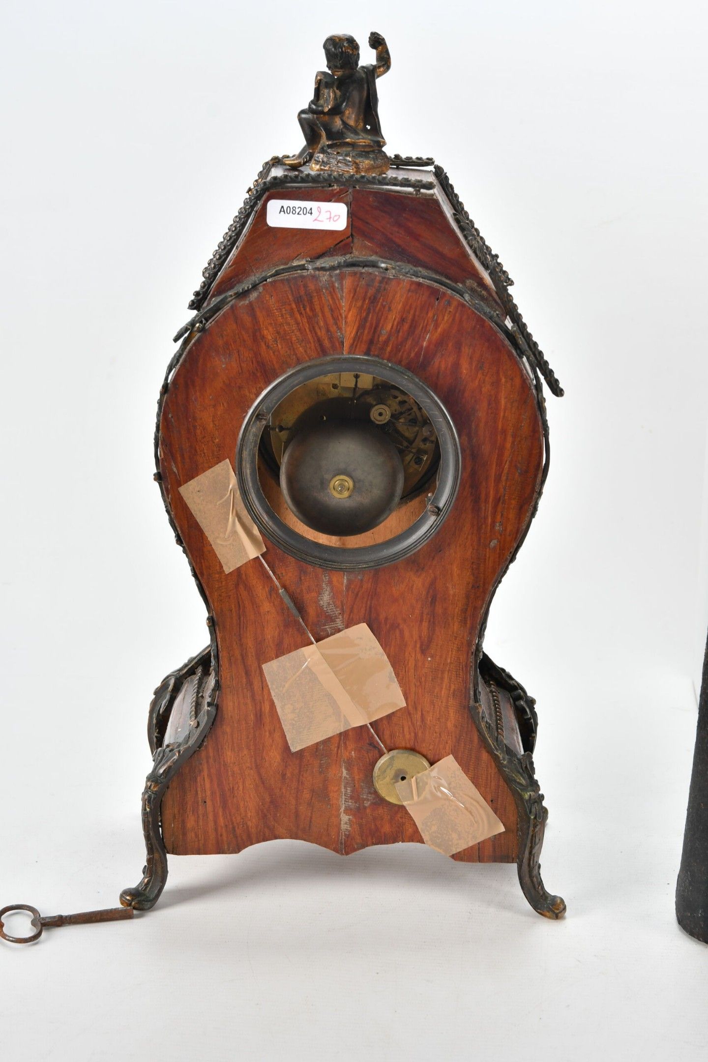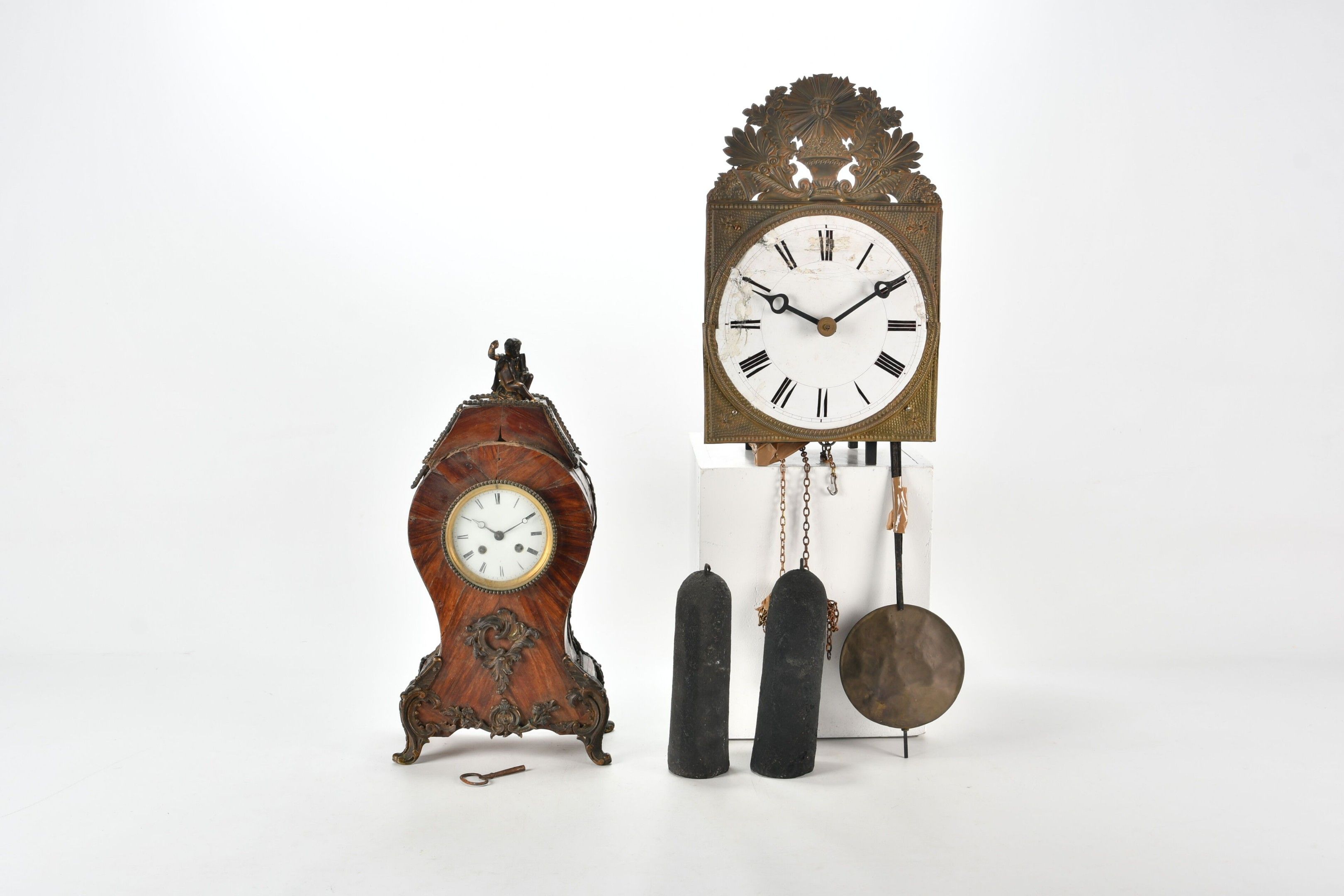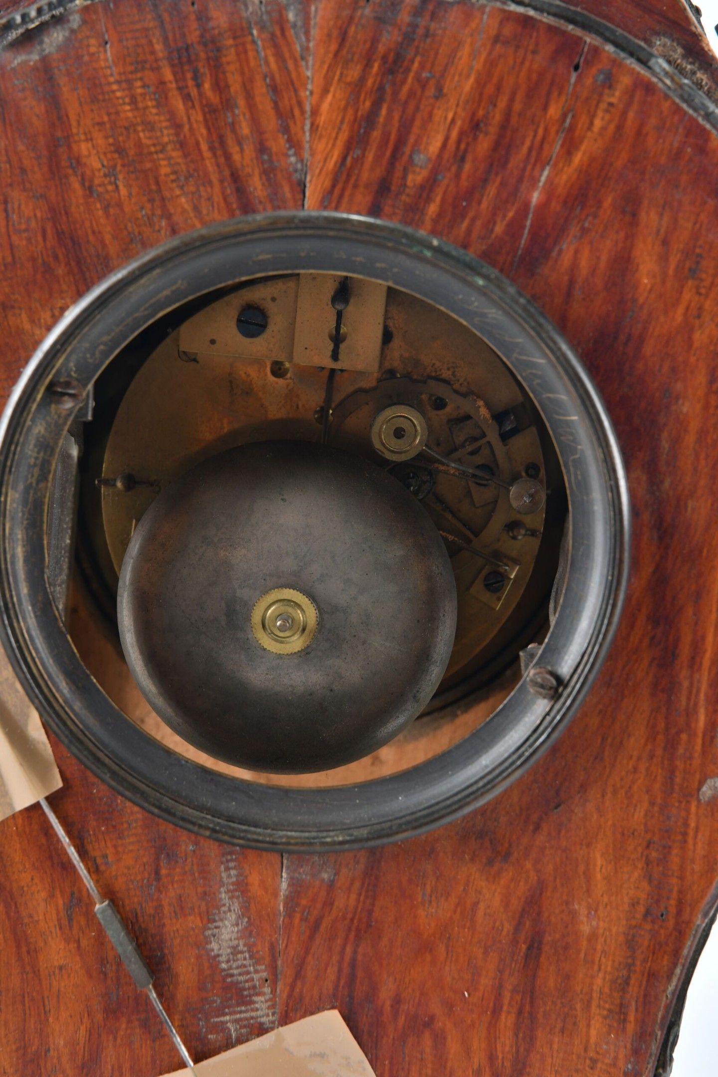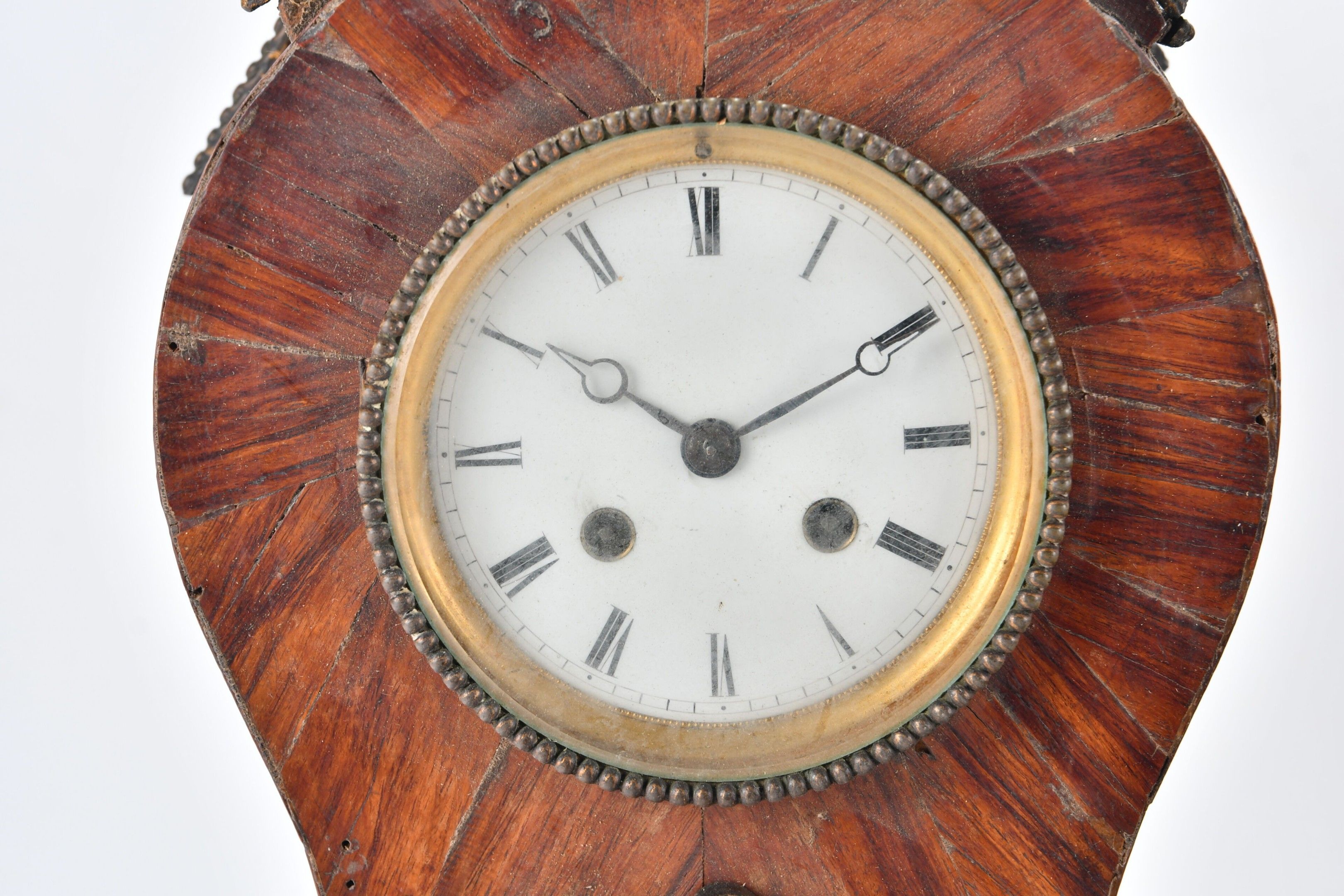 Wooden and veneered violin-shaped CARTEL HANGER (small) with bronze ornamentation of rocaille foliage and pearl friezes. Surmounted by a reading putto. Enamelled circular dial with Roman numerals. Wire movement stamped JAPY Frères. Height 44 cm. Extensive damage. INCLUDED is a comtoise clock movement.
