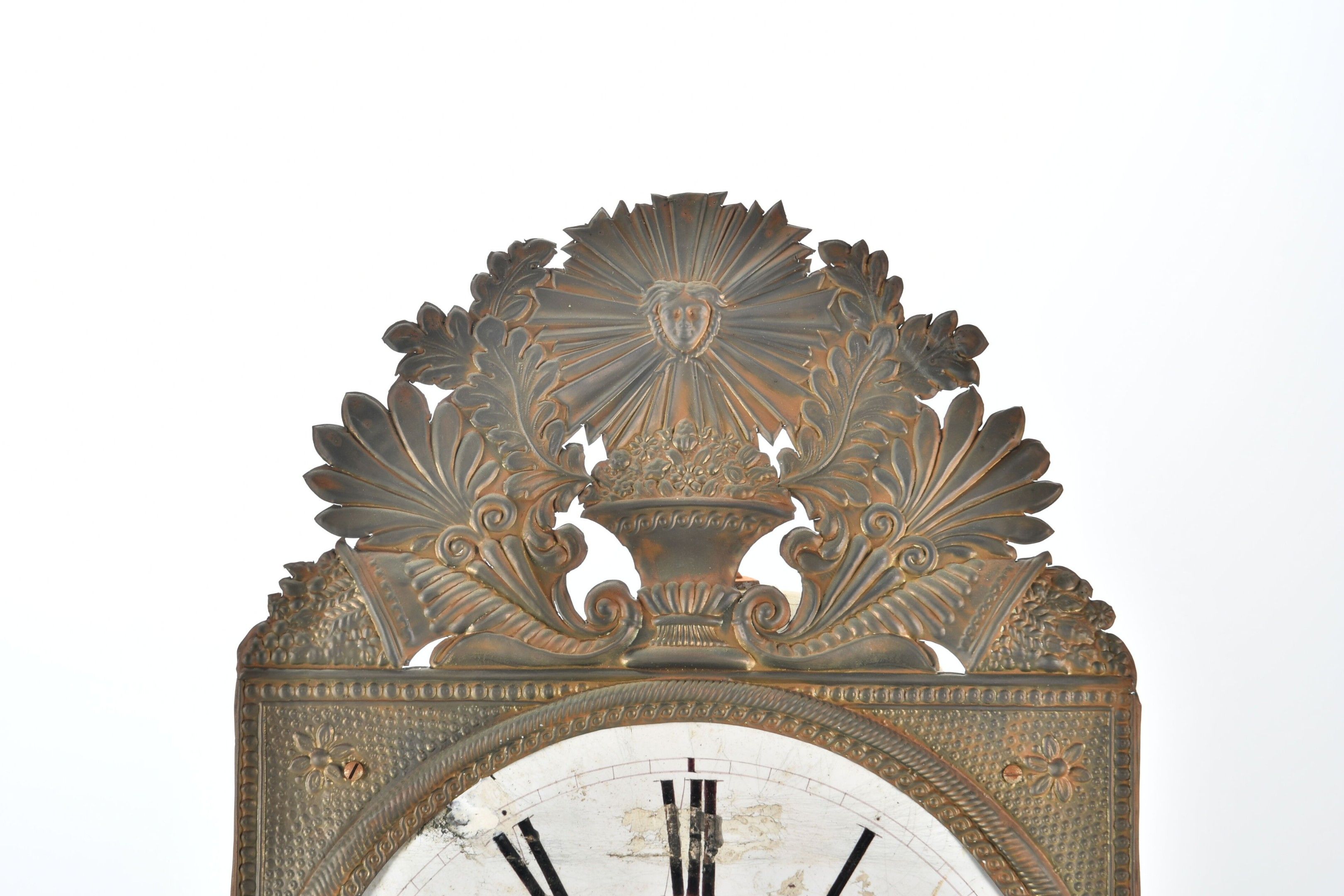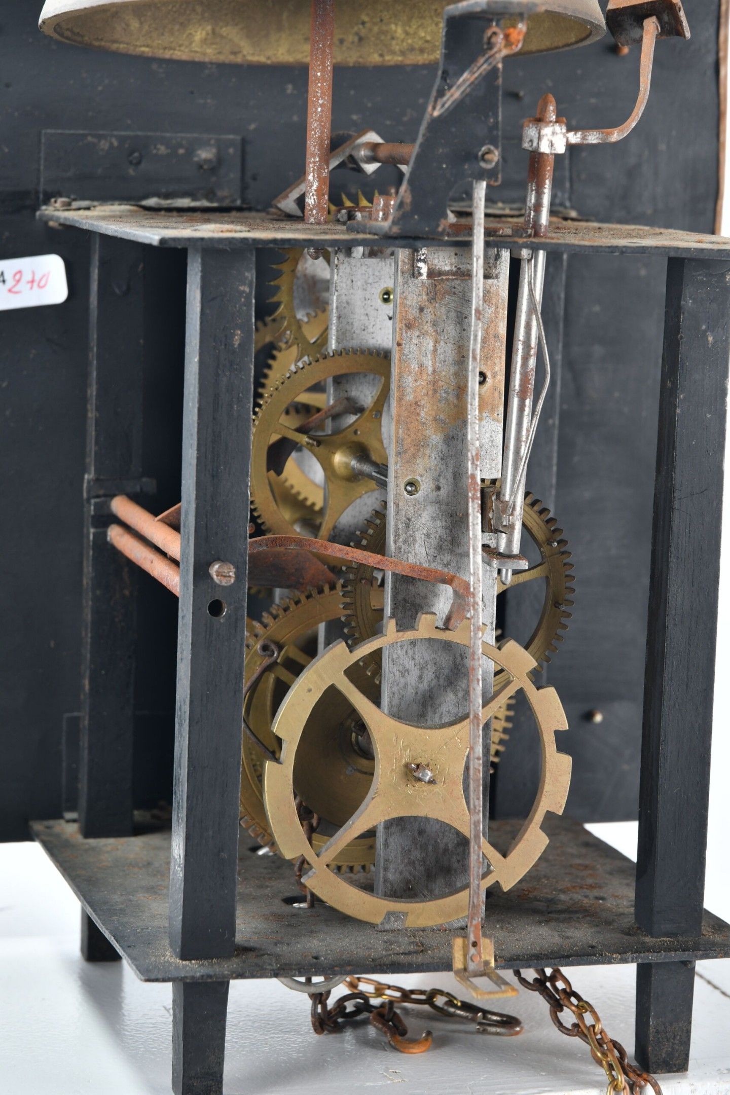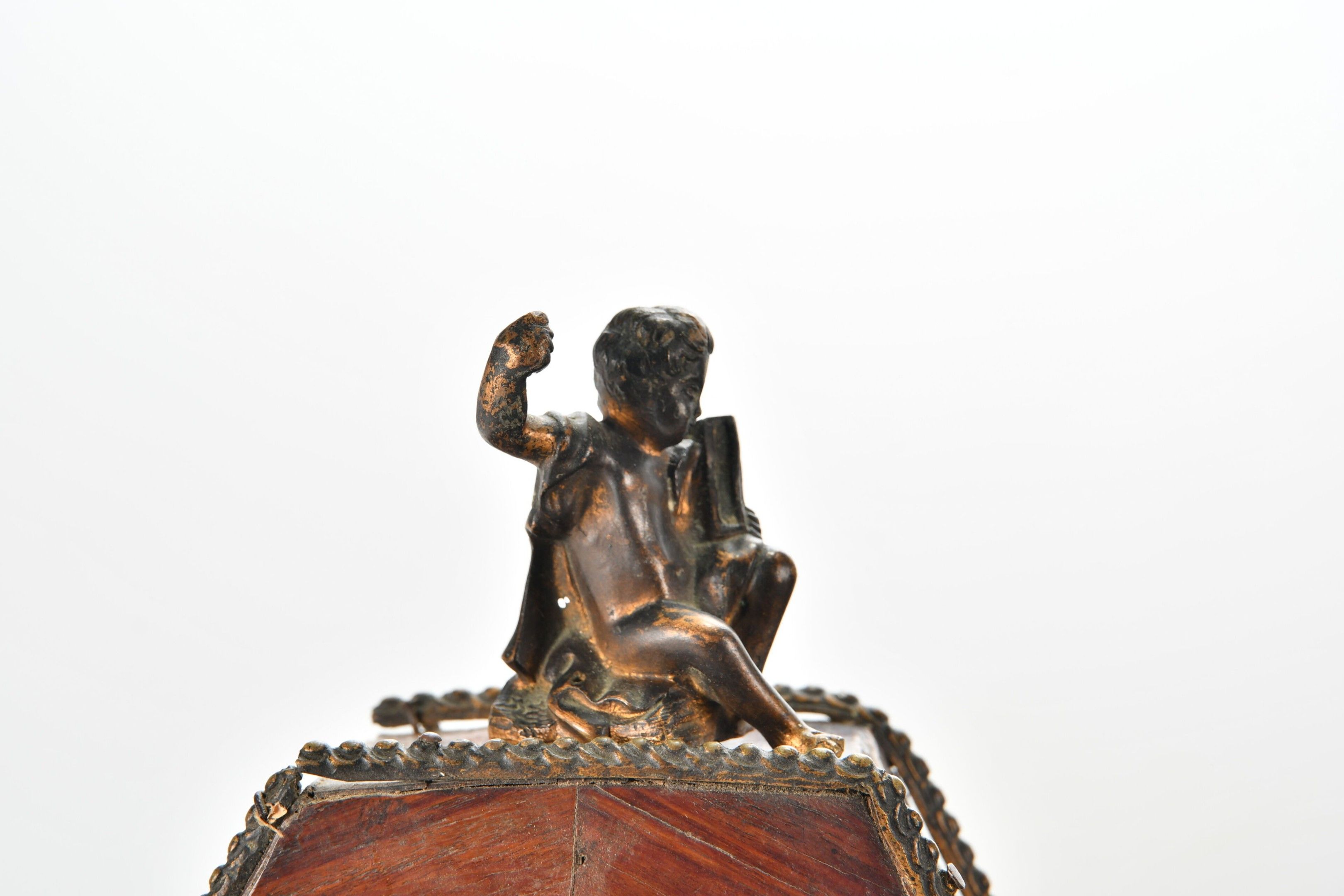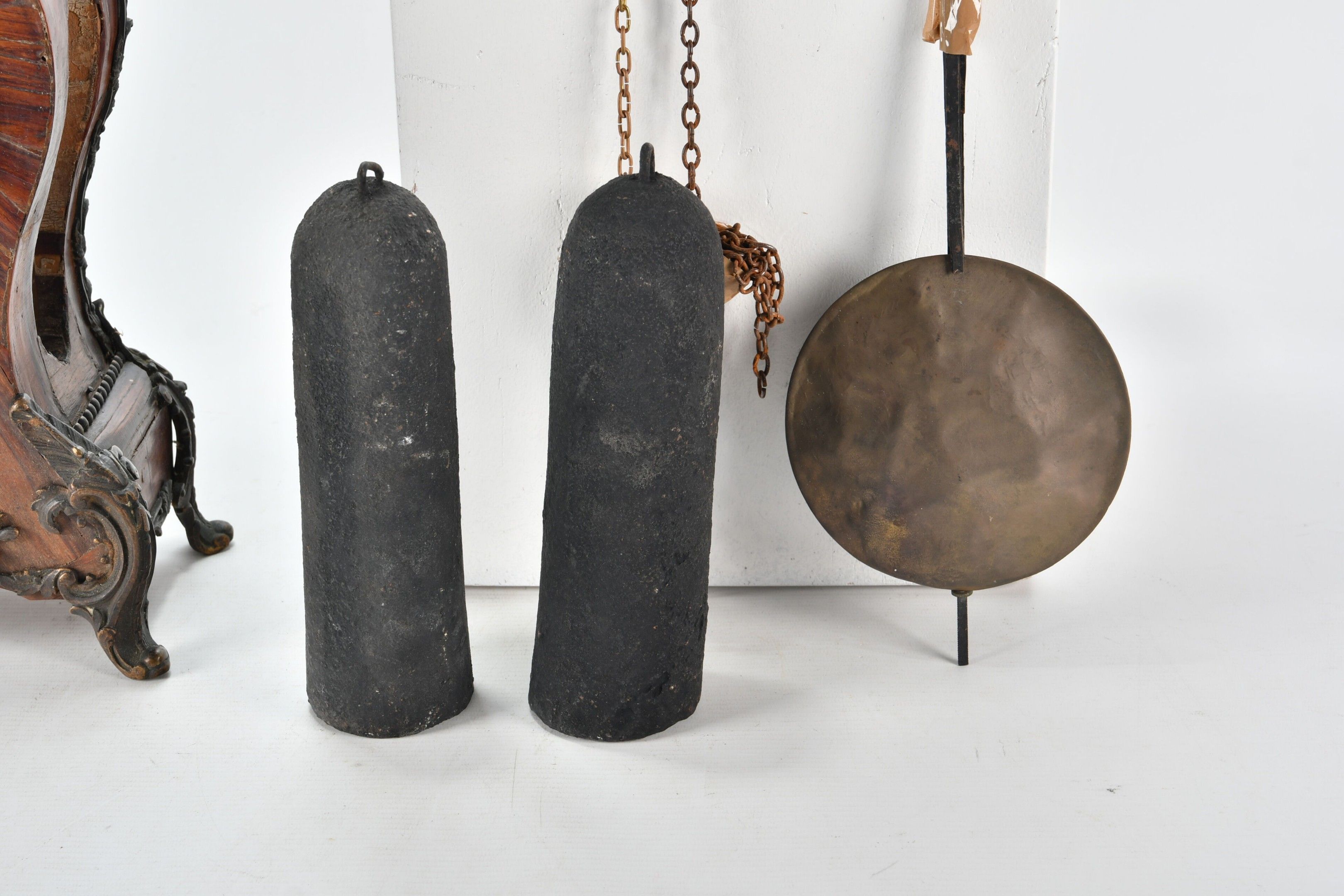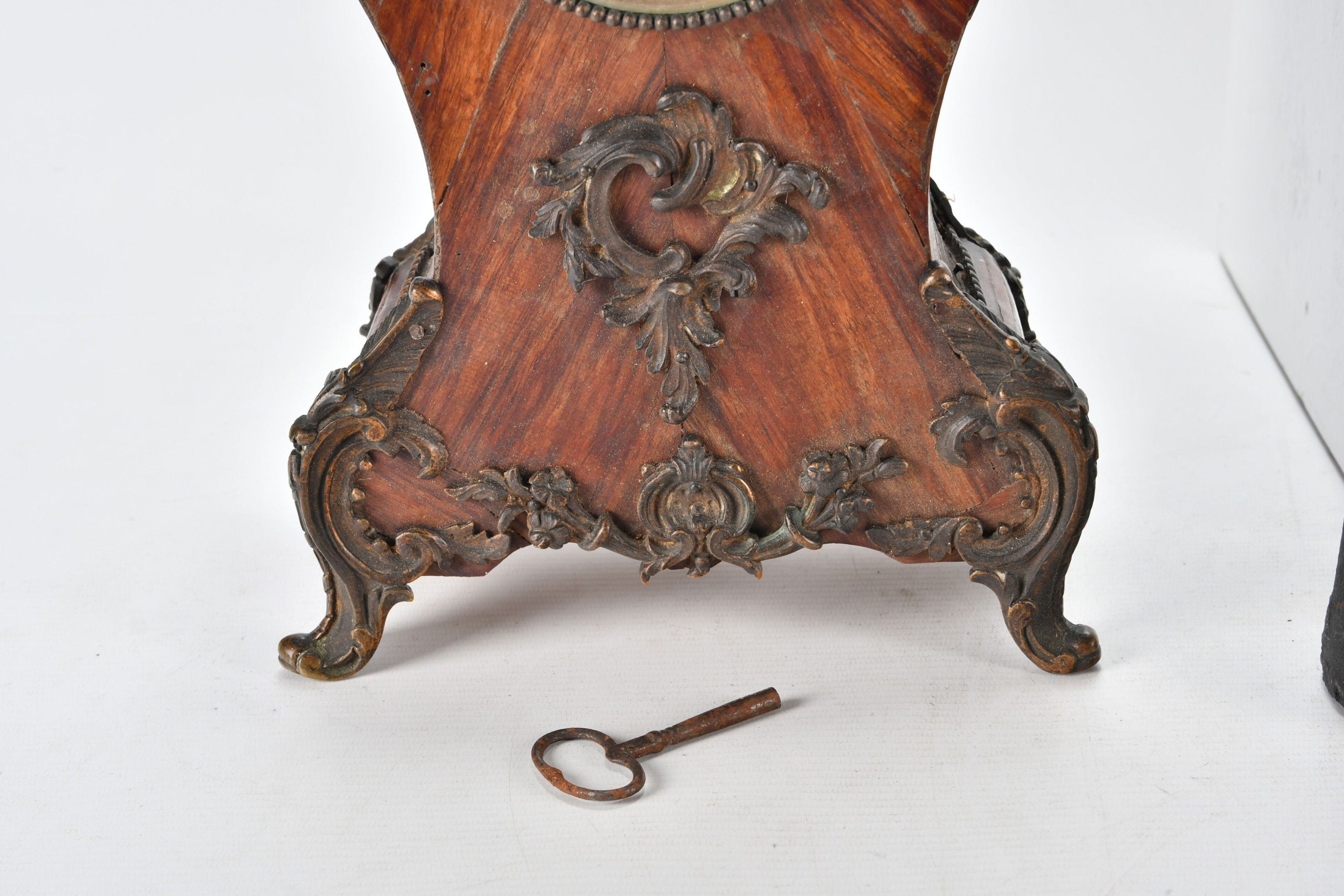Wooden and veneered violin-shaped CARTEL HANGER (small) with bronze ornamentation of rocaille foliage and pearl friezes. Surmounted by a reading putto. Enamelled circular dial with Roman numerals. Wire movement stamped JAPY Frères. Height 44 cm. Extensive damage. INCLUDED is a comtoise clock movement.