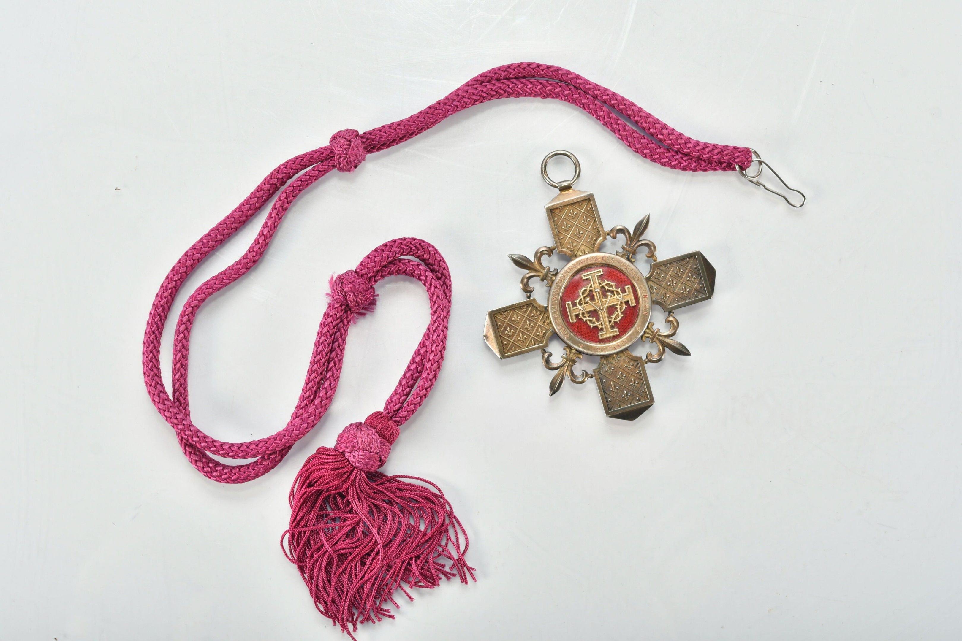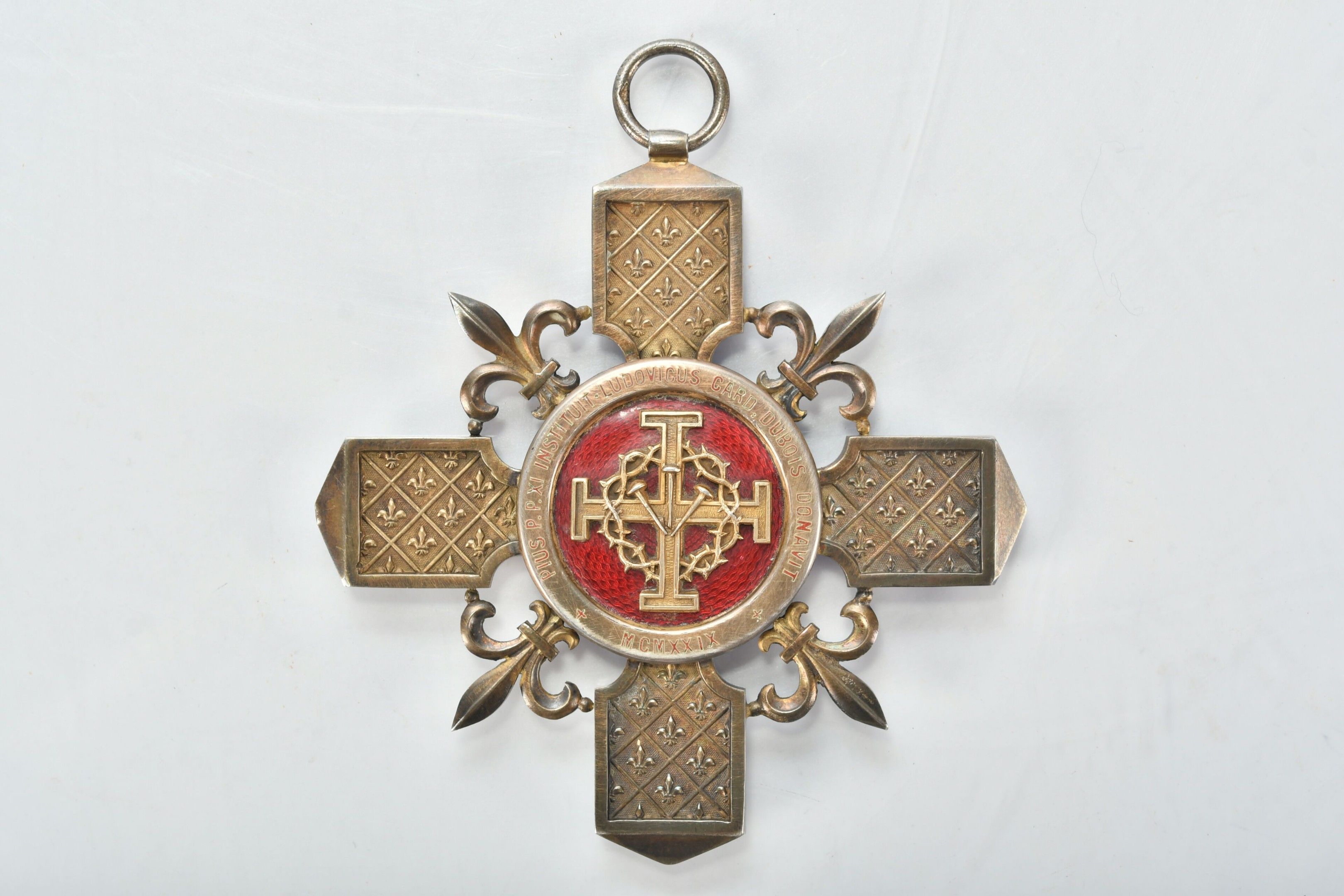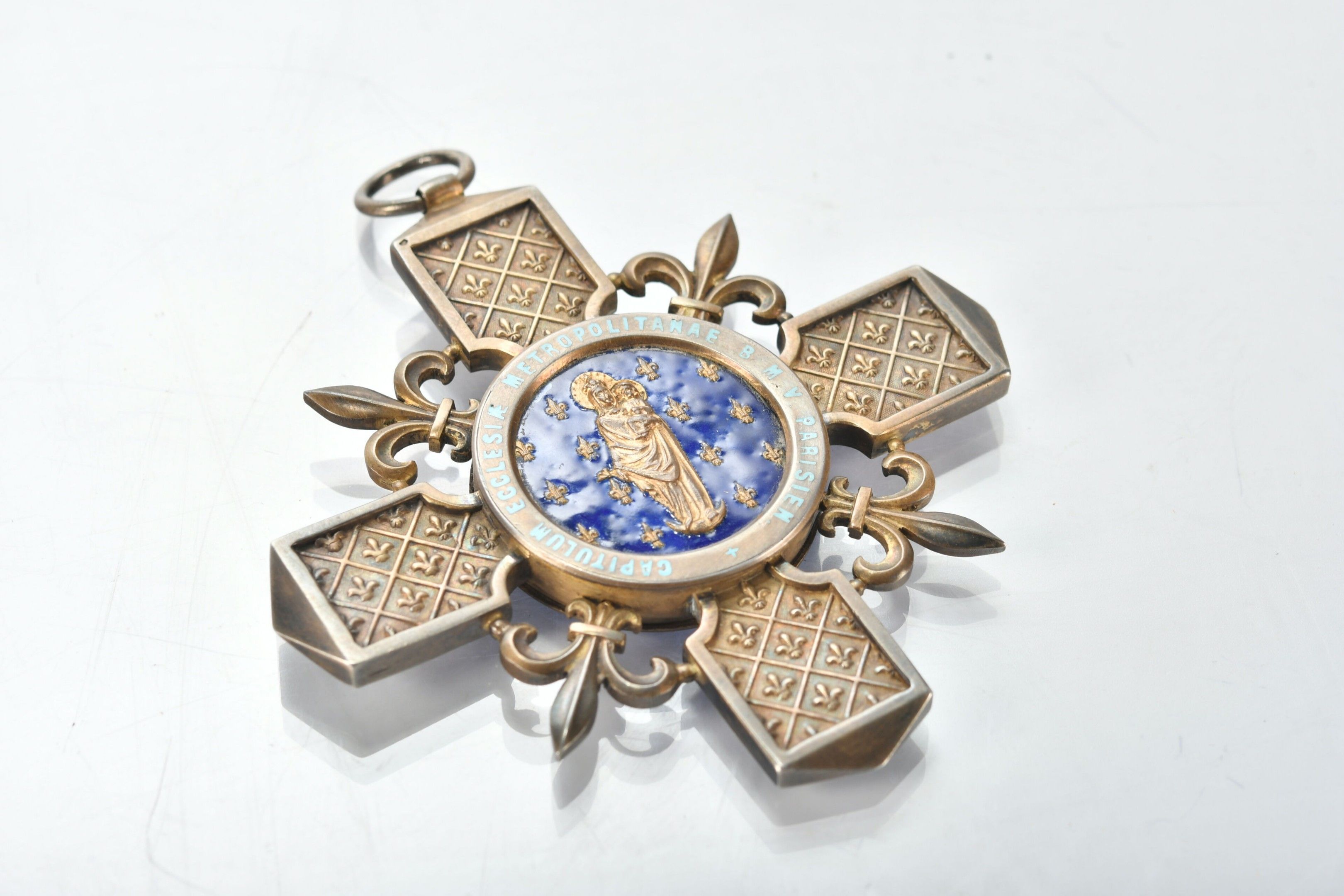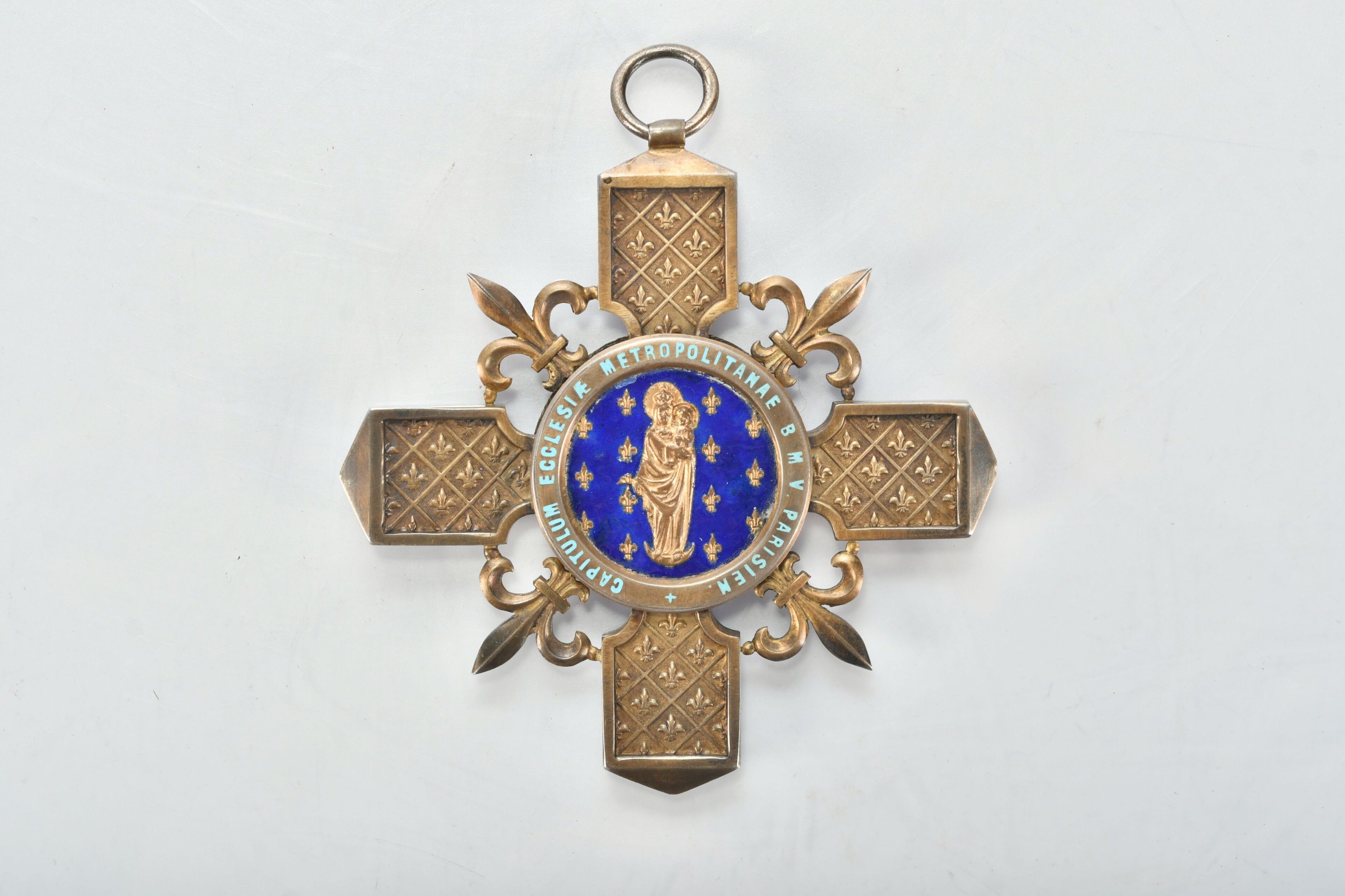 Paris CHAPTER CROSS in vermeil, arms decorated with fleur-de-lys. Enamelled centres with on the obverse: Notre-Dame in the round on a background of azure semé de lys d'or and on the reverse: cross pattée of Jerusalem charged with the crown of thorns and bearing the Saints-Clous on a background of translucent red enamel. Probably made by Arthus Bertrand. 9.5 x 9 cm. Gross weight 84g