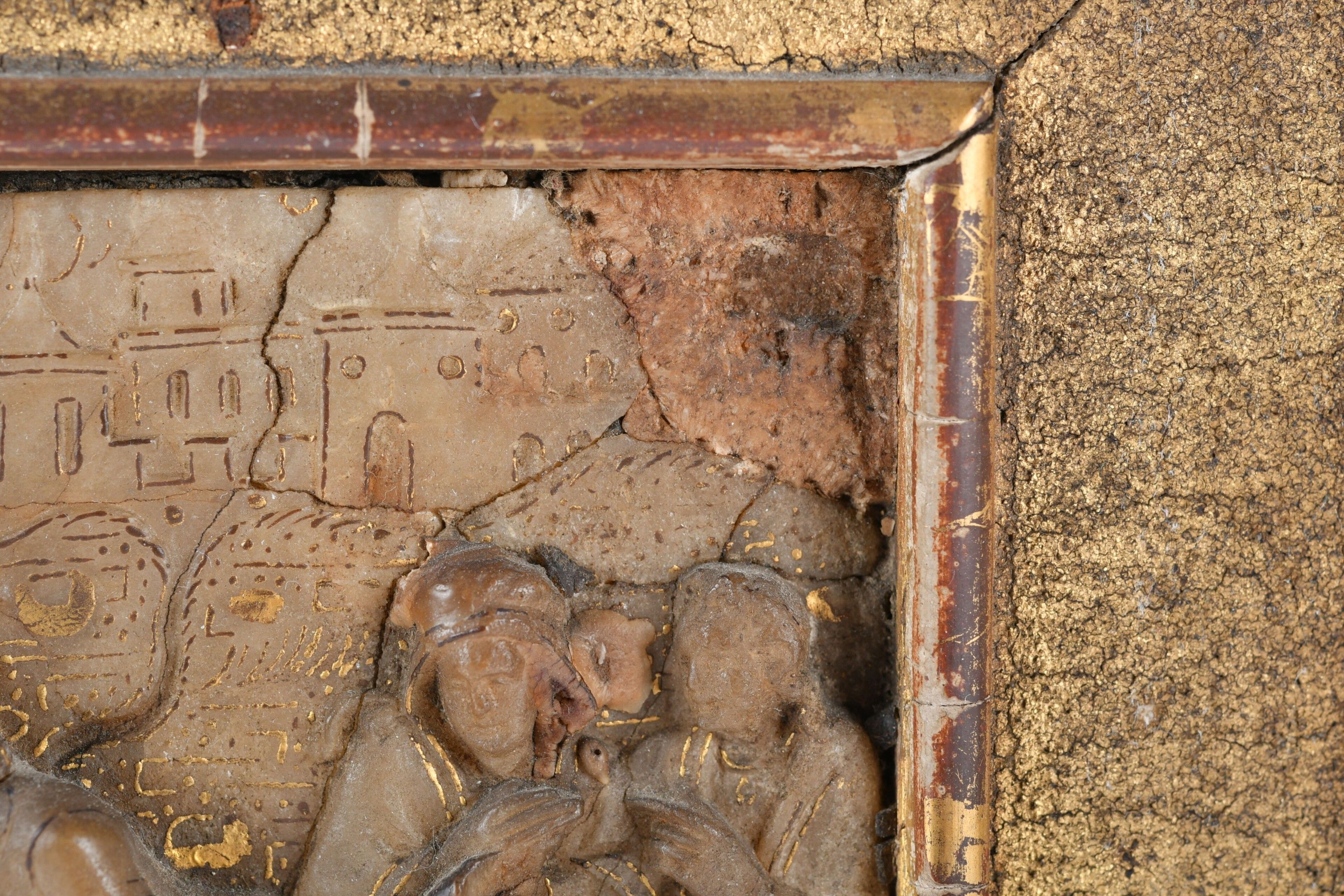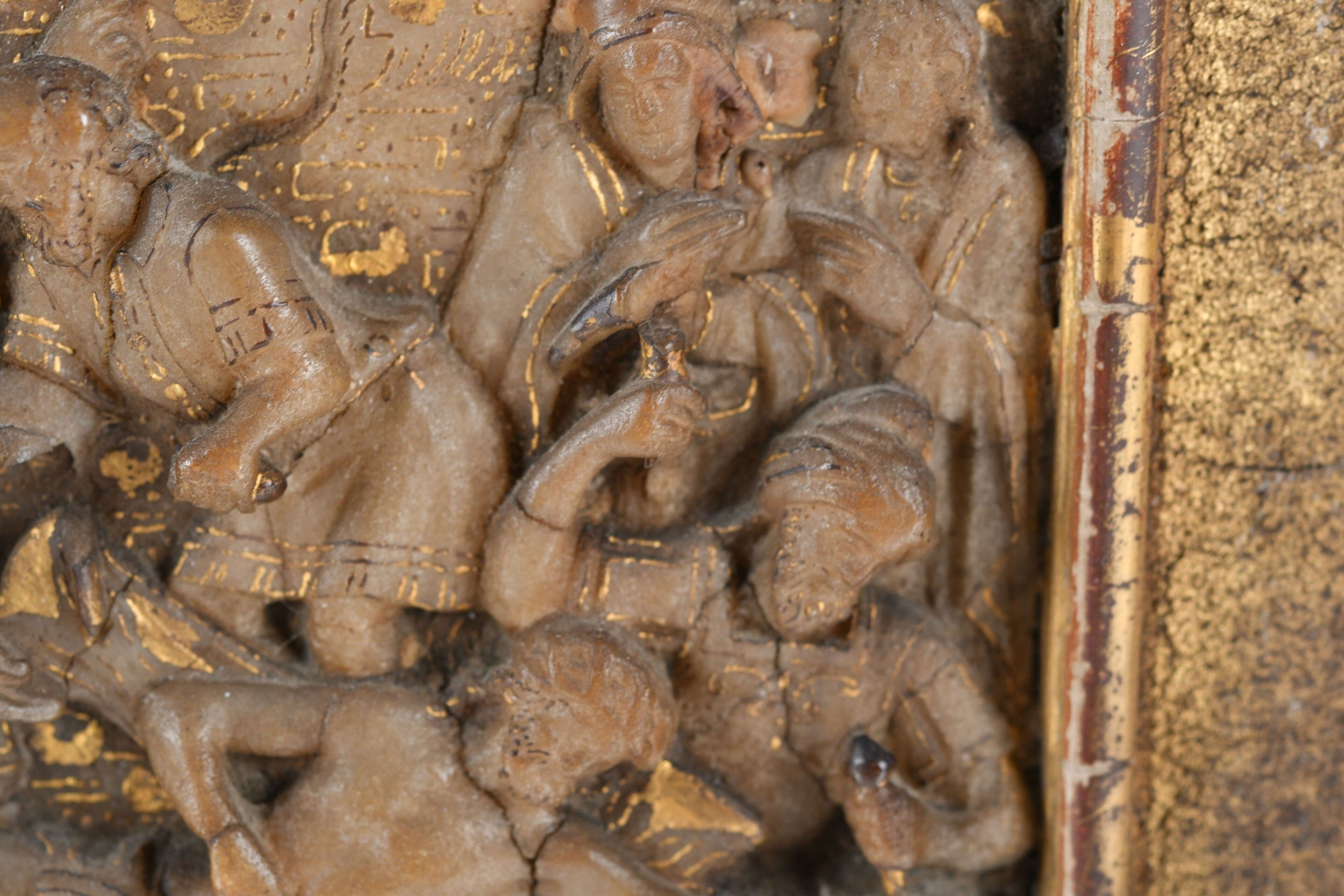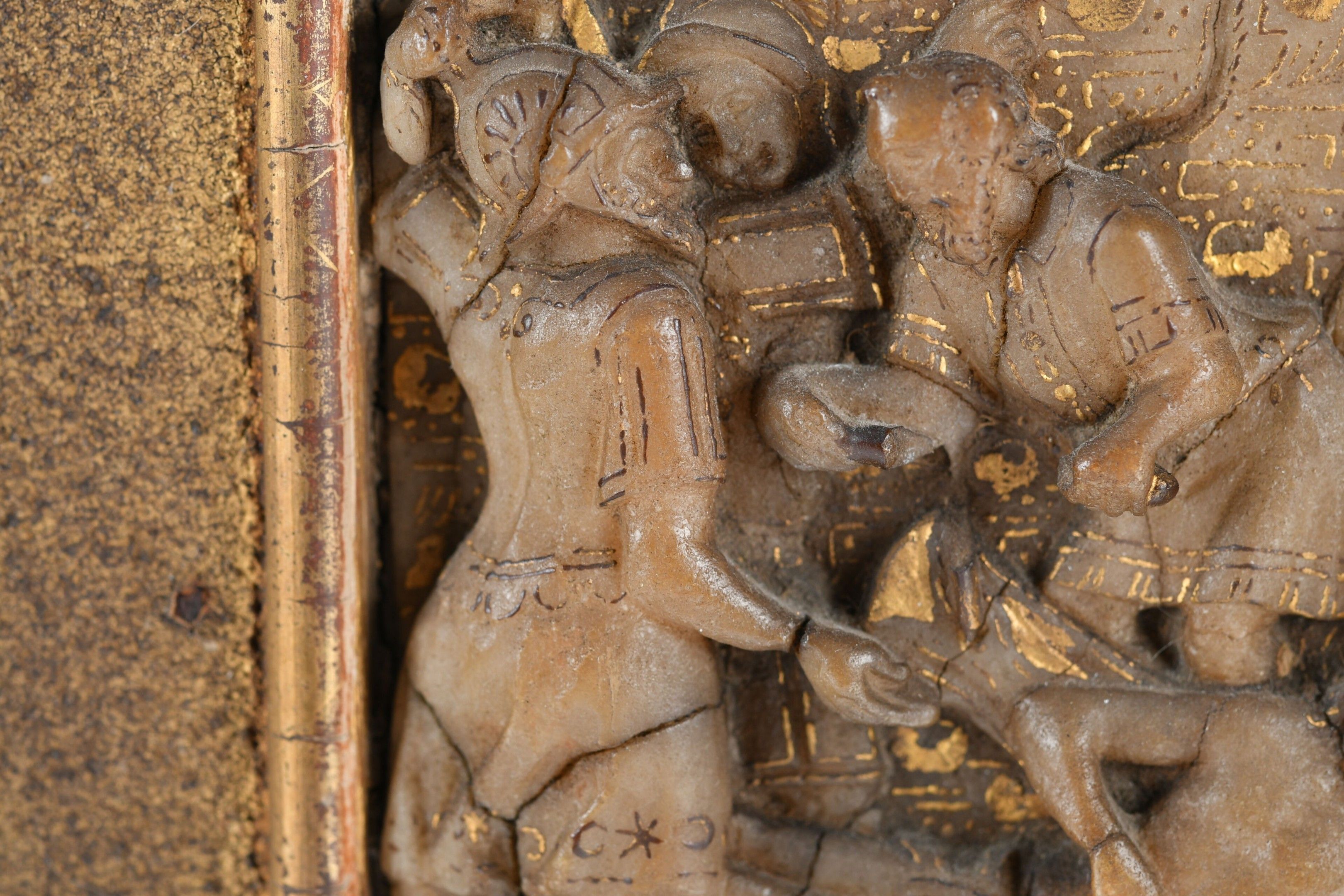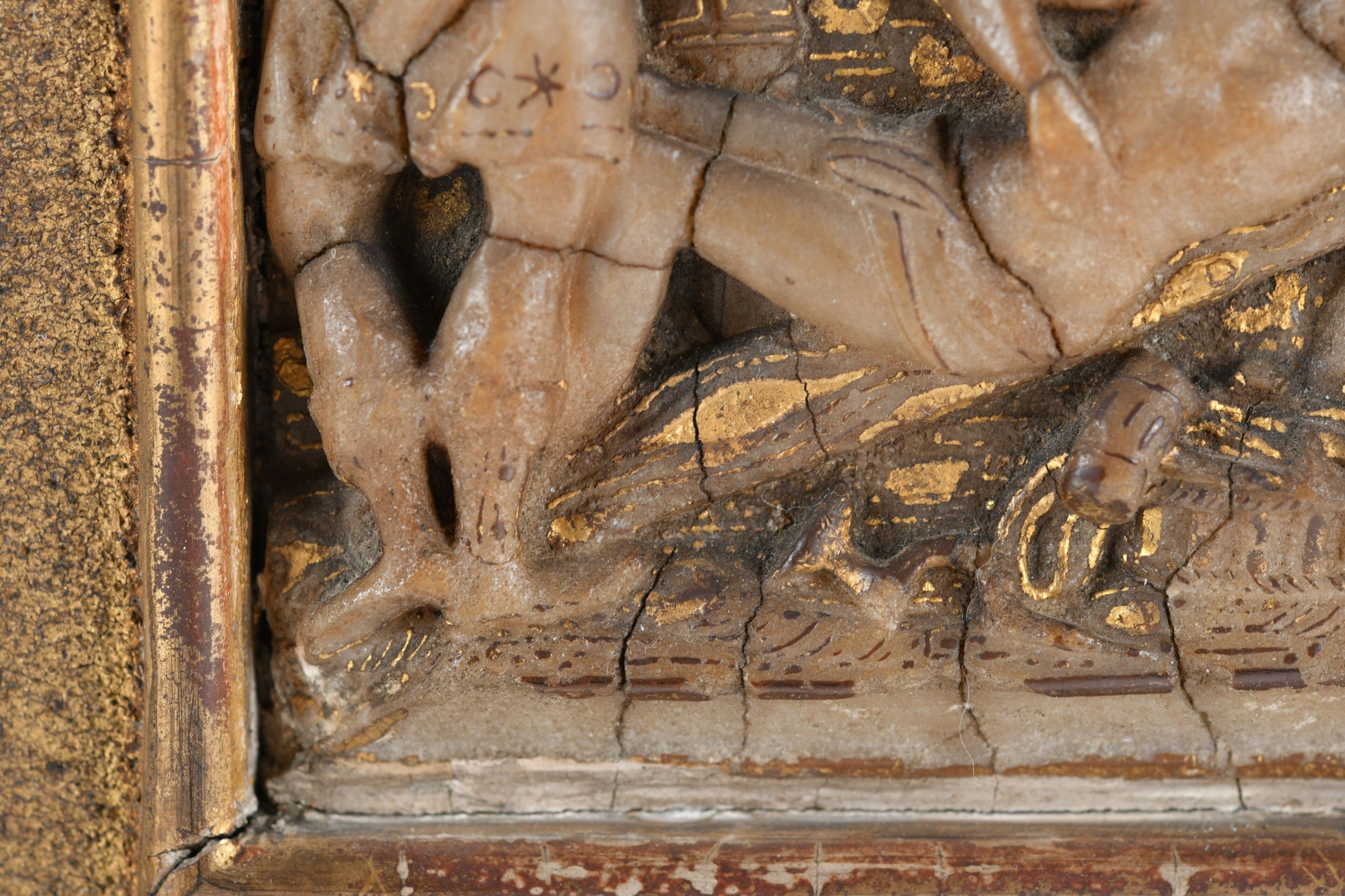 An alabaster plaque carved in bas-relief with gold highlights depicting Jesus nailed to the cross. Gilded wood frame. Mechelen, early 17th century. H. 13 - W. 10 cm (accidents and restorations, notably to the upper right corner). Blackened wood frame