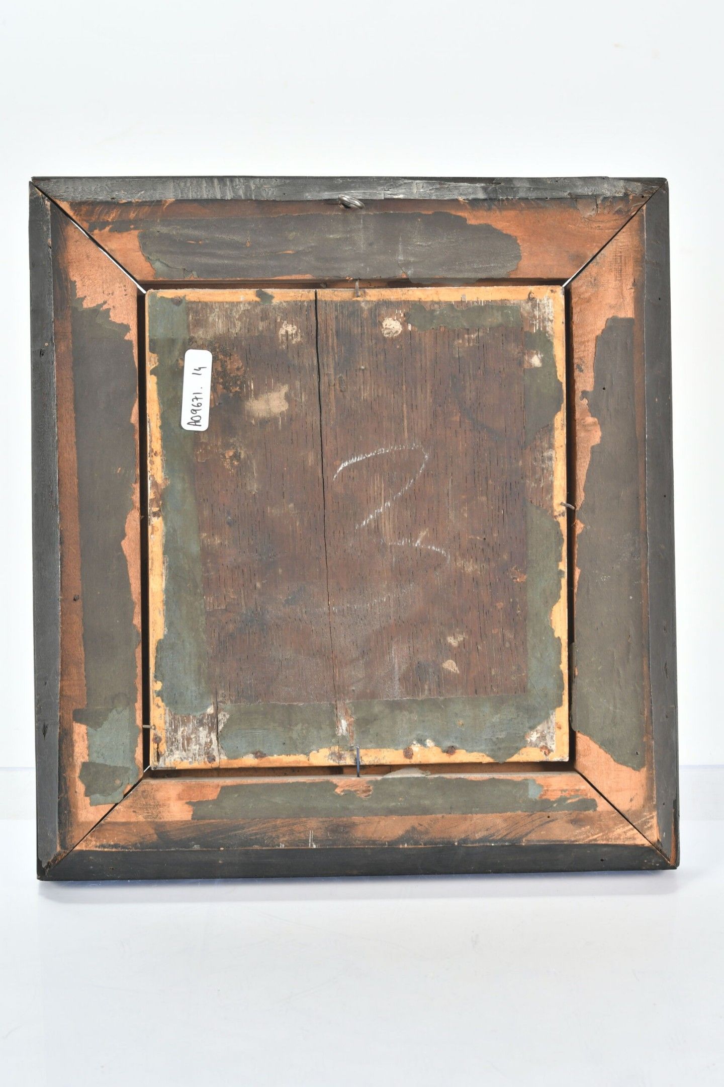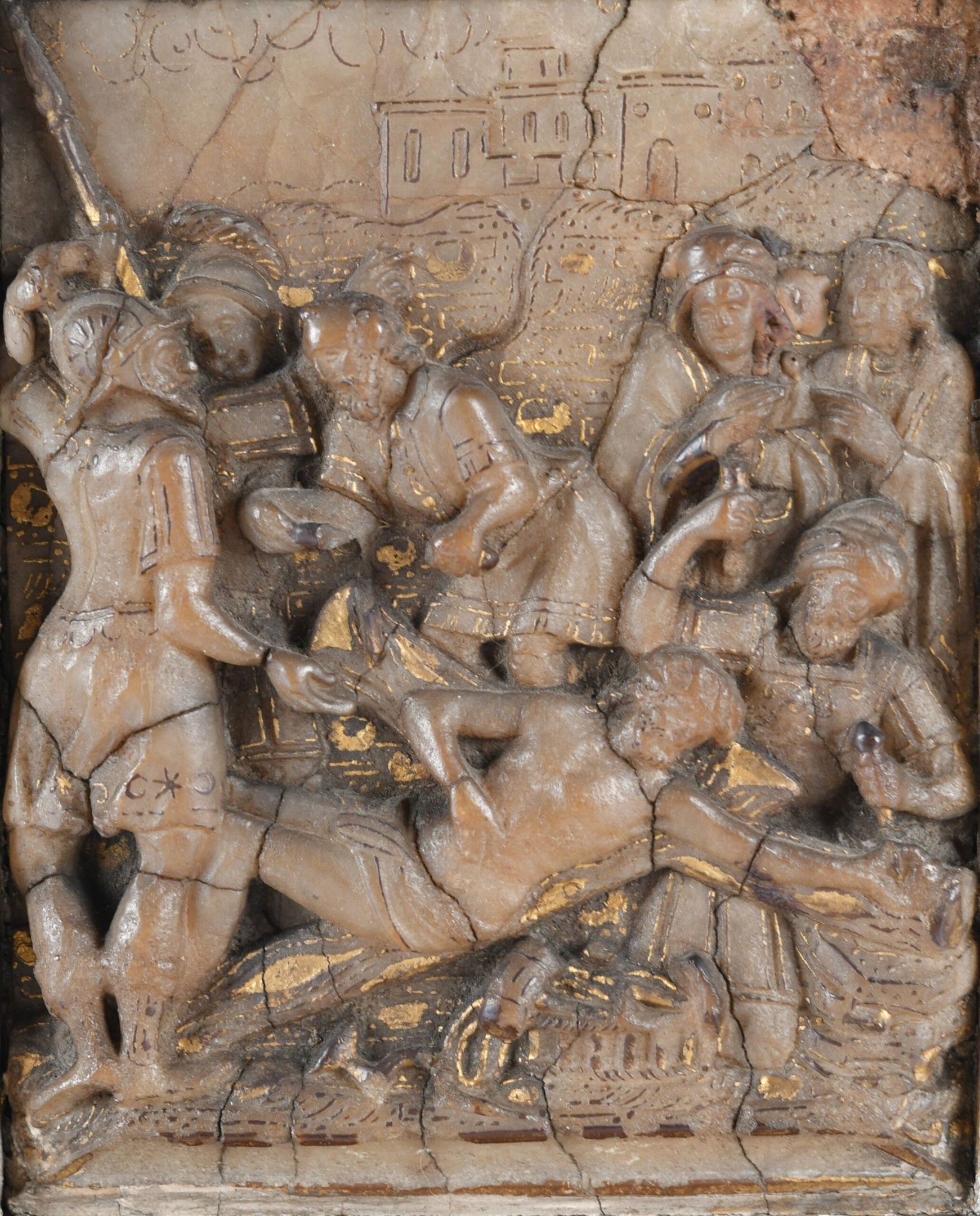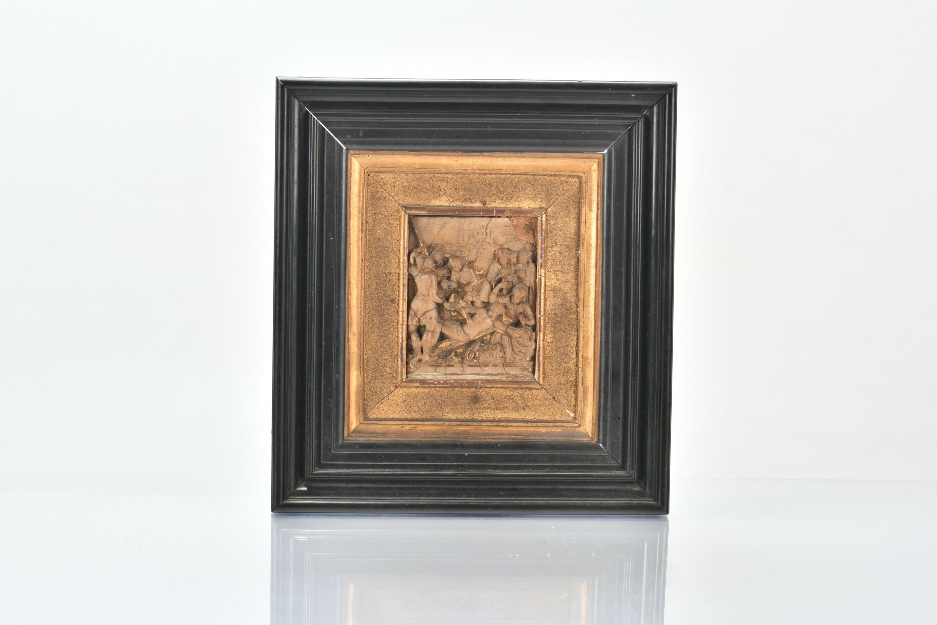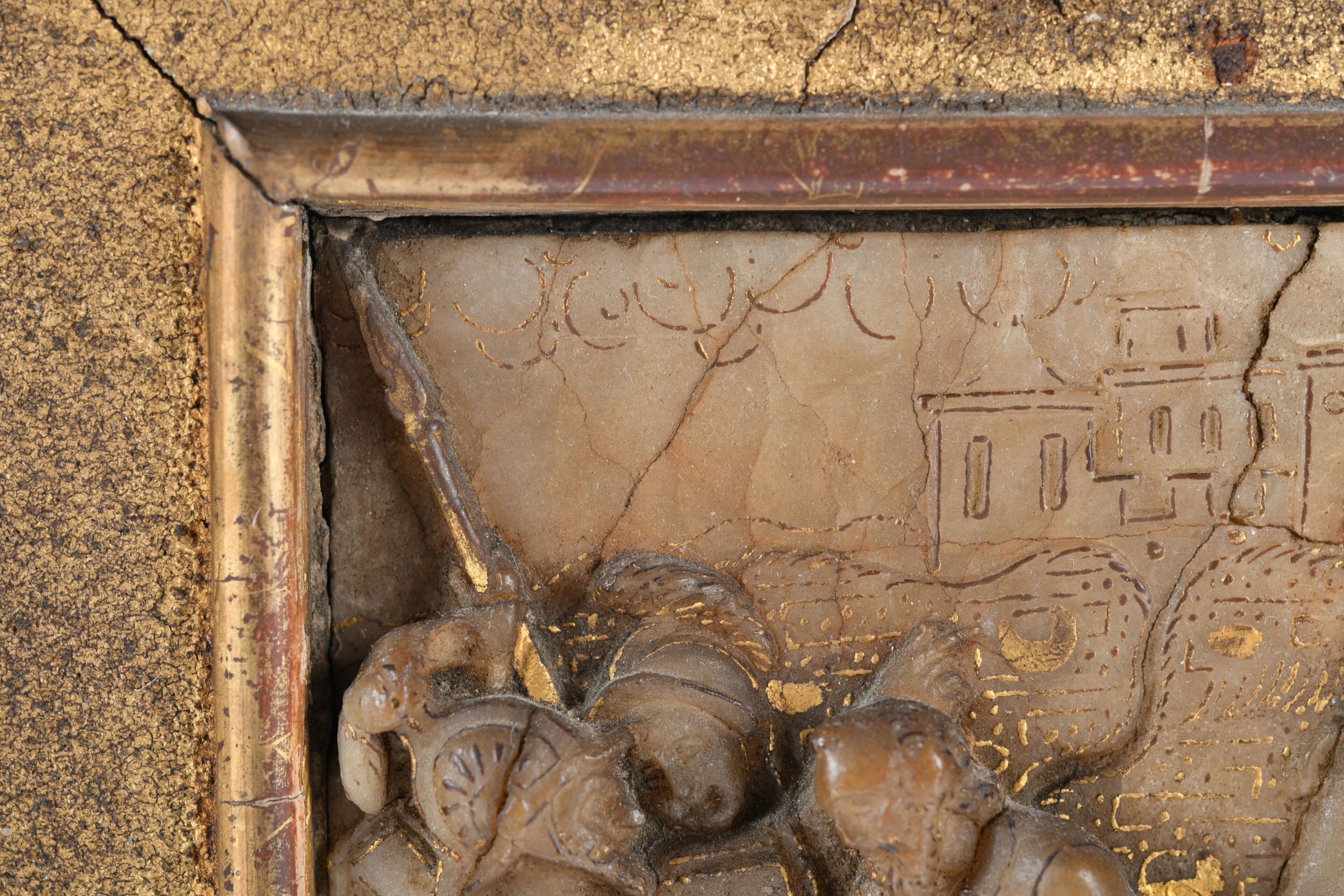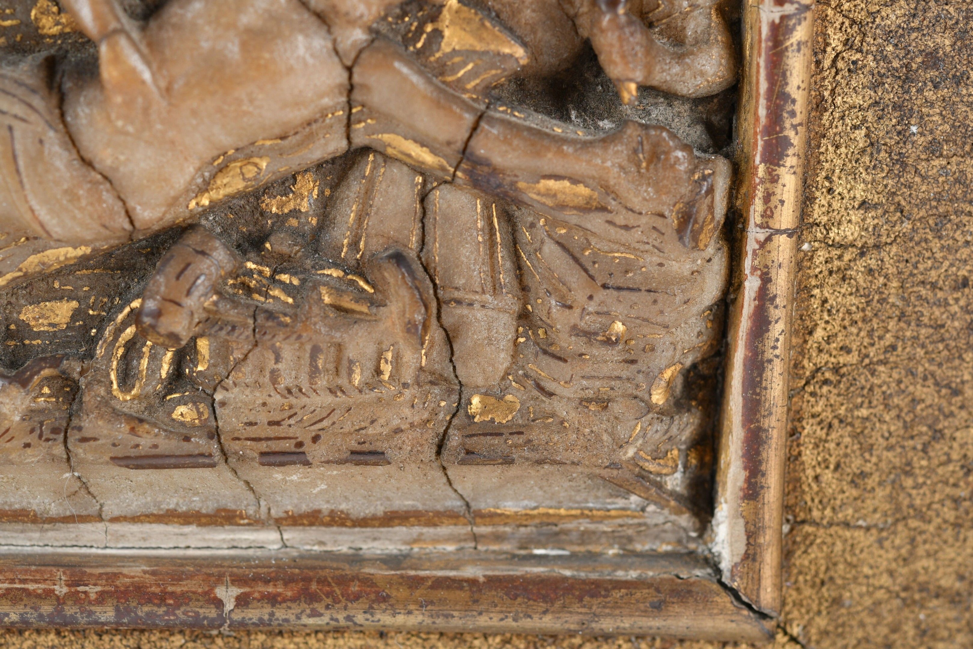An alabaster plaque carved in bas-relief with gold highlights depicting Jesus nailed to the cross. Gilded wood frame. Mechelen, early 17th century. H. 13 - W. 10 cm (accidents and restorations, notably to the upper right corner). Blackened wood frame