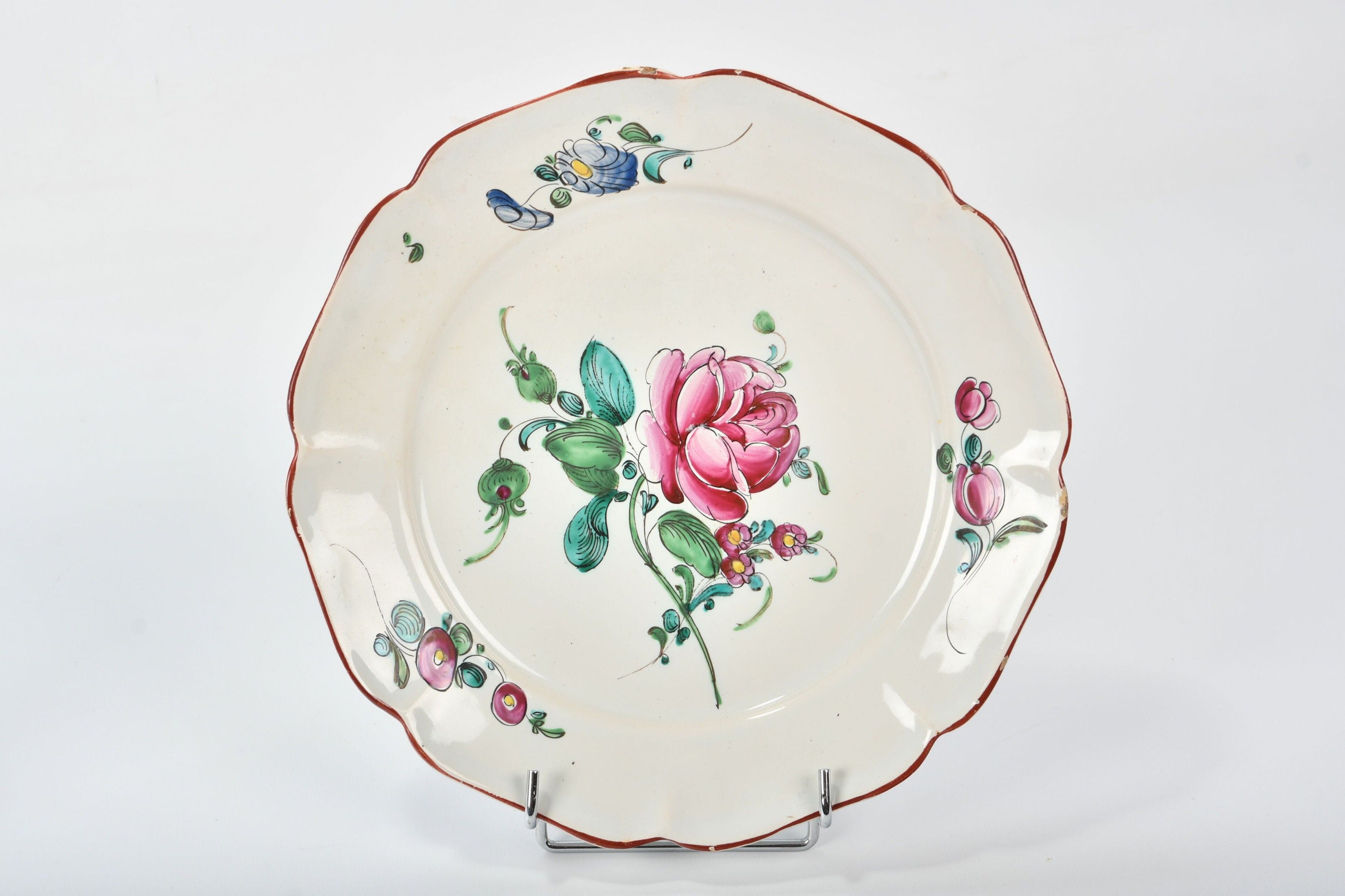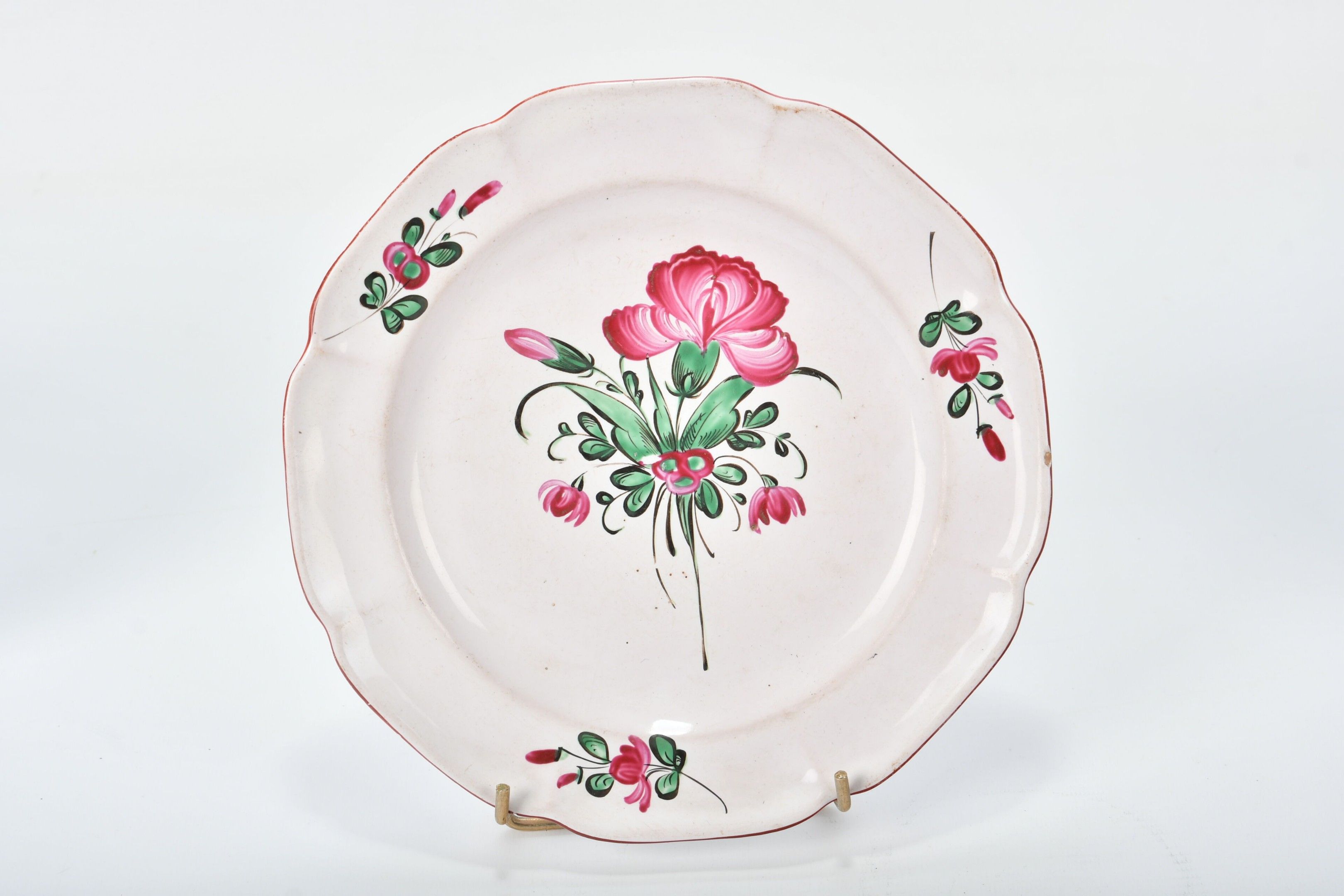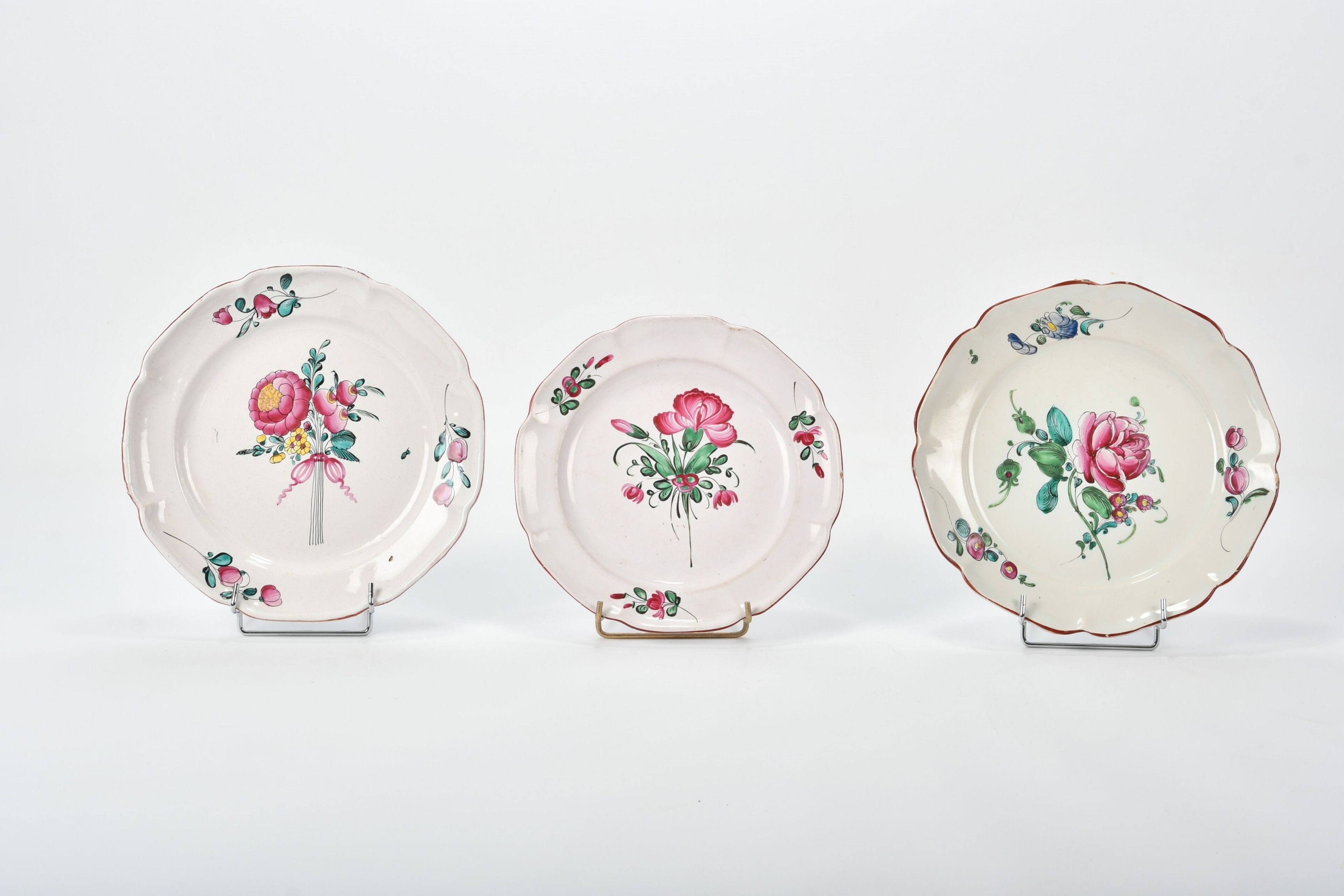 EASTERN earthenware. Earthenware plates (set of three) with contoured rim and polychrome flowers and fillet decoration. Early 19th century. Diam. 24 cm. and Diam. 23 cm. Small glaze chips to the set