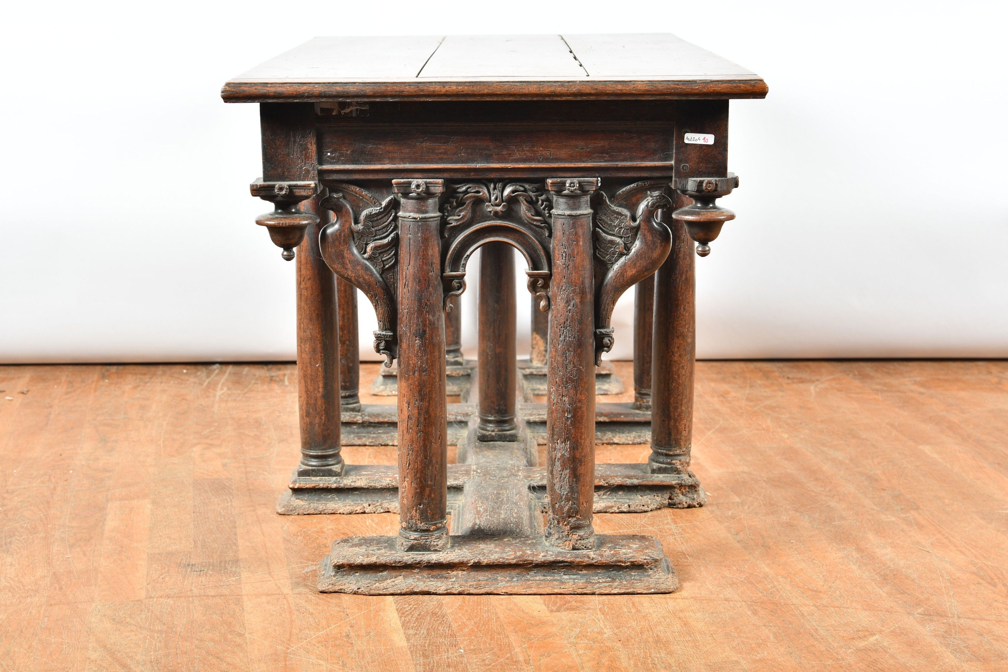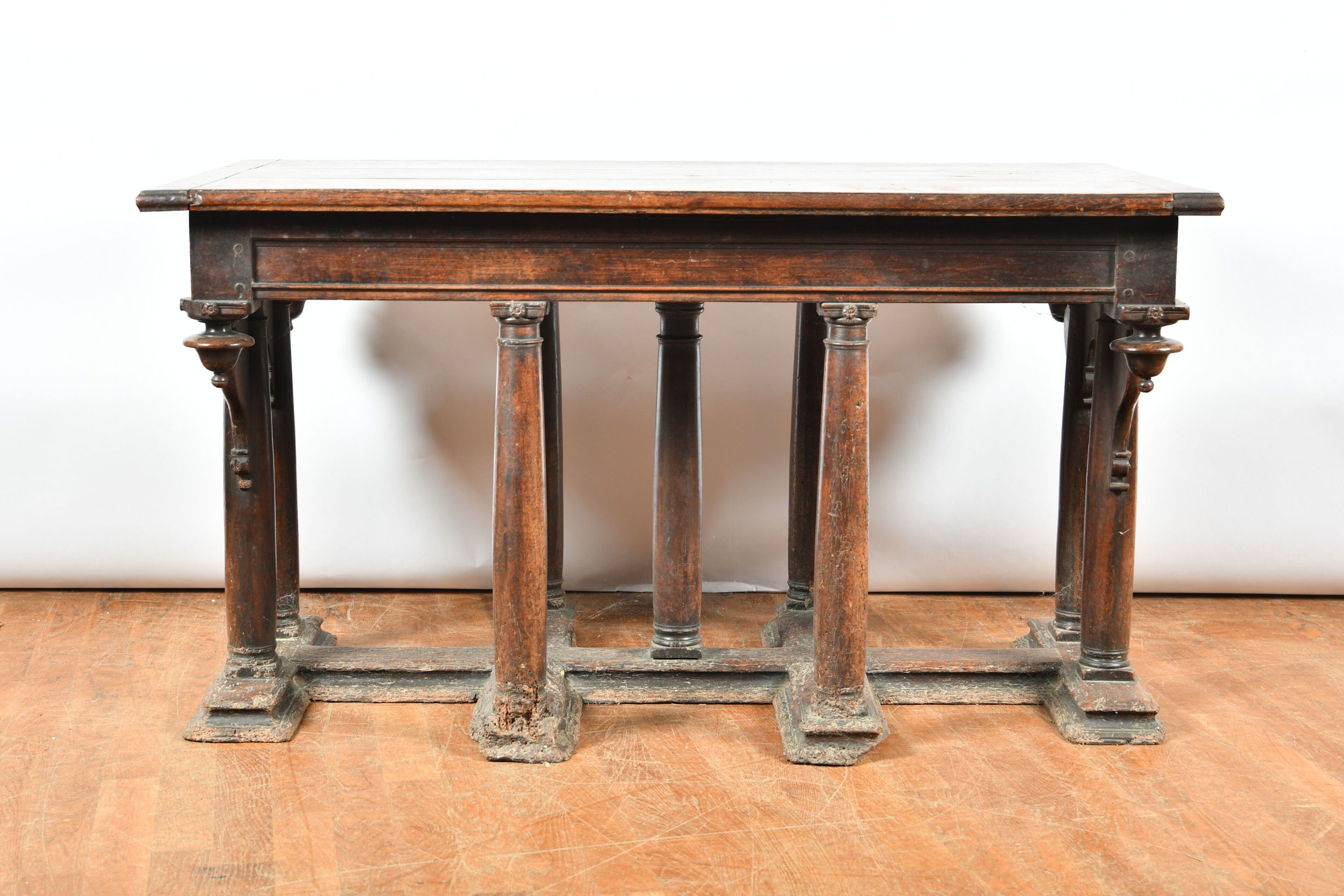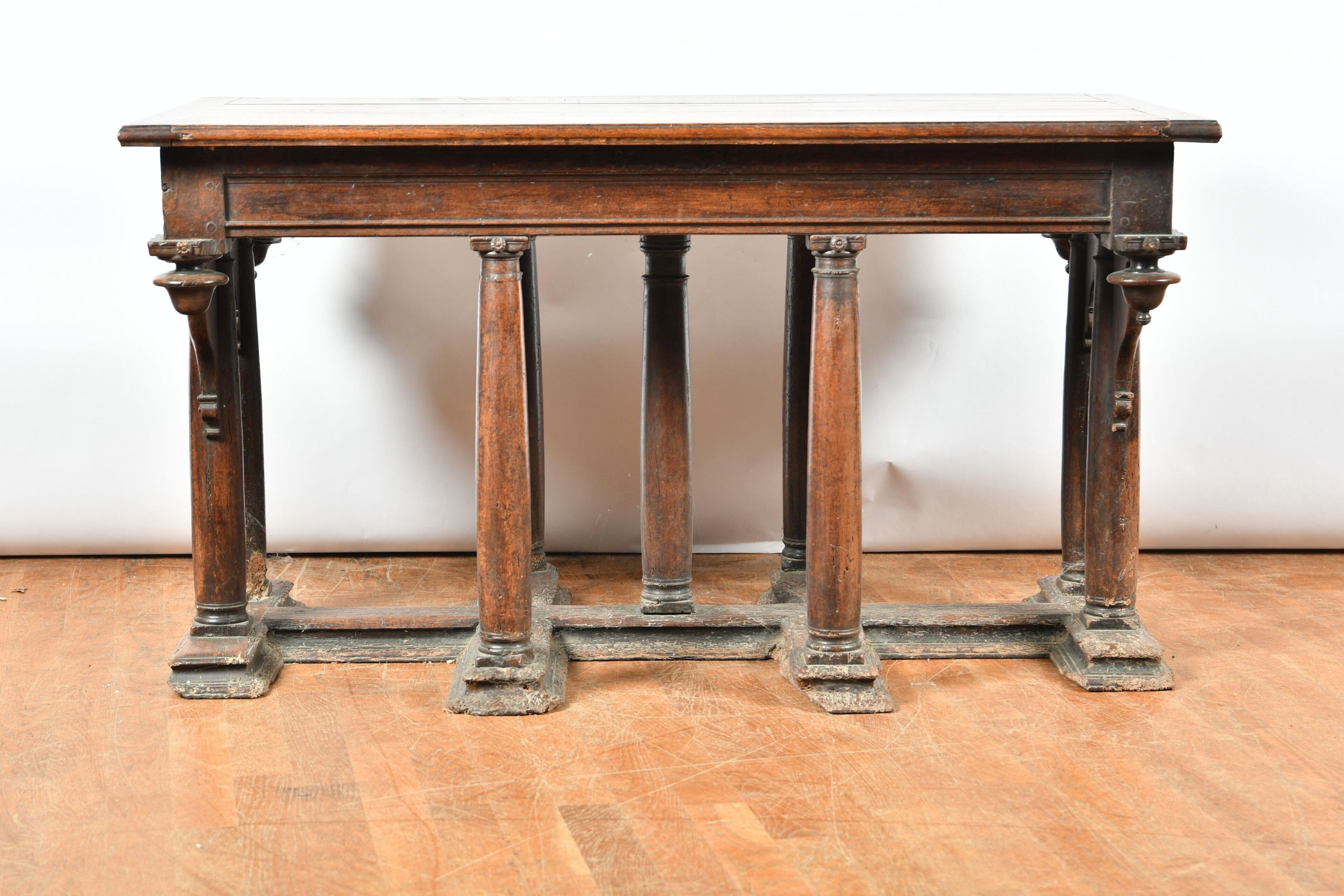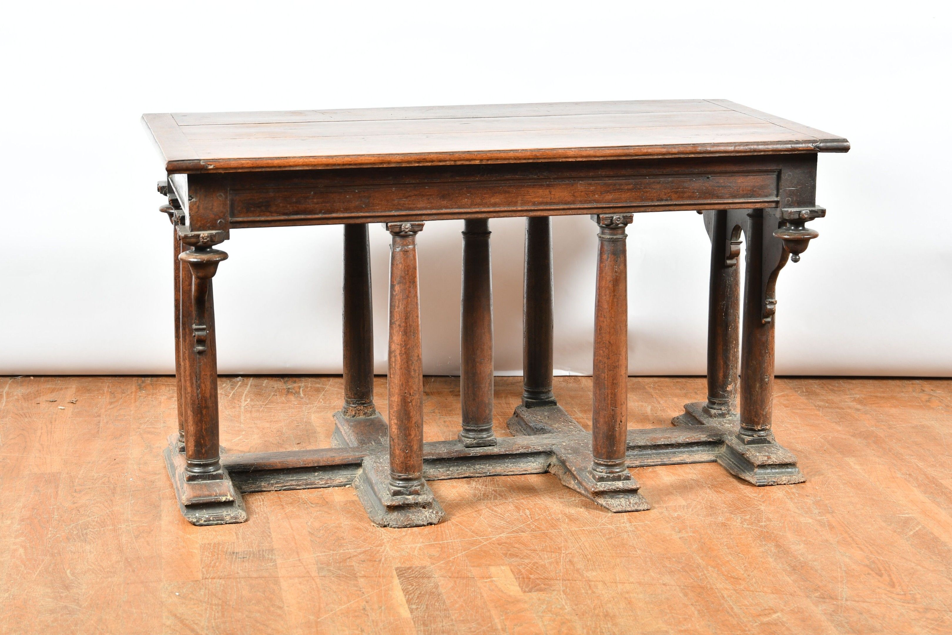 A Loire Valley Italian-style walnut table with nine uprights turned into columns with Ionic capitals and a moulded base resting on Lorraine cross braces. Decorated with inverted tops at the corners. Renaissance period. H. 69 - W. 125 - D. 70 cm. Wear, added top and missing side pulls.