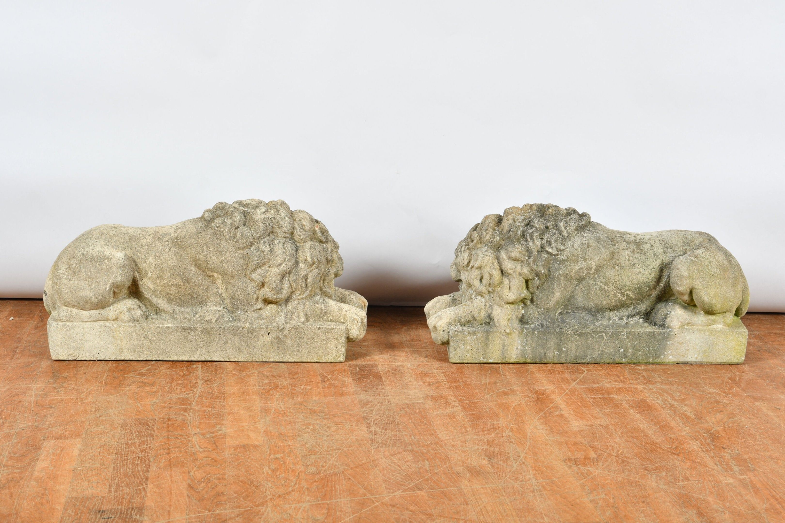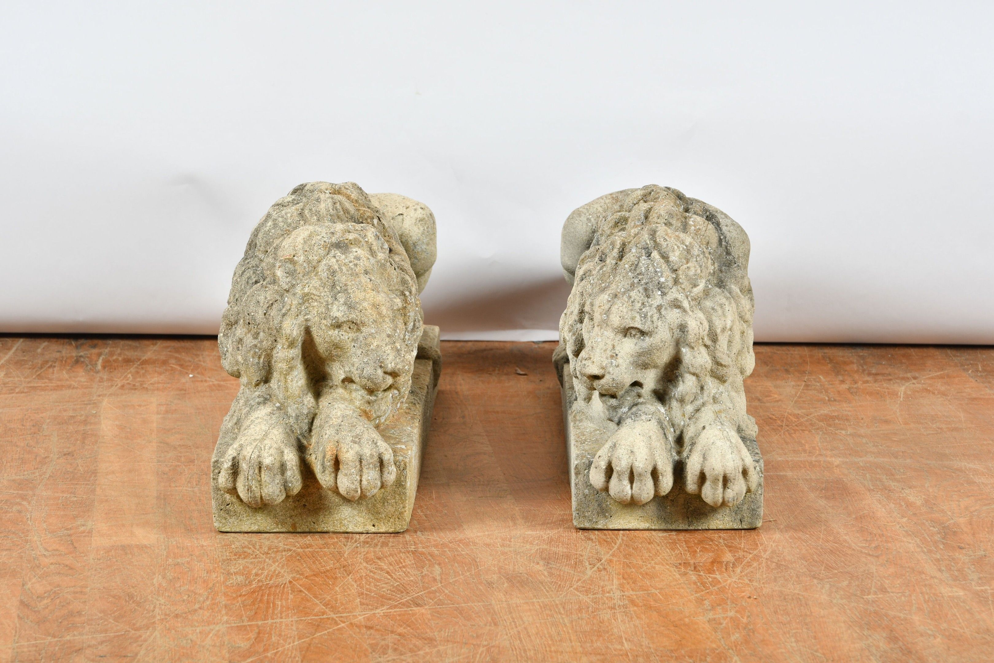 LION STATUES in reconstituted stone (pair of) featuring reclining lions. H. 35 - L. 72 cm. Exterior patina
