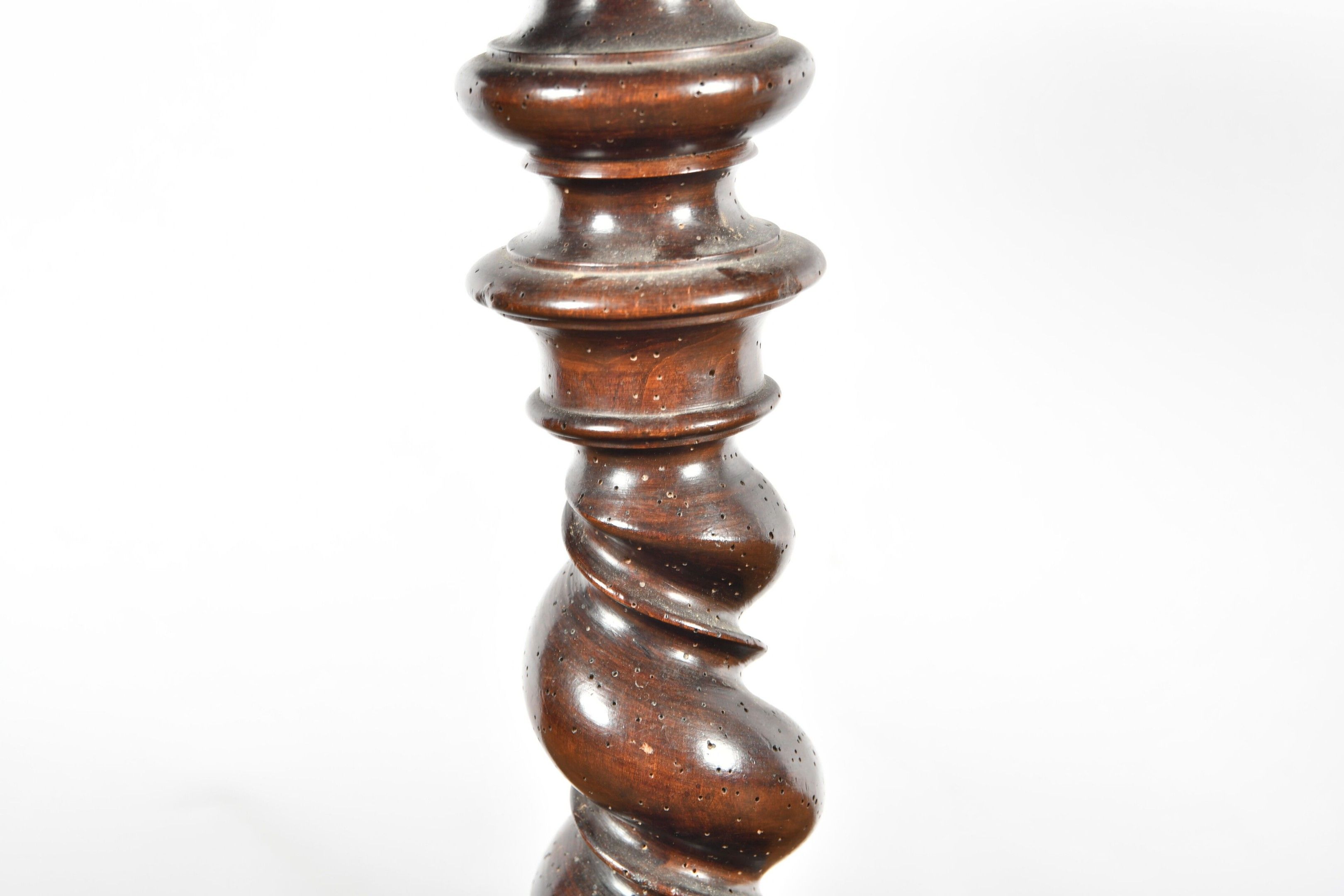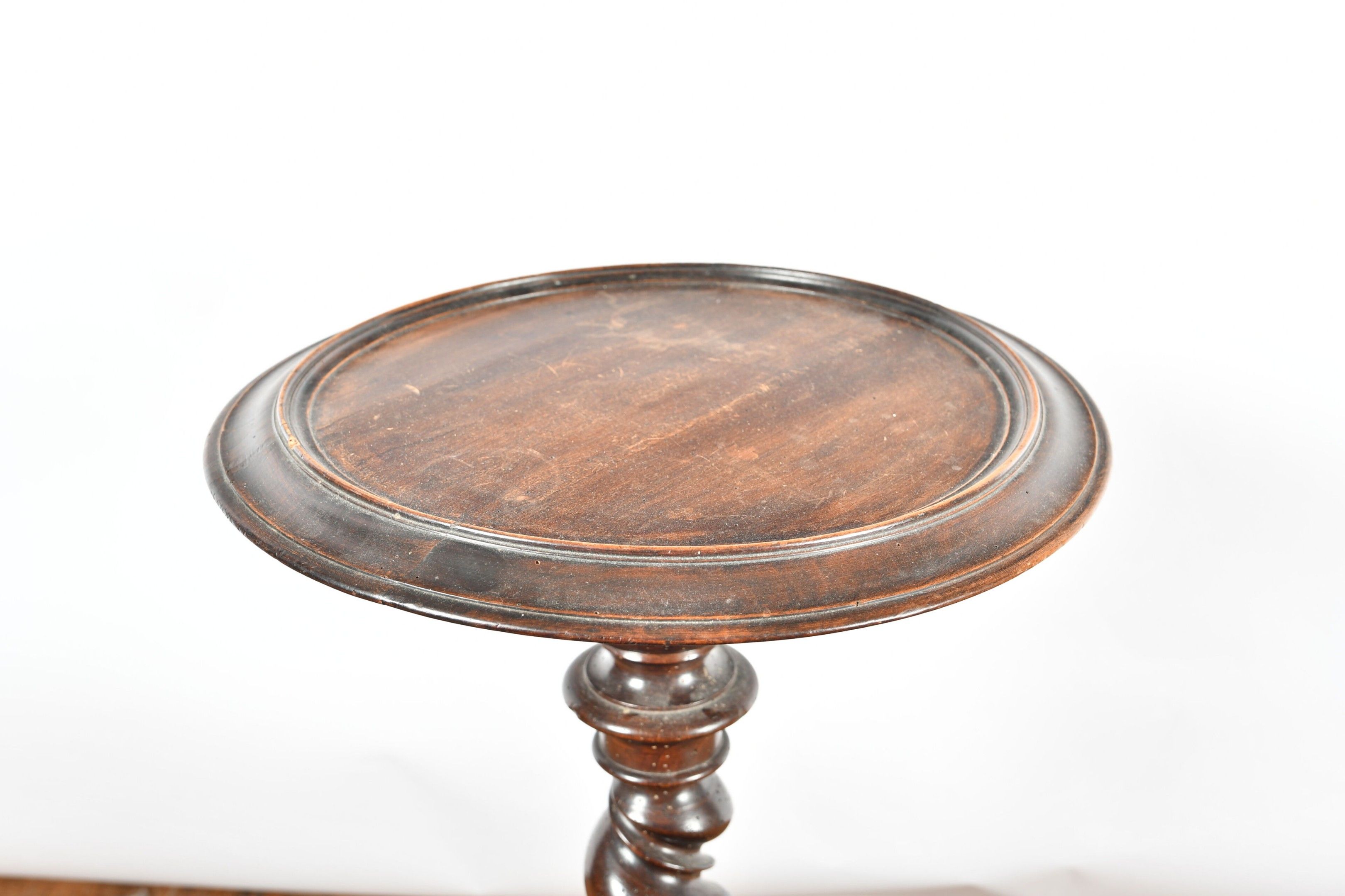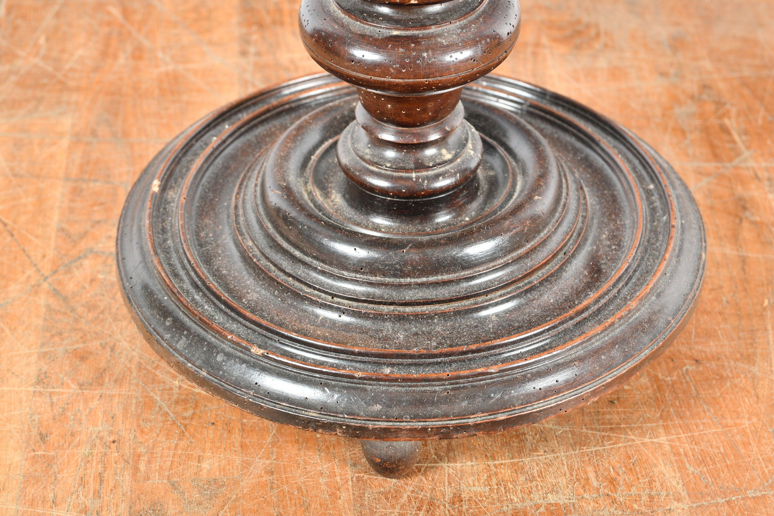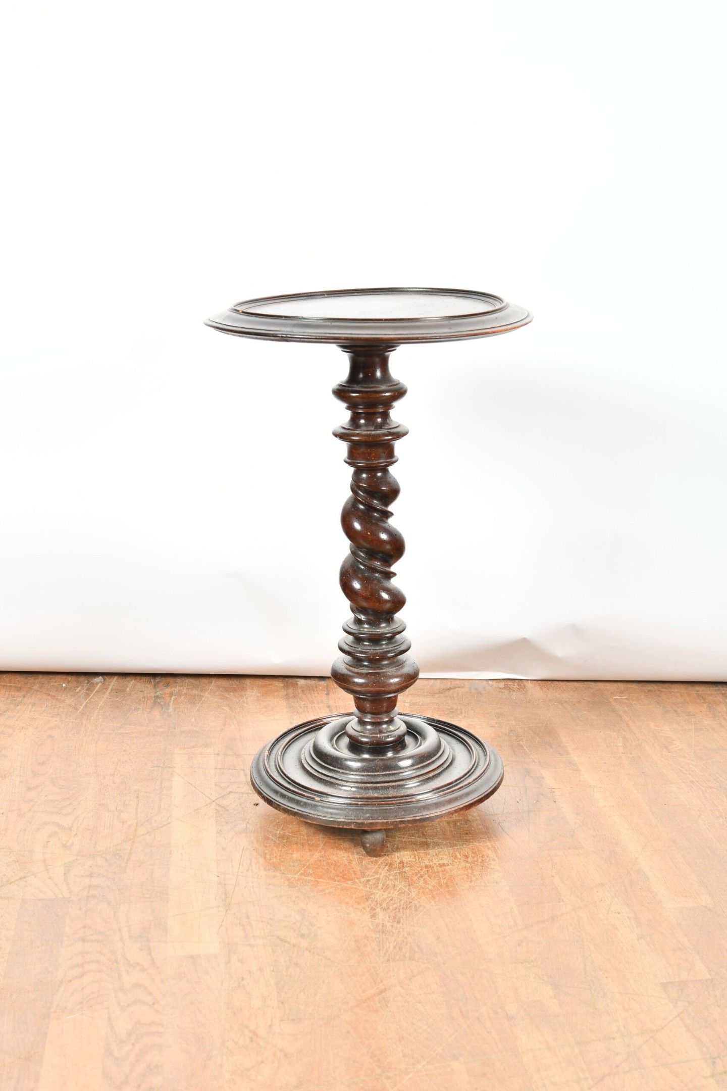 Round SELLETTE on twisted shaft and moulded circular base in partly blackened walnut. Top with moulded contour forming a cabaret tray. 17th century period. H. 76 - Diam. 46 cm
