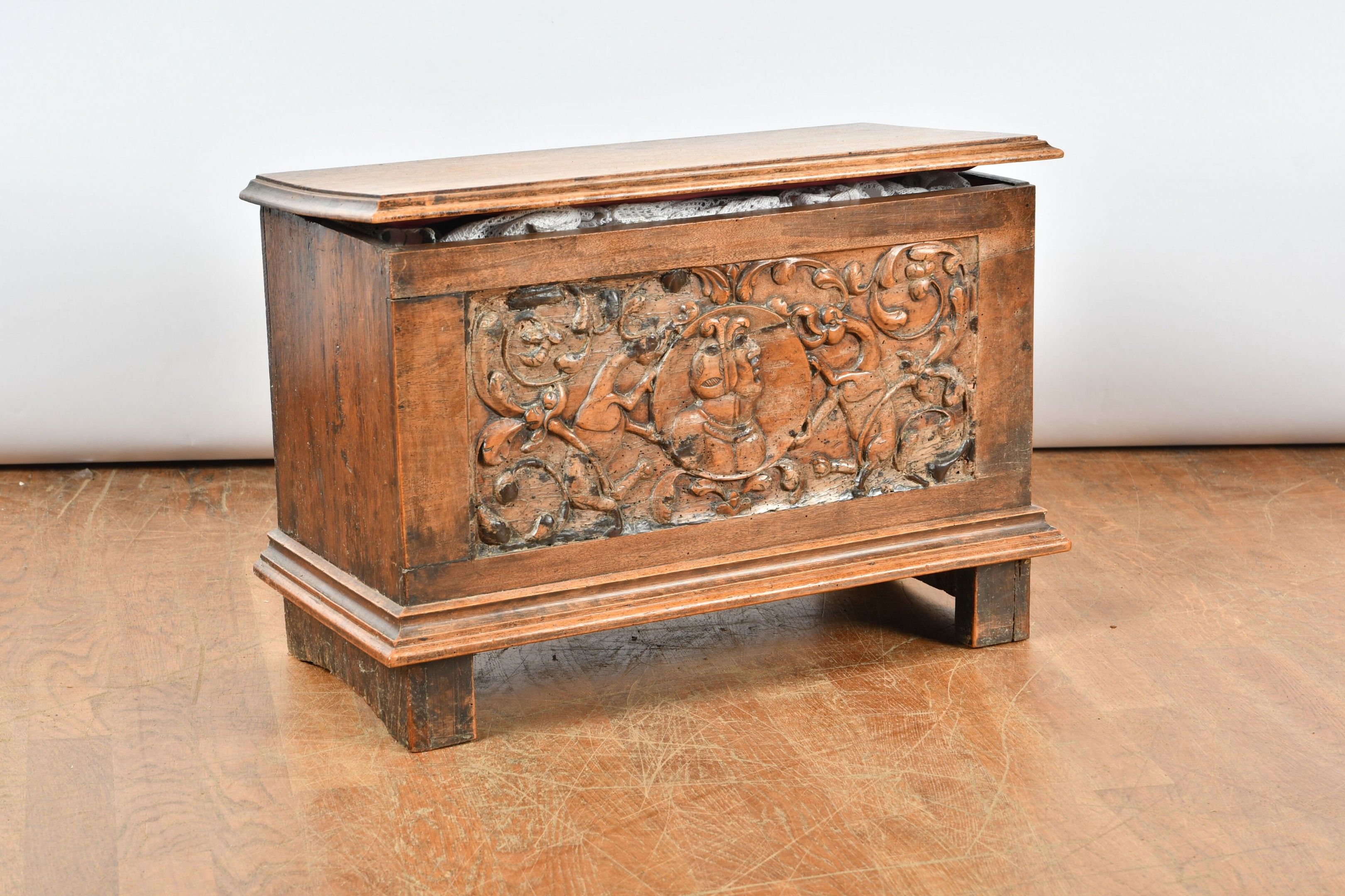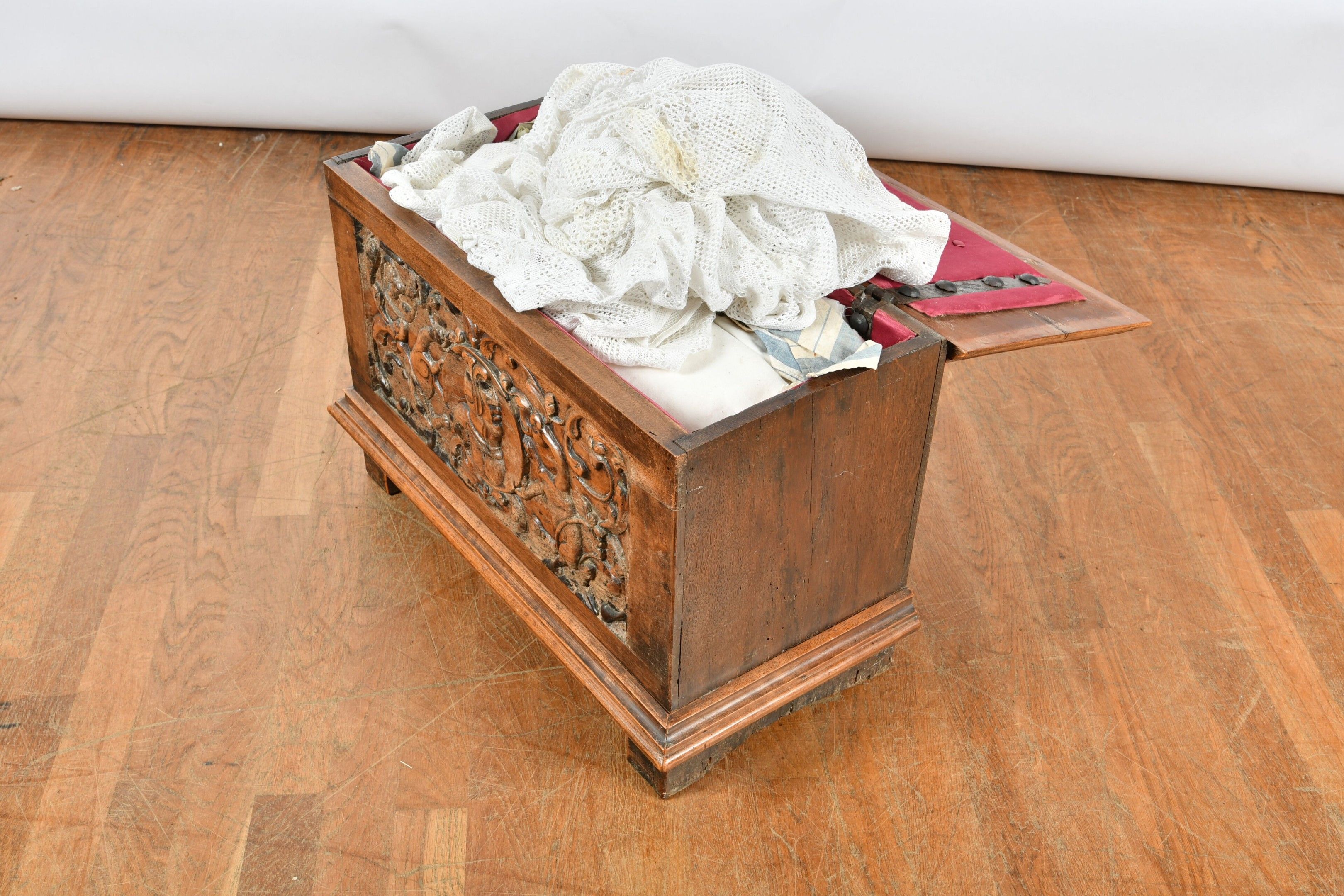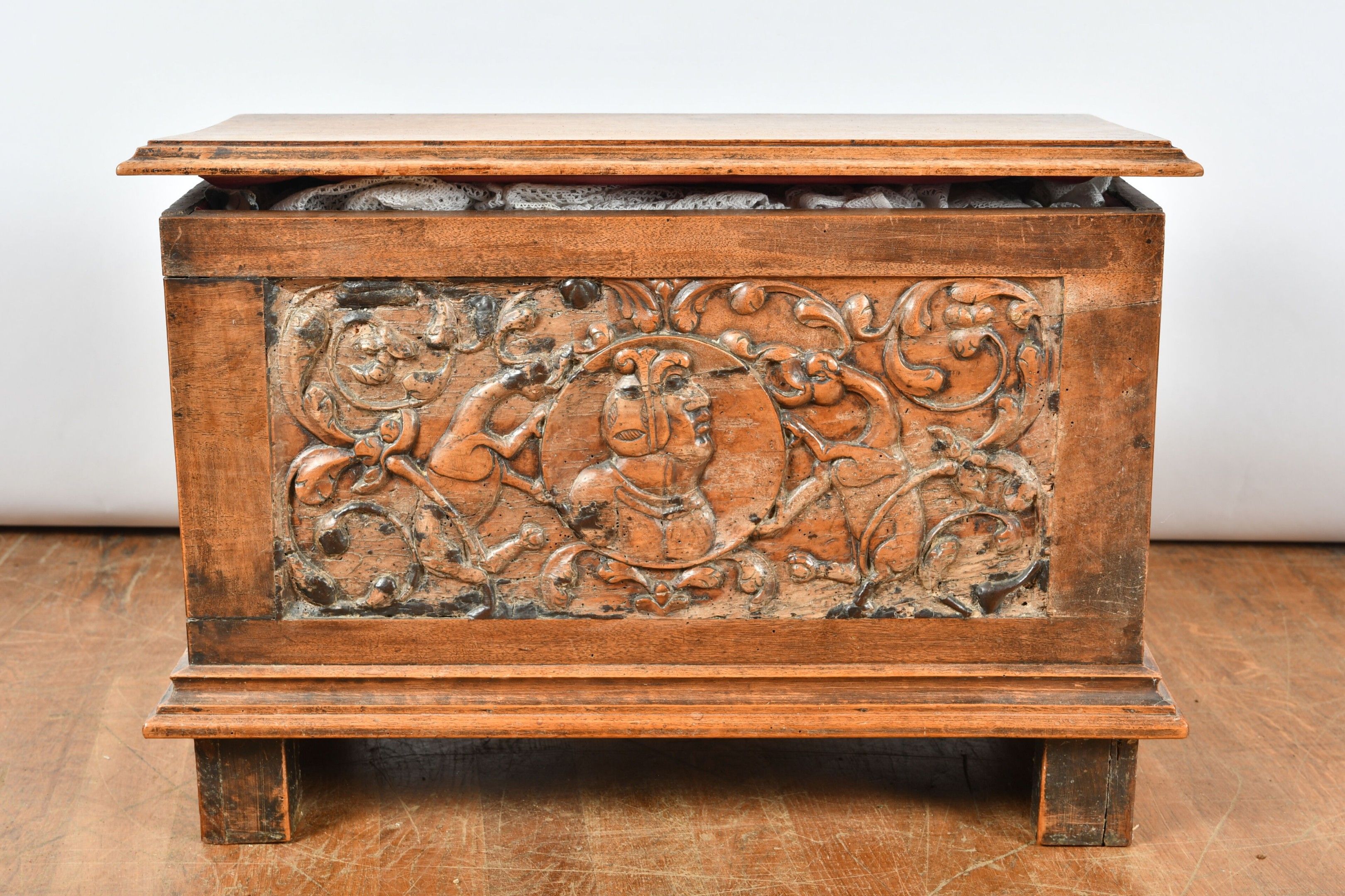 Oak chest (small) with moulded top, the front carved with a medallion showing a man's profile in a foliage frame and supported by two chimeras. 19th century. H. 42 - W. 62 - D. 29 cm Filled with antique white linen including long tea towels and sheets from the 19th century.