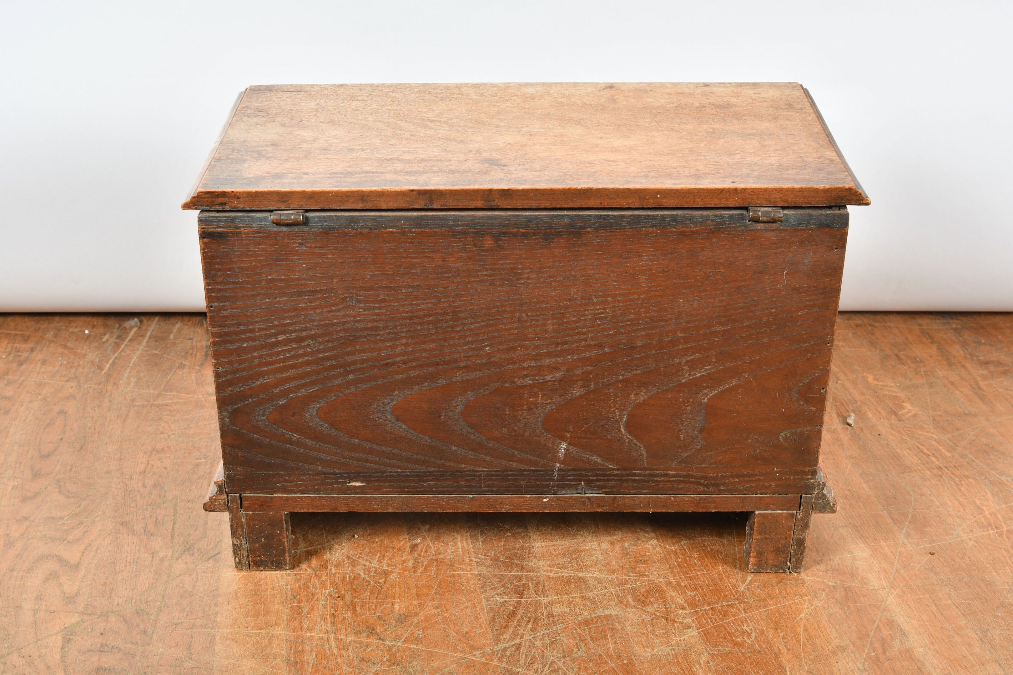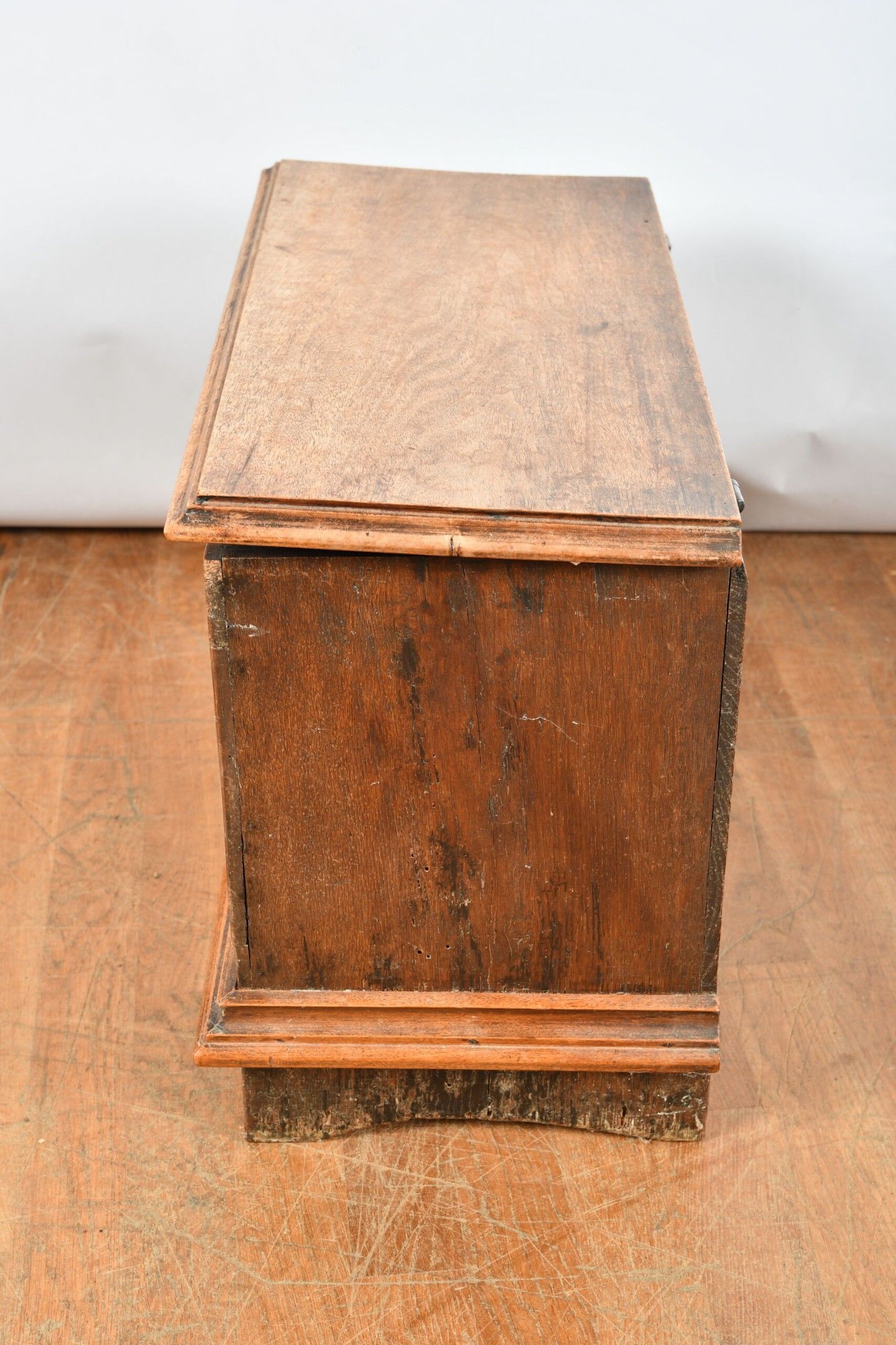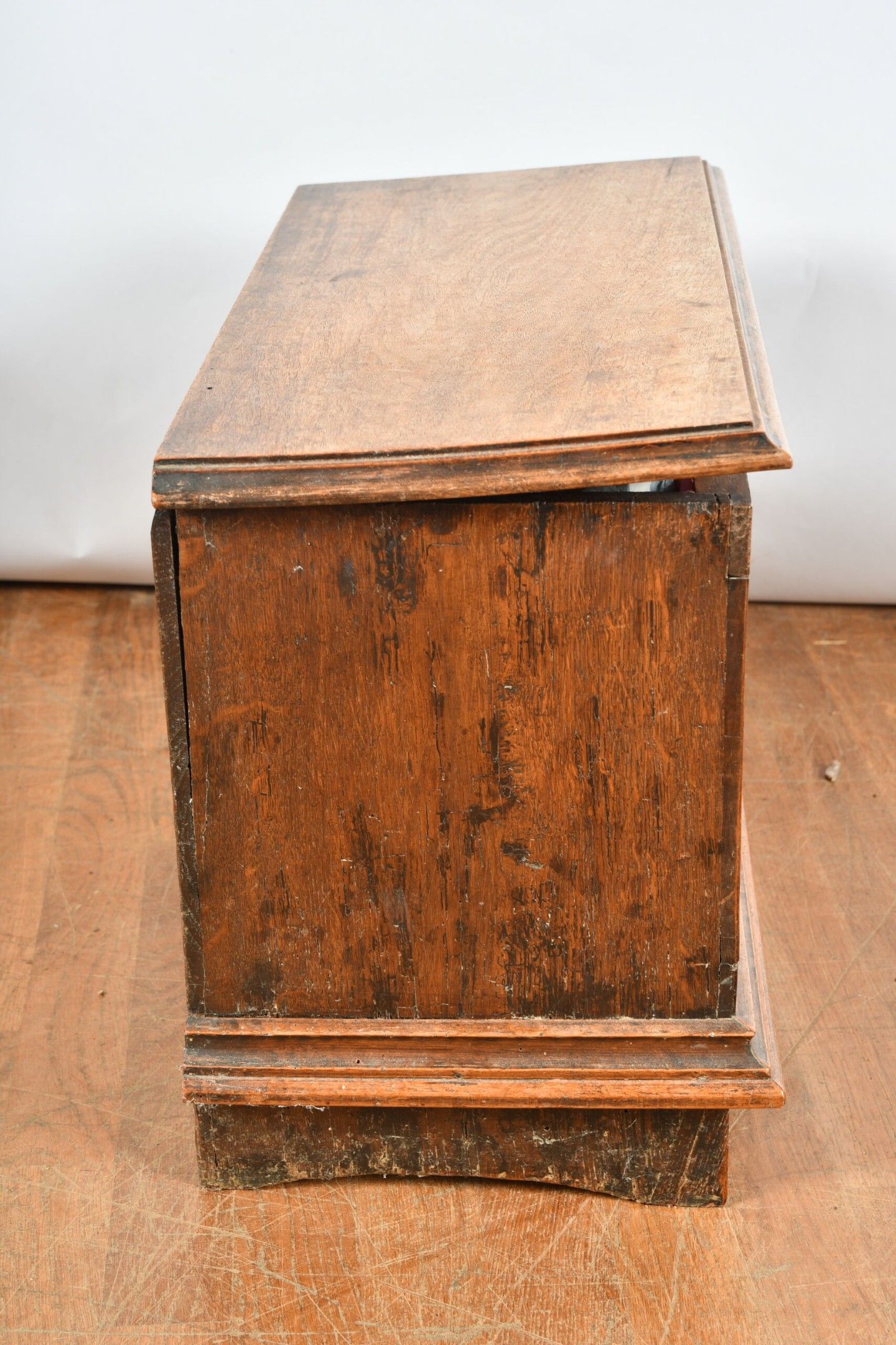 Oak chest (small) with moulded top, the front carved with a medallion showing a man's profile in a foliage frame and supported by two chimeras. 19th century. H. 42 - W. 62 - D. 29 cm Filled with antique white linen including long tea towels and sheets from the 19th century.