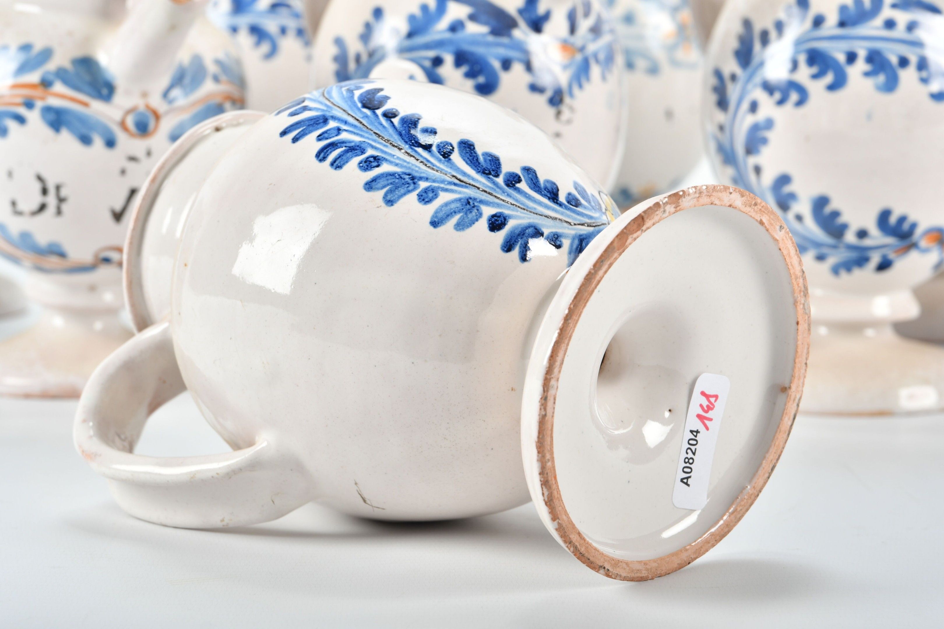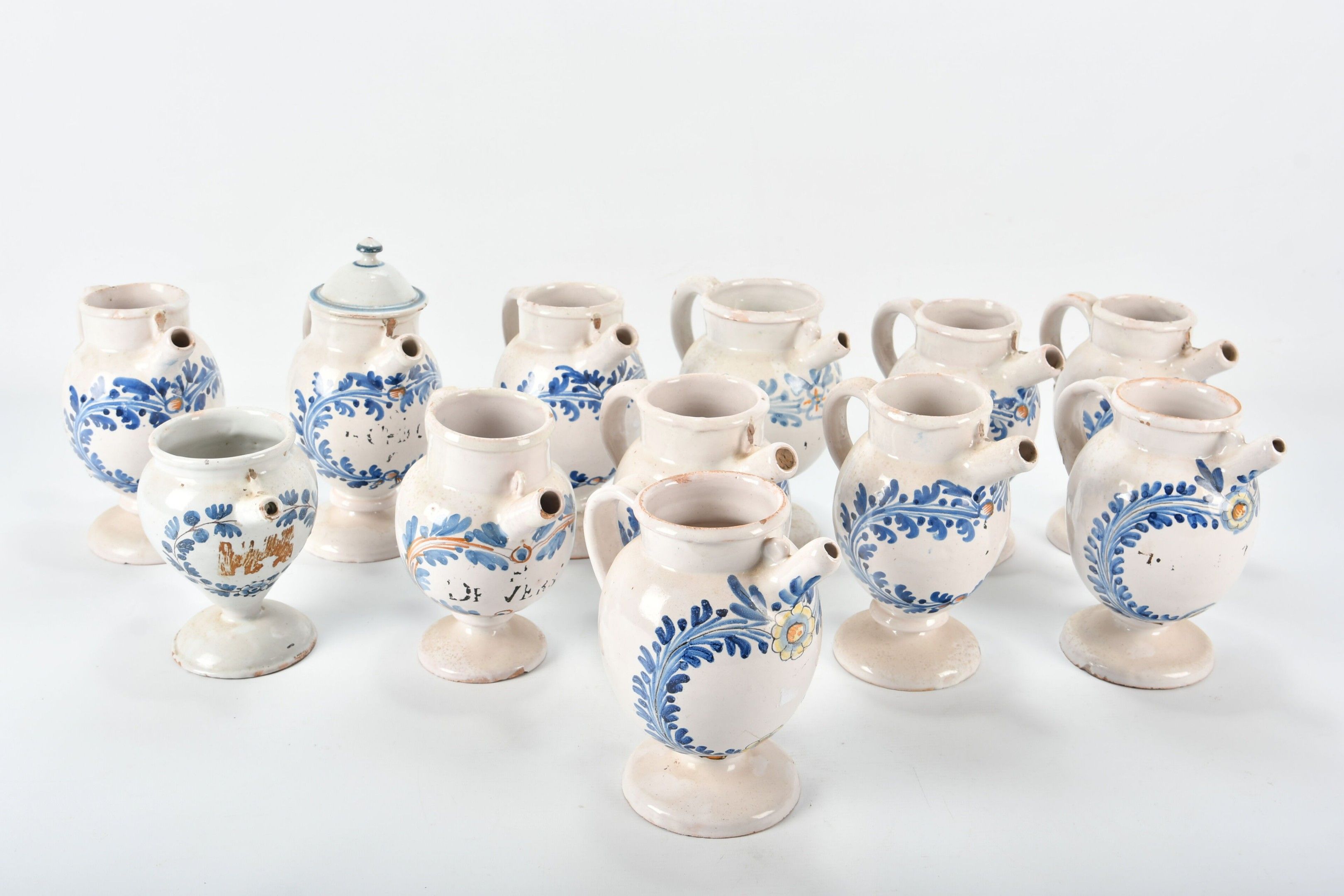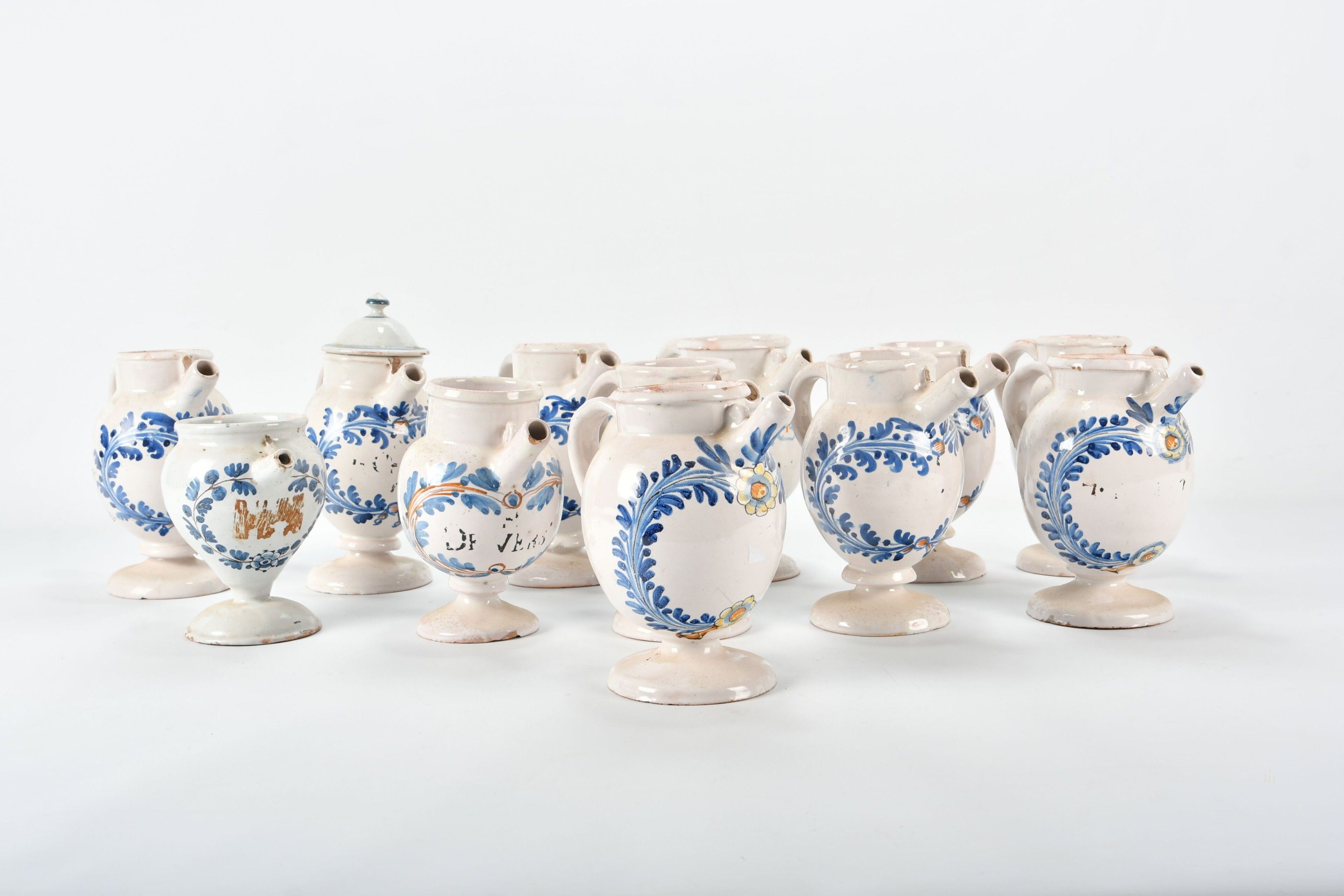 NEVERS 18th century. Set of twelve earthenware CHEVRETTES decorated in blue and ochre with a medallion of foliage and flowers. They stand on a circular base forming a ringed pedestal. Height from 16 to 20 cm. Small glaze chips and minor accidents. Traces of inscriptions