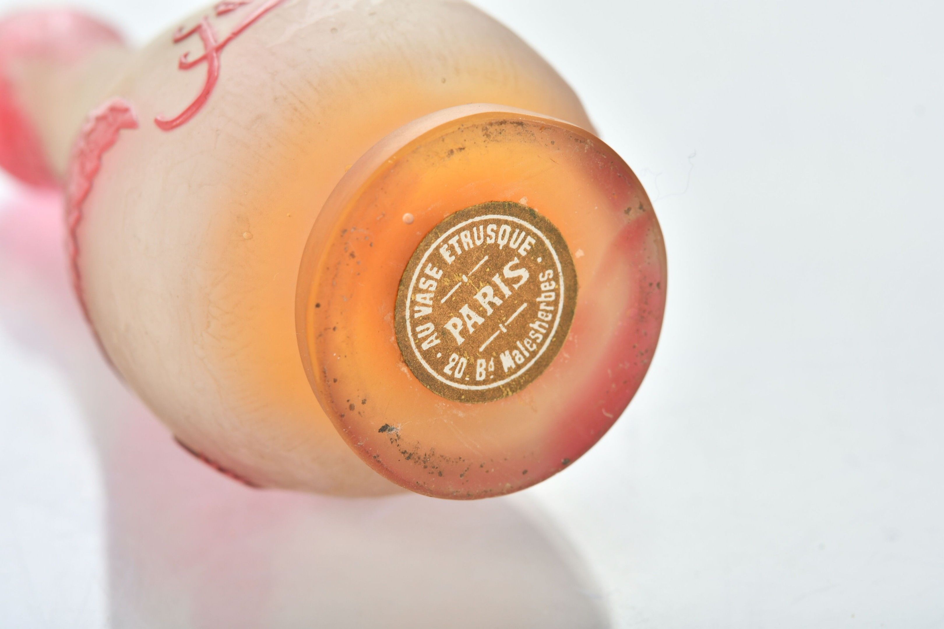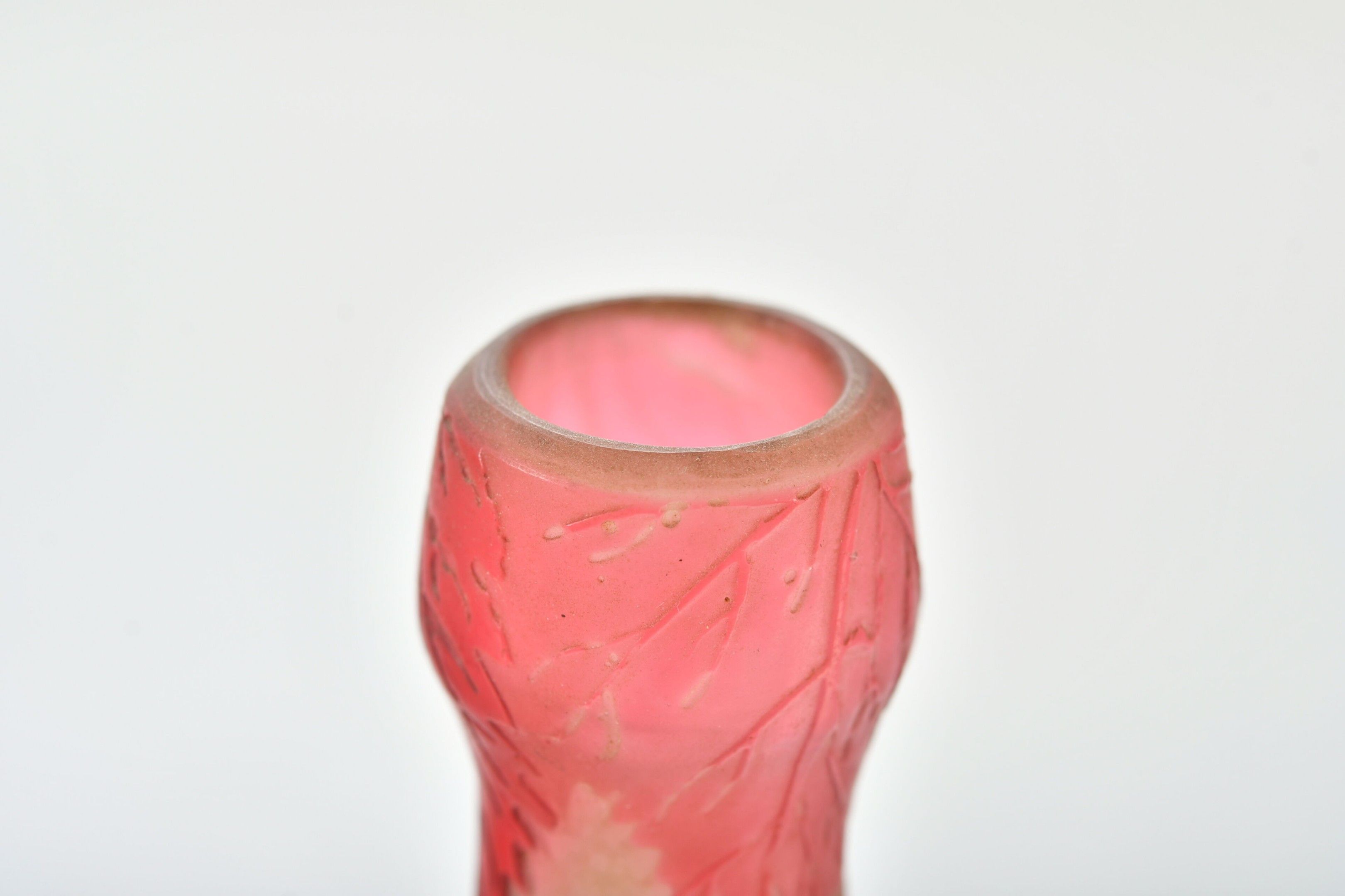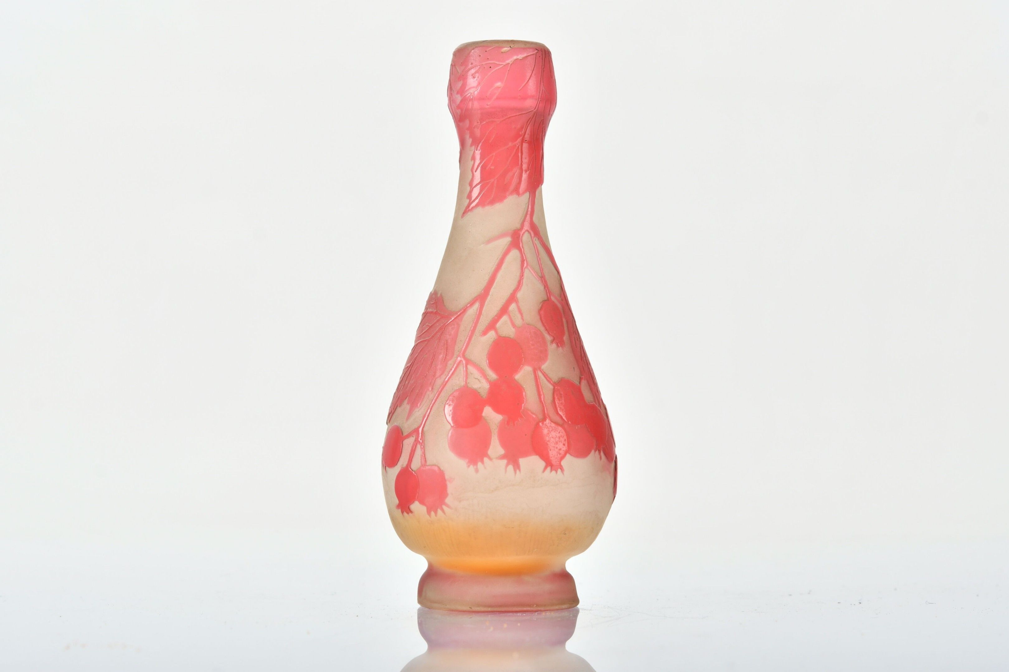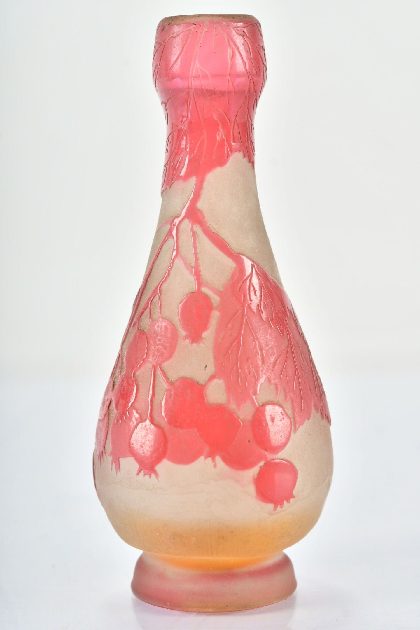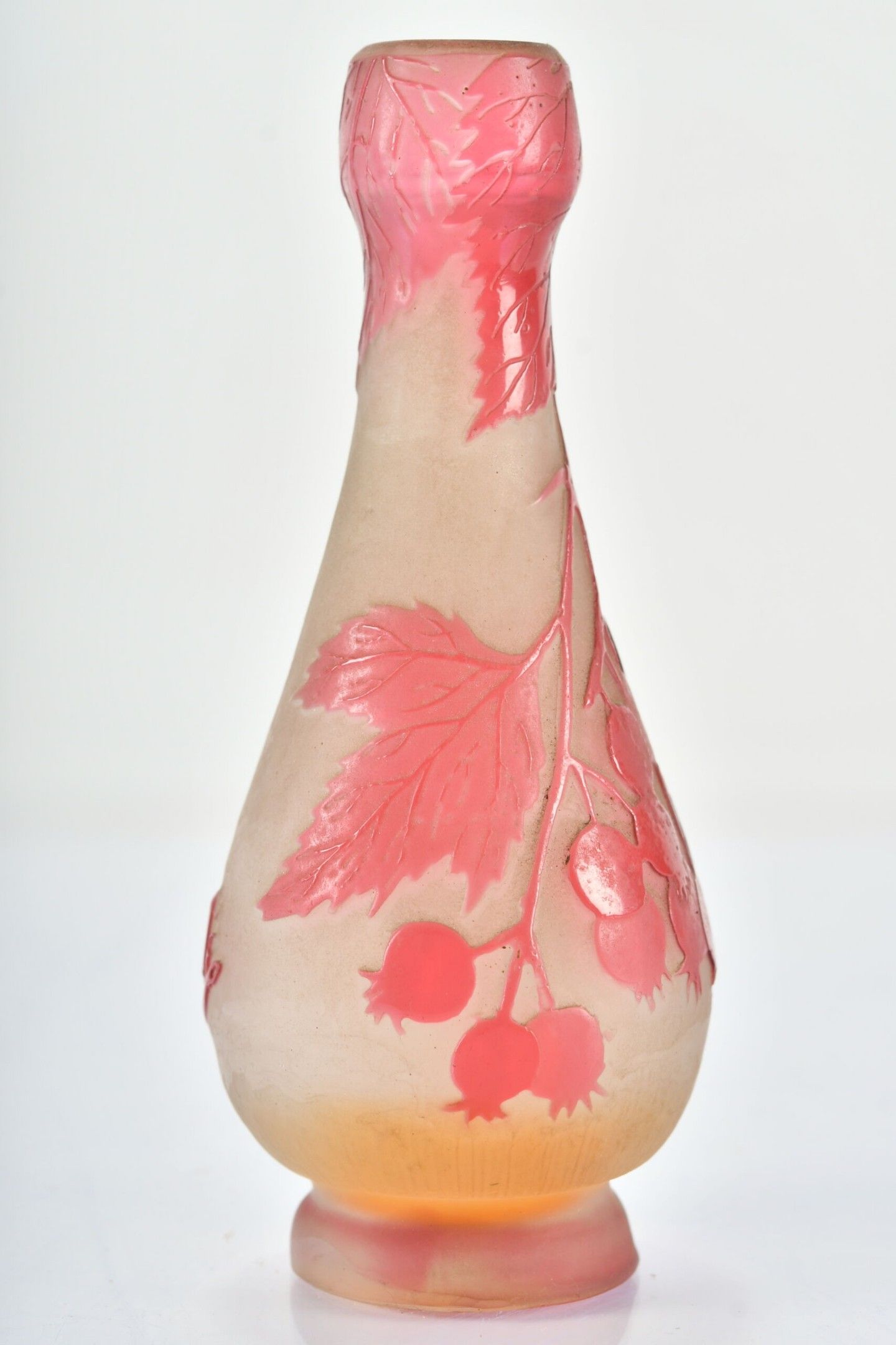 GALLE. A small acid-etched glass soliflore vase decorated with branches and hawthorn berries in pink on a colourless ground. Height 12.7 cm. Retailer's label "Au vase étrusque Paris" under the base.