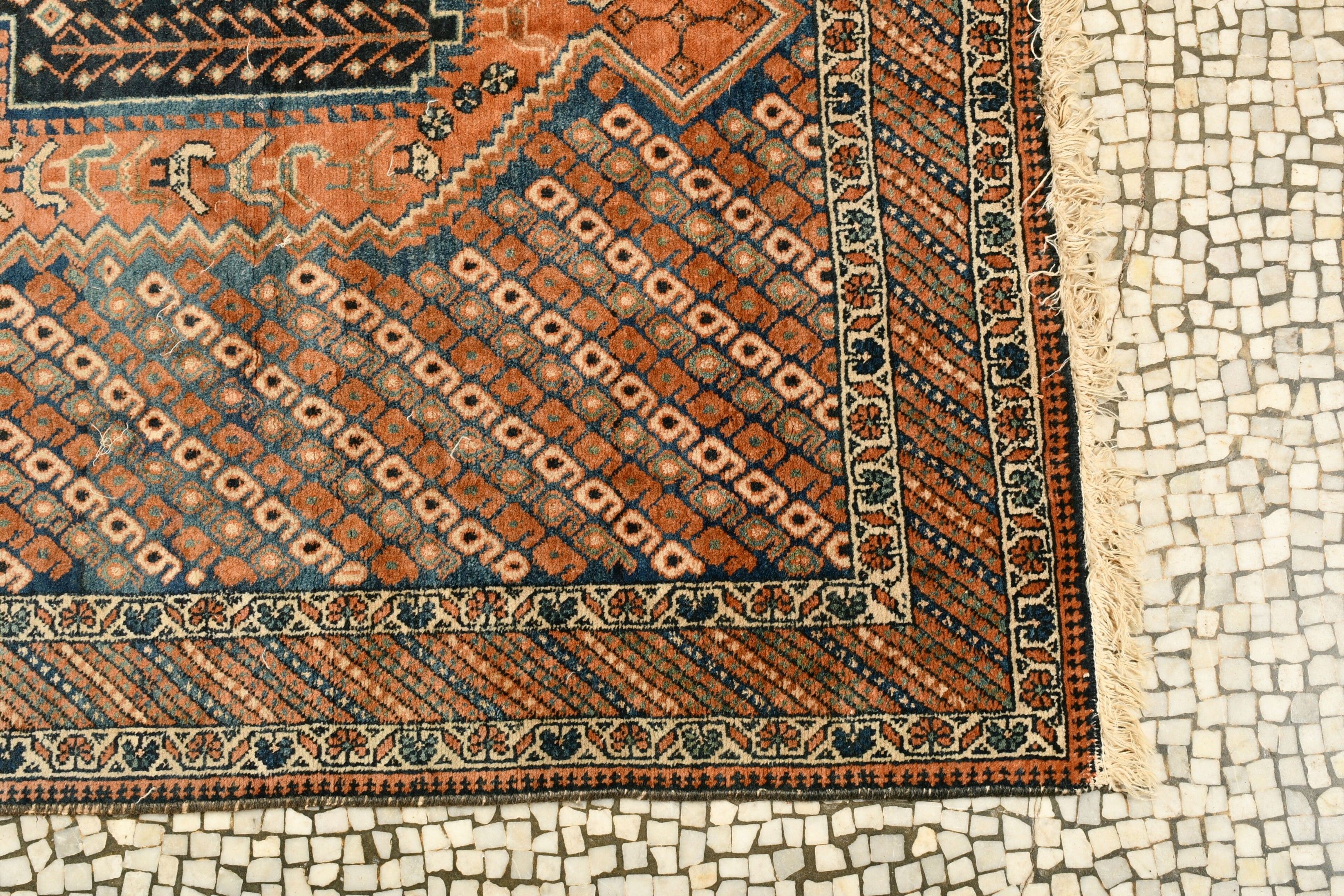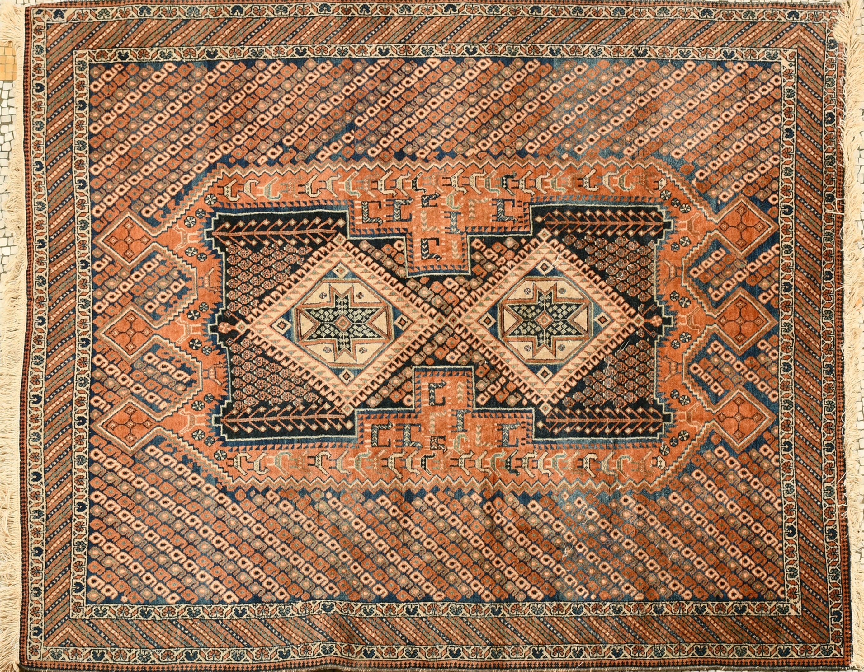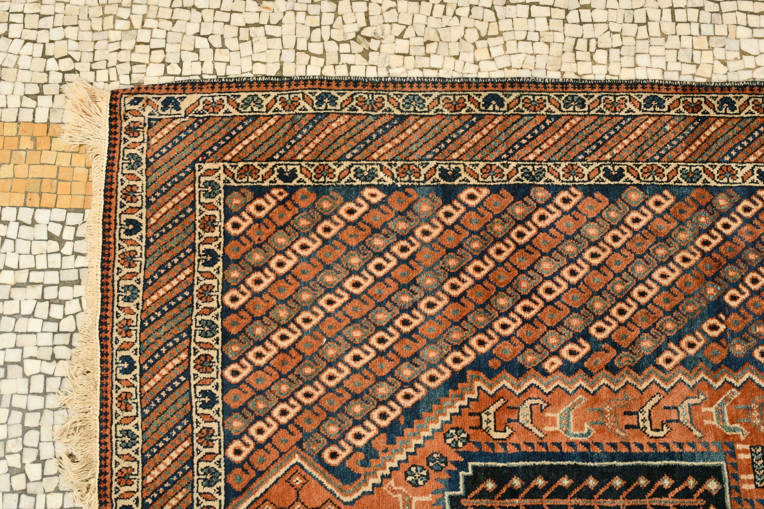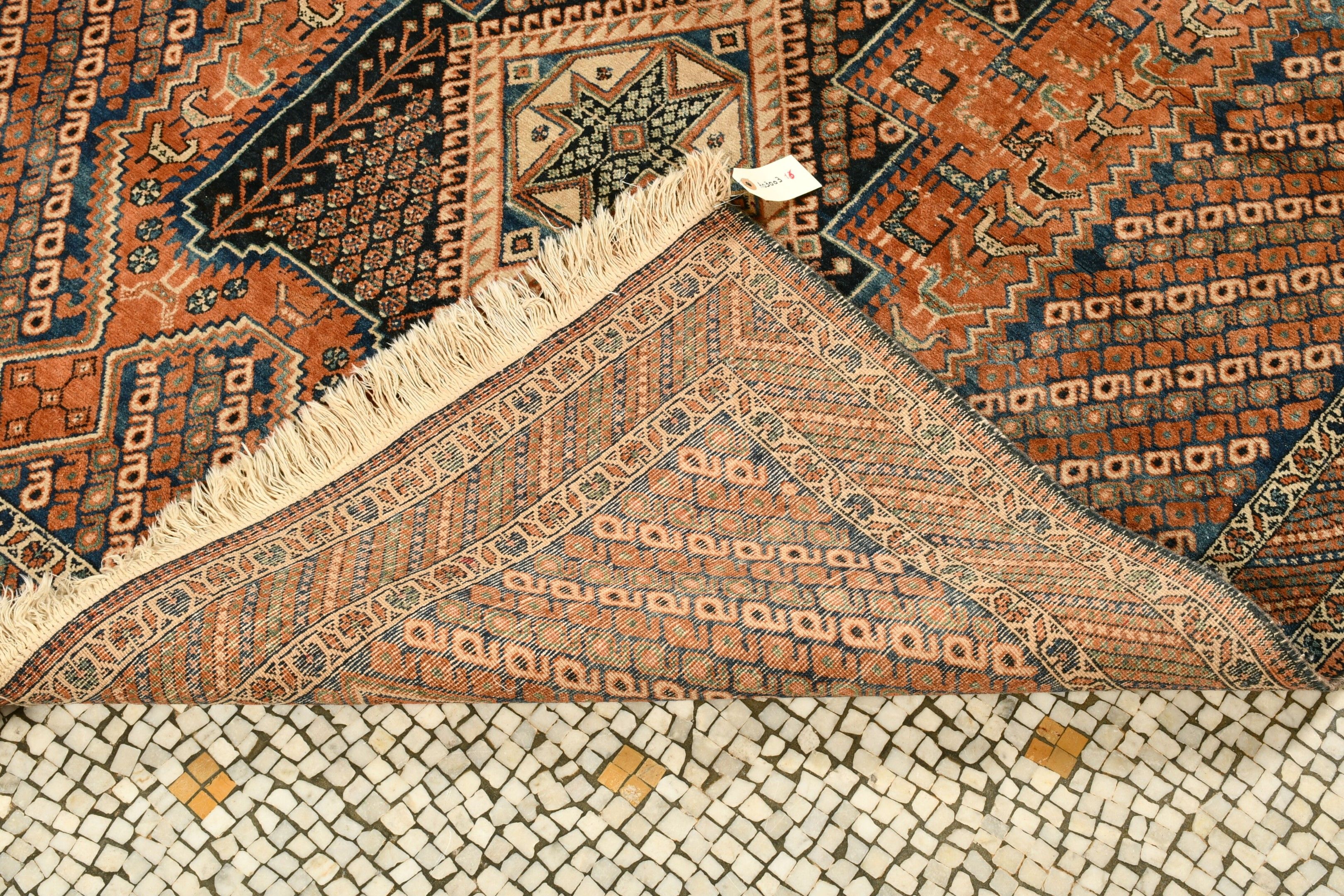 IRAN. Wool carpet with blue background. Geometric decoration in orange tones. 172 x 134 cm.