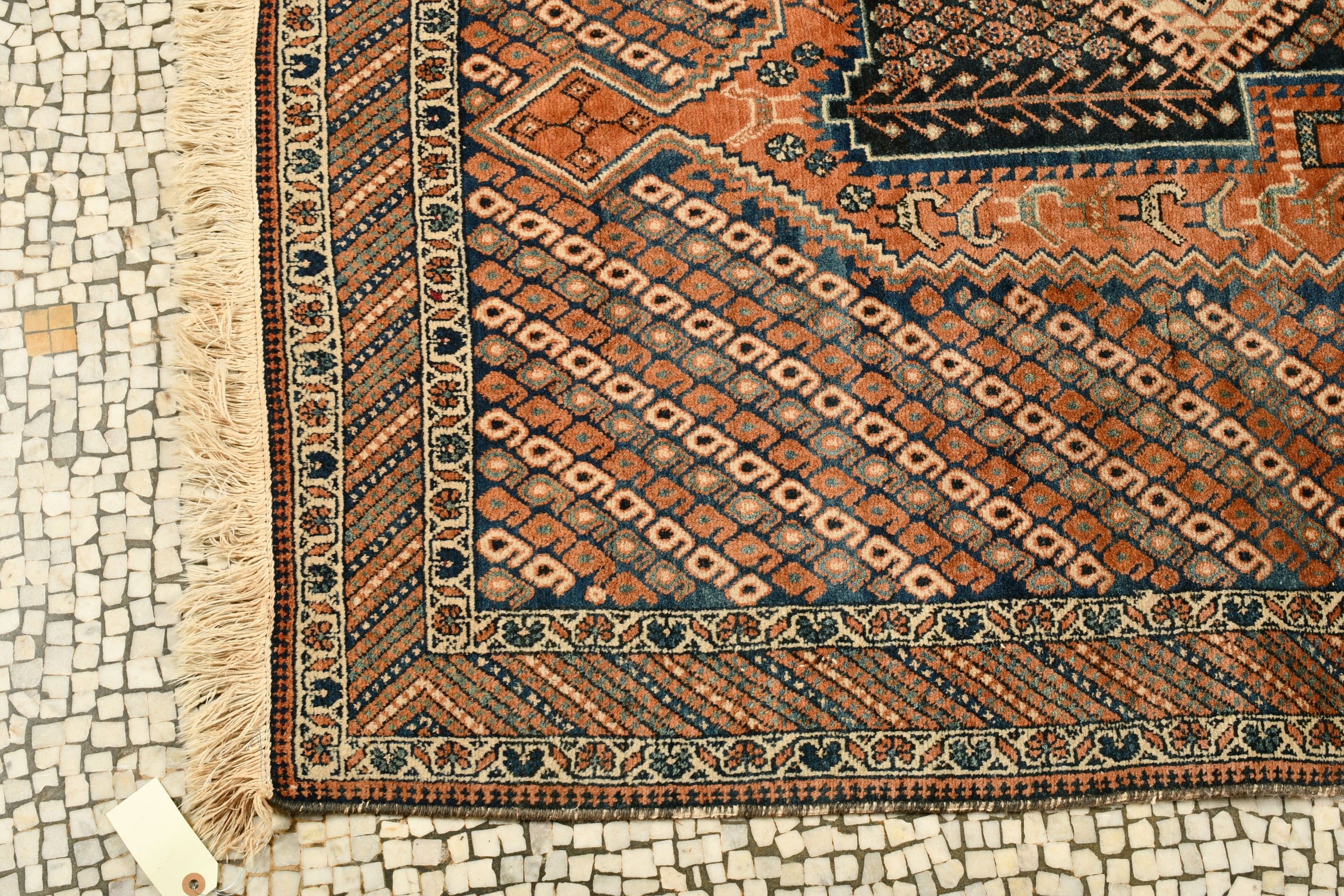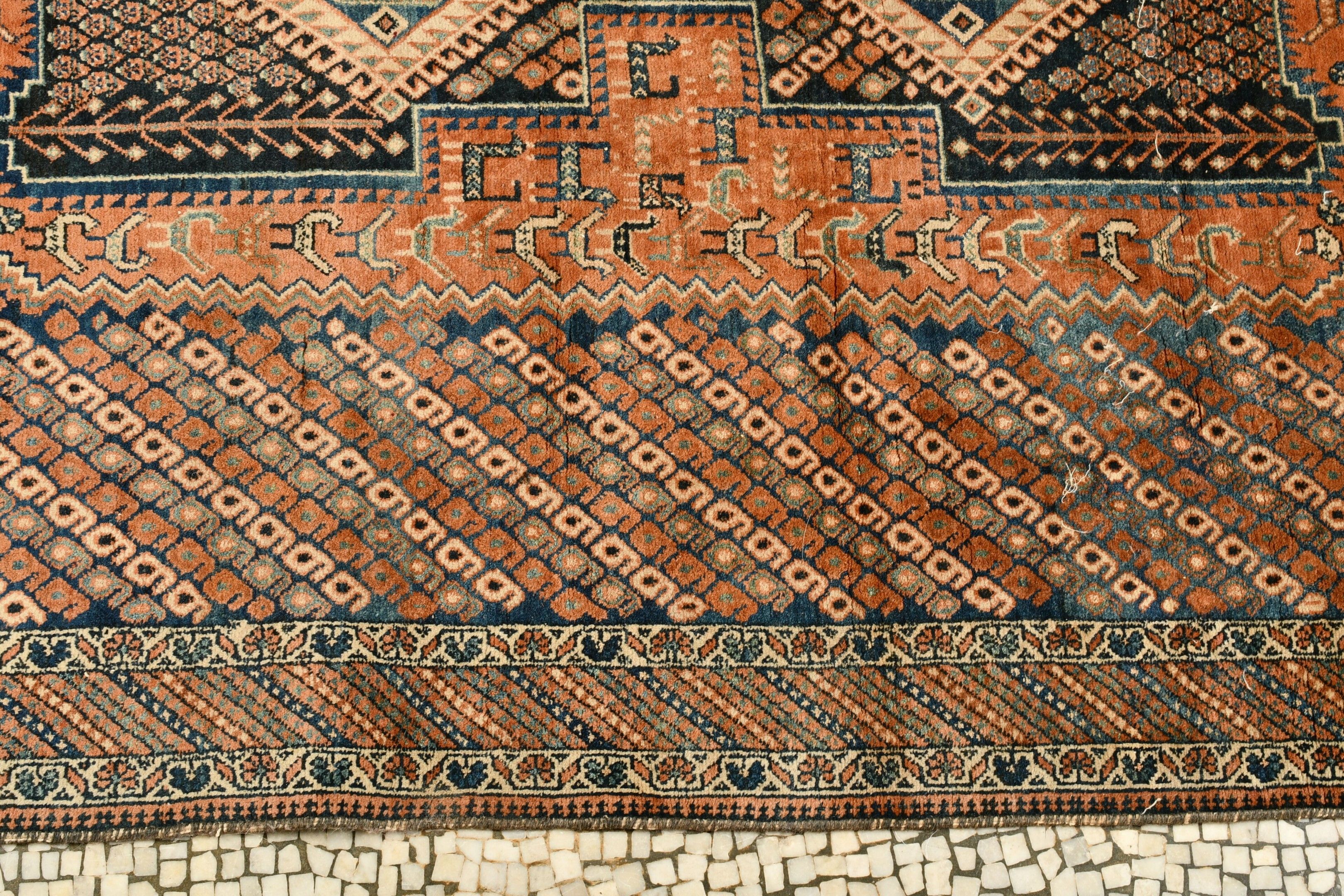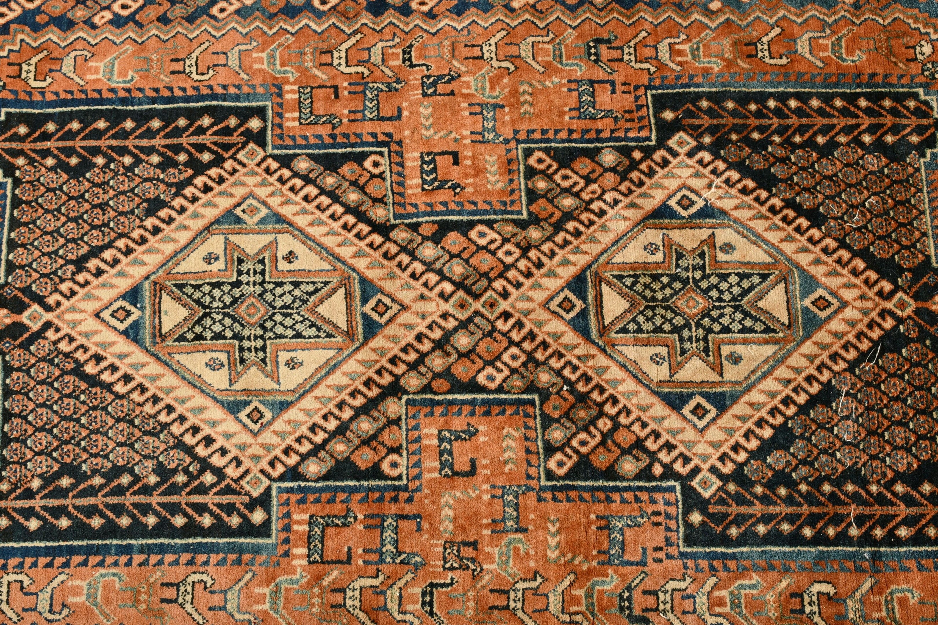 IRAN. Wool carpet with blue background. Geometric decoration in orange tones. 172 x 134 cm.