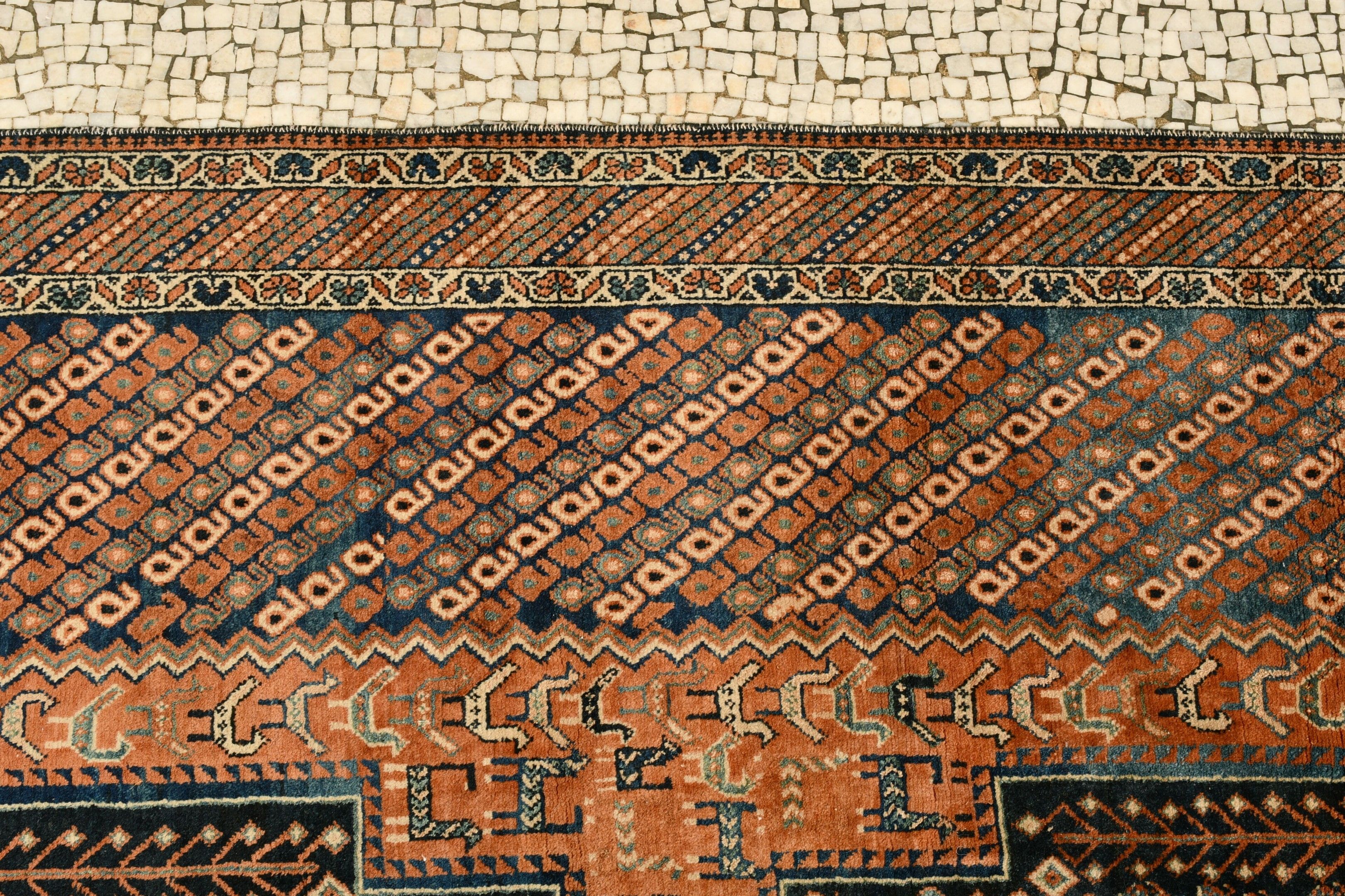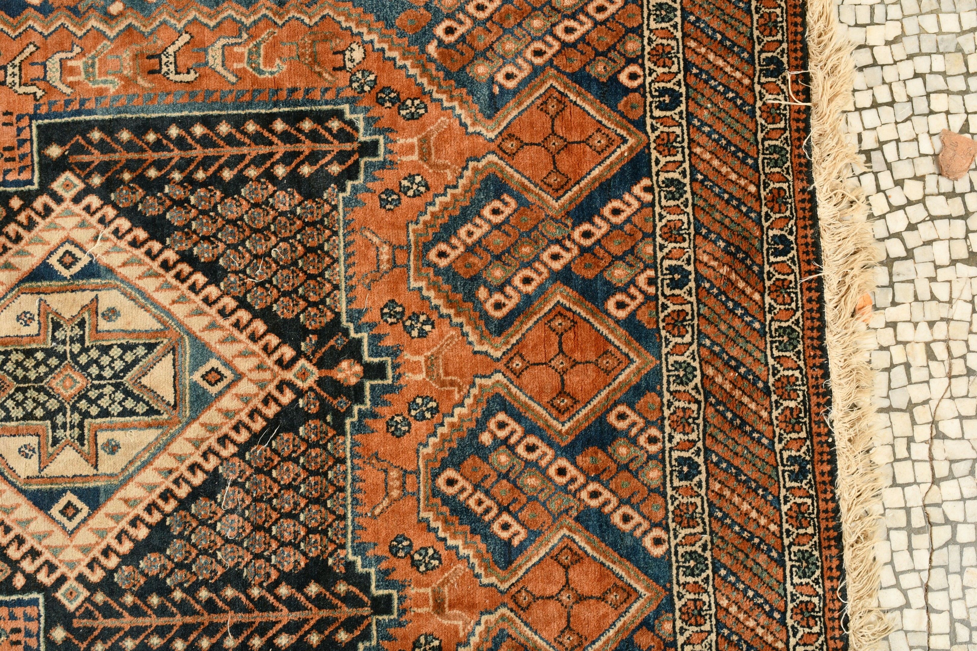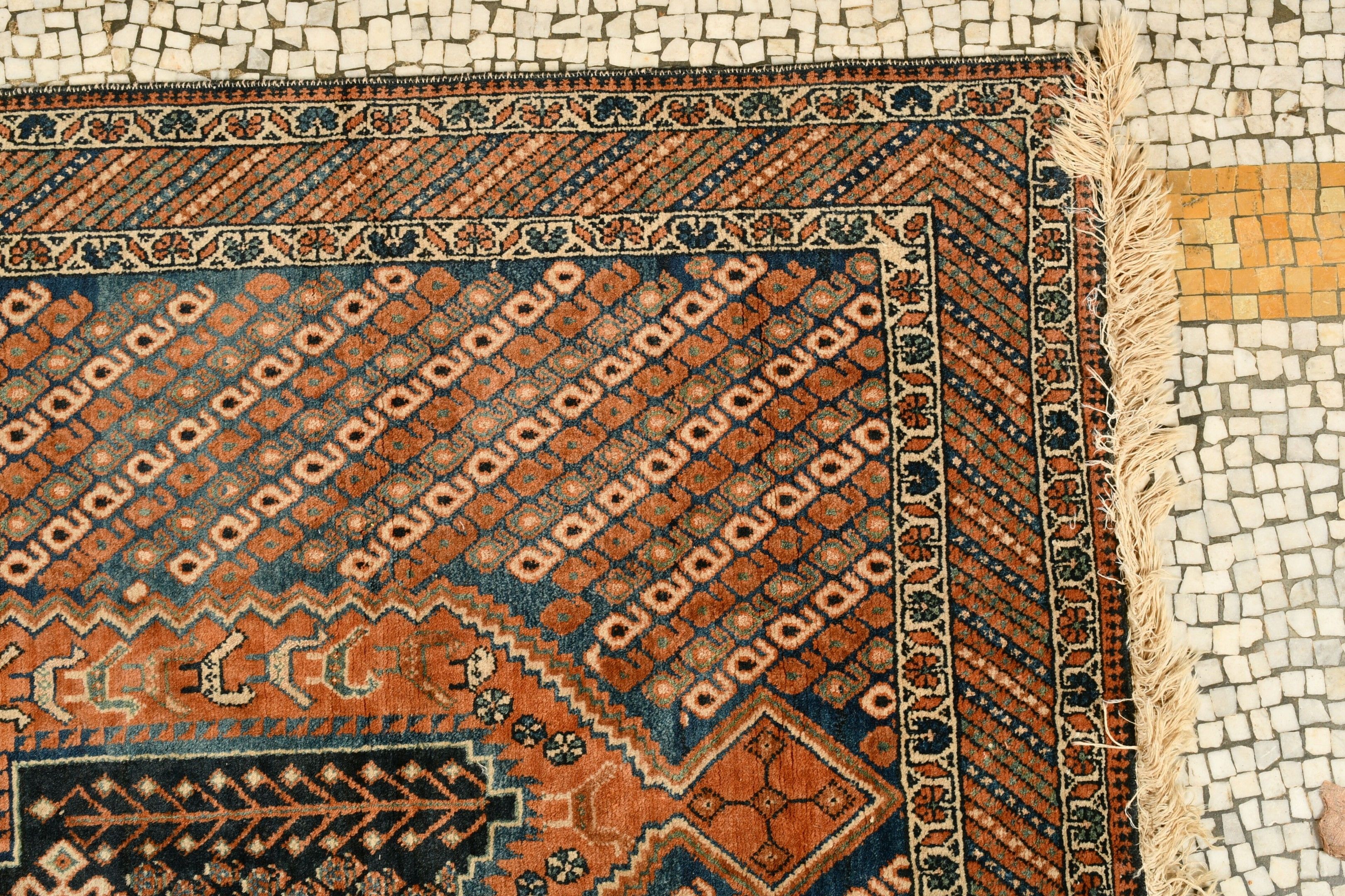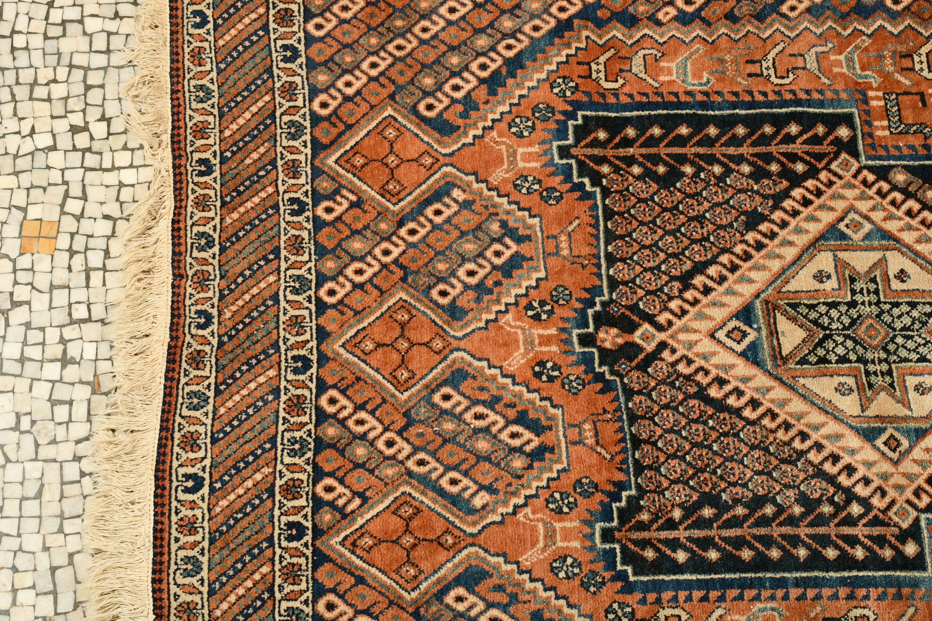 IRAN. Wool carpet with blue background. Geometric decoration in orange tones. 172 x 134 cm.