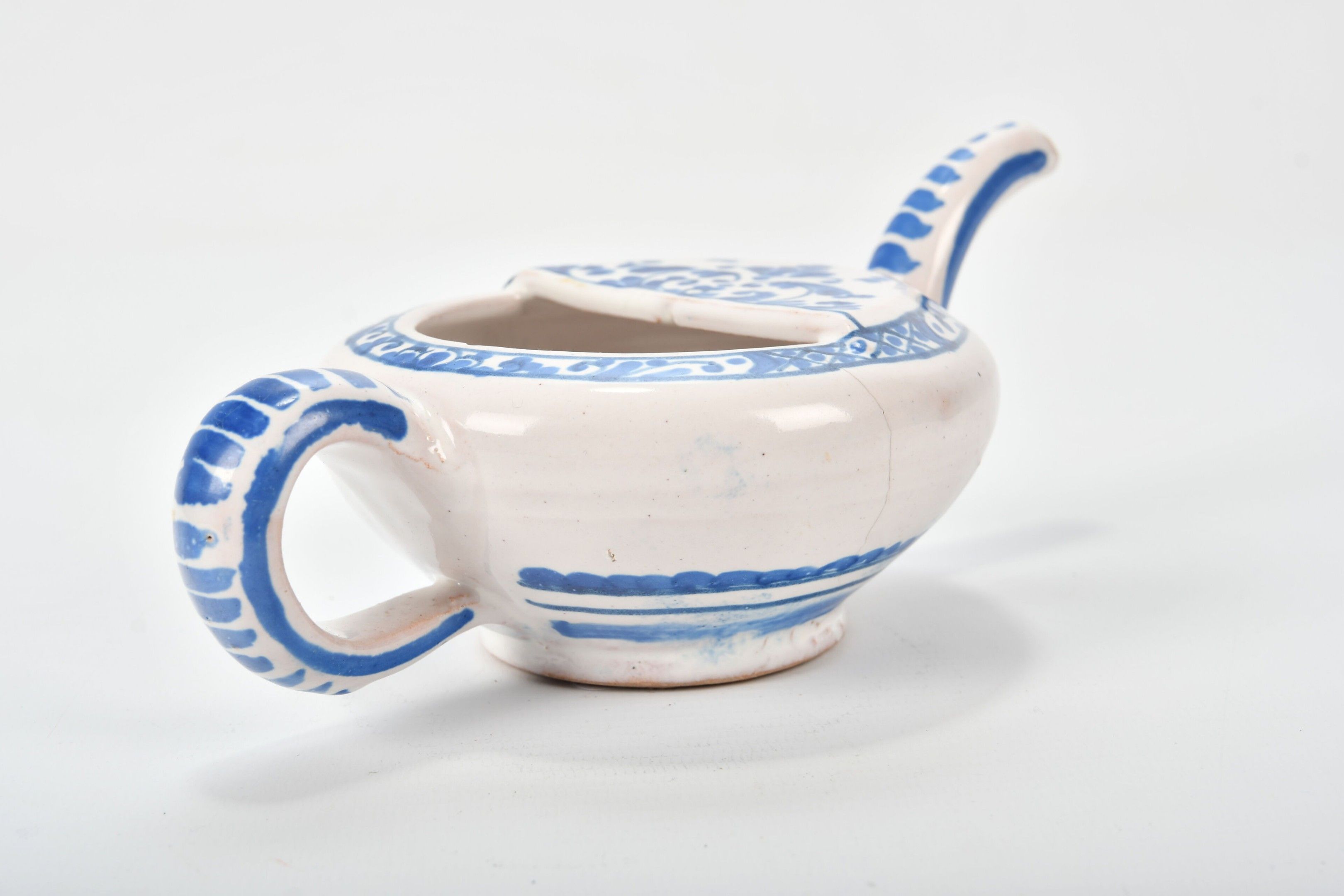 SICK BIBERON in earthenware with blue monochrome decoration of foliage. 18th century period. H. 7.5 - W. 19.5 cm. Minor chips and small cracks.