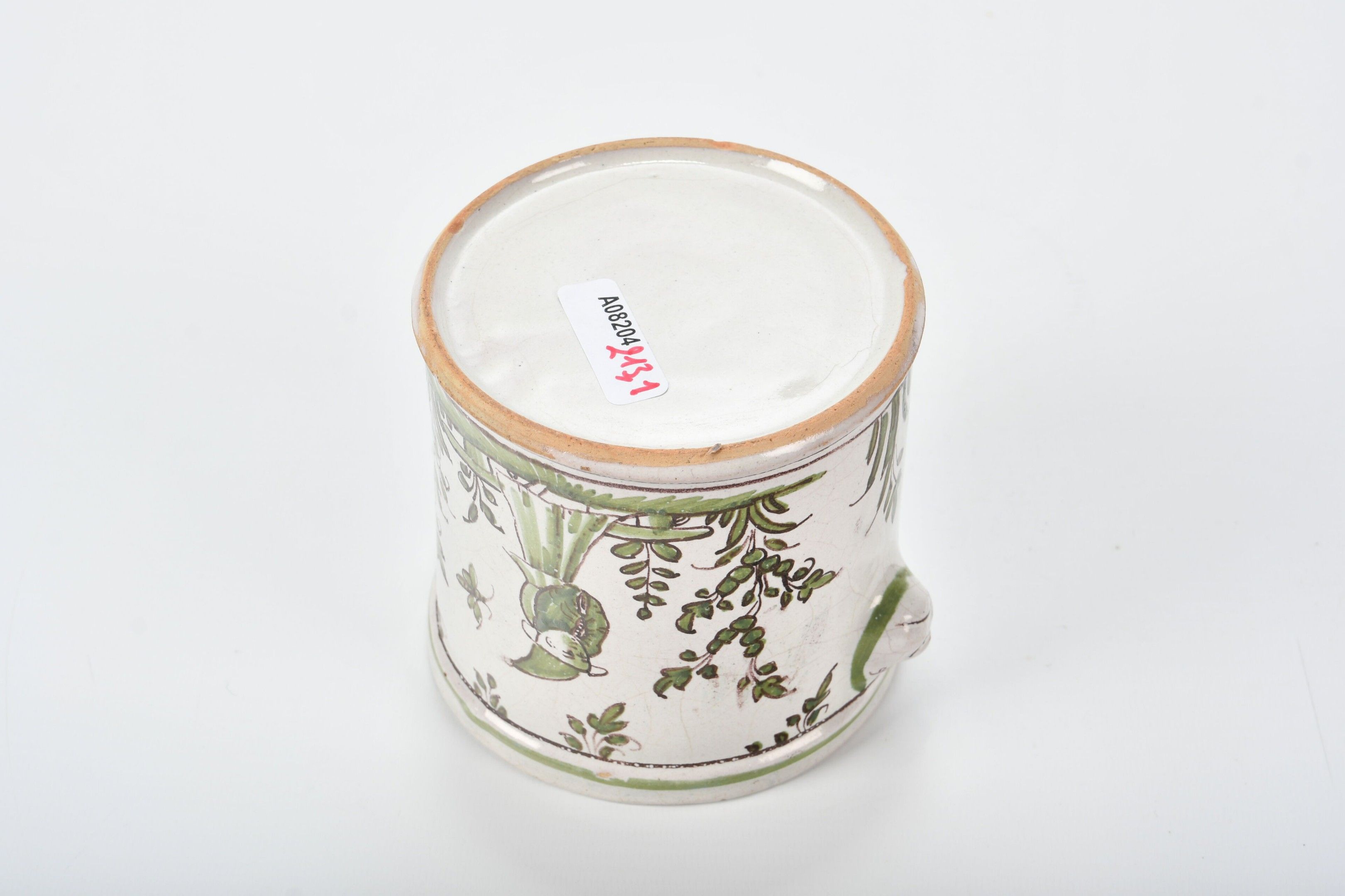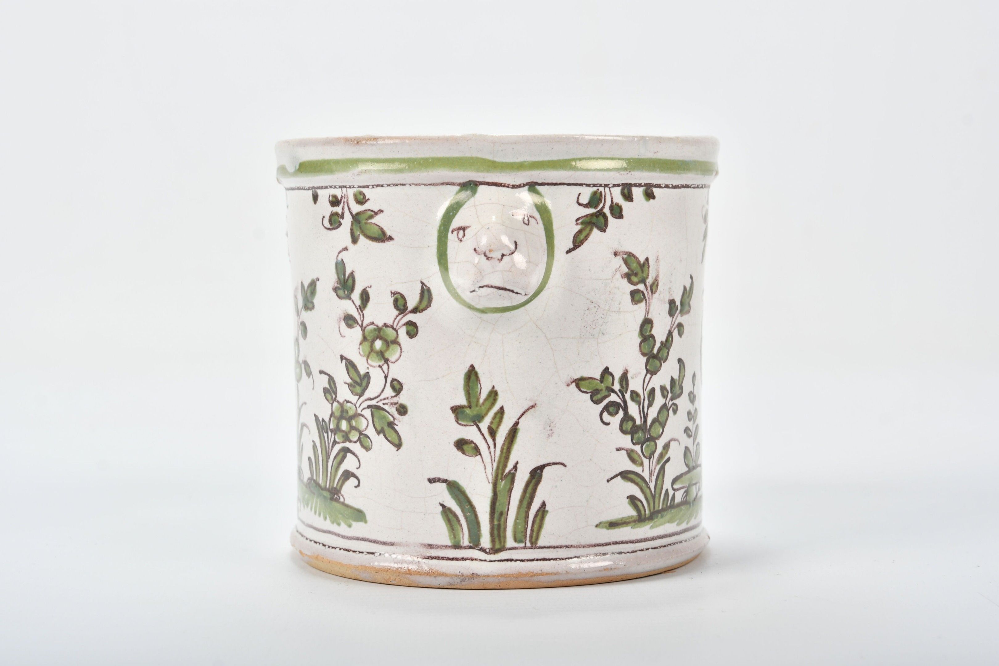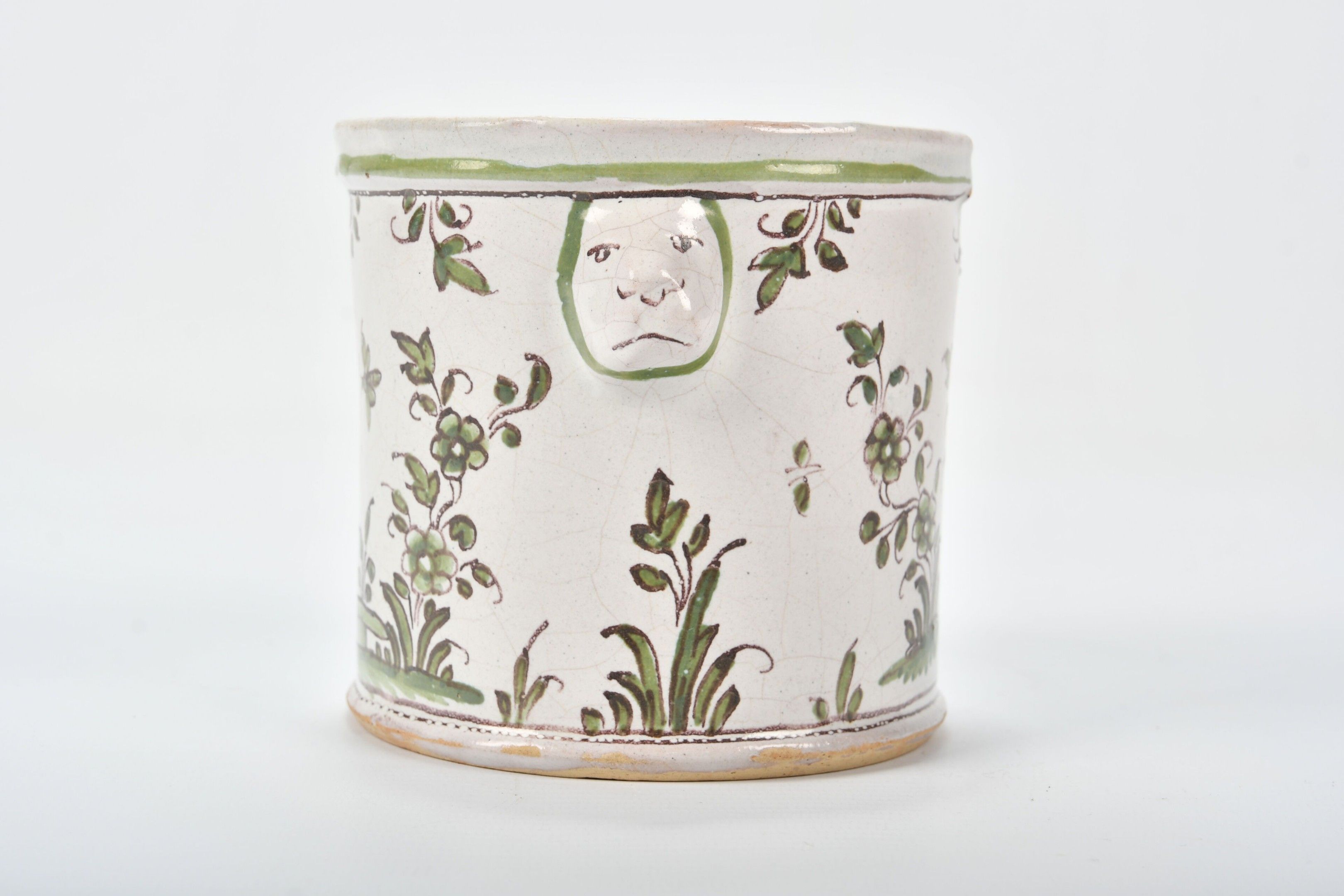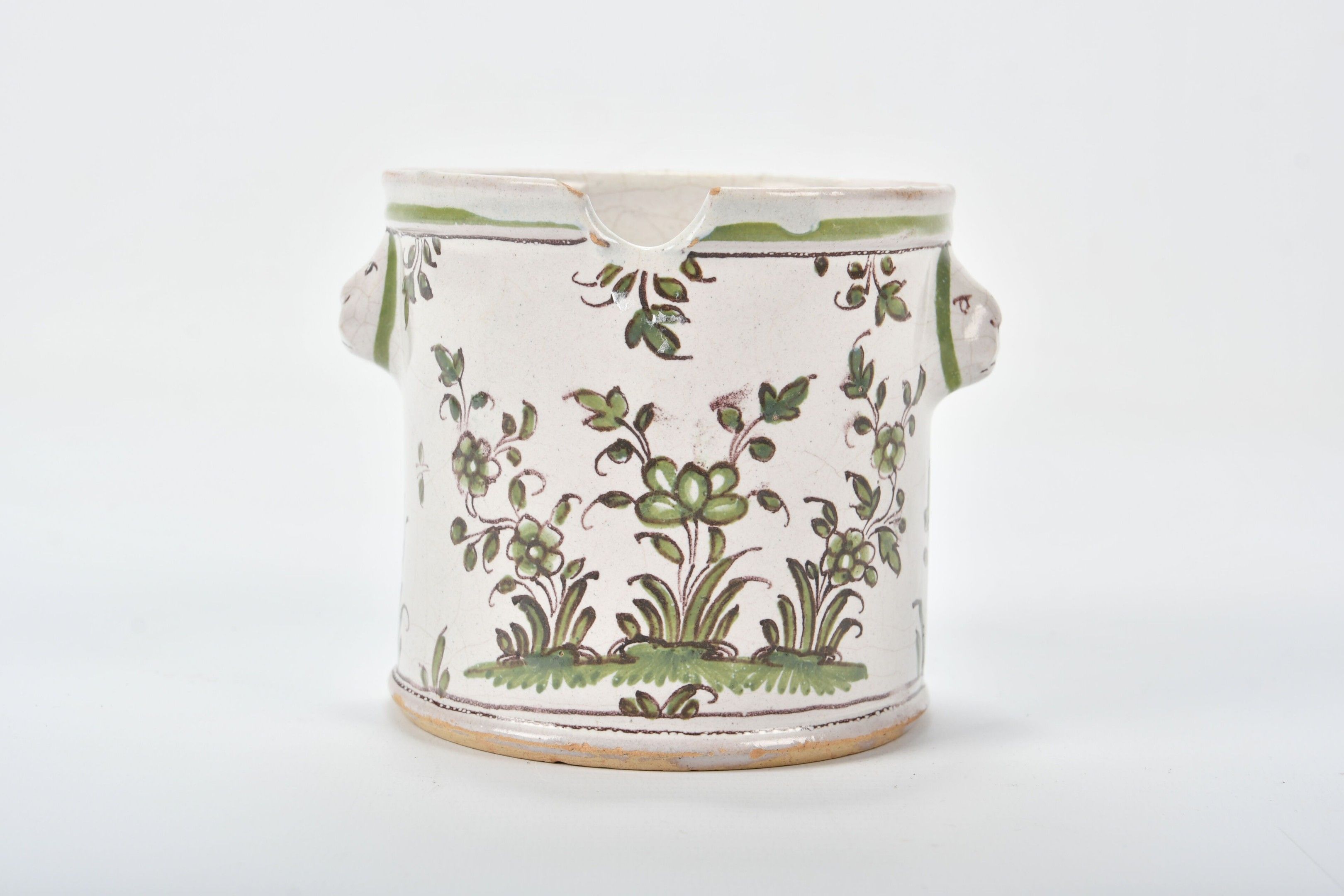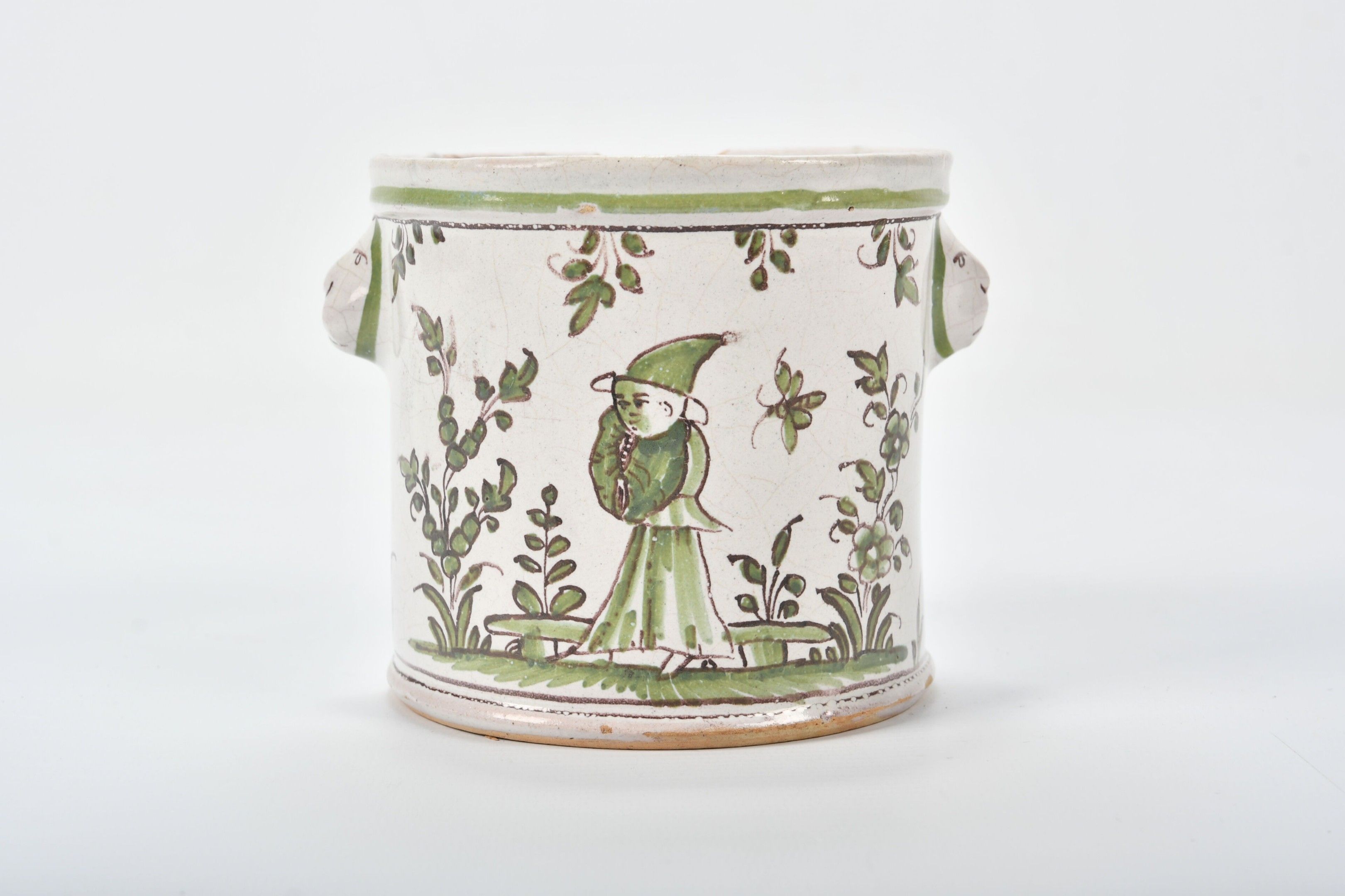 MOUSTIERS. An enamelled earthenware one-glass refreshment stand with a green decoration of Chinese figures, flowers and fillets. The handles are decorated with animal masks. 18th century period. H. 10.5 cm. Minor chips and enamel chips.