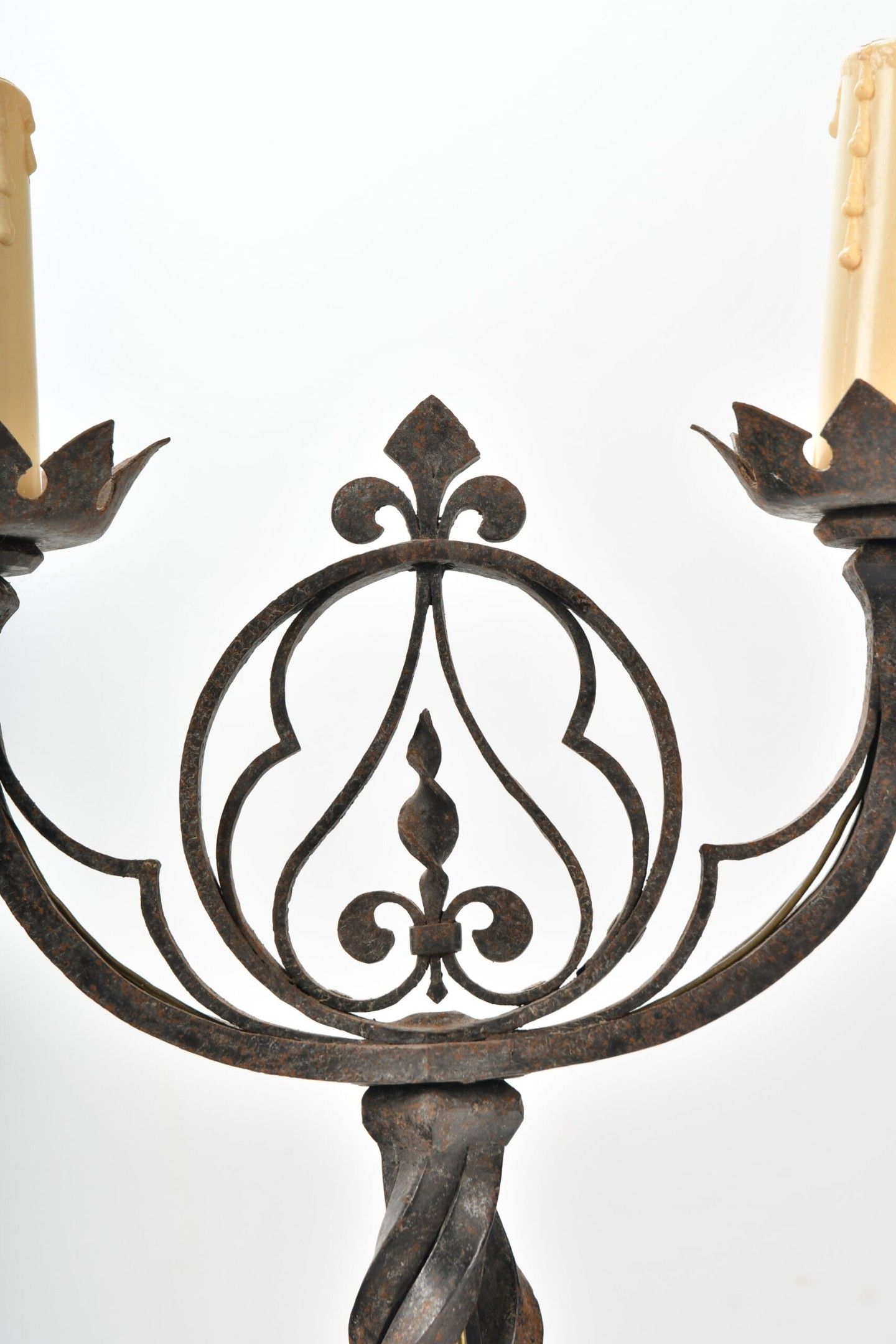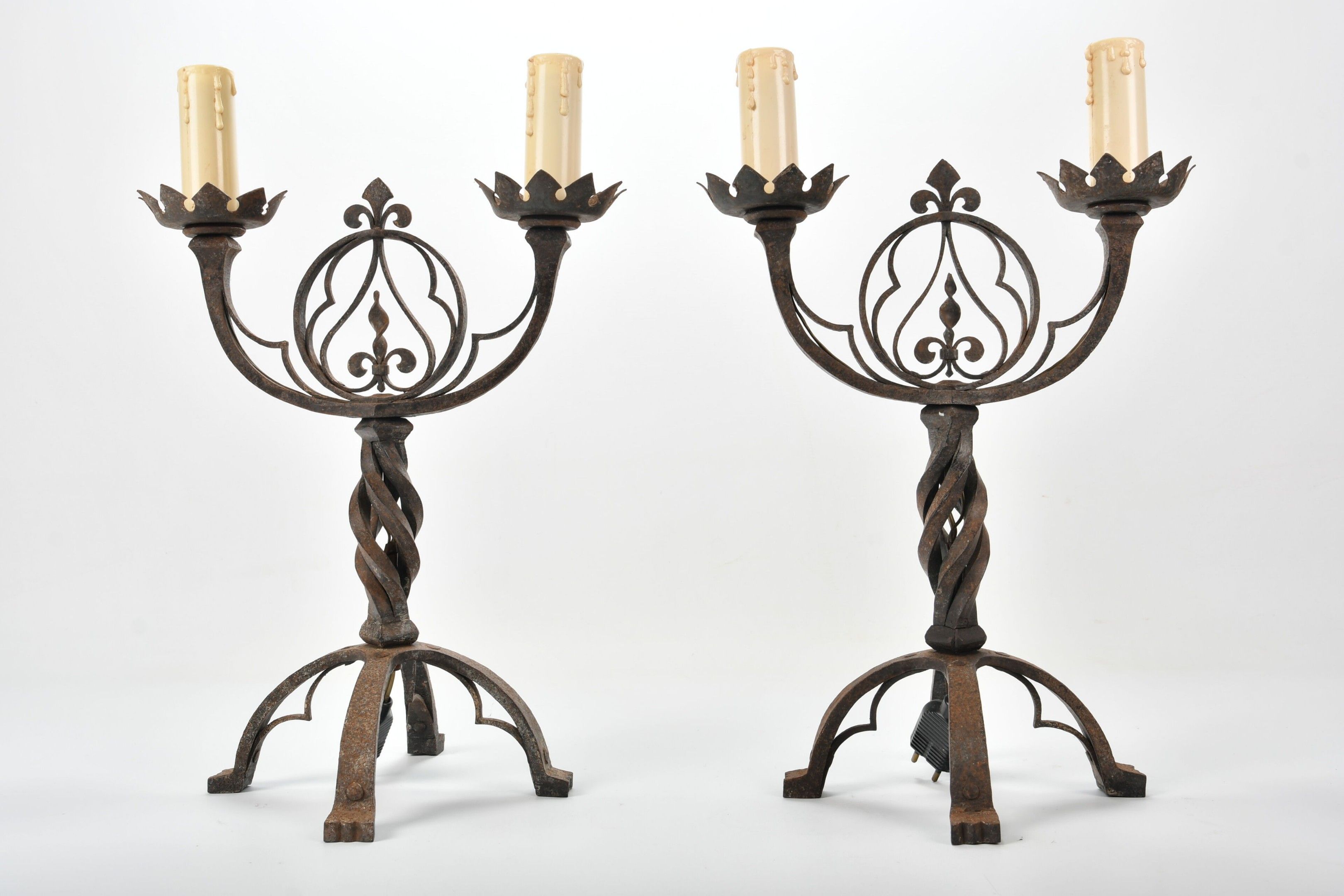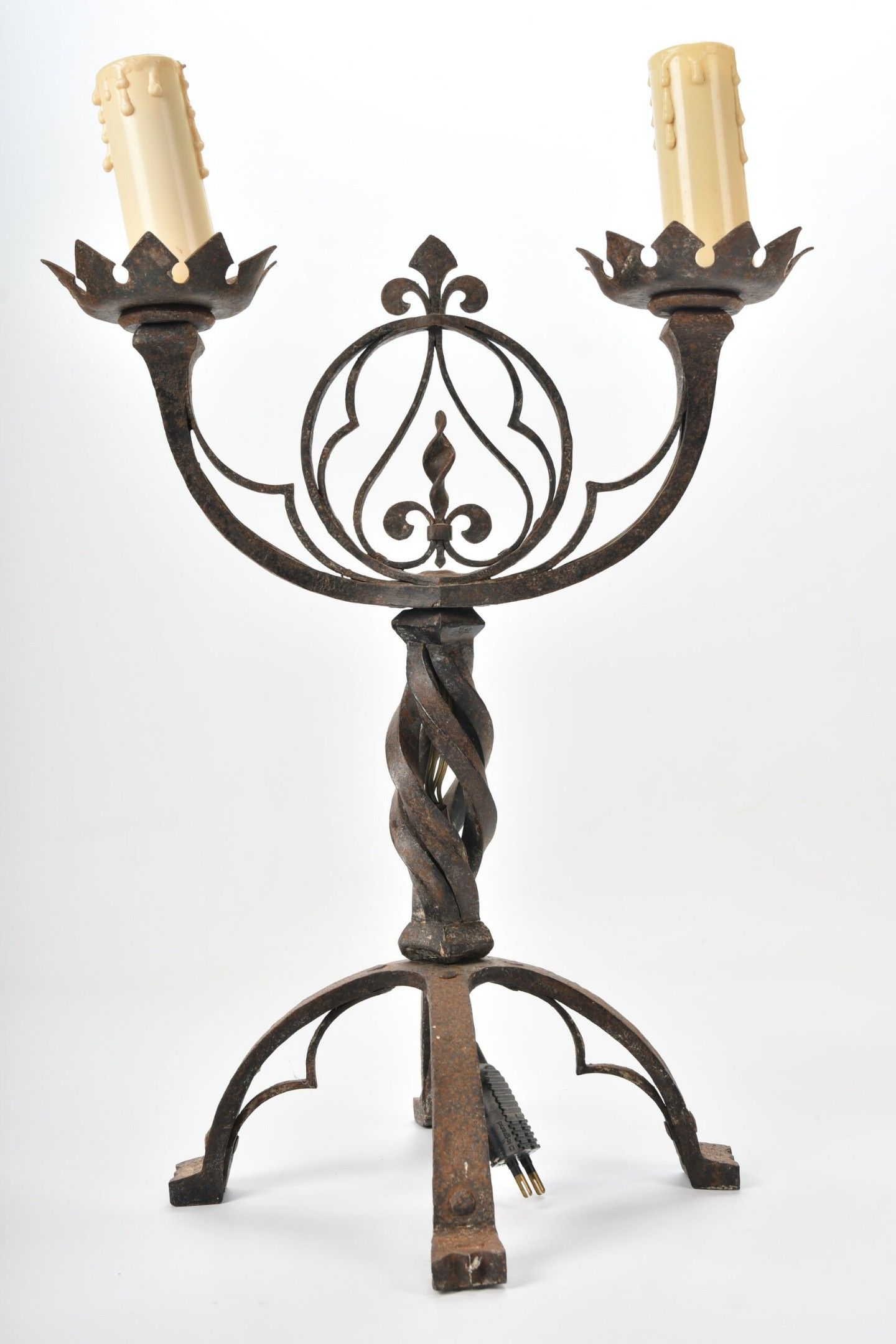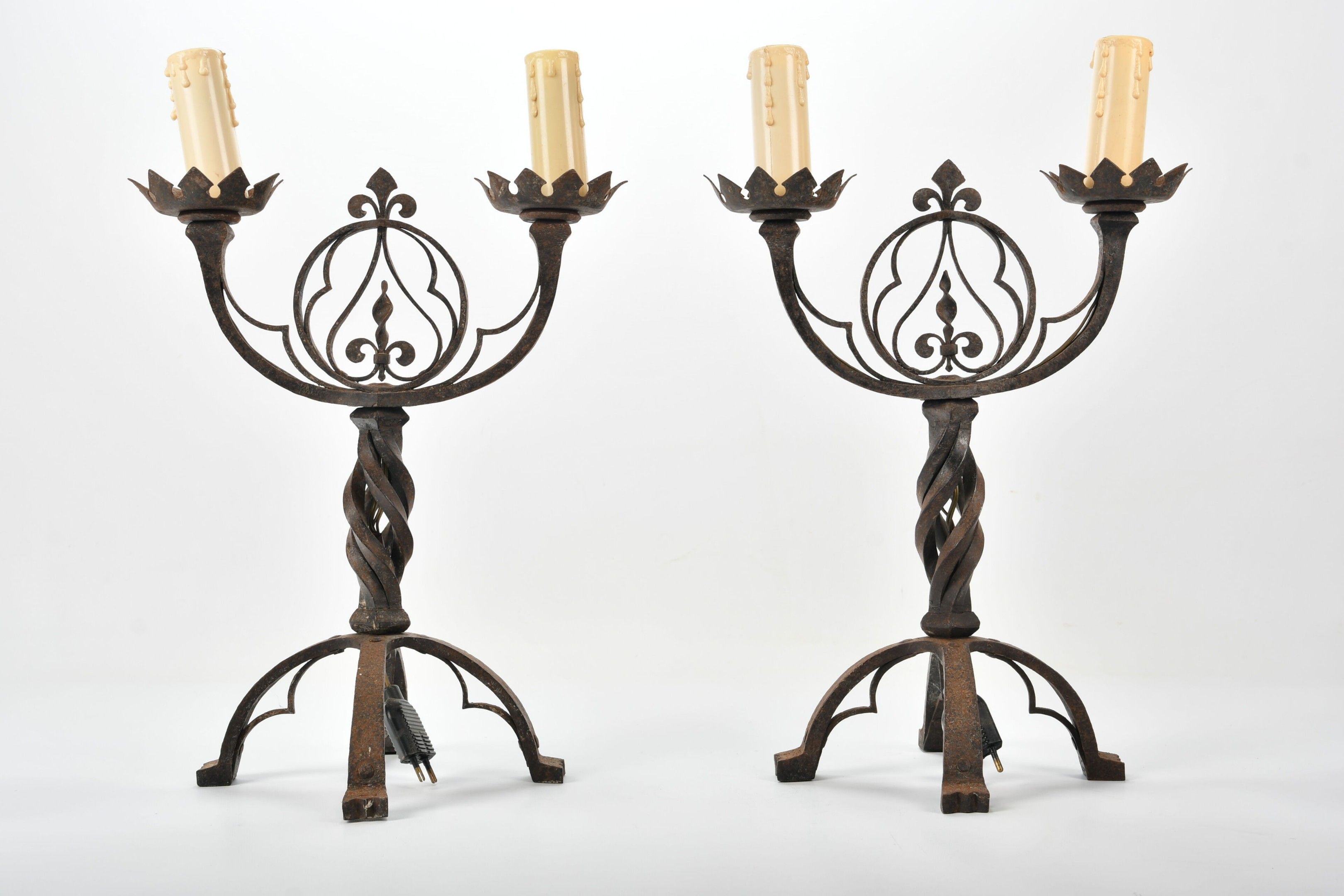 CANDELABRES (pair of) in wrought iron with two lights, twisted shaft and fleur-de-lys decoration in an openwork medallion. Base with stylised claw feet. Neo-Gothic style. Height 46.5 cm