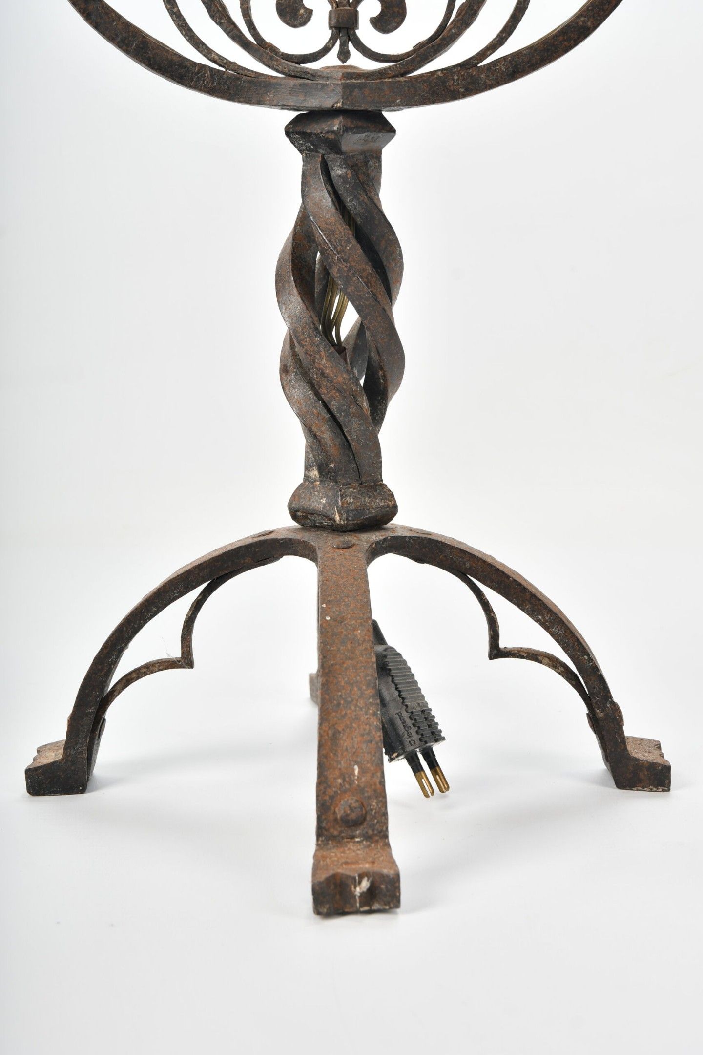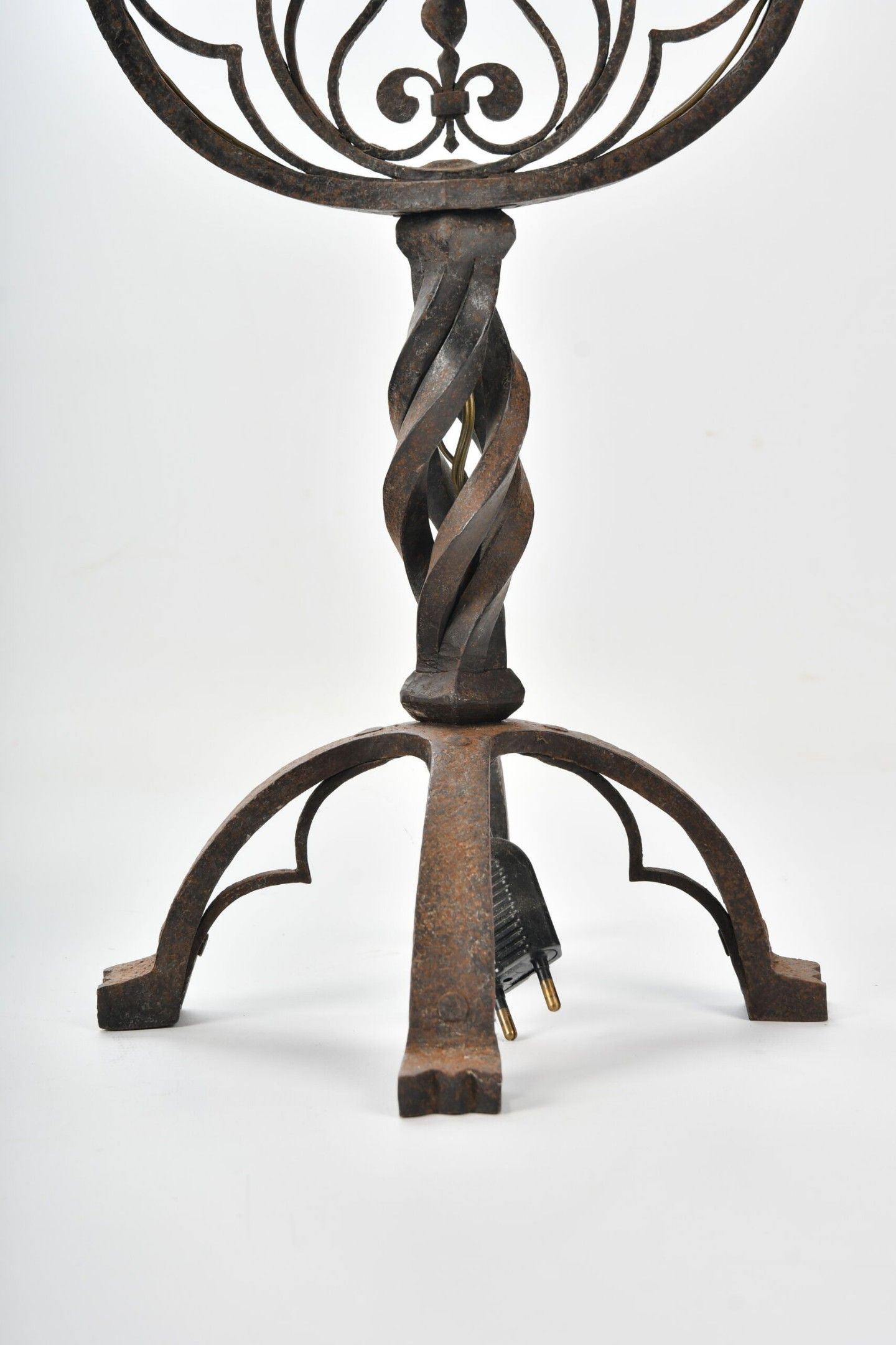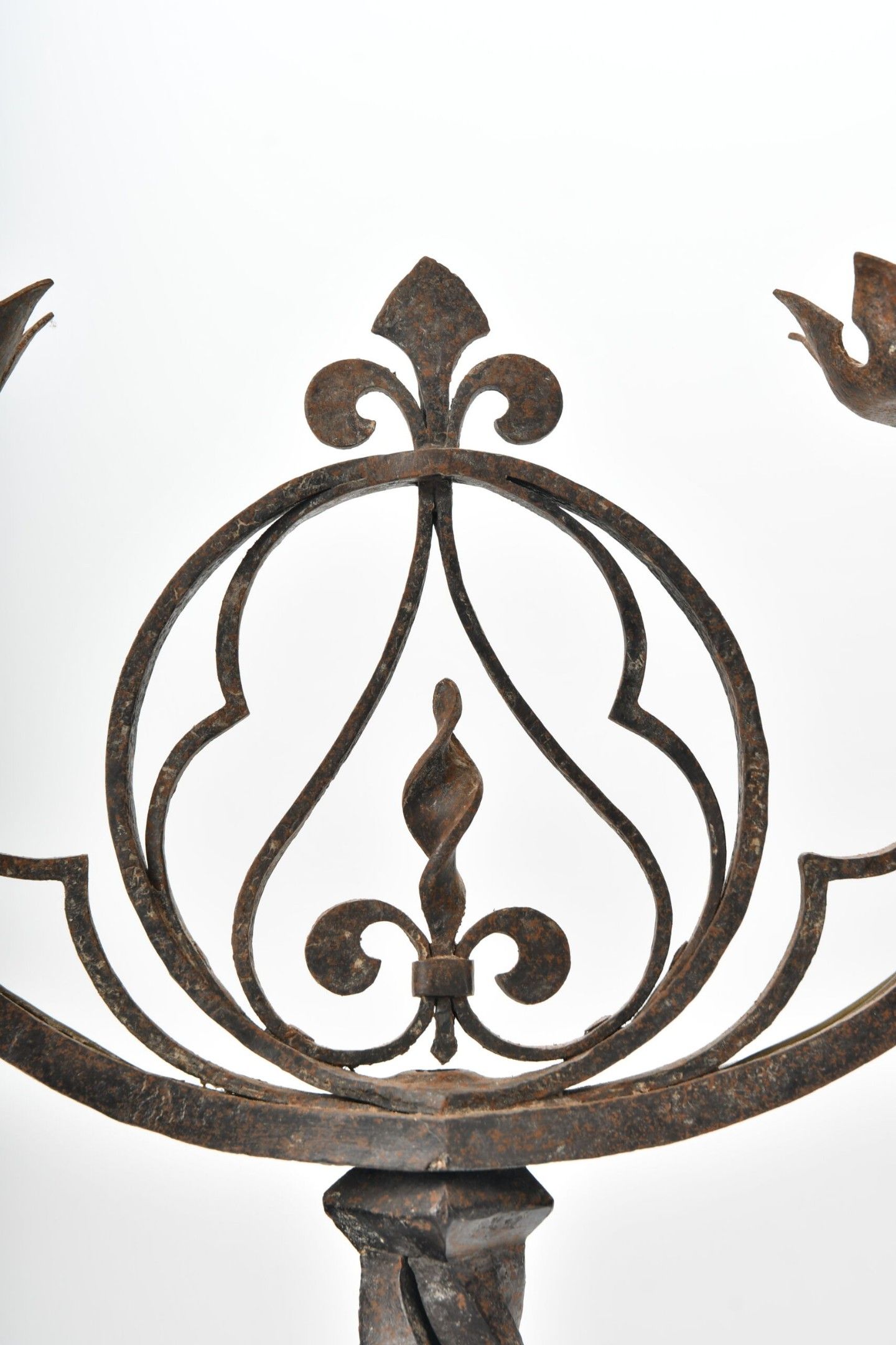 CANDELABRES (pair of) in wrought iron with two lights, twisted shaft and fleur-de-lys decoration in an openwork medallion. Base with stylised claw feet. Neo-Gothic style. Height 46.5 cm