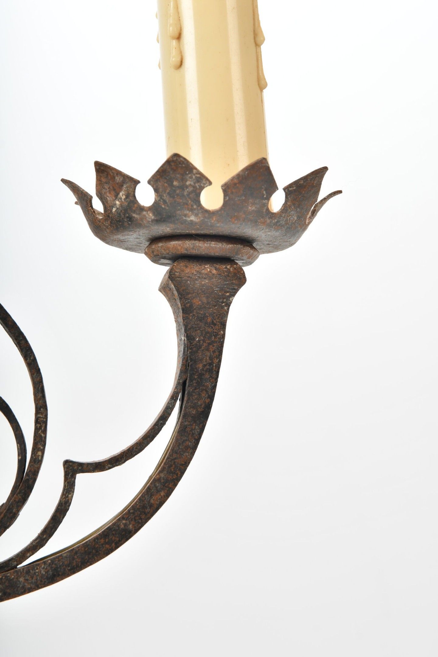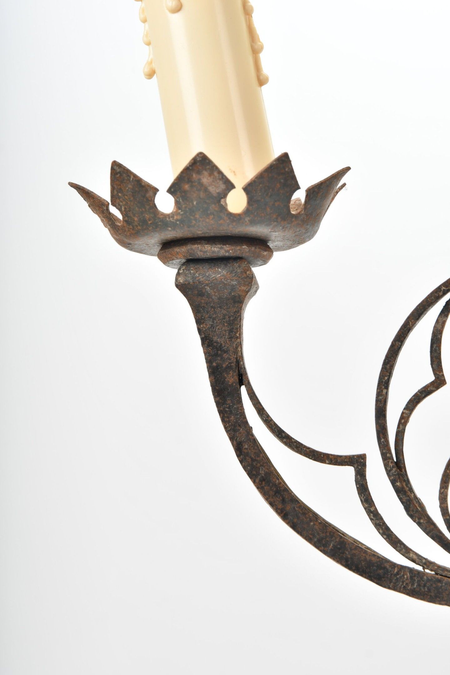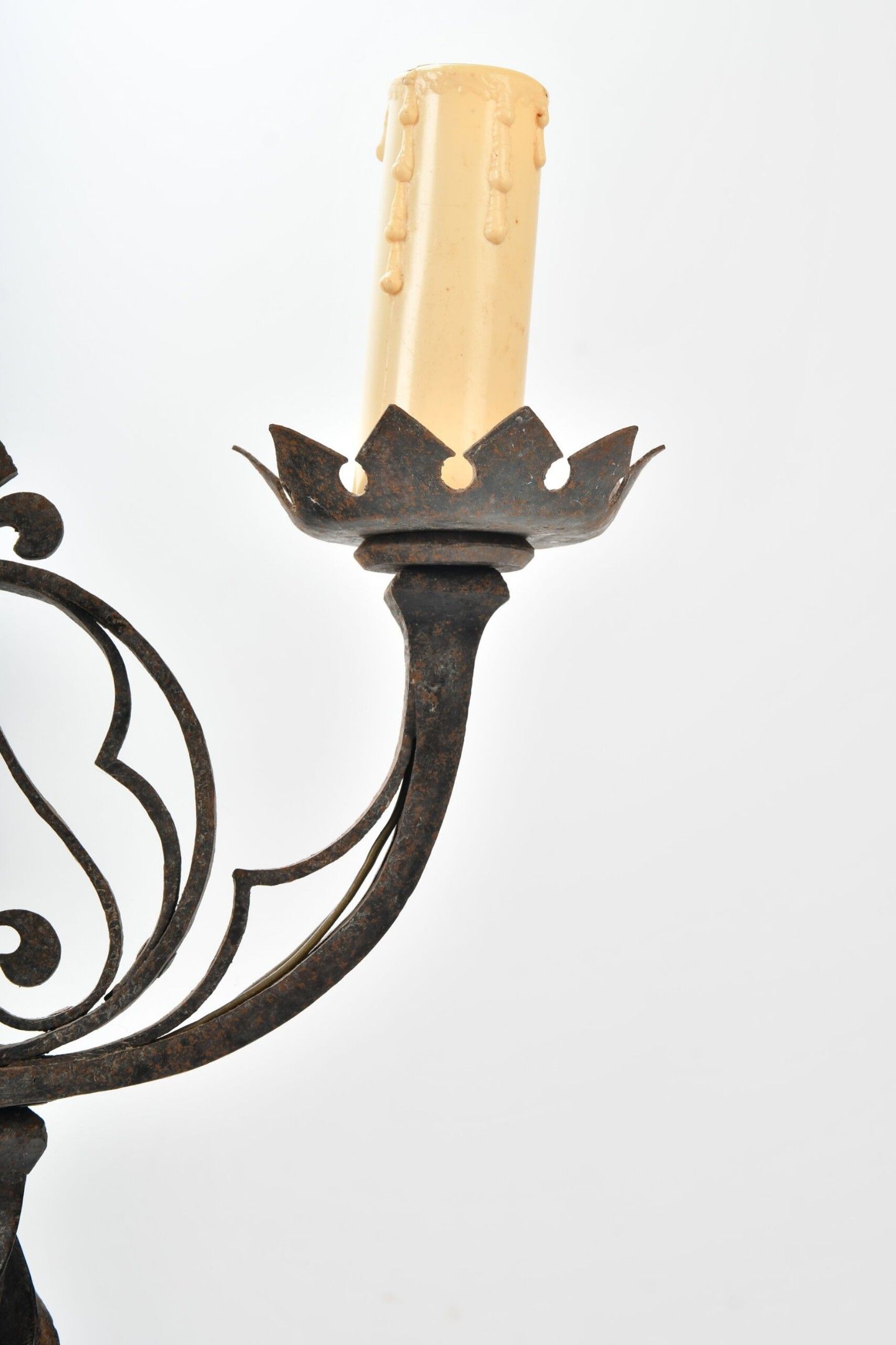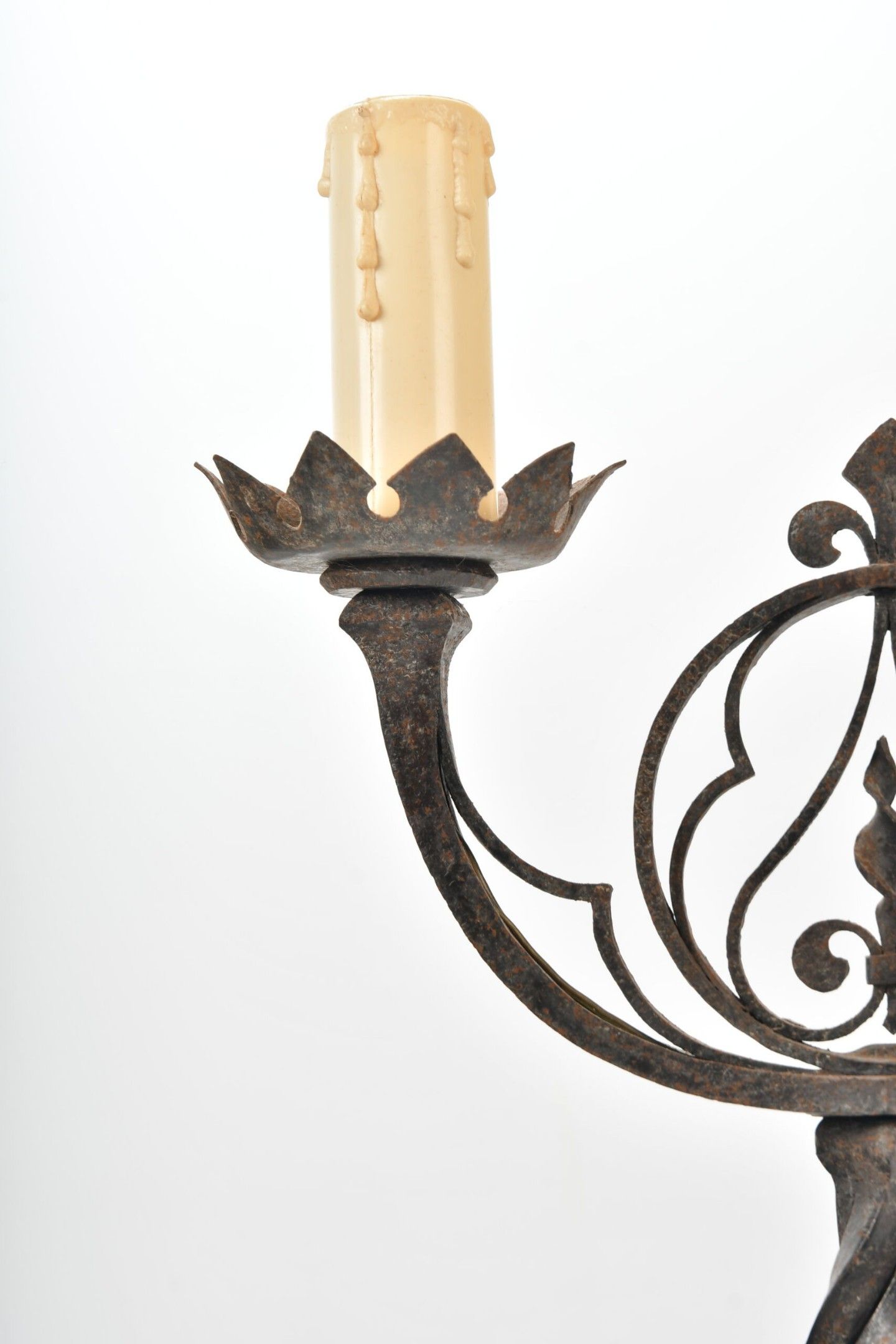 CANDELABRES (pair of) in wrought iron with two lights, twisted shaft and fleur-de-lys decoration in an openwork medallion. Base with stylised claw feet. Neo-Gothic style. Height 46.5 cm