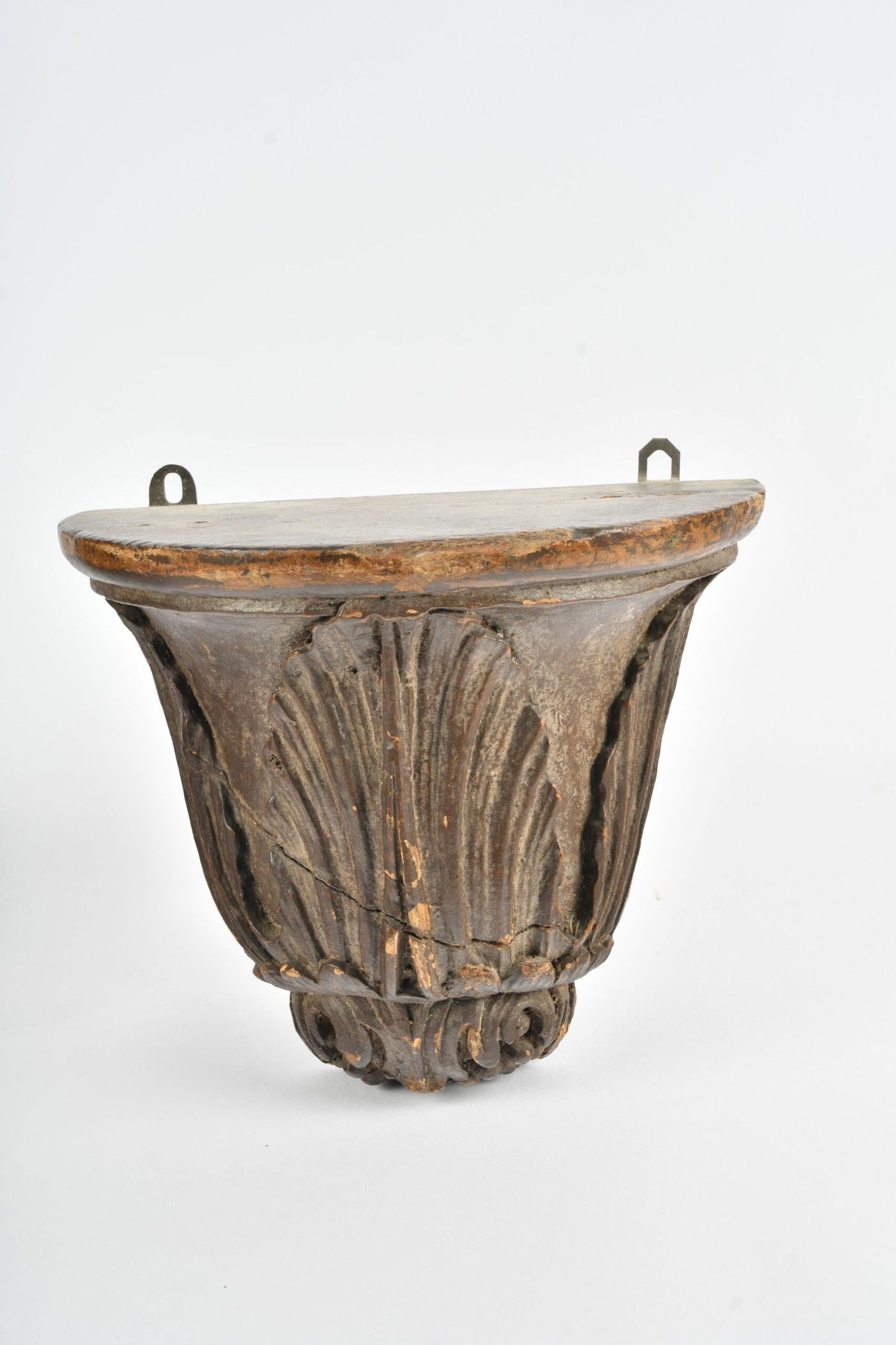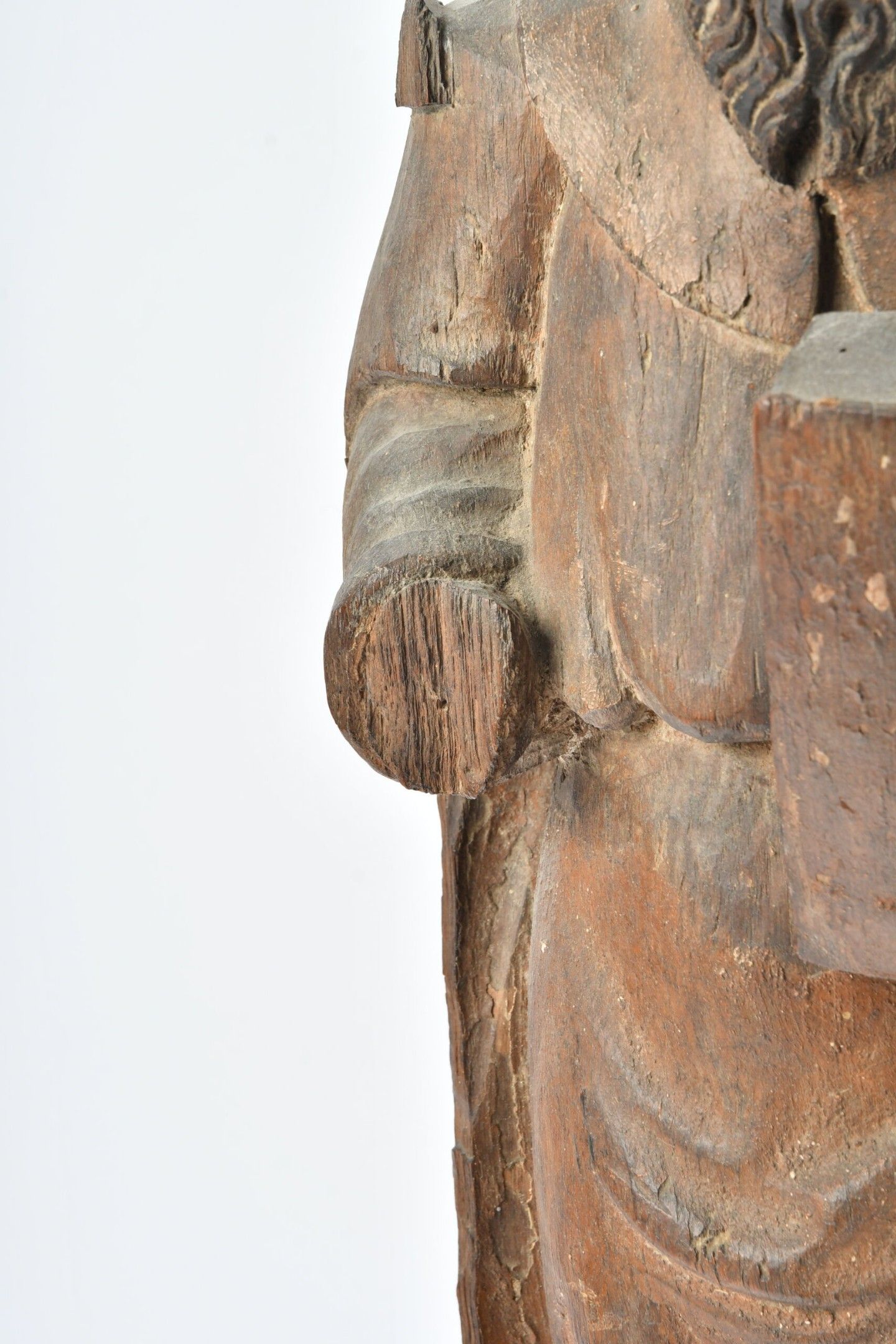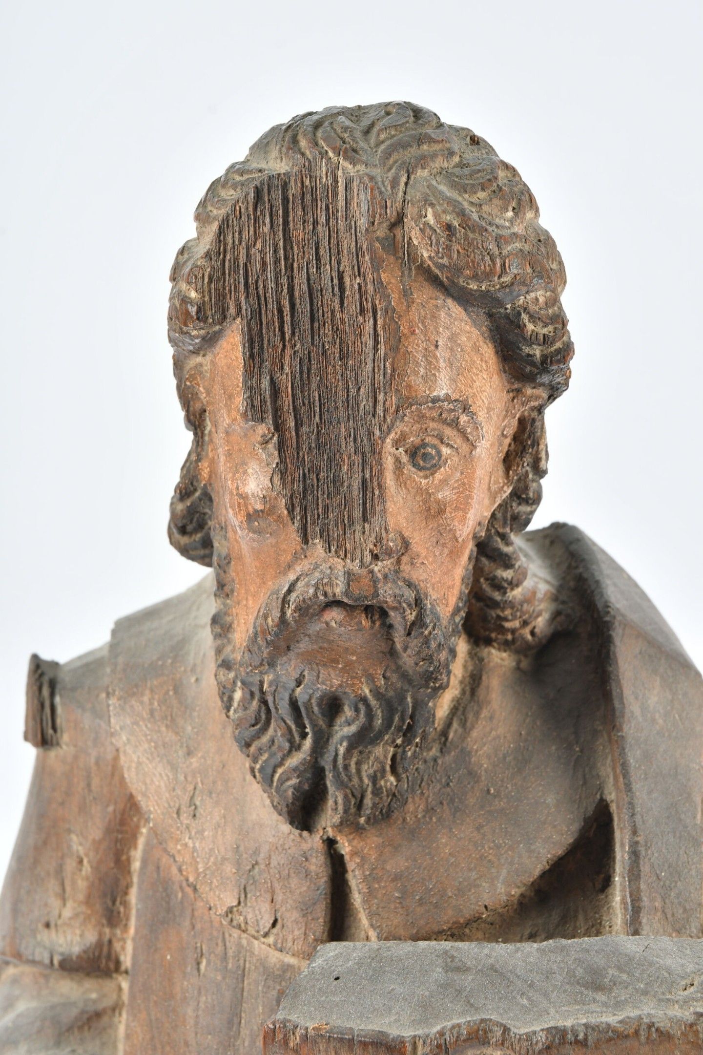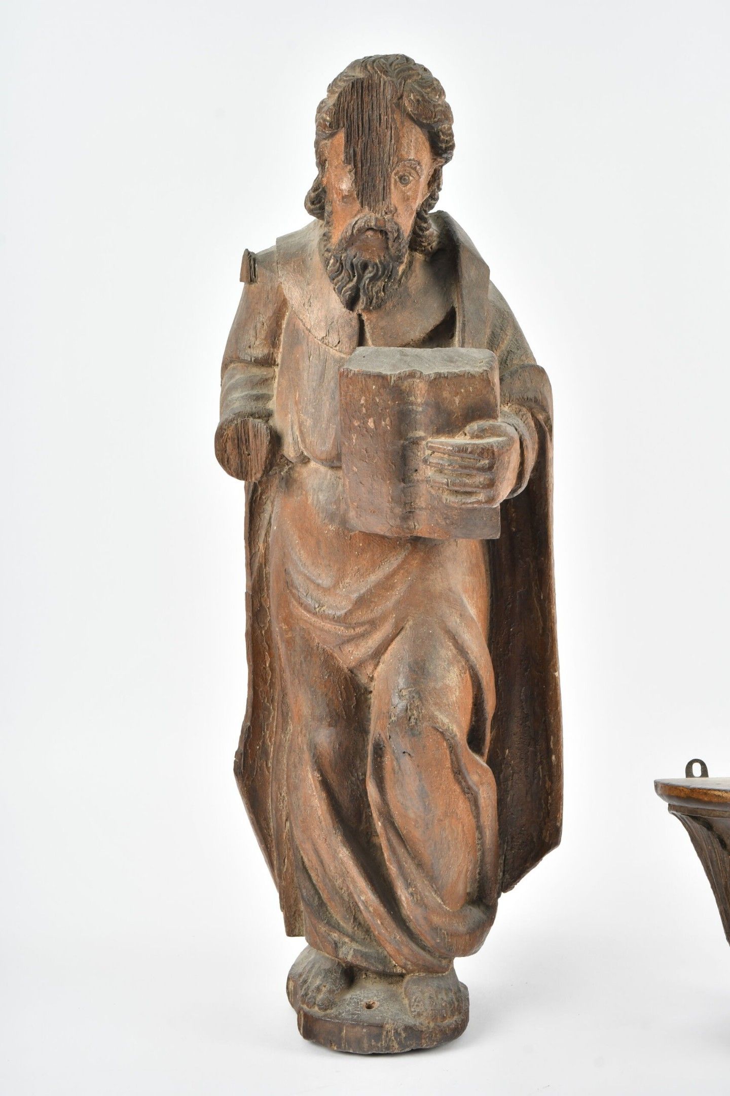17th century FRENCH SCHOOL. Carved wooden STATUE of a saint (Saint Paul) holding a book. H. 64 cm. Significant damage; worm work. There is also a bracket in carved wood with foliage.