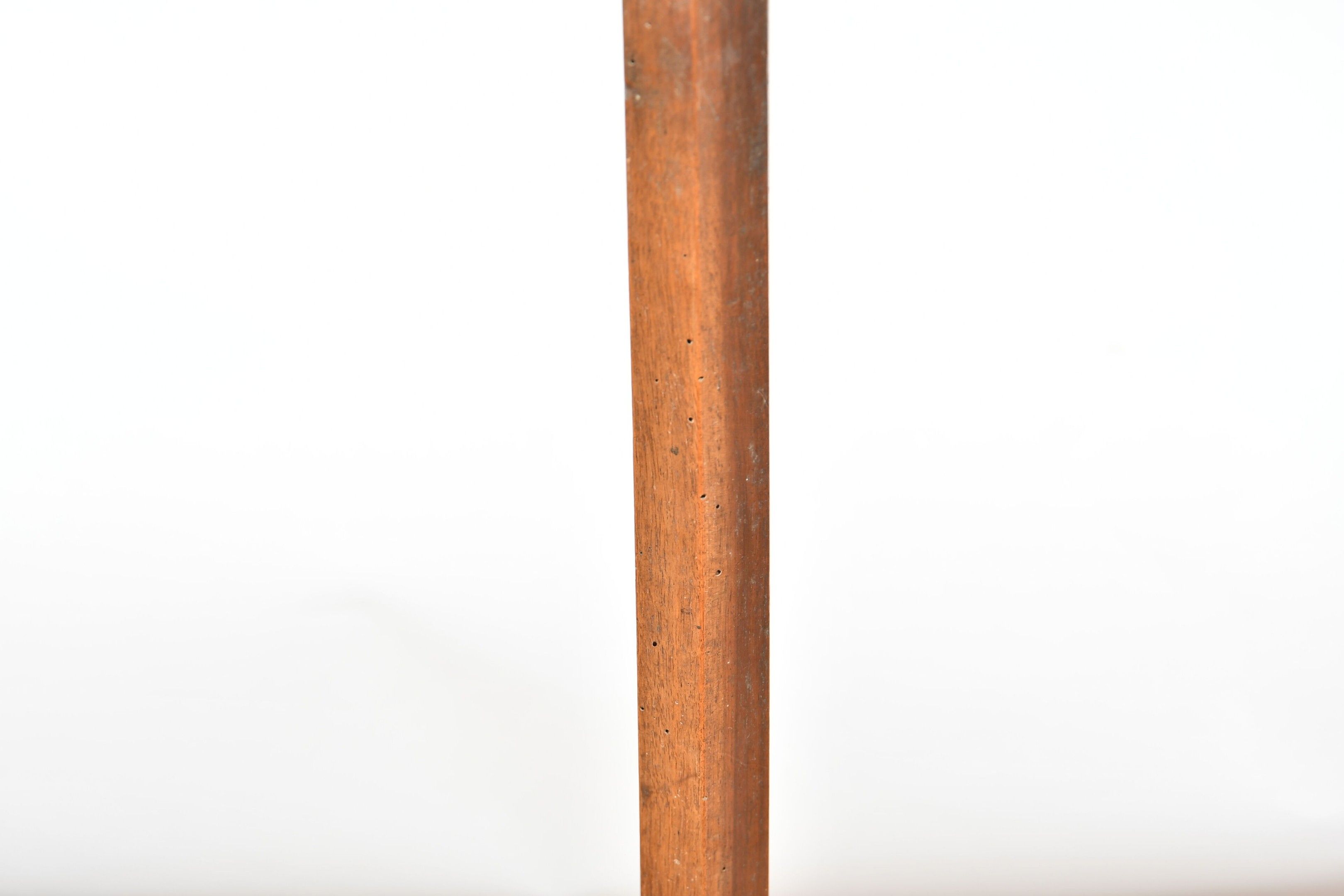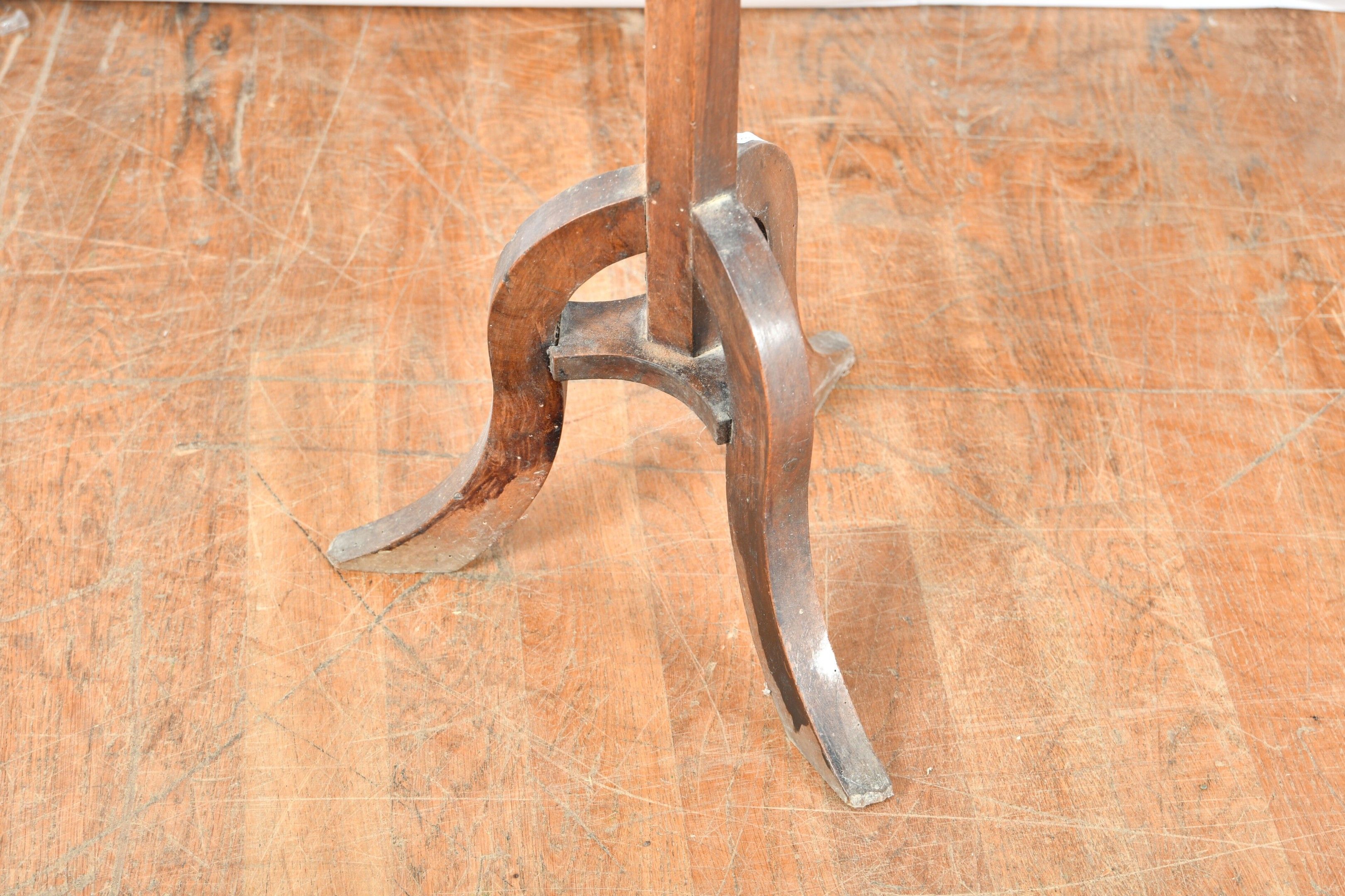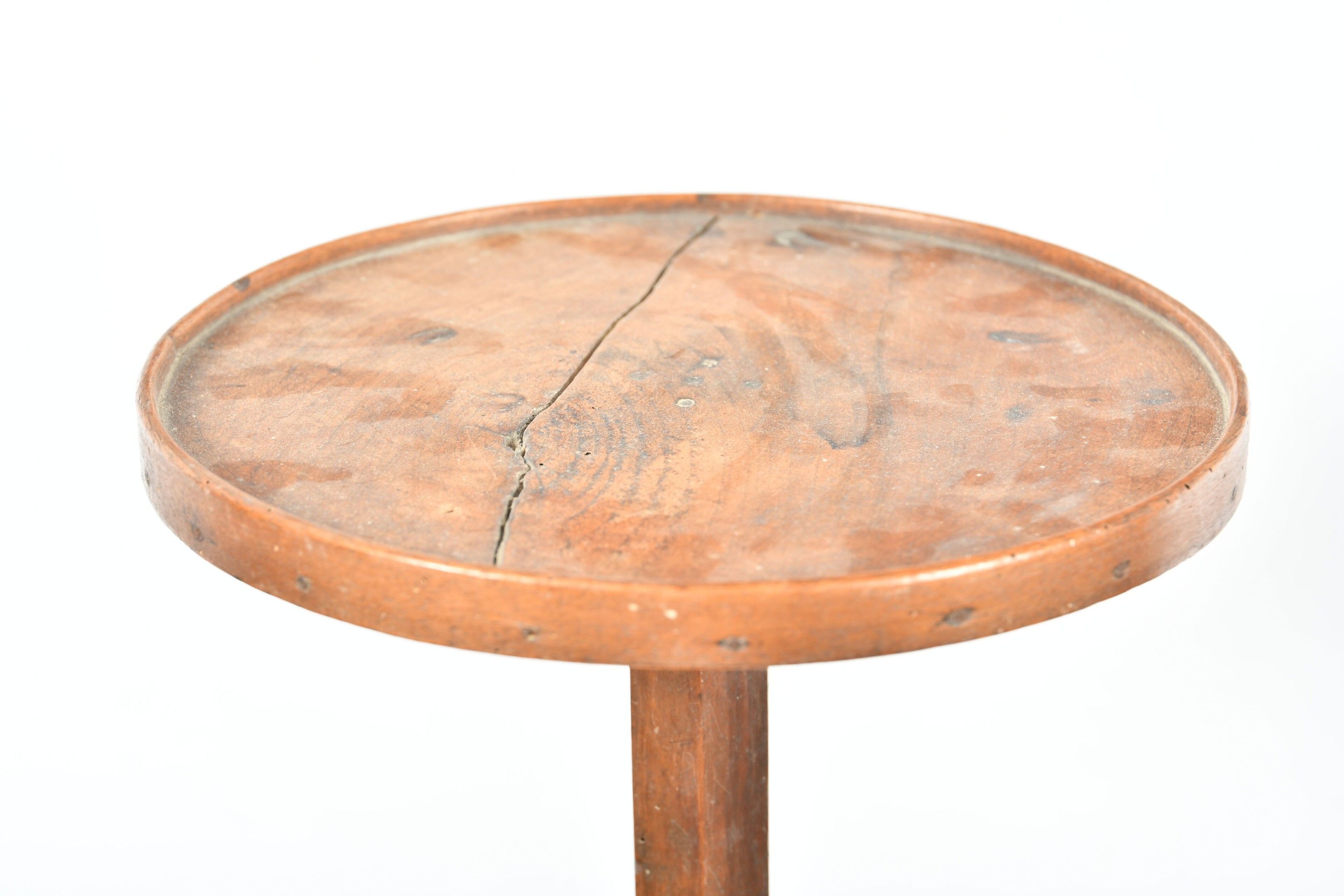 SELLETTE (small) in natural wood with a circular cabaret top resting on a long tripod base with curved legs joined by a brace. Height 77.5 cm