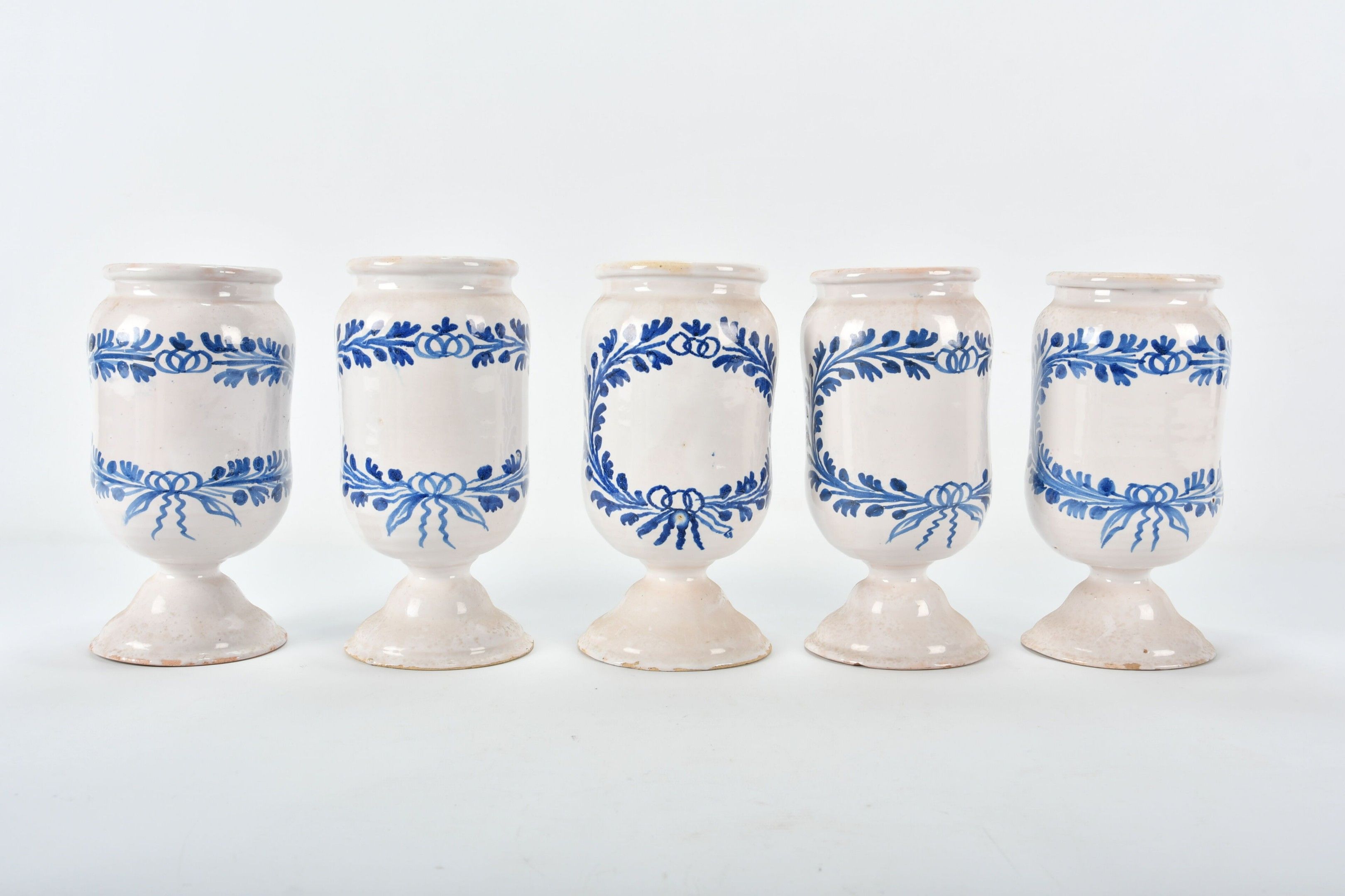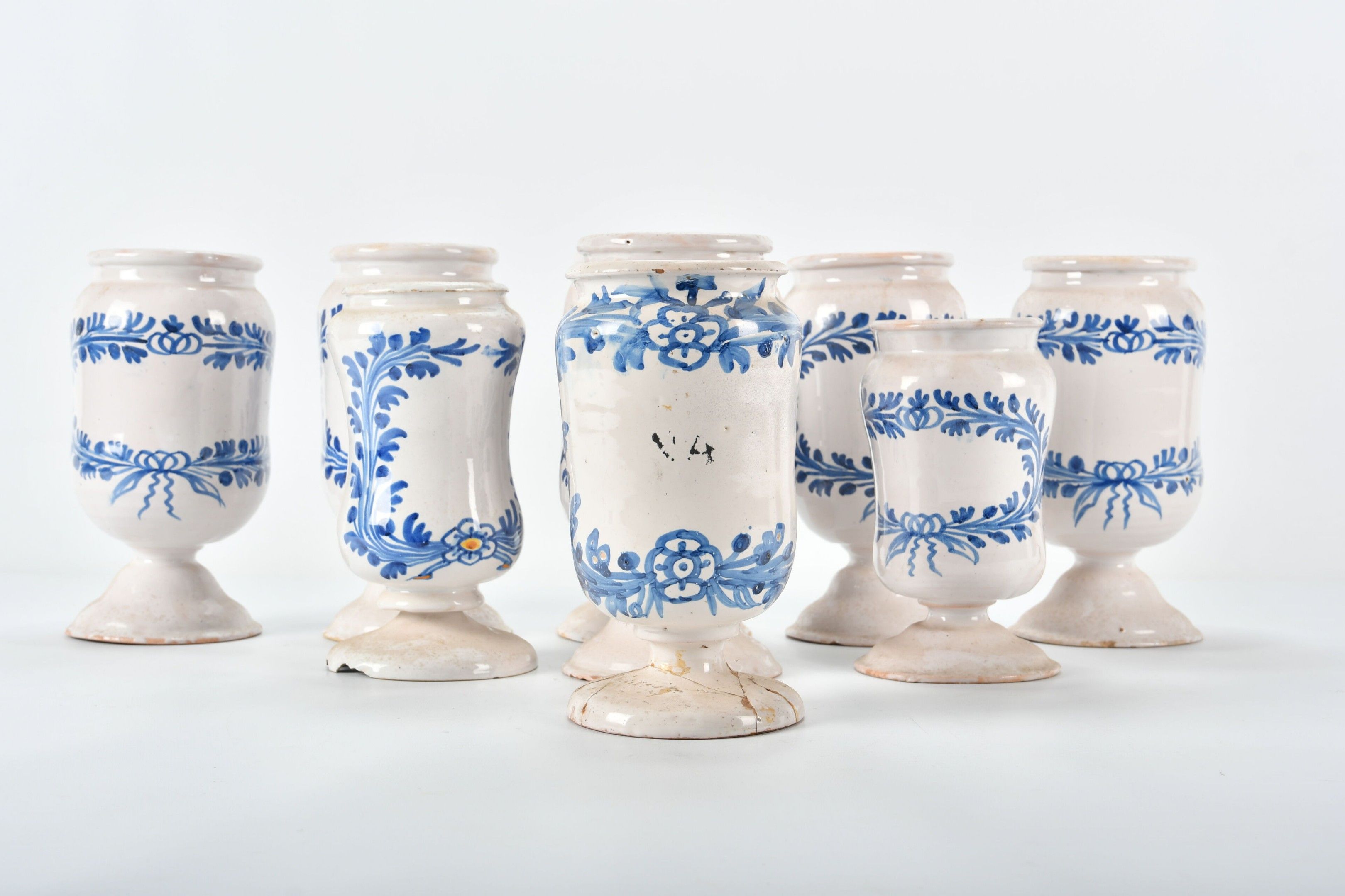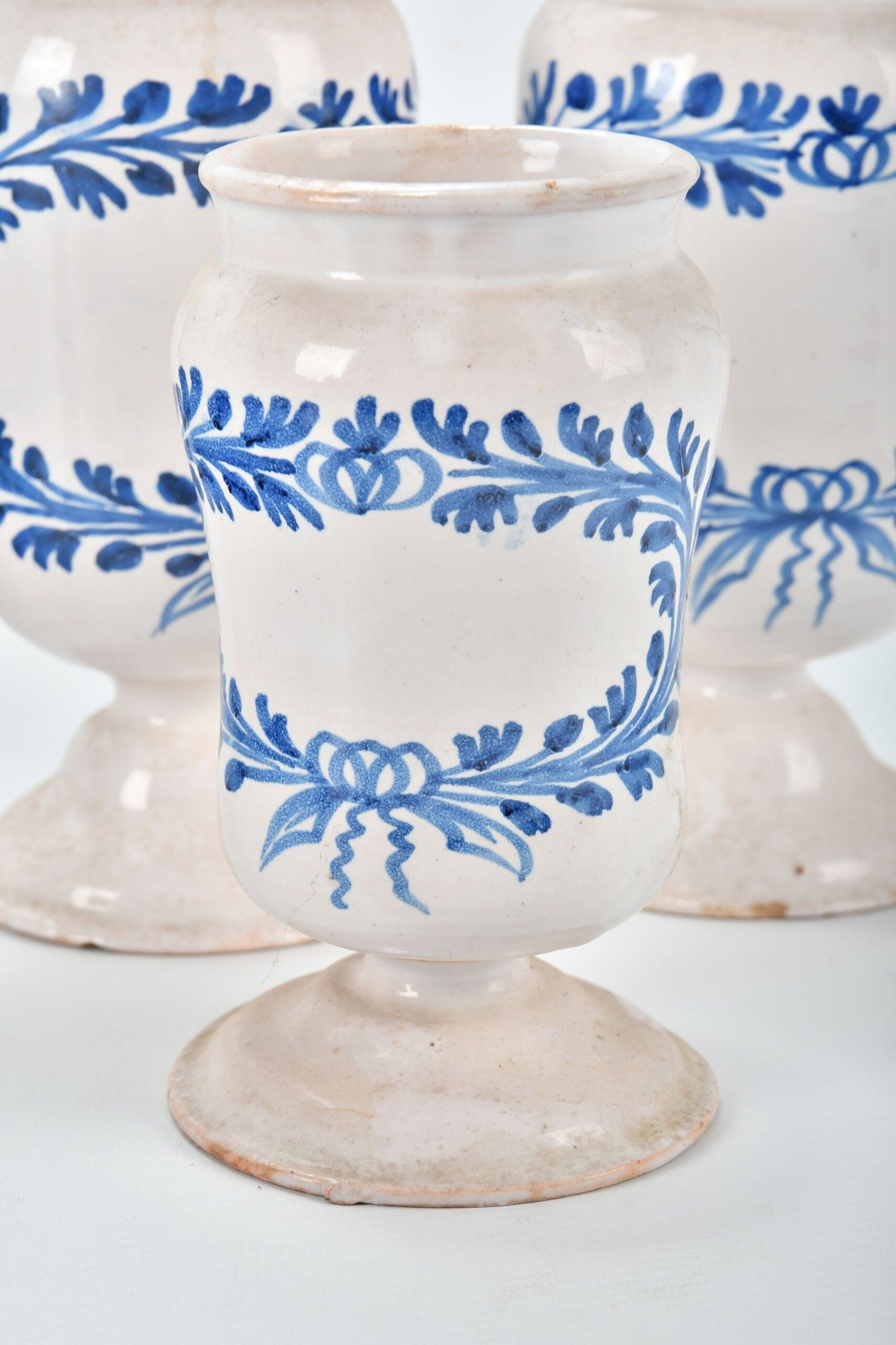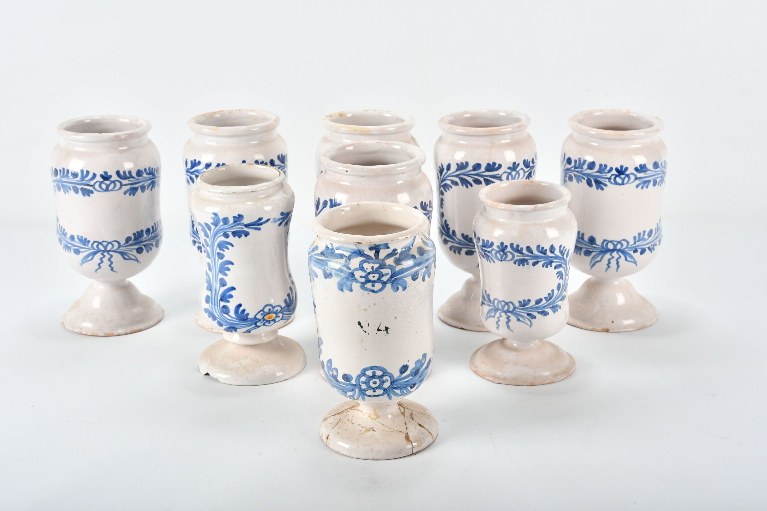 NEVERS 18th century. Set of nine glazed earthenware Pharmacy POTS. Shaped like a light baluster on a pedestal, decorated in blue with garlands of foliage. One with an ochre highlight on a flower. From 18 to 22 cm high. Small enamel chips; chips and small damages to the whole, one with a broken foot that has been glued back together.