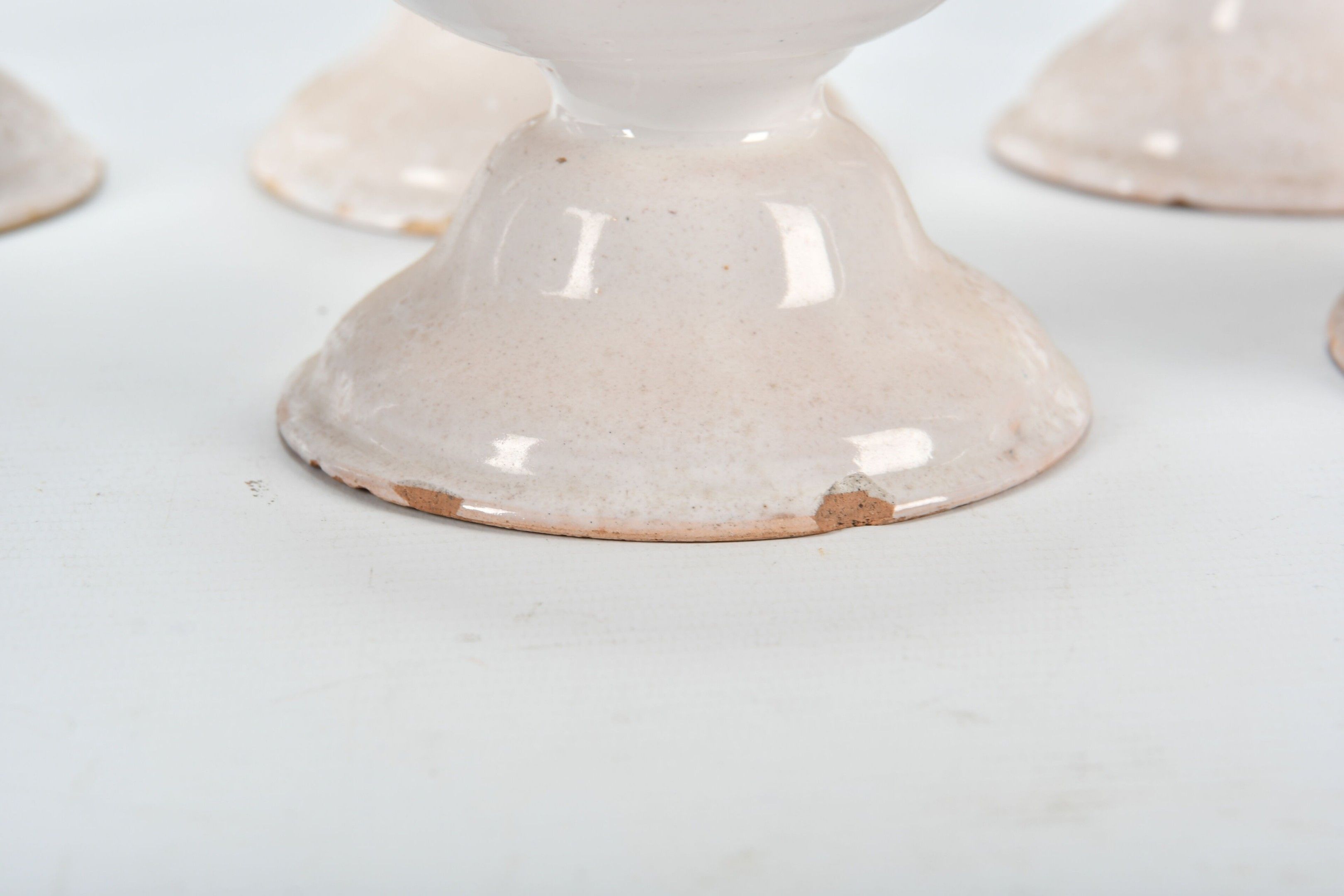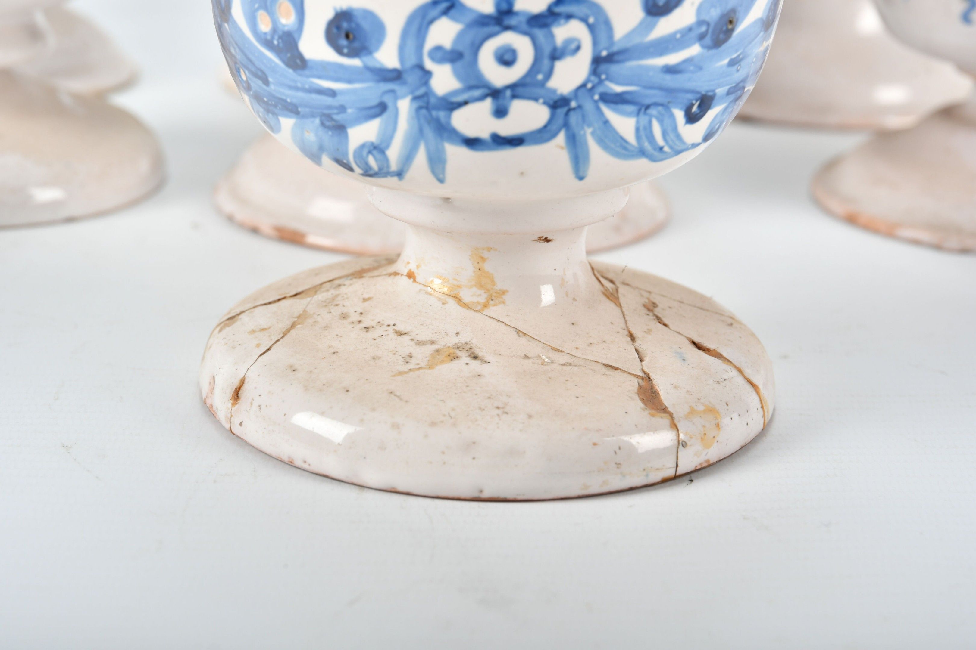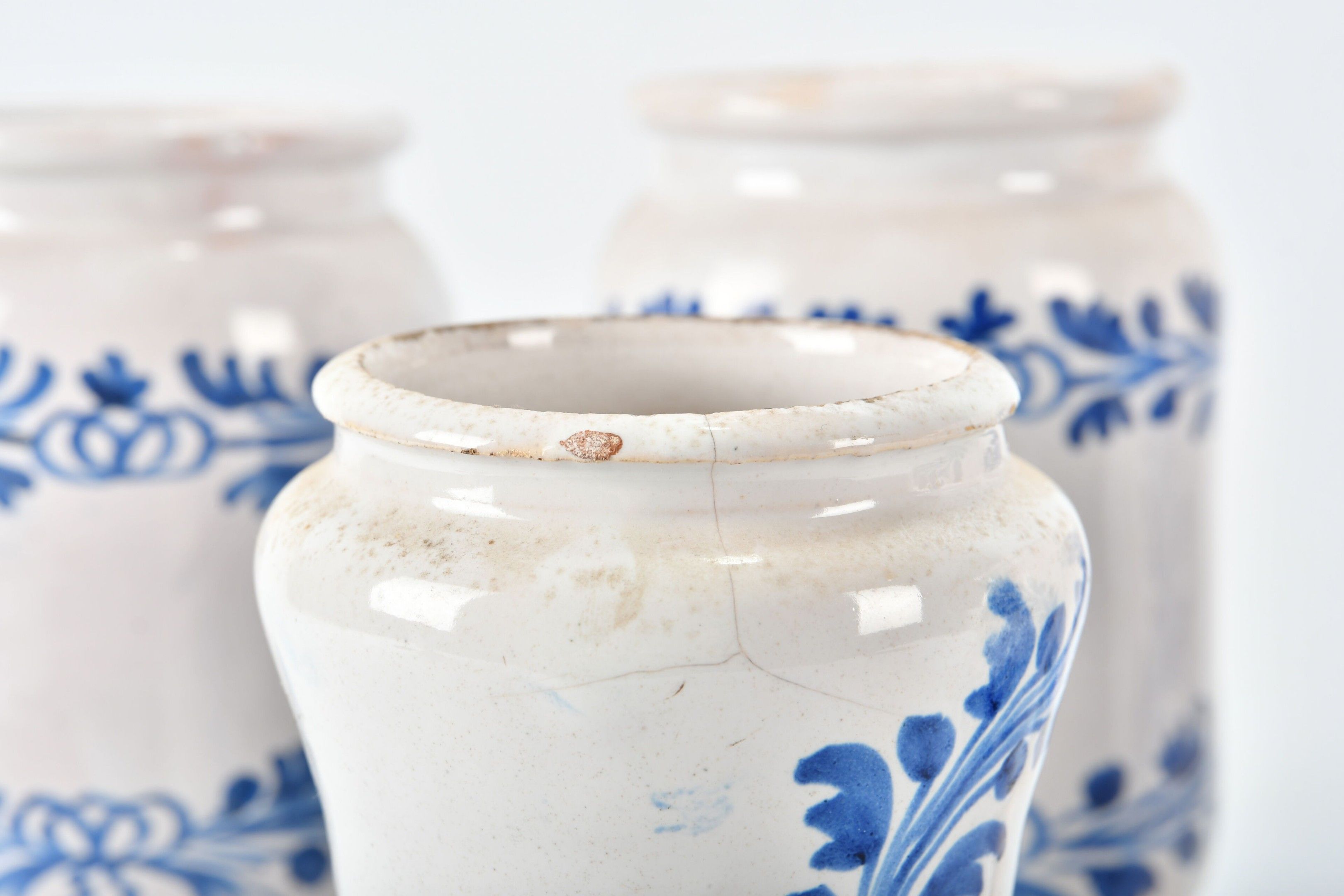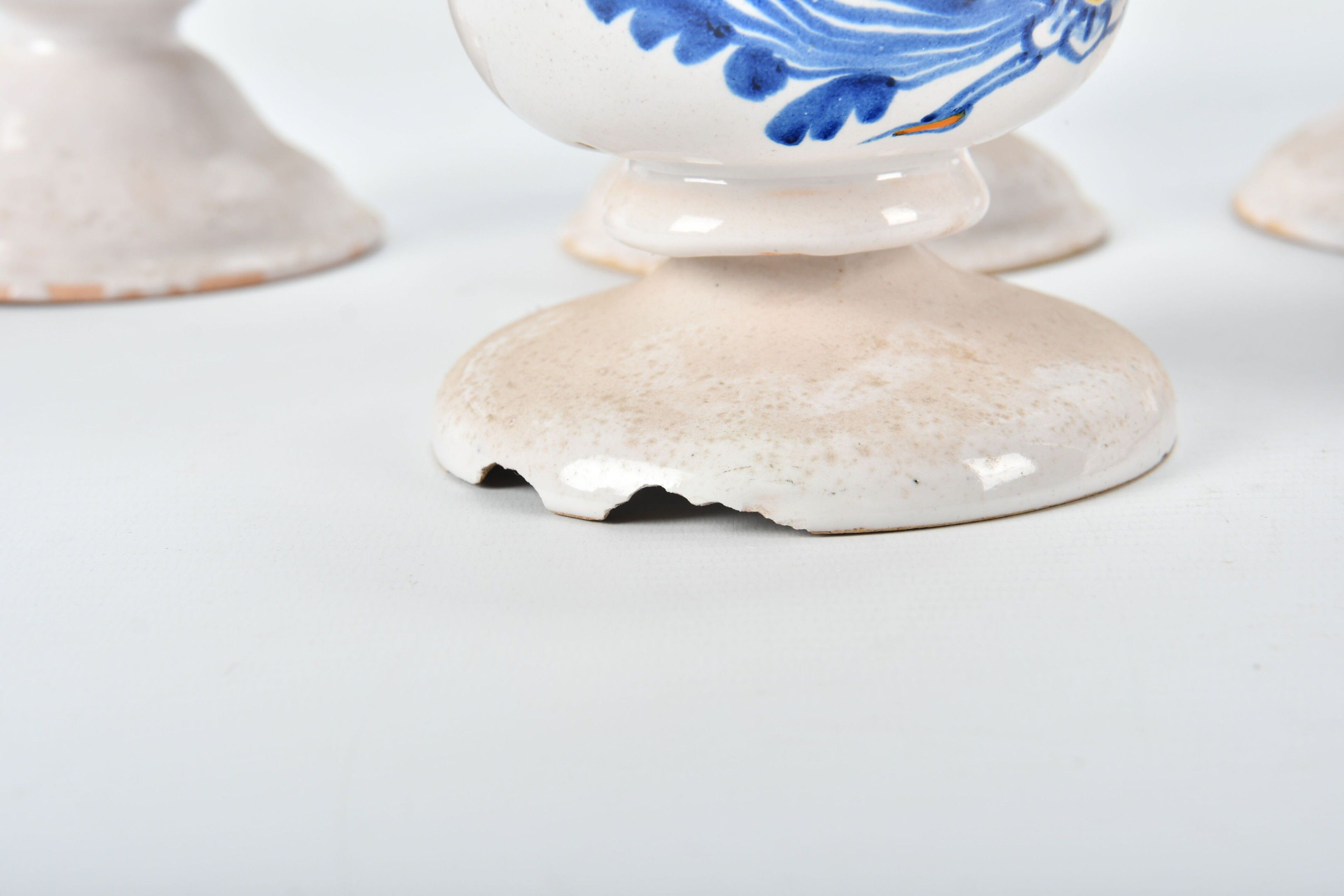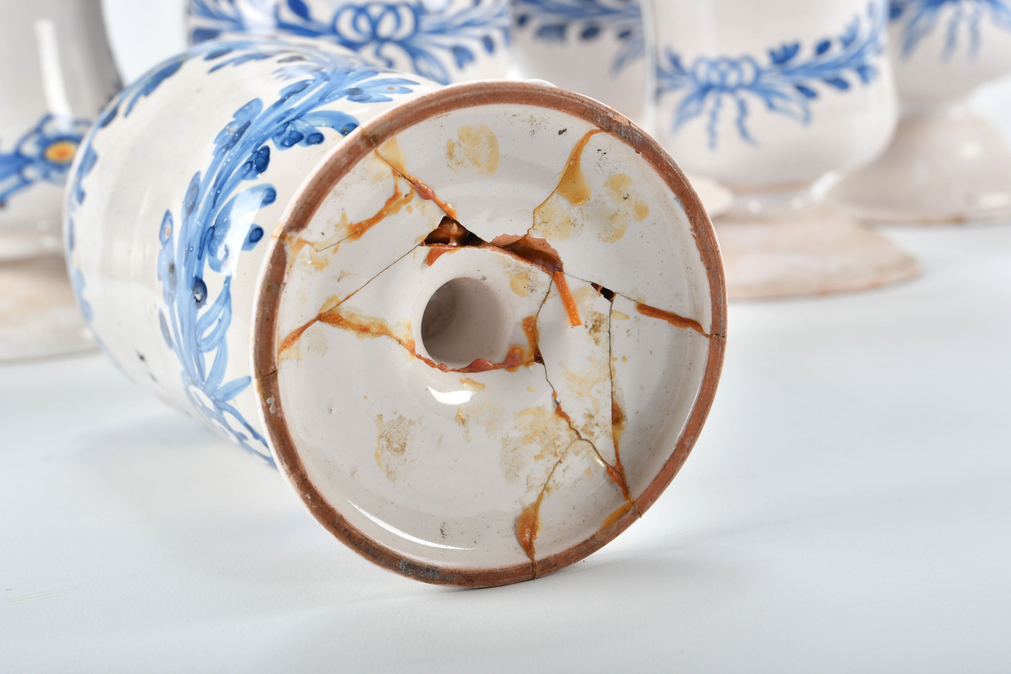 NEVERS 18th century. Set of nine glazed earthenware Pharmacy POTS. Shaped like a light baluster on a pedestal, decorated in blue with garlands of foliage. One with an ochre highlight on a flower. From 18 to 22 cm high. Small enamel chips; chips and small damages to the whole, one with a broken foot that has been glued back together.