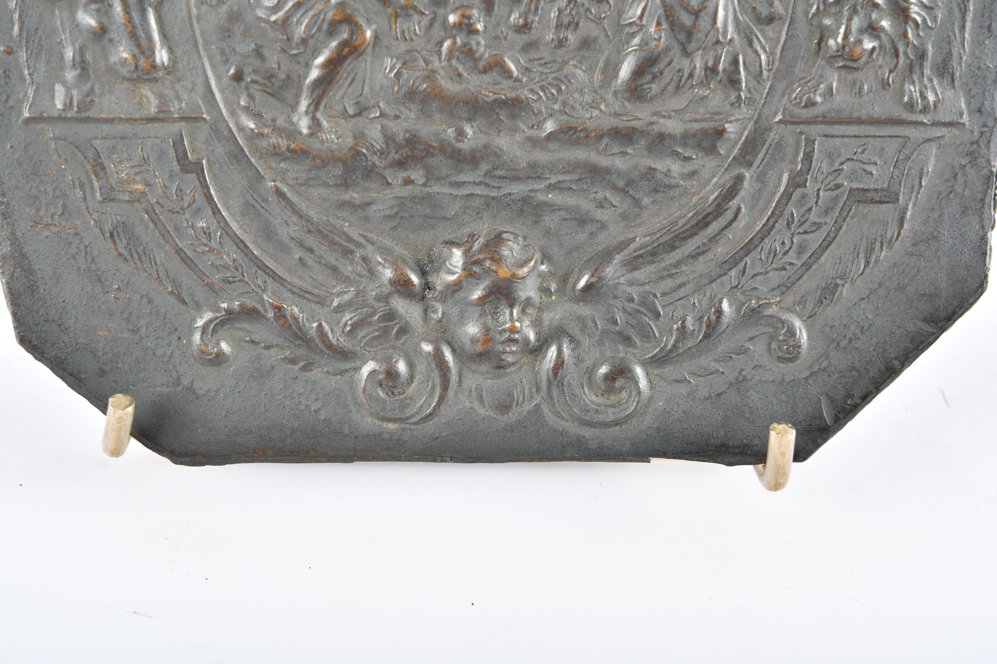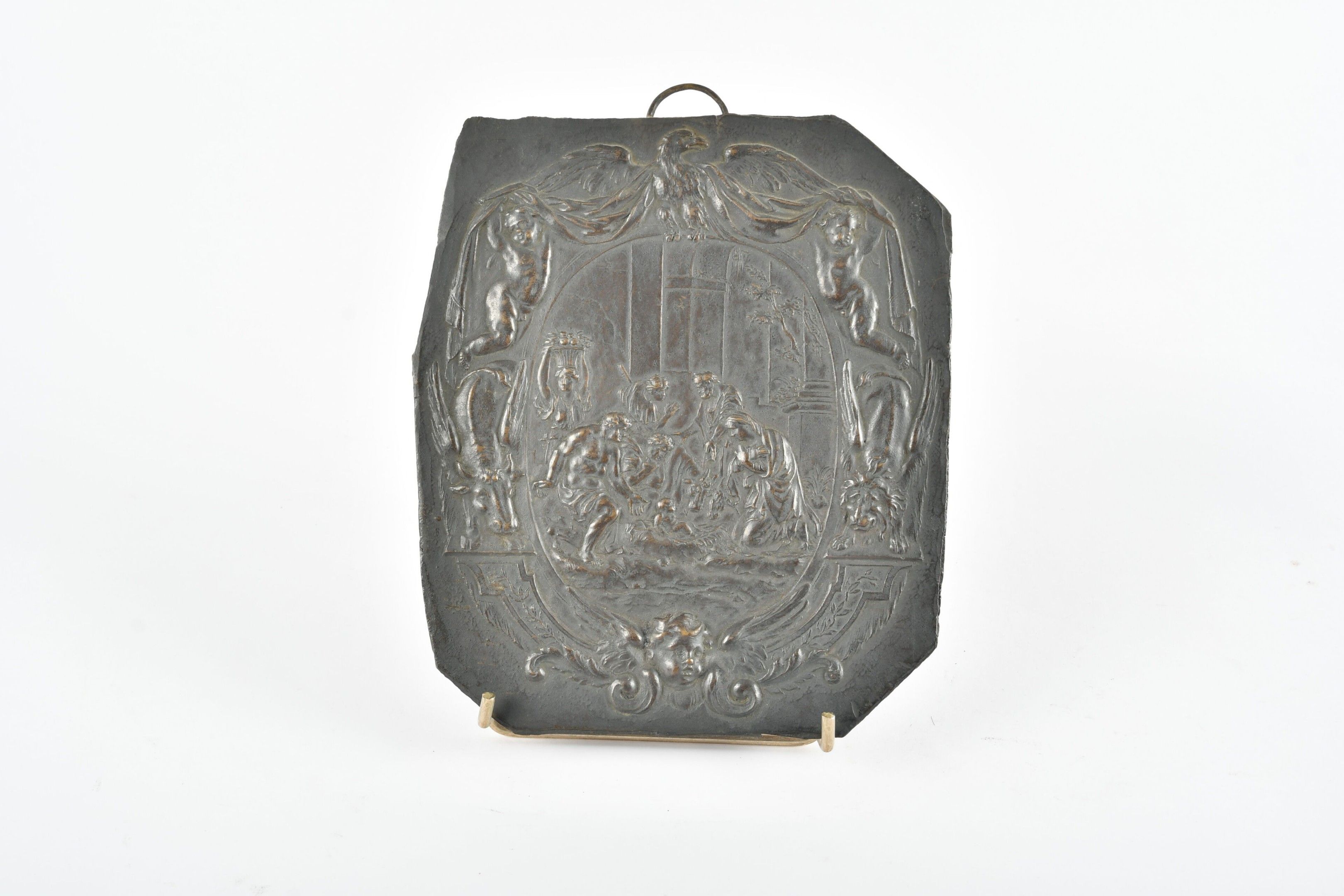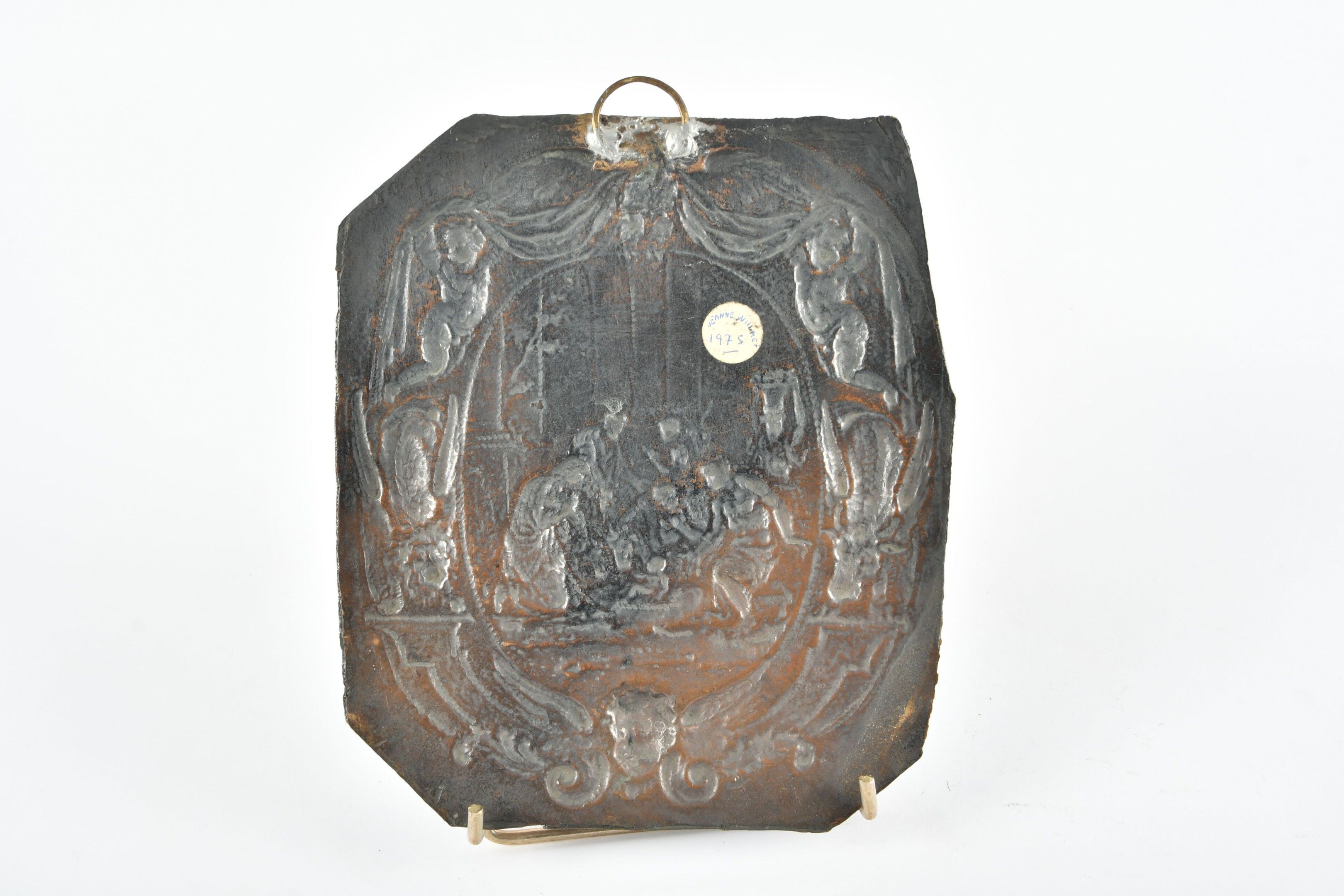 Bronze plaque depicting the Nativity with shepherds in a fra…